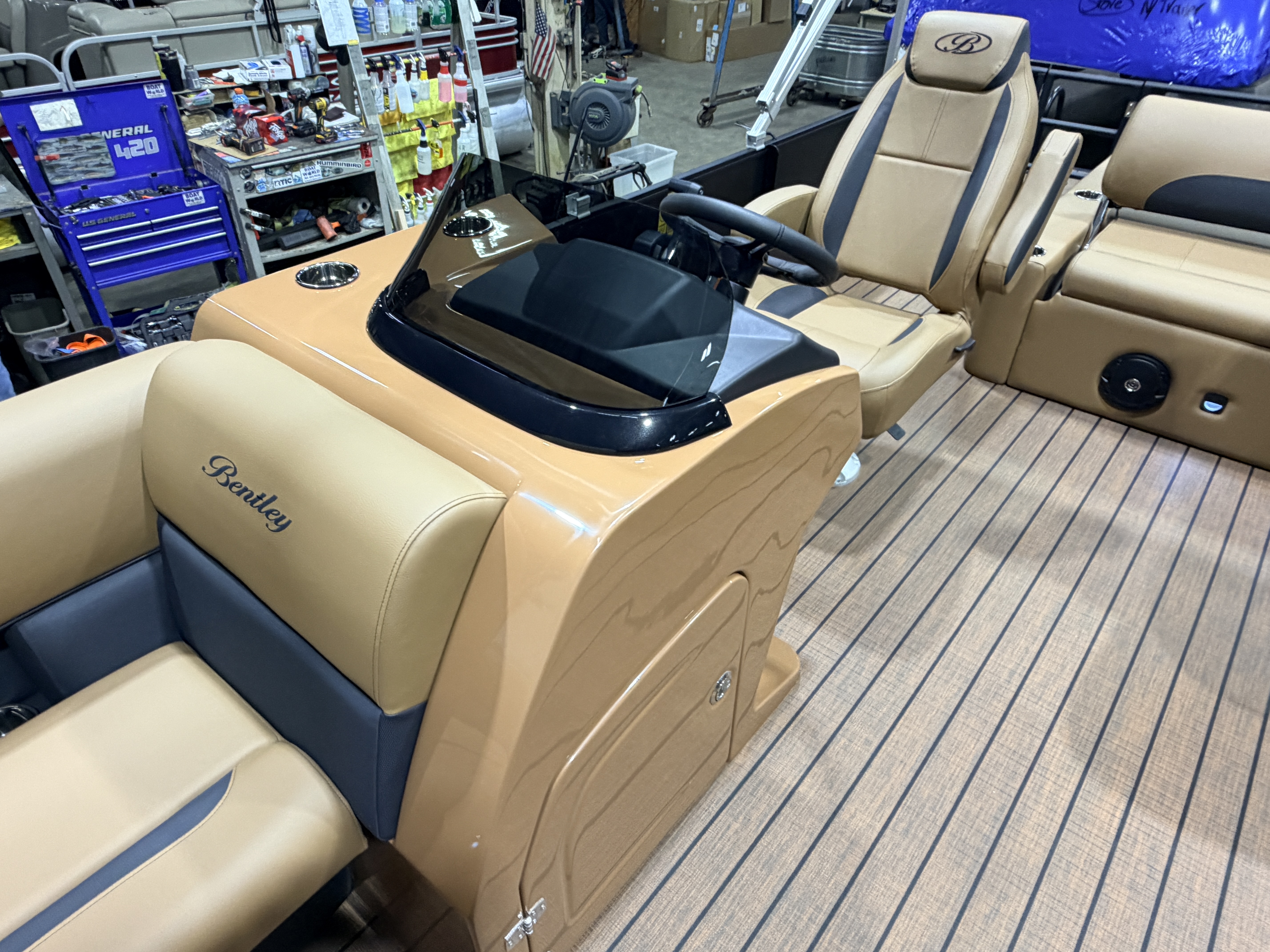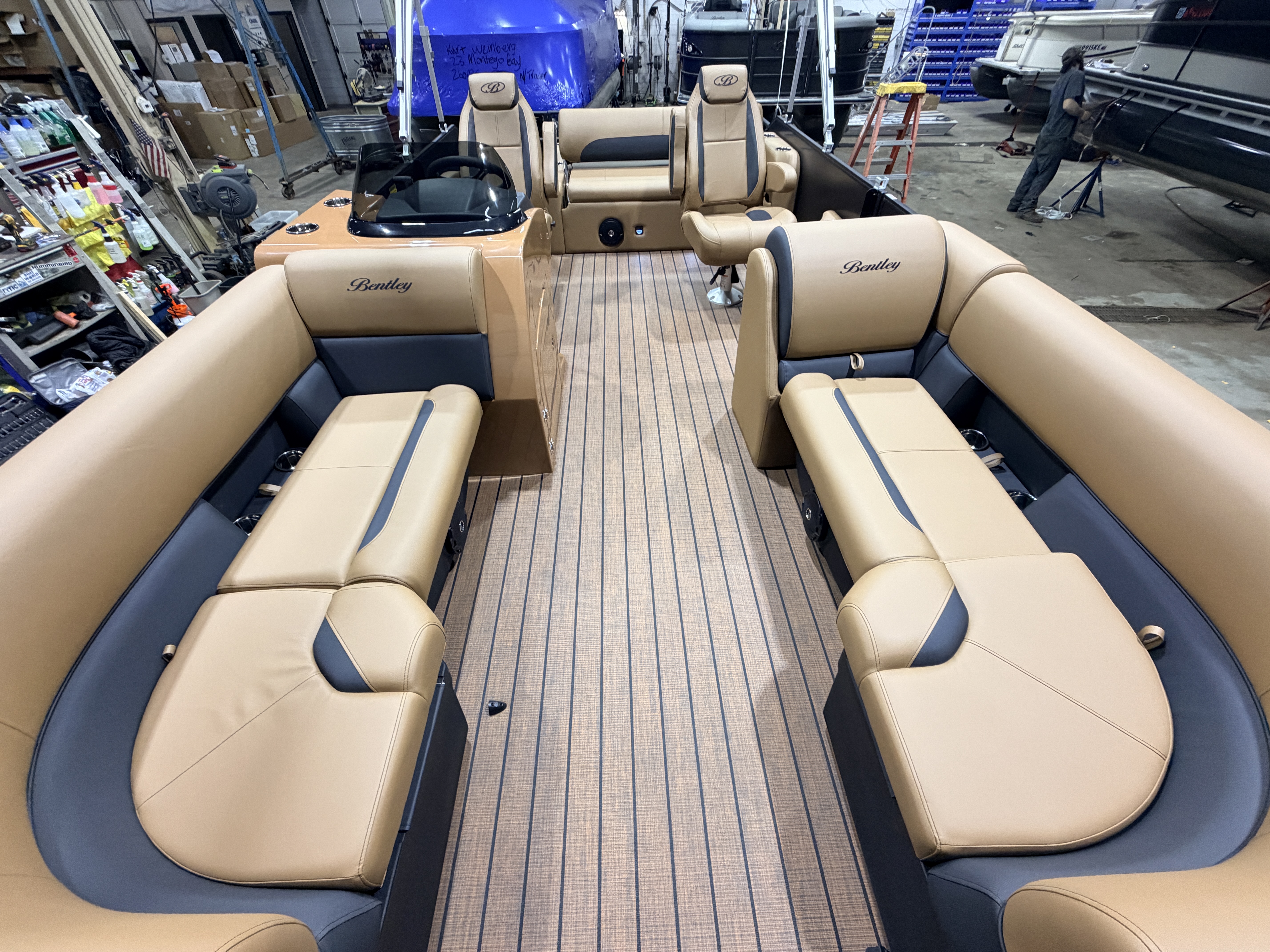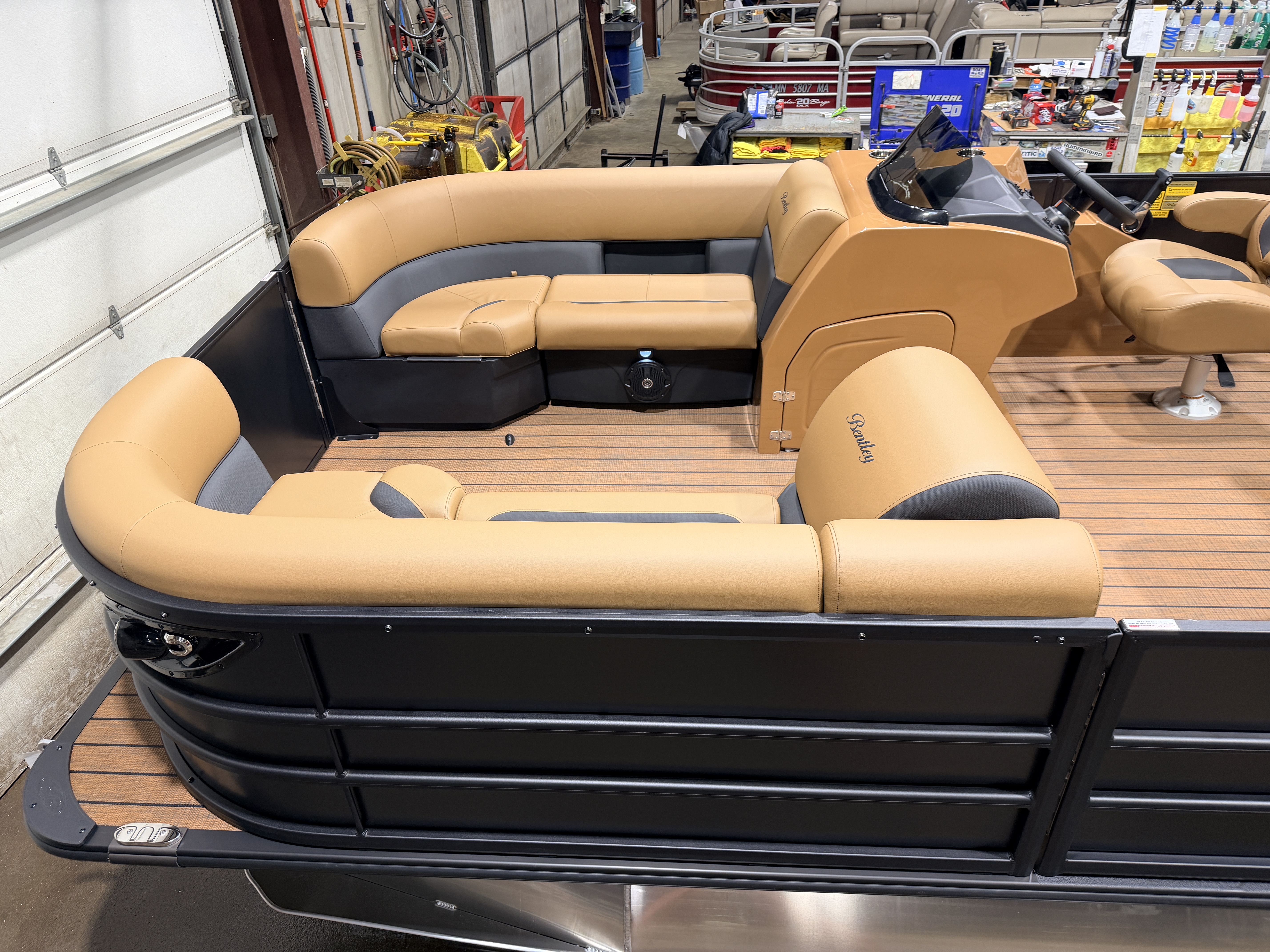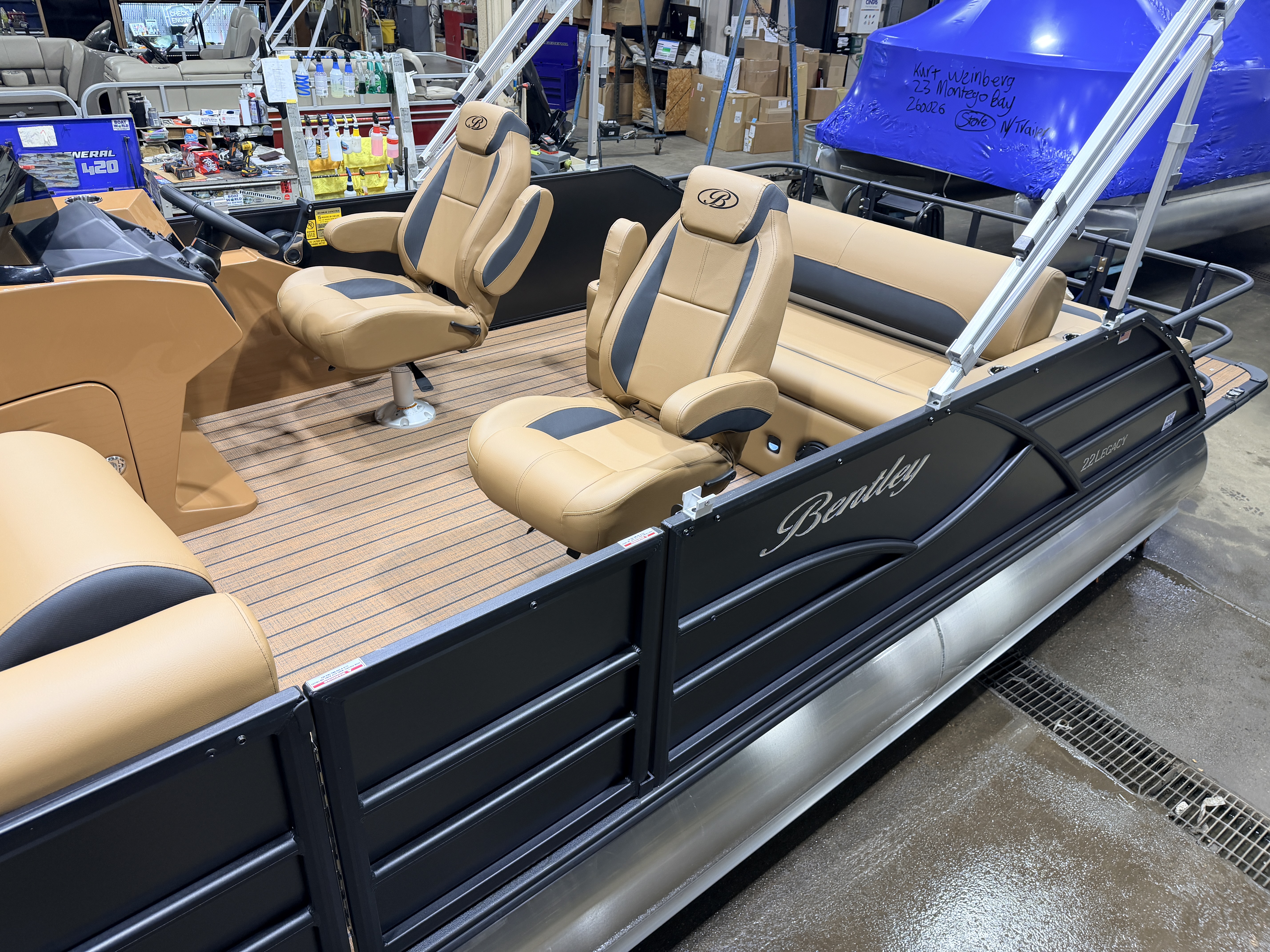 2026 Bentley Legacy 220 Swingback Pontoon & Honda 4-Stroke EFI. This 22' Cruise Has Front Chaise Lounge Seating With Storage, Two Mid-Back Reclining Captain's, Rear Swingback Rear Lounge (Multiple Positions) With Storage, Rear Safety Fencing, Powder Coated Rails, Walnut Teak Vinyl Flooring, Bluetooth Radio w/4 Speakers, Table, Fiberglass Helm w/Storage, Playpen Cover, Upgraded Brandy Interior, Windshield, Tilt Steering, Rear Ladder, Battery On/Off Switch, Gauge Package w/Hour Meter, 25" Tubes, LED NAV Lights, LED Docking Lights, Built-In Cooler, New Battery, Bimini Top, Built-In 32 Gallon Gas Tank, Huge Front And Rear Deck. Rated For 15 People & Up To 150HP.