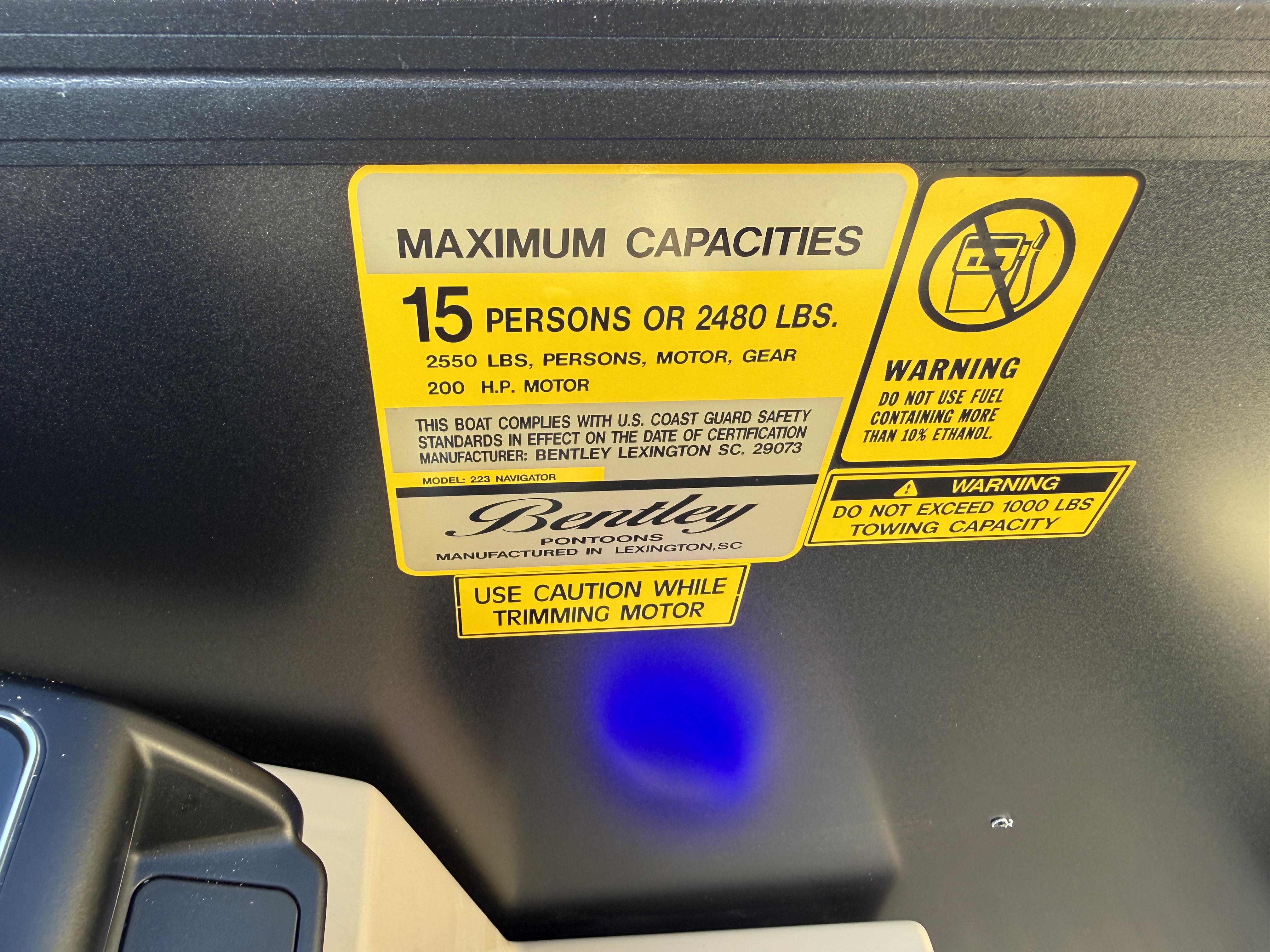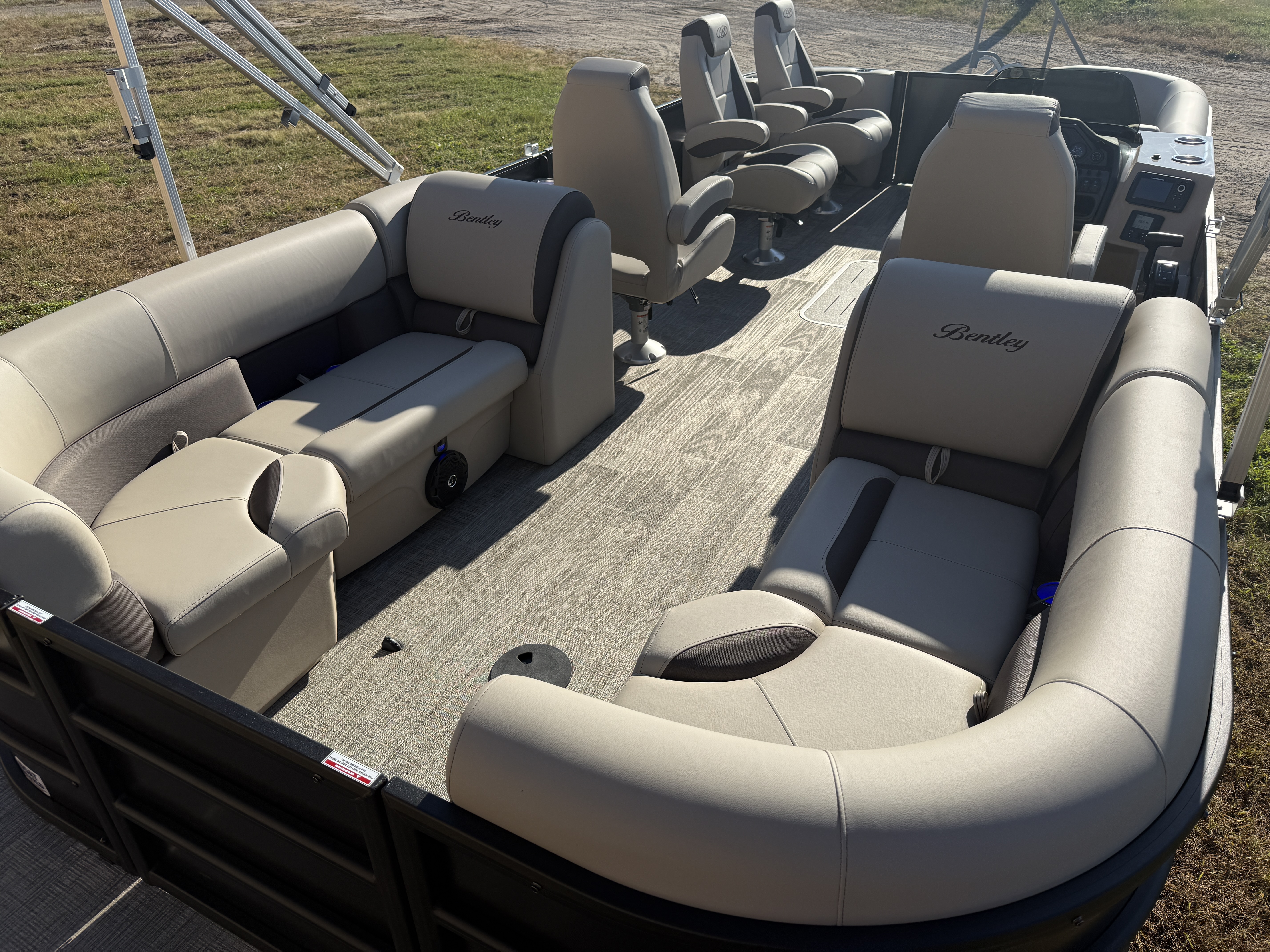 2026 Bentley Legacy 223 Navigator DL Quad Lounge Tritoon Pontoon & Honda 4-Stroke EFI. This 22' Tri-Toon Has Starboard Front Chaise Lounge Seating With Storage, Portside Side By Side High Back Relining Seats w/Cup Holders, Rear Chaise Lounge Seating W/Storage, Side By Side High-Back Reclining Captain's Seats, Interior Blue LED Package (Lighted Cup Holders & Courtesy Lights), Powder Coated Rails, Stainless Steel Flip Up Cleats, Humminbird Helix 5 GPS & Depth Finder, Ski Tow Bar, Bluetooth Radio w/4 Speakers, Table, Fiberglass Helm w/Storage, Lakeport Plank Vinyl Flooring, Playpen Cover, Livewell, Hydro Tilt Steering, Lifting Strakes, Underneath Sheeting, Rear Ladder, Ski Locker In Center Tube, Windshield, Built-In Garbage Can, Built-In Cooler, Gauge Package w/ Hour Meter, 25" Tubes, LED NAV Lights, LED Docking Lights, New Battery, Bimini Top, Built-In 32 Gallon Gas Tank, Rear Deck. Rated For 15 People!