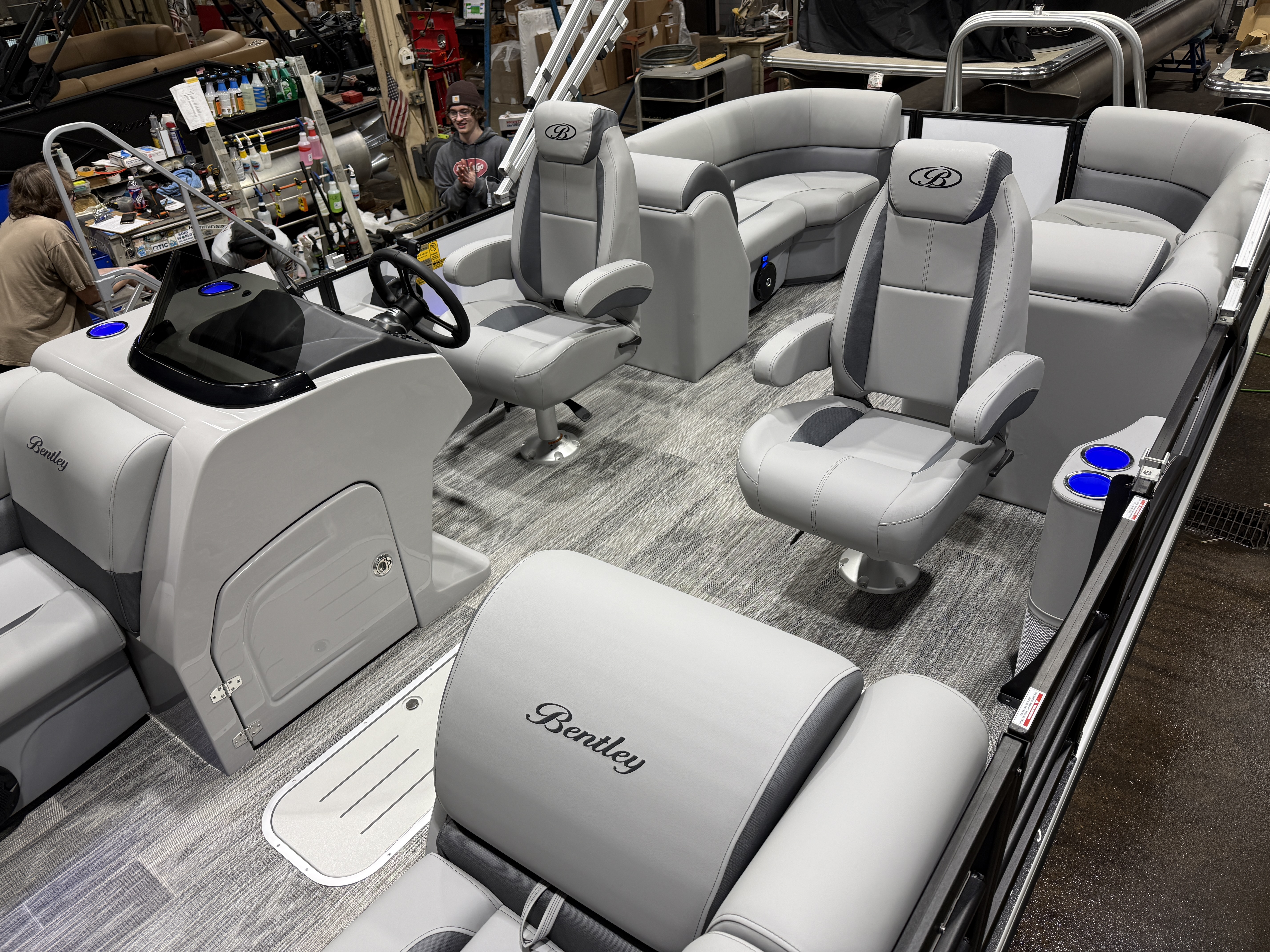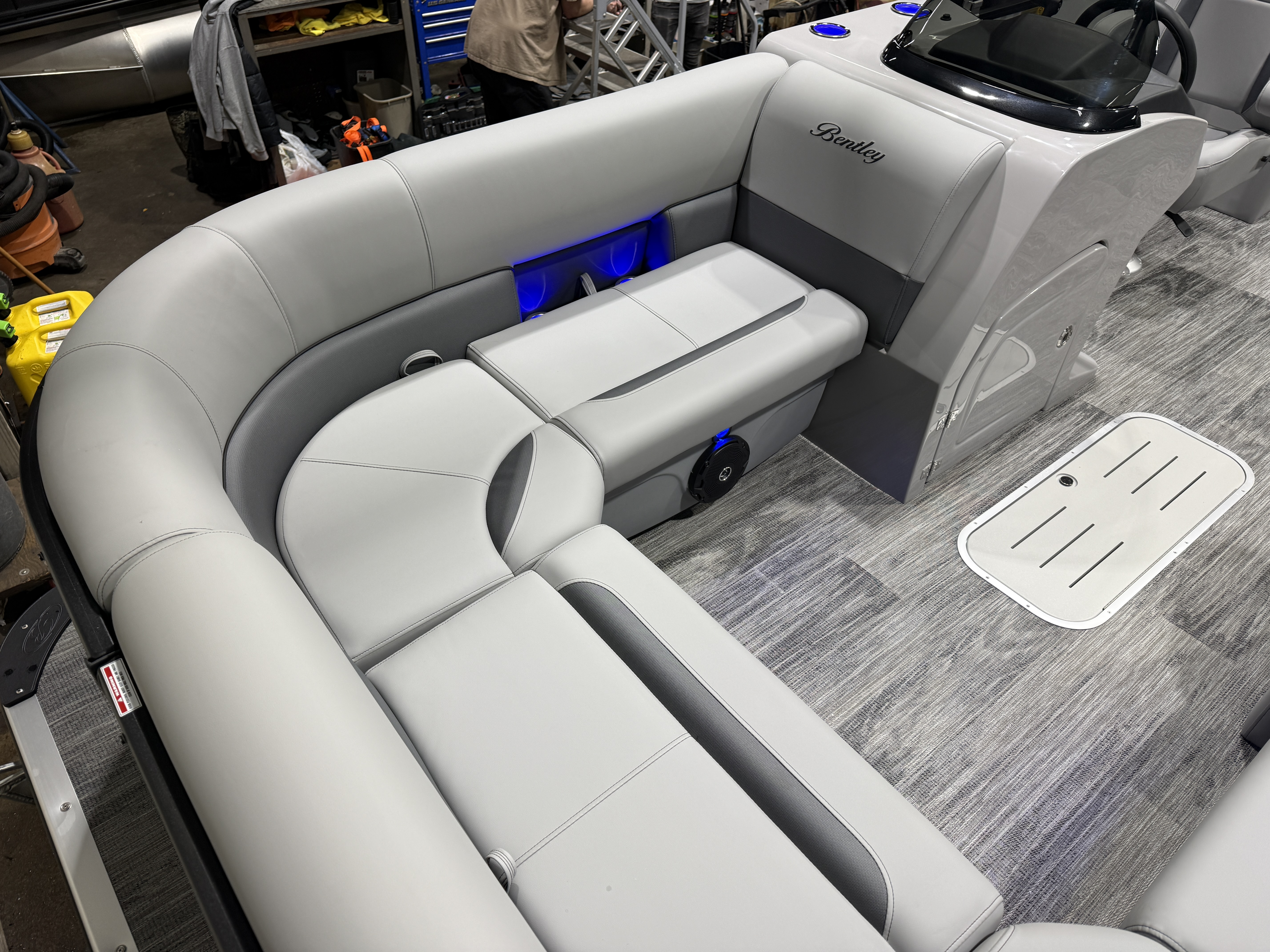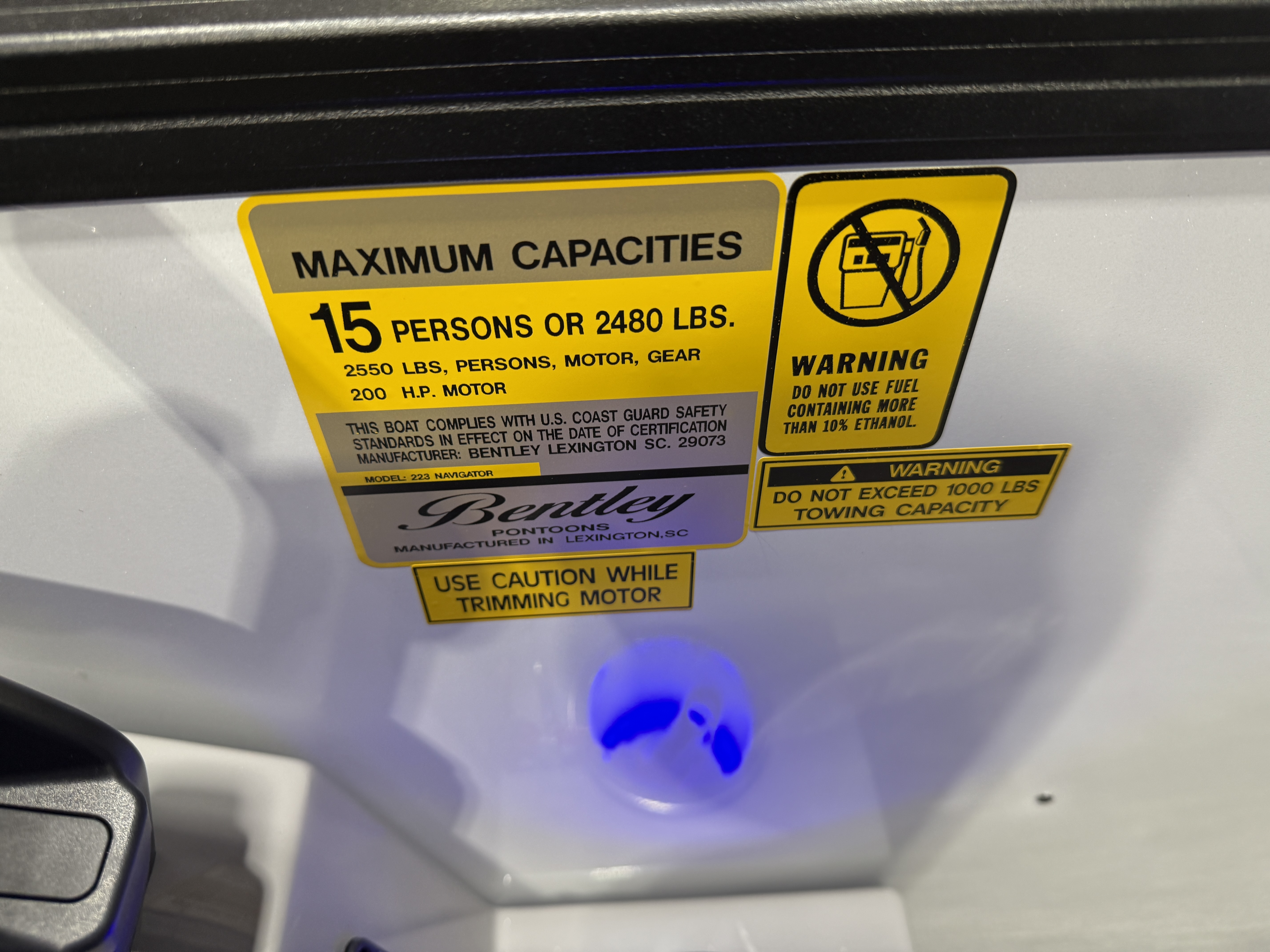 2026 Bentley Legacy 223 Navigator Quad Lounge Tritoon Pontoon & Honda 4-Stroke EFI. This 22' Tri-Toon Has Front Chaise Lounge Seating With Storage, Rear Chaise Lounge Seating W/Storage, Side By Side High-Back Reclining Captain's Seats, Movable Bow Filler, Interior Blue LED Package (Lighted Cup Holders & Courtesy Lights), Powder Coated Rails, Stainless Steel Flip Up Cleats, Humminbird Helix 5 GPS & Depth Finder, Ski Tow Bar, Bluetooth Radio w/4 Speakers, Table, Fiberglass Helm w/Storage, Plank Vinyl Flooring, Playpen Cover, Livewell, Built-In Cooler, Hydraulic Tilt Steering, Helm Storage, Underneath Sheeting, Lifting Strakes, Rear Ladder, Built-In Garbage Can, Gauge Package w/ Hour Meter, 25" Tubes, LED NAV Lights, Ski Locker In Tube, LED Docking Lights, New Battery, 10' Bimini Top, Built-In 32 Gallon Gas Tank, Rear Deck. Rated For 15 People!