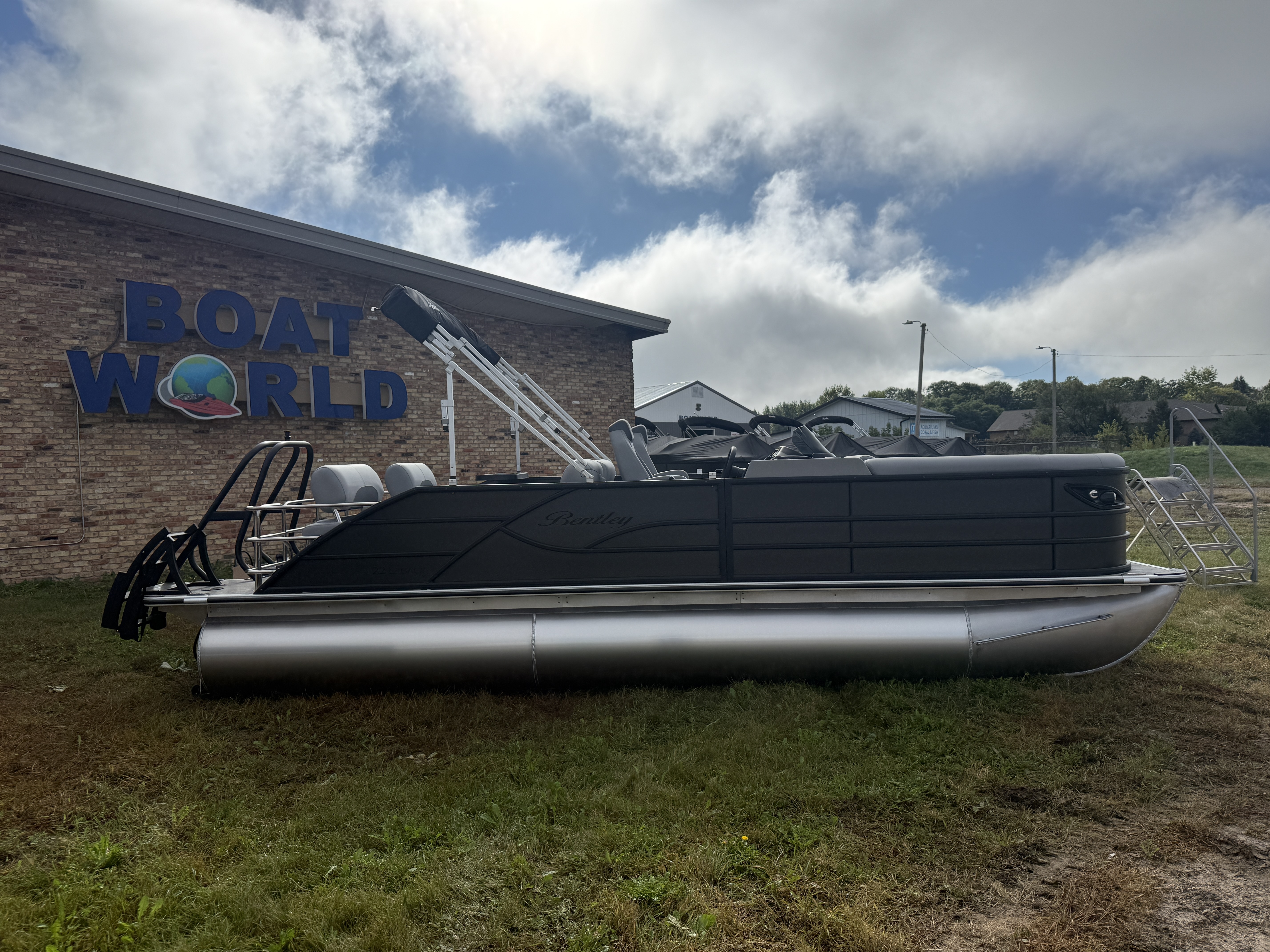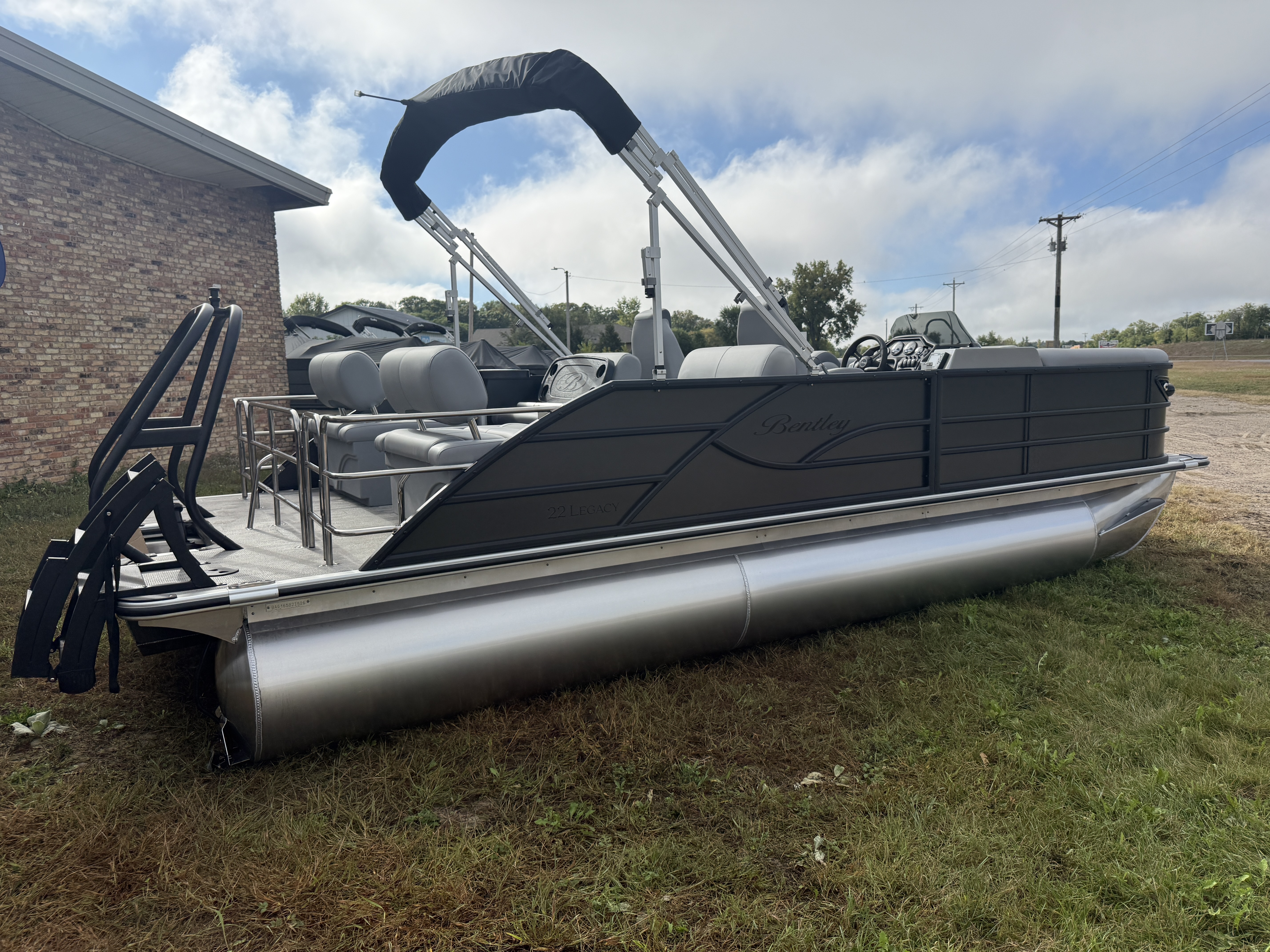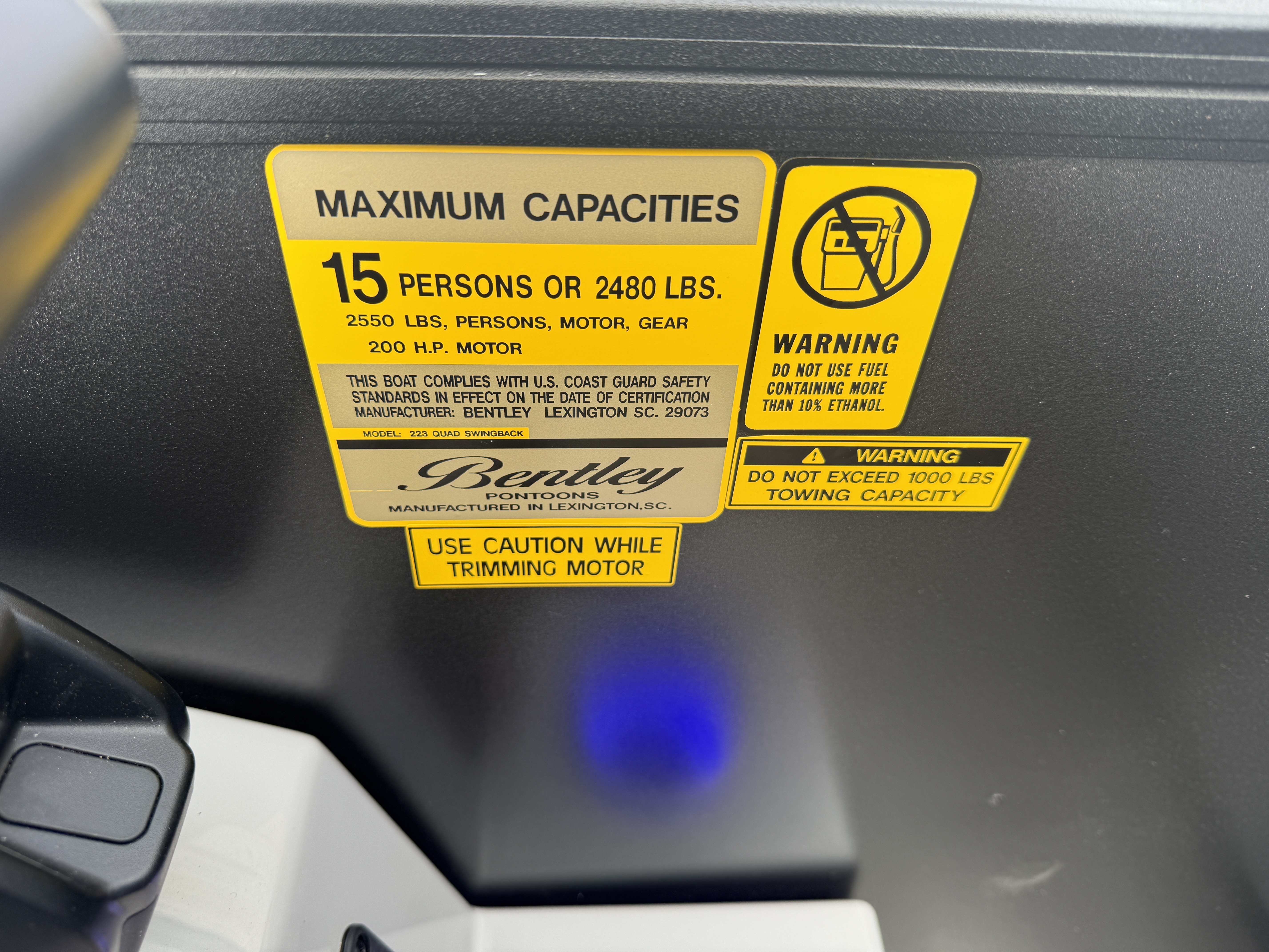 2026 Bentley Legacy 223 Quad (QSB) Swingback Tritoon Pontoon & Honda 4-Stroke EFI. This 22' Cruise Swingback Has Front Chaise Lounge Seating With Storage, Two High-Back Reclining Captain's Seat, Rear Quad Seating Swingback Rear Lounge (Multiple Positions) With Storage, Rear Safety Fencing, Interior Blue LED Package (Lighted Cup Holders & Courtesy Lights), Powder Coated Rails, Plank Vinyl Flooring, Livewell, Stainless Steel Flip Up Cleats, Humminbird Helix 5 GPS & Depth Finder, Ski Tow Bar, Bluetooth Radio w/4 Speakers, Two Tables, Fiberglass Helm w/Storage, Playpen Cover, Hydro Tilt Steering, Lifting Strakes, Underneath Sheeting, Rear Ladder, Battery On/Off Switch, Ski Locker In 3rd Tube, Gauge Package w/ Hour Meter, 25" Tubes, New Battery, LED Docking Lights, LED NAV Lights, Bimini Top, Built-In 32 Gallon Gas Tank, Front And Rear Deck. Rated For 15 People.
