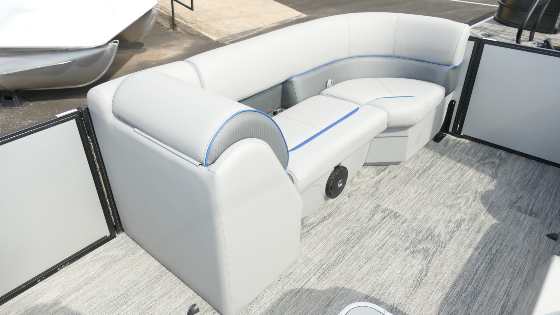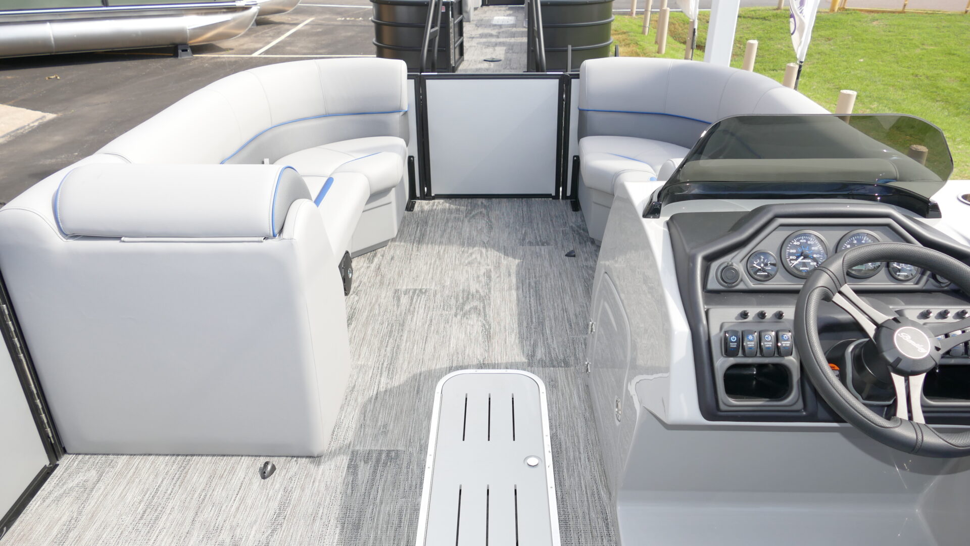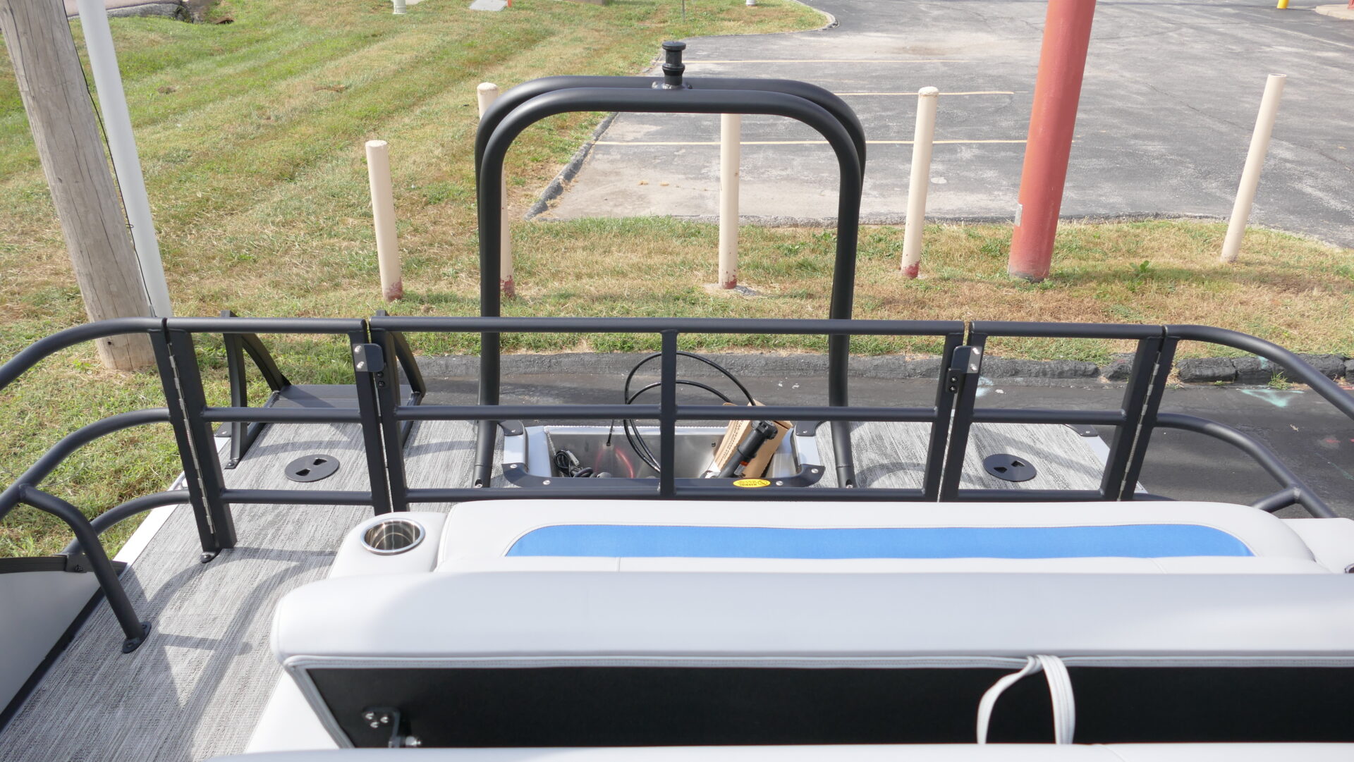 Exterior Colors : Matte Silver, Exterior Accent Color: Matte Blue, Rail Color : Textured Black, Interior Colors : Sport Gray With Blue Accents, Flooring : Lakeport Plank Gray Full Length Flooring. Honda BF200 4 Stroke, Sport Tri Toon Package: Lifting Strakes, Underskin, And Seastar Hydraulic Tilt Steering, SE Package Includes: Soft Touch Upholstery, Stainless Steel Cup Holders, Integrated Cupholders, In Floor Ski Locker, Black Rear Swingback Fence, Black Ski Tow Bar, Windshield, 10′ Black Bimini Top Frame, Black Graphics Package, Light Pod Option, Playpen Cover, Aluminum Propeller, Installed Battery Cables With Cutoff, Honda Gauges, 1 Cranking Battery, Fire Extinguisher, Lifetime Plus 5 Year Warranty. Trailer Available For An Additional Cost.