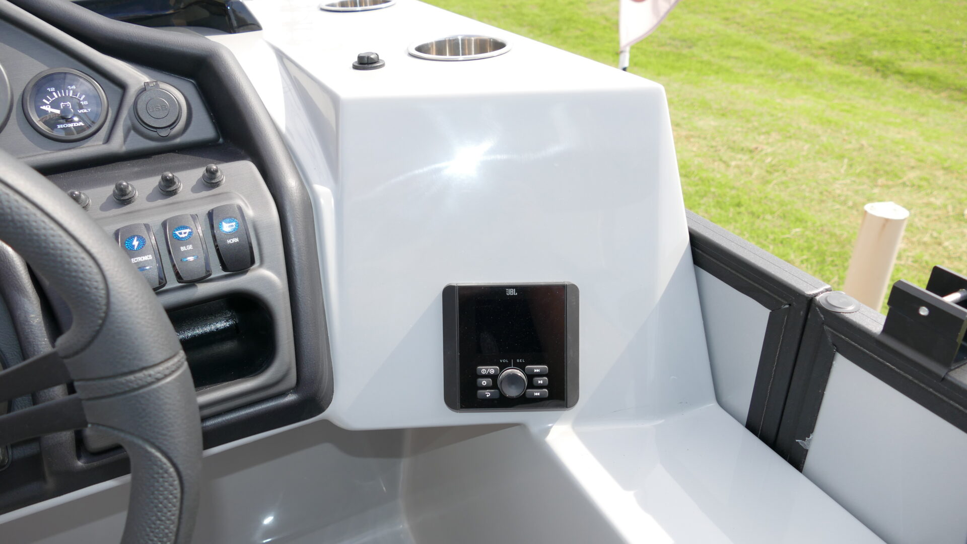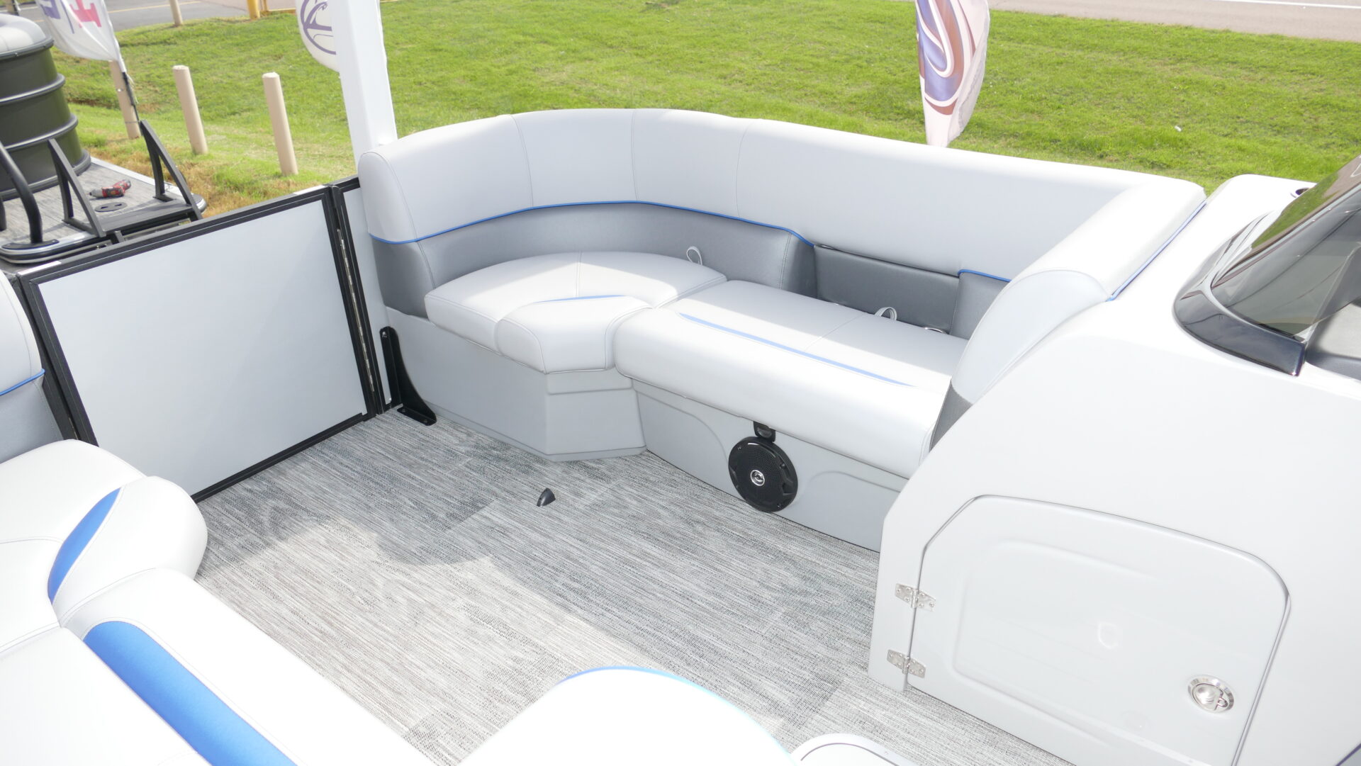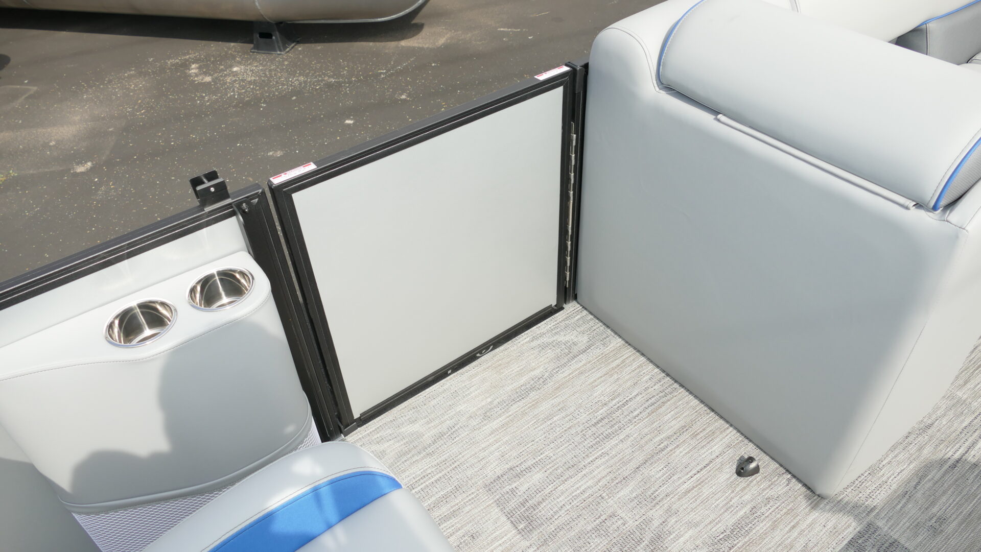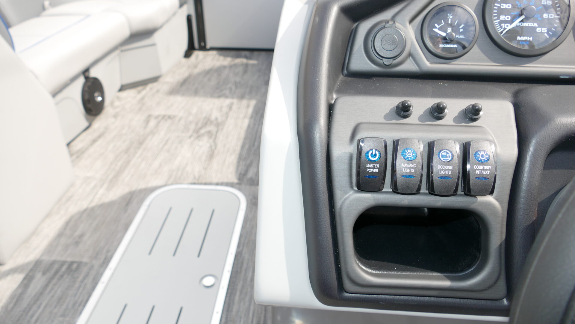 Exterior Colors : Matte Silver, Exterior Accent Color: Matte Blue, Rail Color : Textured Black, Interior Colors : Sport Gray With Blue Accents, Flooring : Lakeport Plank Gray Full Length Flooring. Honda BF200 4 Stroke, Sport Tri Toon Package: Lifting Strakes, Underskin, And Seastar Hydraulic Tilt Steering, SE Package Includes: Soft Touch Upholstery, Stainless Steel Cup Holders, Integrated Cupholders, In Floor Ski Locker, Black Rear Swingback Fence, Black Ski Tow Bar, Windshield, 10′ Black Bimini Top Frame, Black Graphics Package, Light Pod Option, Playpen Cover, Aluminum Propeller, Installed Battery Cables With Cutoff, Honda Gauges, 1 Cranking Battery, Fire Extinguisher, Lifetime Plus 5 Year Warranty. Trailer Available For An Additional Cost.
