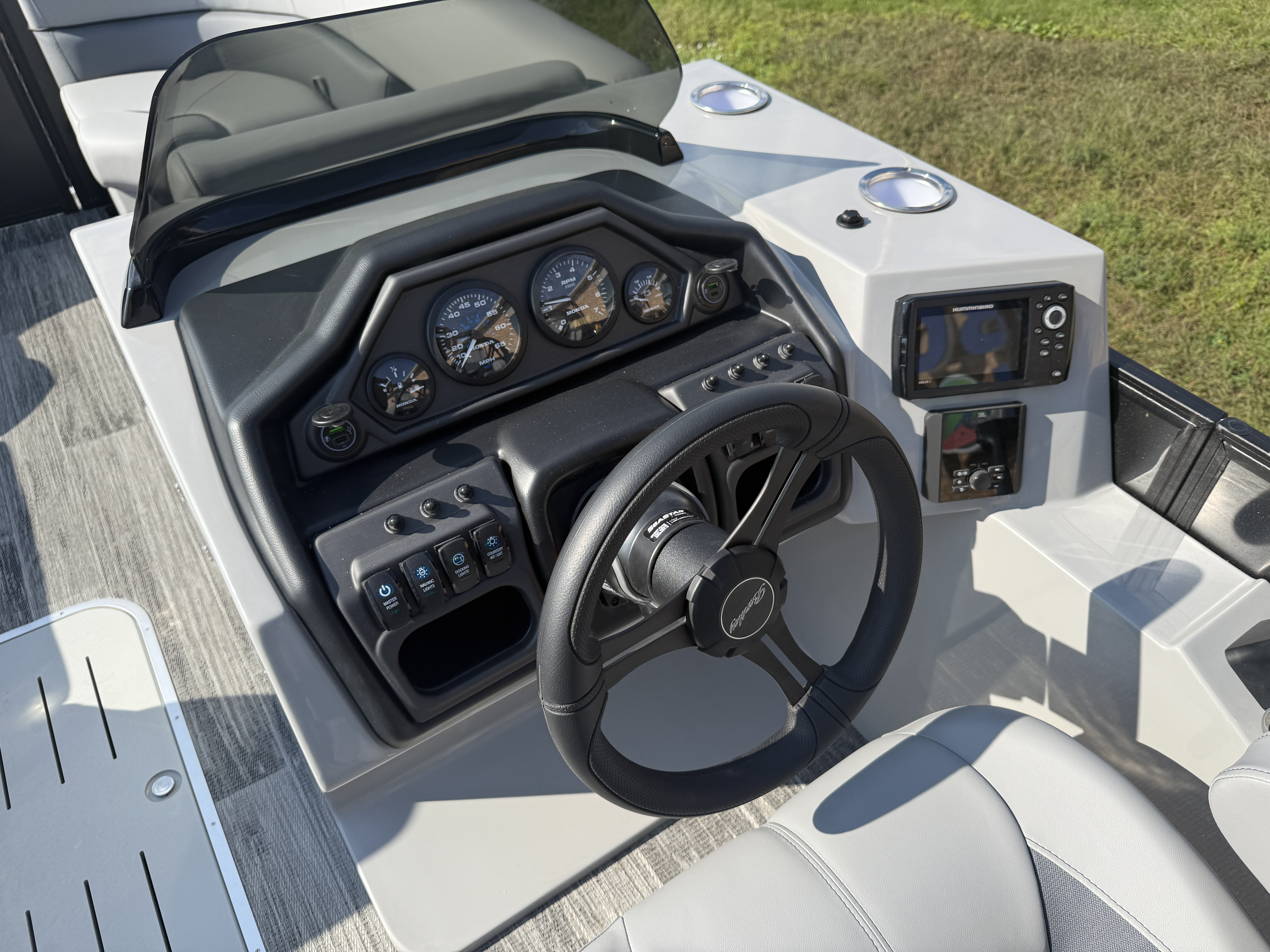 24' Cruise Swingback with Front Chaise Lounge Seating With Storage, Two High-Back Reclining Captain's Seat With Seat Slider, Rear Swingback Rear Lounge Seating With Multiple Positions & Storage, Rear Safety Fencing, Interior Blue LED Package (Lighted Cup Holders & Courtesy Lights), Powder Coated Rails, Seagrass Vinyl Flooring, Built-In Garbage Can, Stainless Steel Flip Up Cleats, Humminbird Helix 5 GPS & Depth Finder, Ski Tow Bar, Bluetooth Radio w/4 Speakers, Table, Pop-Up Table In Front Of Co-Captain, Fiberglass Helm w/Storage, Playpen Cover, Hydro Tilt Steering, Lifting Strakes, LED NAV Lights, LED Docking Lights, Rear Ladder, Gauge Package w/ Hour Meter, 25" Tubes, New Battery, Bimini Top Built-In 32 Gallon Gas Tank.