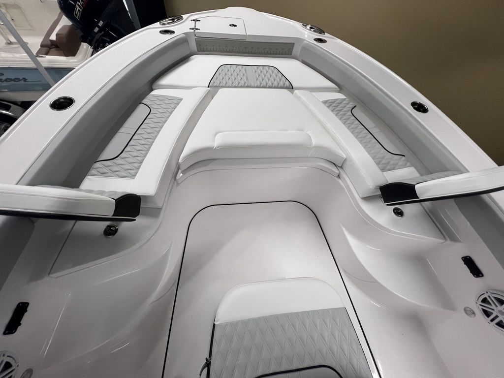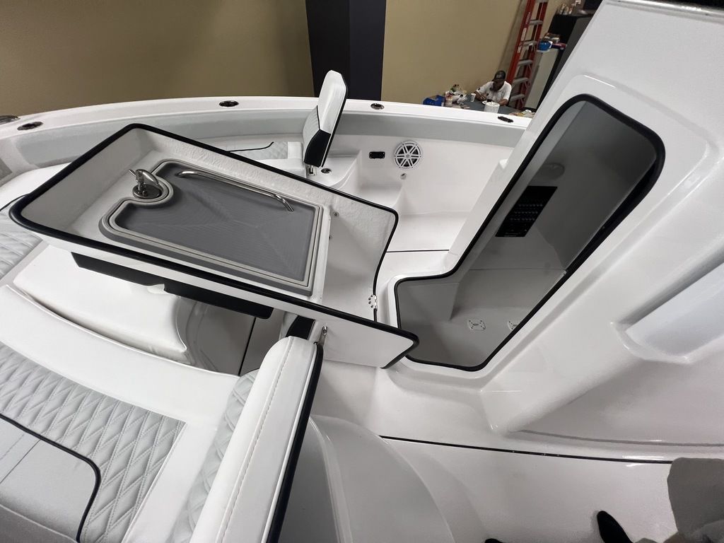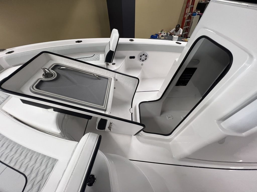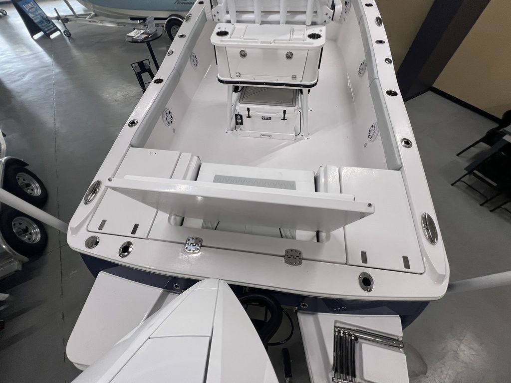 Featuring wide casting decks, ample under-seat storage, insulated fish boxes, and a large recirculating livewell, this boat is ready for serious anglers. The elevated helm station provides excellent visibility, while premium seating and refined finishes ensure all-day comfort for family or guests. Equipped with integrated rod storage, a spacious center console with head compartment, and advanced digital controls, this bay boat brings luxury and fishability together in one sleek package.