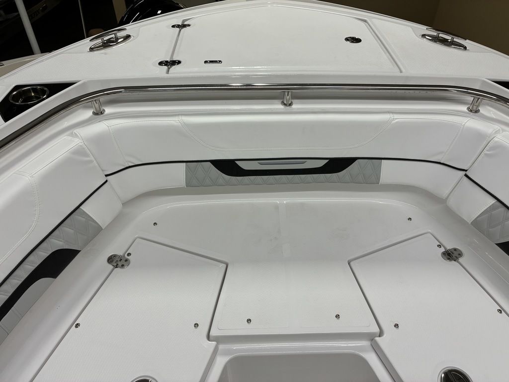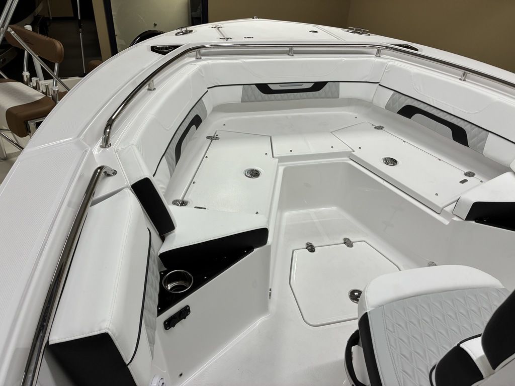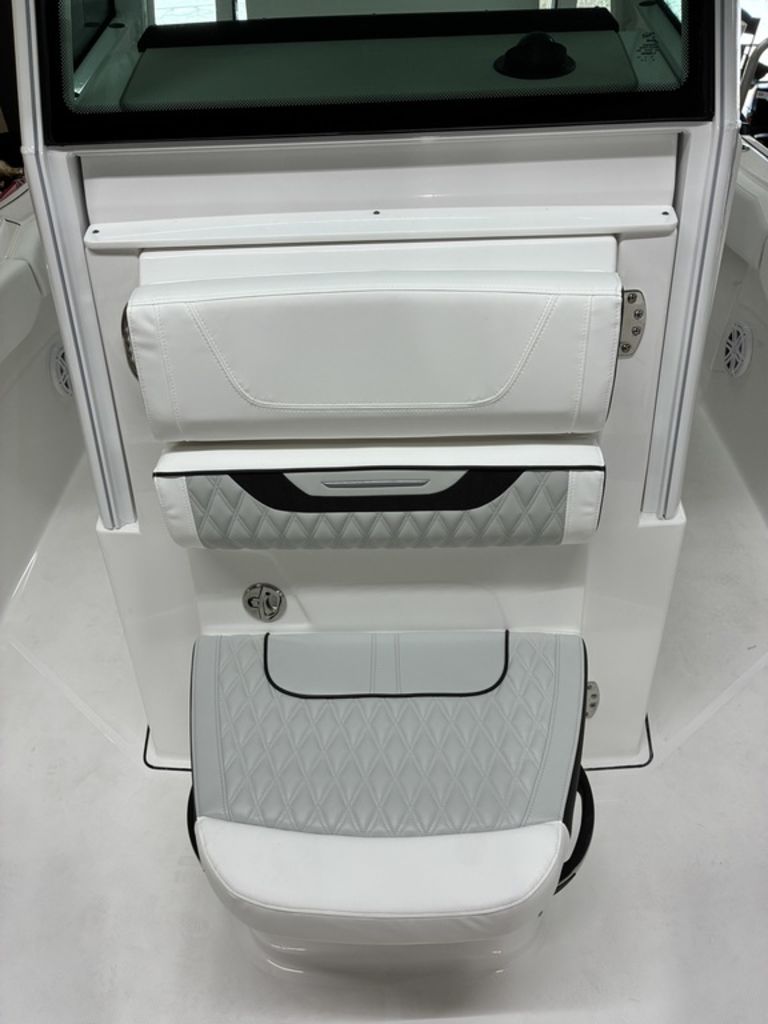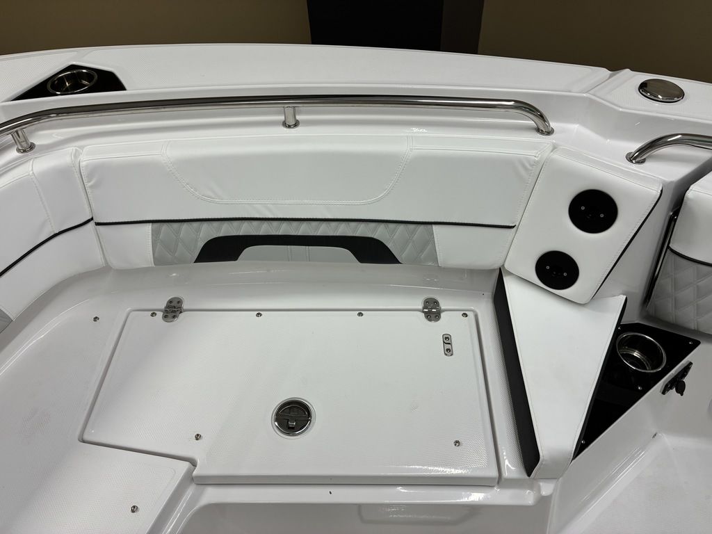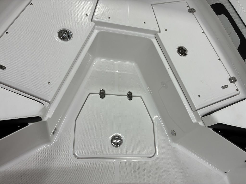 Inside, the cockpit pulses with purpose: gunnel- and hardtop-mounted rod holders secure your arsenal, while a massive live baitwell and in-floor macerated fish boxes with pump-outs keep the action fresh for all-day battles. U-shaped bow seating folds out for lounging or casting, and the fold-away transom bench transforms into a social hub for sunset debriefs. Dive into the spacious head compartment, where the electric toilet with macerator and overboard discharge delivers civilized convenience mid-adventure—no pit stops required. Plush feather upholstery—soft, durable, and feather-light in feel—wraps every seat in cloud-like comfort, resisting the salt spray while cradling you through long hauls.