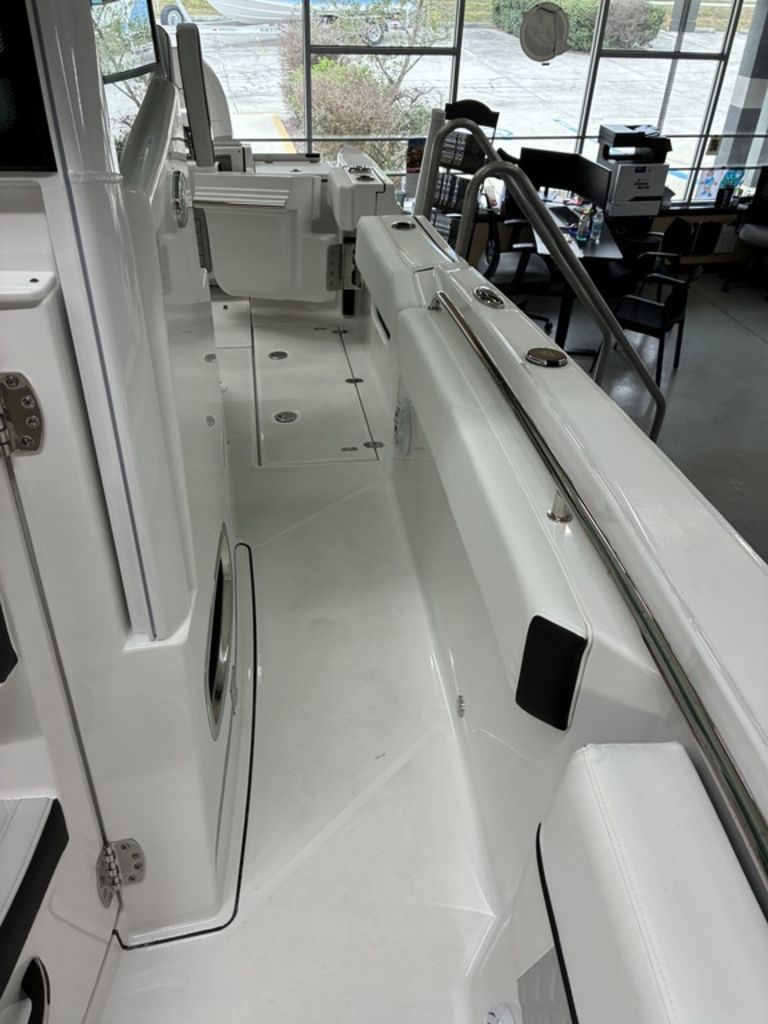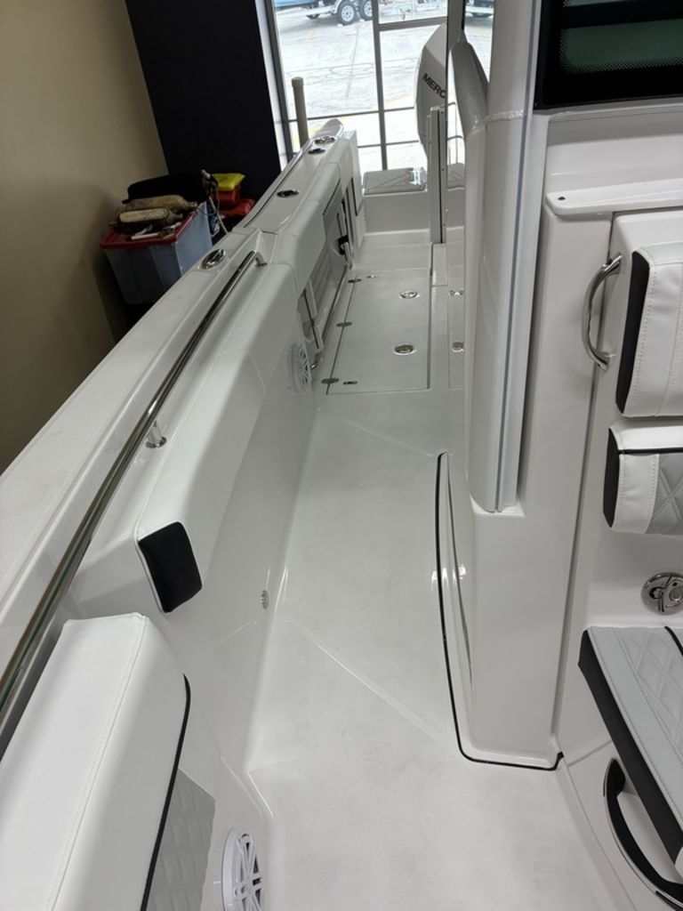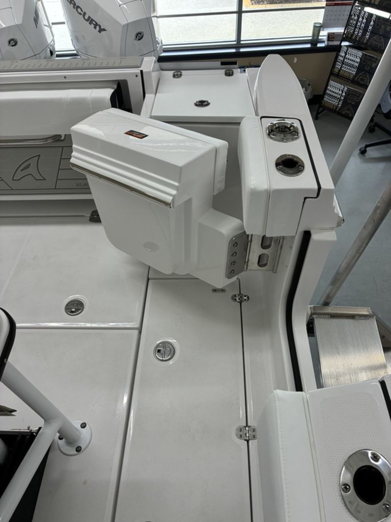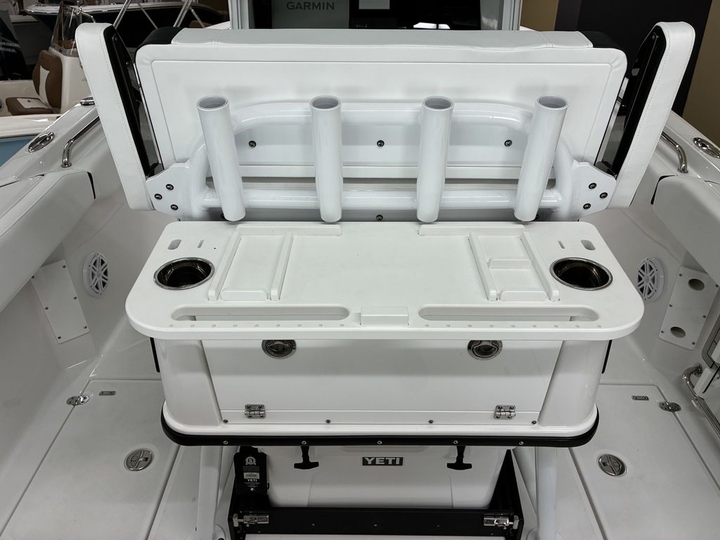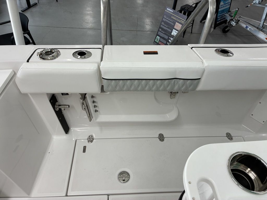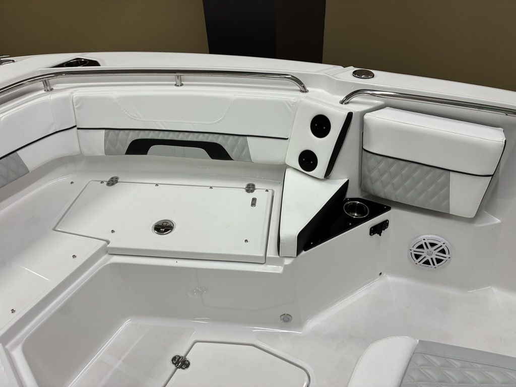 Inside, the cockpit pulses with purpose: gunnel- and hardtop-mounted rod holders secure your arsenal, while a massive live baitwell and in-floor macerated fish boxes with pump-outs keep the action fresh for all-day battles. U-shaped bow seating folds out for lounging or casting, and the fold-away transom bench transforms into a social hub for sunset debriefs. Dive into the spacious head compartment, where the electric toilet with macerator and overboard discharge delivers civilized convenience mid-adventure—no pit stops required. Plush feather upholstery—soft, durable, and feather-light in feel—wraps every seat in cloud-like comfort, resisting the salt spray while cradling you through long hauls.