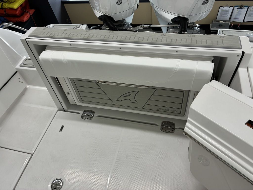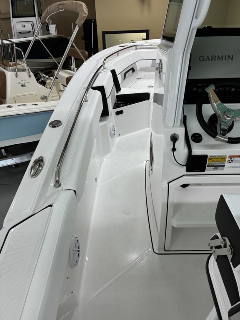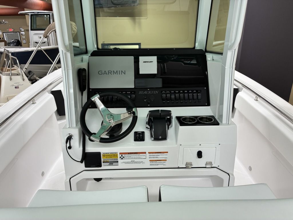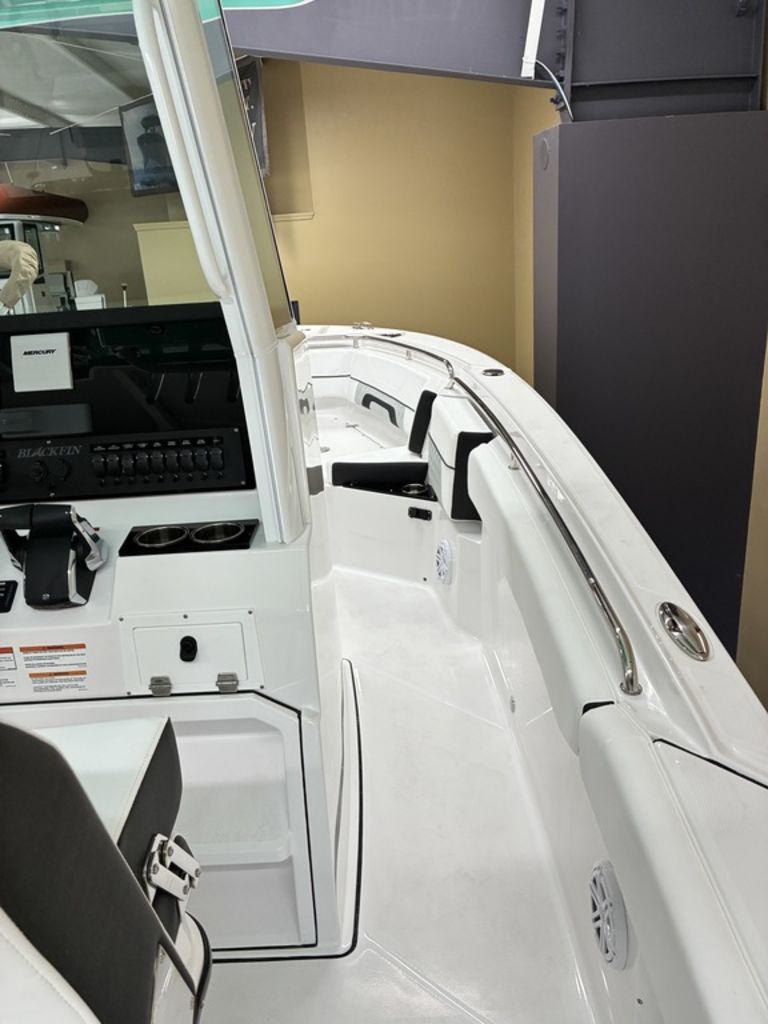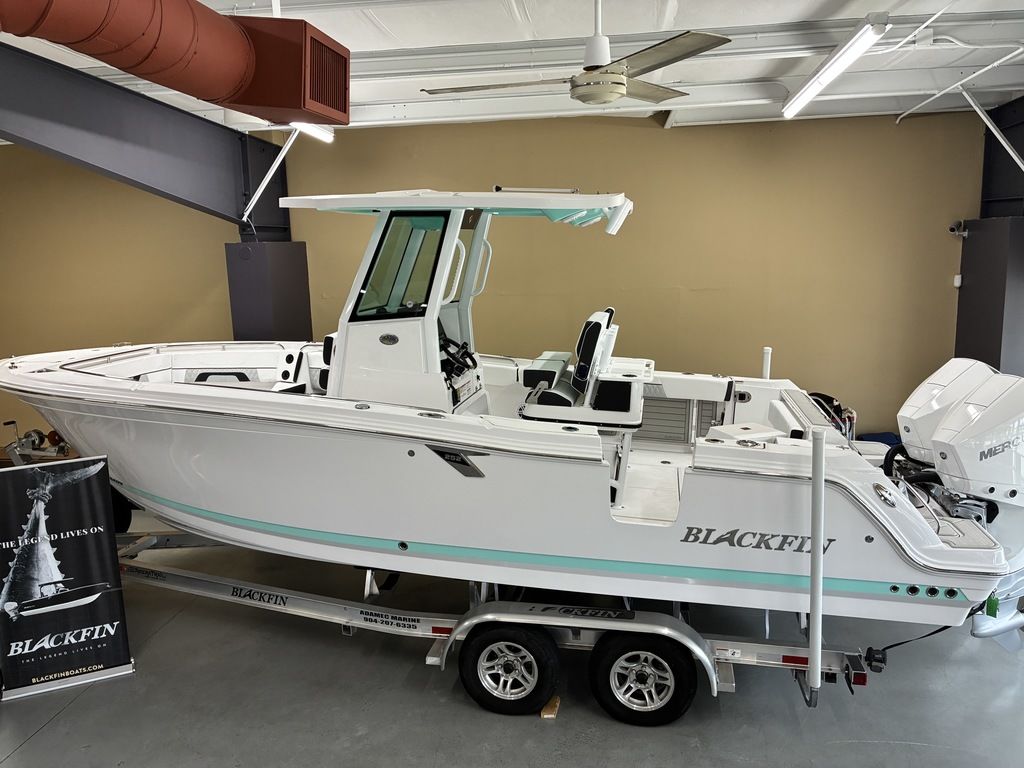 Envision the open sea yielding to your command, a sleek silhouette slicing through swells with unyielding precision, its Sea Foam Green stripe gleaming like a siren's call against the deep blue expanse. The 2026 Blackfin 252 CC isn't merely a center console—it's a meticulously engineered beast of fiberglass prowess, blending tournament-grade fishing muscle with family-ready luxury for the ultimate coastal conquest. Stretching 24'6" overall (27'5" with engines) on an expansive 8'10" beam, this deep-V hull (22° deadrise) devours rough water while maintaining a nimble 2'11" draft, letting you chase pelagics into skinny inlets or punch offshore without mercy. Dry, stable, and blisteringly fast, it's the vessel that turns every voyage into legend.