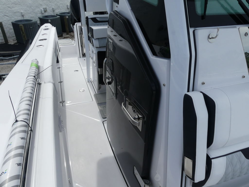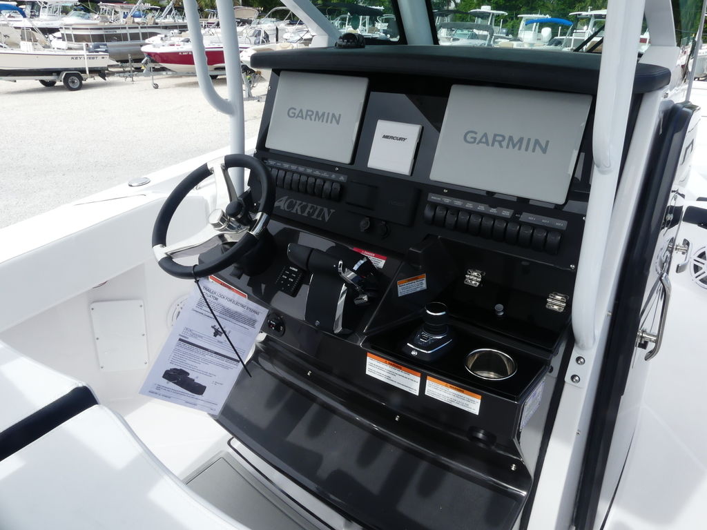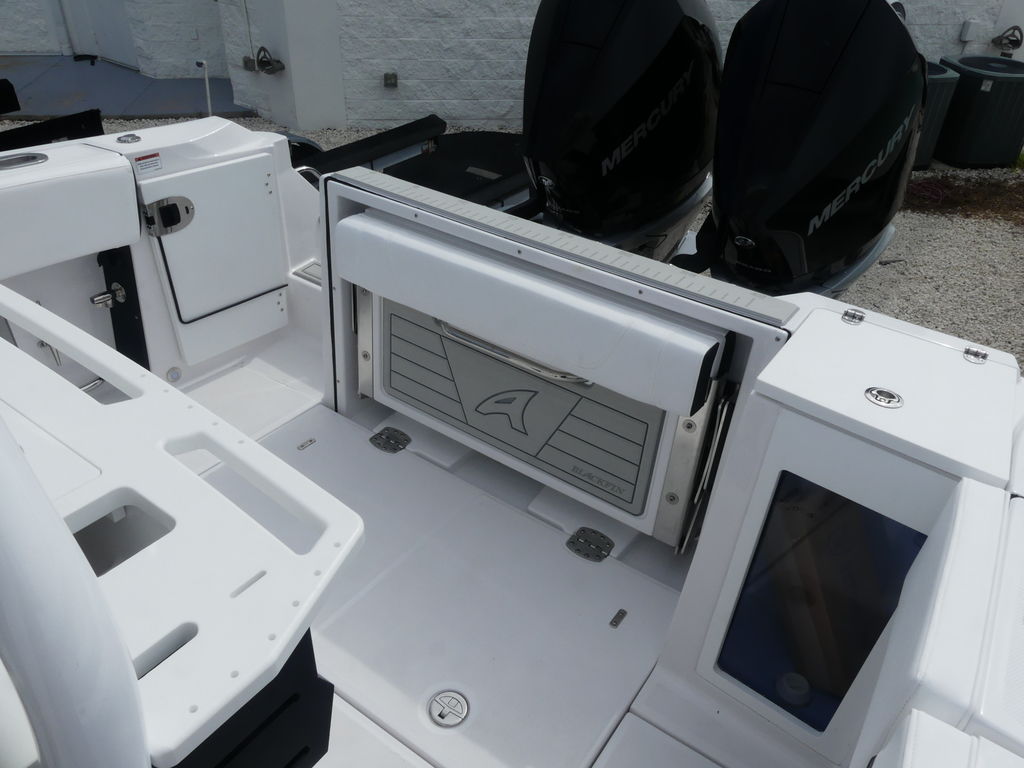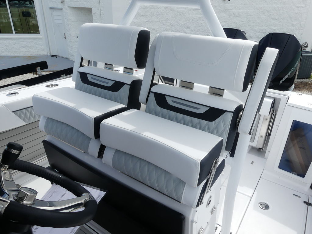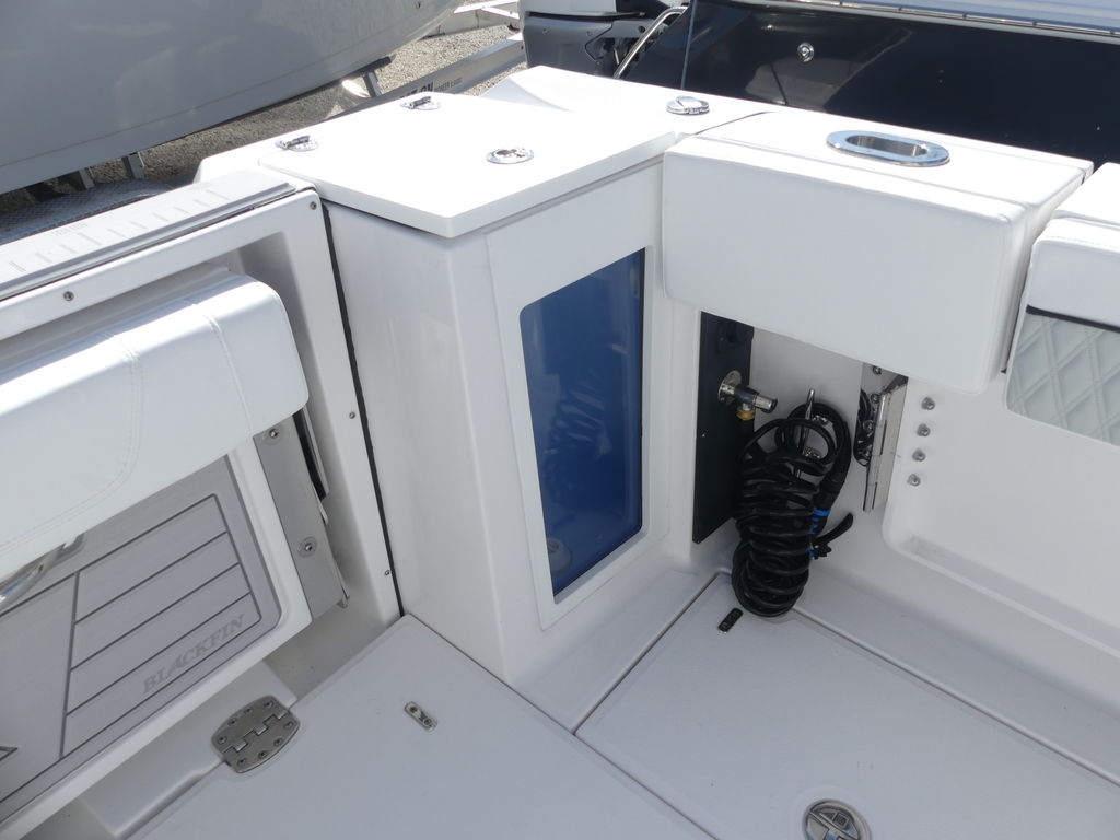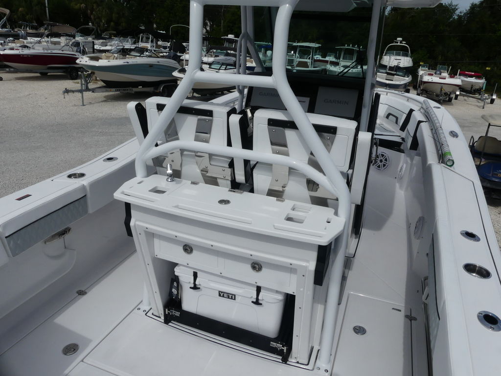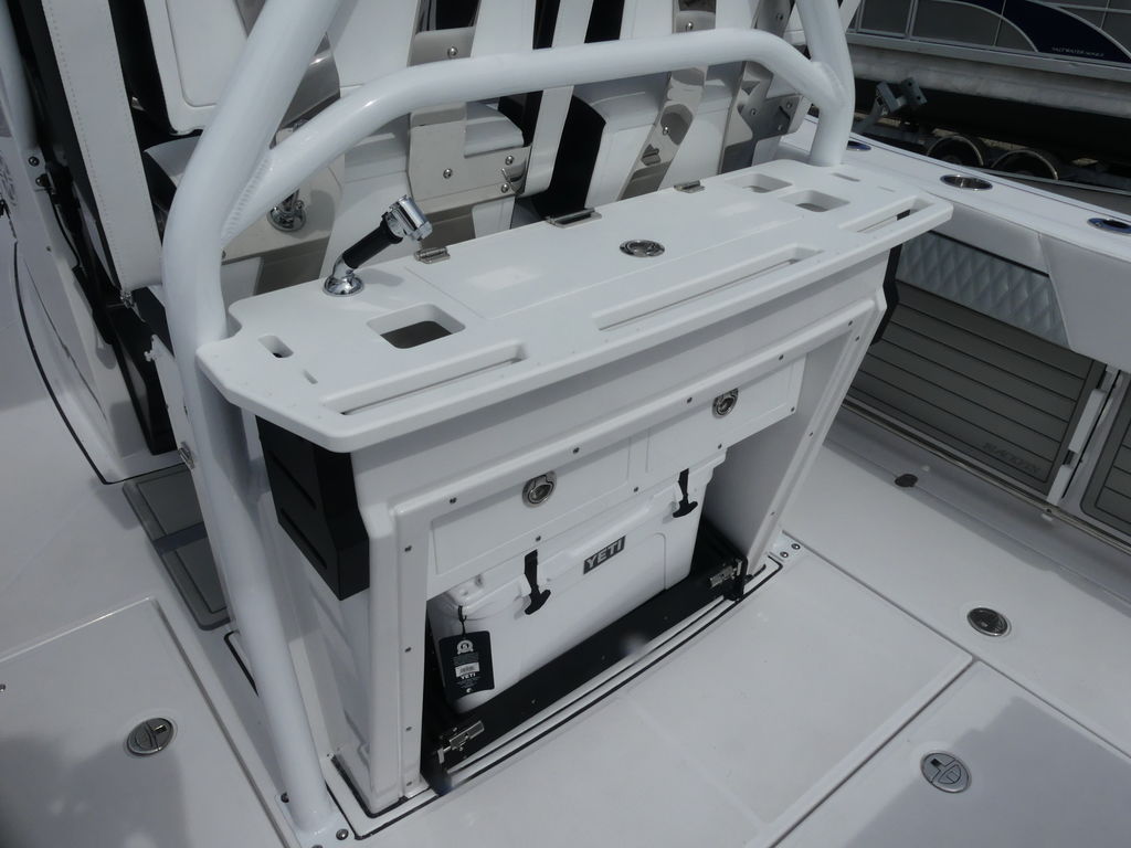 - Leaning Post, Fiberglass w/ Helm Seats & Flip-Up Bolsters, Pull-Out/Removable 45QT Yeti Tundra Cooler, Sink w/Fresh Water Pull-Out Sprayer, Bait Prep Station w/Cutting Board, Drink Holders, Storage Drawers (2), & Slide Out Tackle Utility Boxes (4)