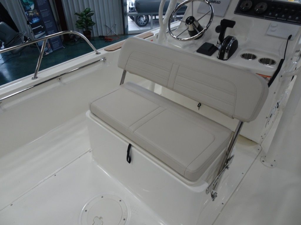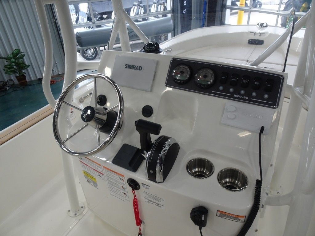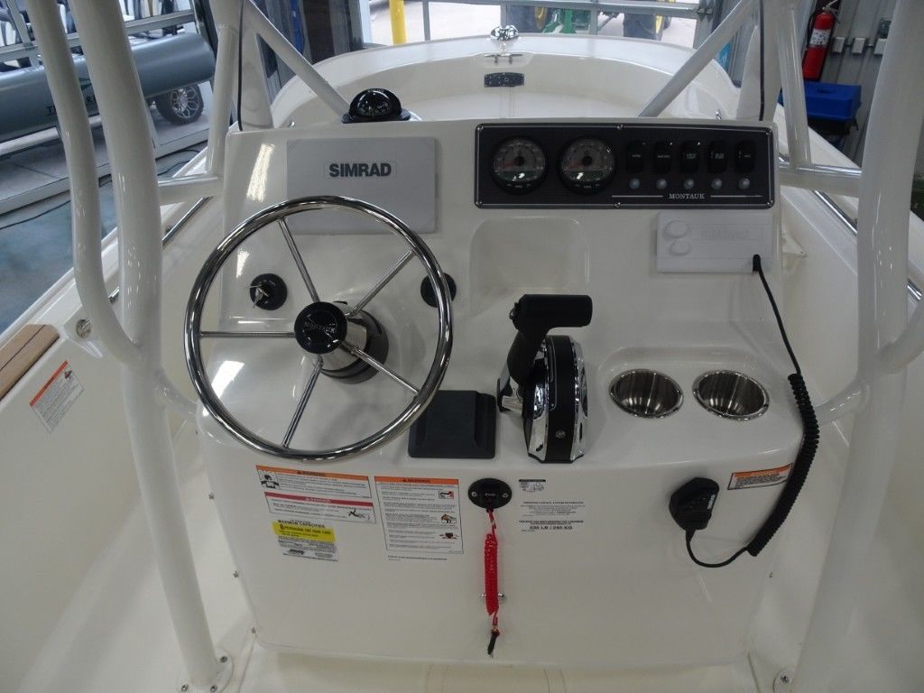The classic, unsinkable 170 Montauk boat is a multi-purpose 17-foot inshore center console boat that can do anything. It’s clean, timeless style, open layout, and easy-to-own utilitarian design make it ideal for fishing, cruising the beach, or just relaxing with family on the weekend. Integrated Simrad® technology at the helm, a 25-gal. fuel tank, and a large forward fish box that doubles as storage gives you everything you need to enjoy the day no matter how you choose to spend it.