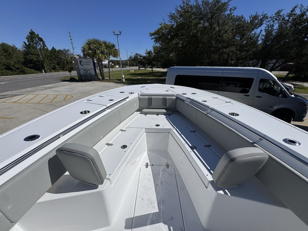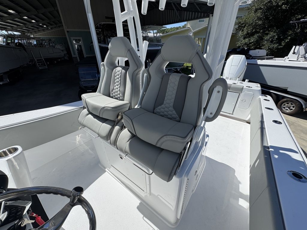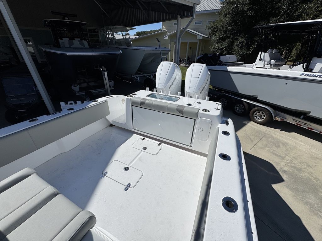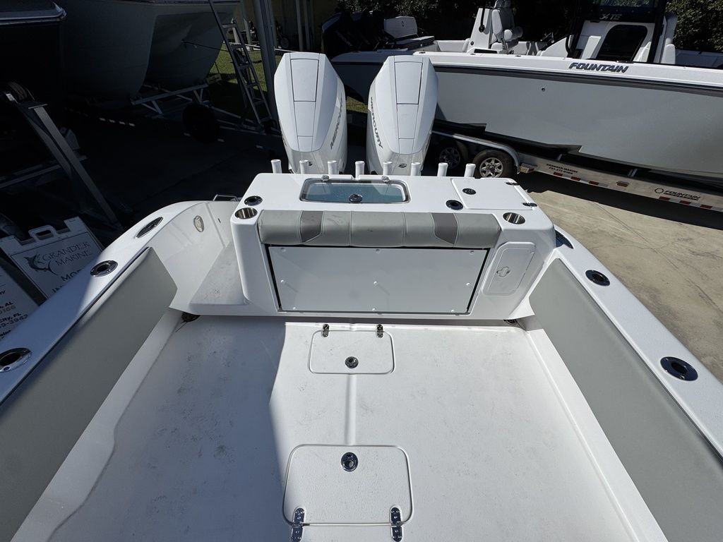 Extra EverythingGet the job done with the standard 41 rod holders, while a huge dash provides plenty of room for multiple large displays. Additional storage is discovered in the huge walk-in console. A drink cooler is offered beneath the flip up front seat that quickly transforms into a lounge seat with a flip-up footrest. A 7’ fully insulated fish box offers 700 quarts of frozen storage that is pumped overboard during cleanup.