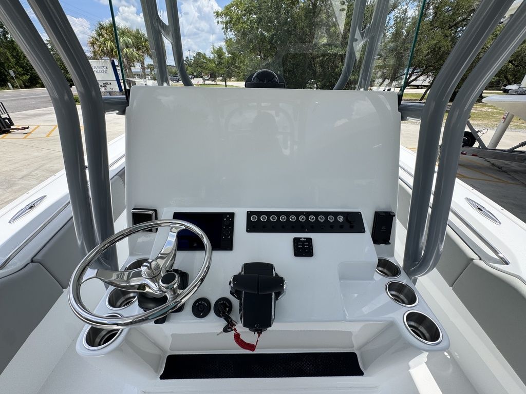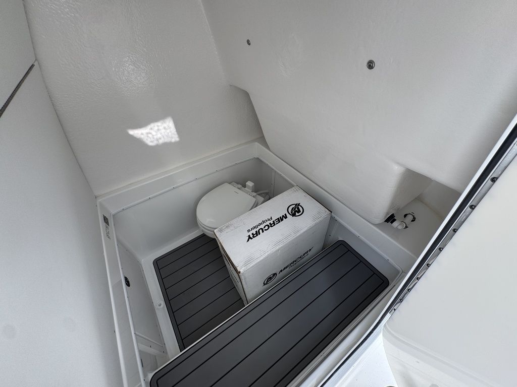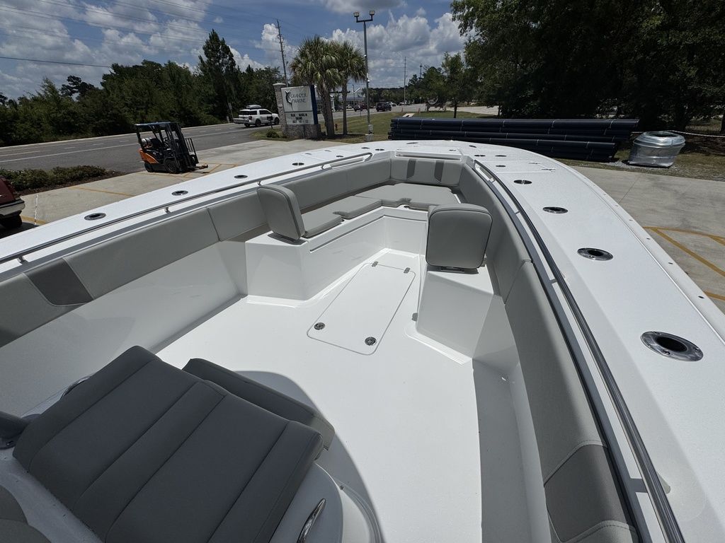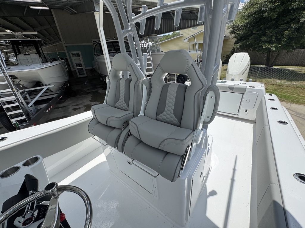 Extra EverythingGet the job done with the standard 41 rod holders, while a huge dash provides plenty of room for multiple large displays. Additional storage is discovered in the huge walk-in console. A drink cooler is offered beneath the flip up front seat that quickly transforms into a lounge seat with a flip-up footrest. A 7’ fully insulated fish box offers 700 quarts of frozen storage that is pumped overboard during cleanup.