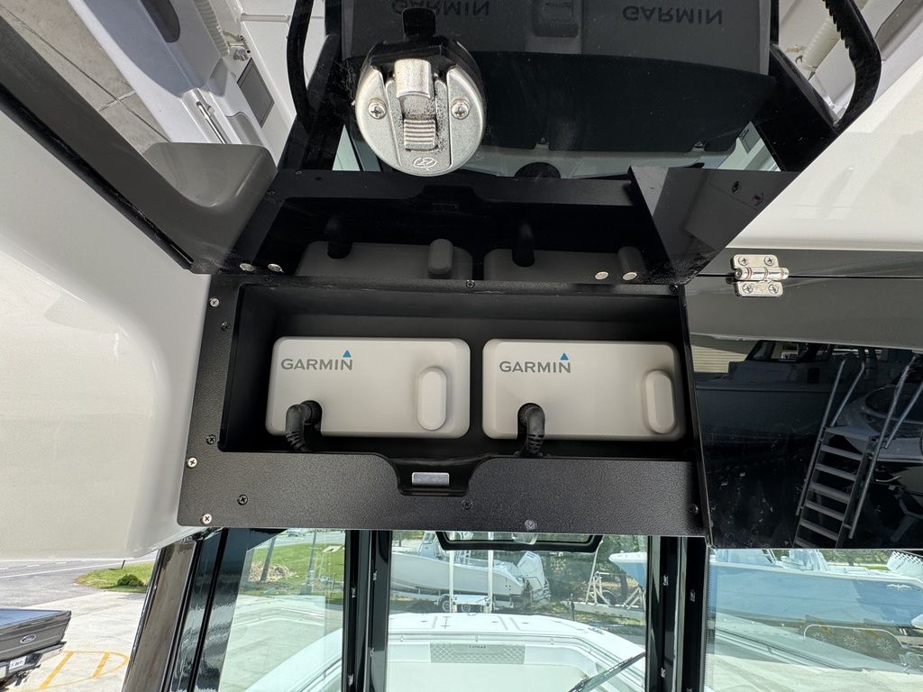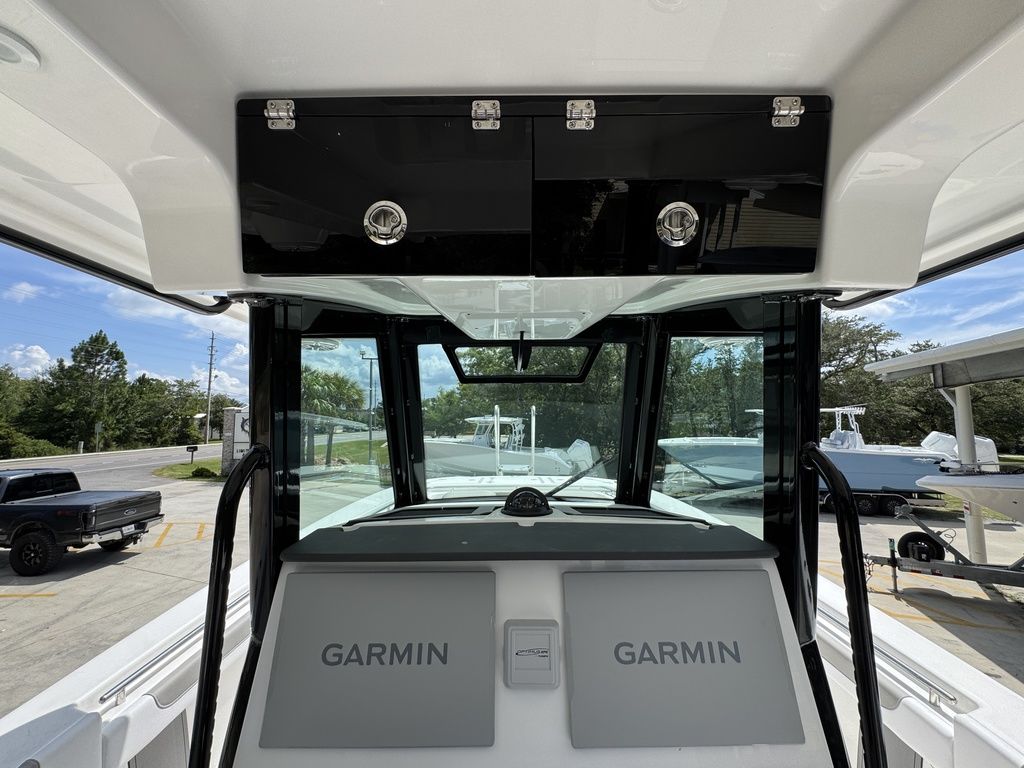 - Fiberglass hardtop with integrated powder coated aluminum supports, aft and fwd facing Lumitec® spreader lights, (7) rocket launchers, overhead electronics pod with storage, molded in radar pod and (4) overhead lights, easy access pass through hatch, (4) speaker pods, and 3-sided custom glass windshield with electrically actuated windshield vent