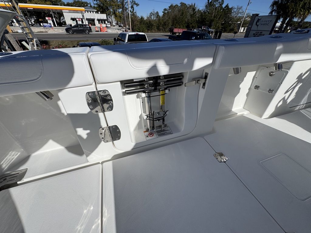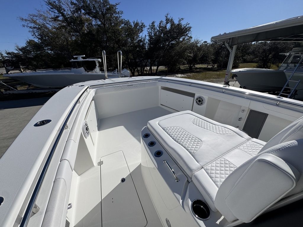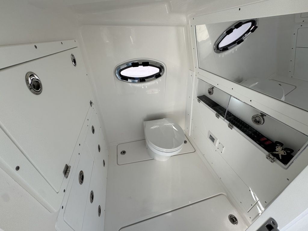 The 34 CT won’t know or understand boundaries and will be ready to take anything Mother Nature throws its way. With the double stepped, semi-asymmetric hulls and plenty of bow flair, you can fish in comfort through water you’d never brave with another center console in its class. The 34 CT contains six insulated plumbed storage boxes, totaling 3,000 qt of storage connected to macerator pumps. With two storage compartments forward, two mid-ship, and two in the cockpit floor, you can choose where you want to utilize the space for storage versus fishboxes. A 70 gallon transom livewell is standard, with options to add two 25 gallon live wells alongside, as well as plumbing the two after insulated storage boxes as livwells, for a total of 5 bait tanks all fed by a Hooker sea chest and Hooker electric pumps.
