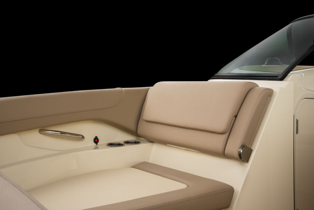 While comfortably seated at the helm, the flush mounted 12” Garmin display is right at your fingertips. The captain’s chair puts you in control behind a beautiful high-gloss mahogany steering wheel and curved glass and stainless-steel windshield. Mercury Smartcraft Premier Controls are standard with a digital display integrated into the control base. The unique wave pattern stitching on the double wide helm seat is complemented by a thick stainless-steel bar, and a thigh bolster brings added height and visibility.