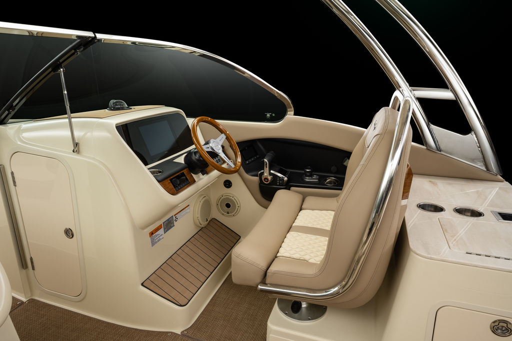 While comfortably seated at the helm, the flush mounted 12” Garmin display is right at your fingertips. The captain’s chair puts you in control behind a beautiful high-gloss mahogany steering wheel and curved glass and stainless-steel windshield. Mercury Smartcraft Premier Controls are standard with a digital display integrated into the control base. The unique wave pattern stitching on the double wide helm seat is complemented by a thick stainless-steel bar, and a thigh bolster brings added height and visibility.