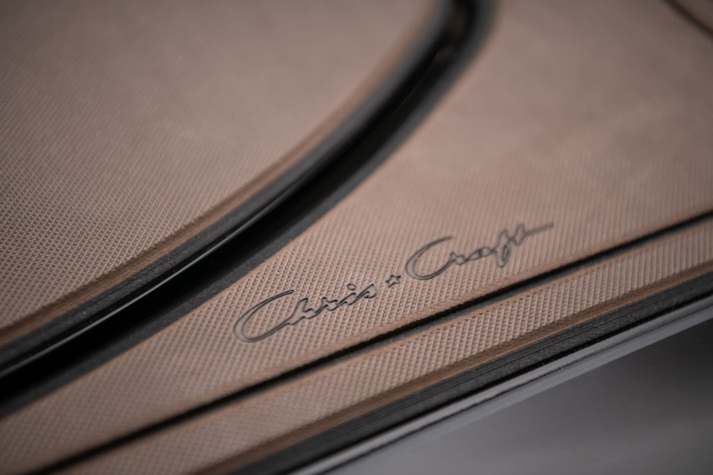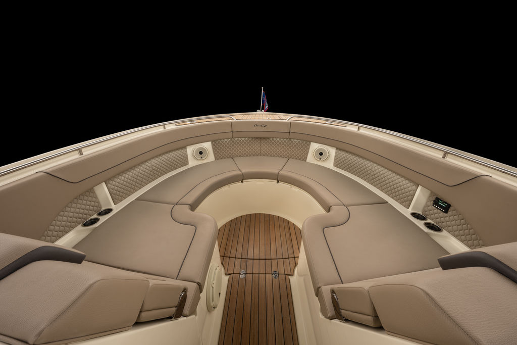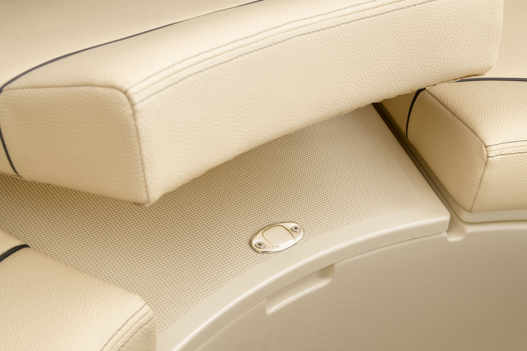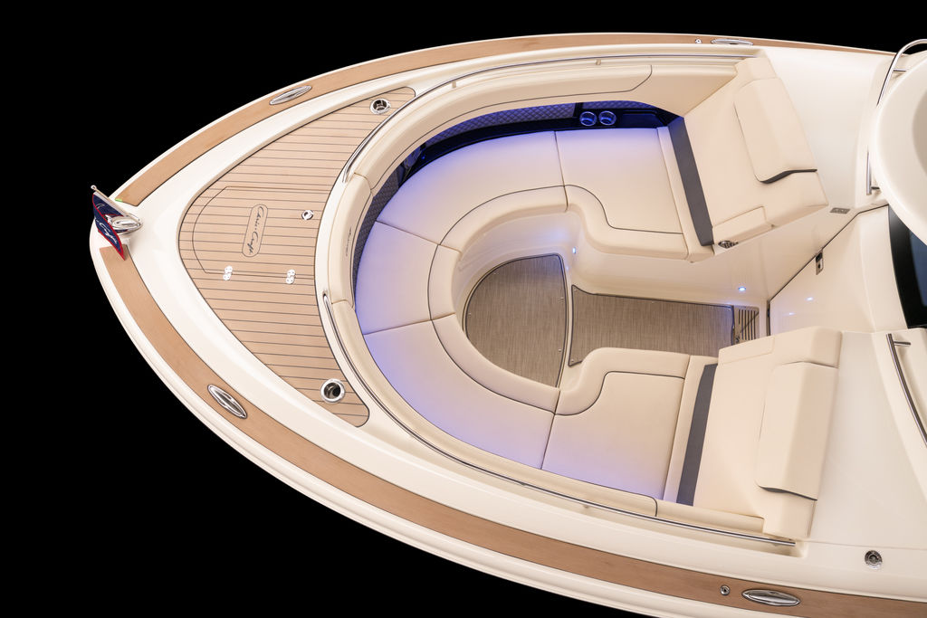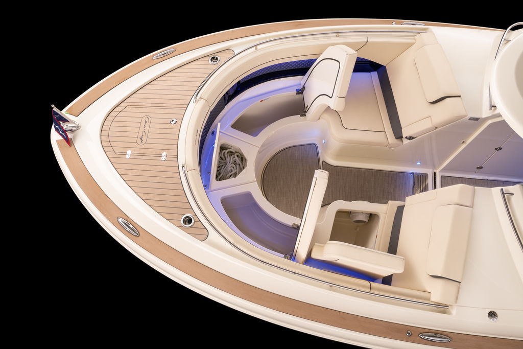 An expansive bow area with quilted side pockets has abundant storage, including dedicated fender rack and line hangers. A power actuated table rises out of the floor at the push of a button, creating an easy dining area.
