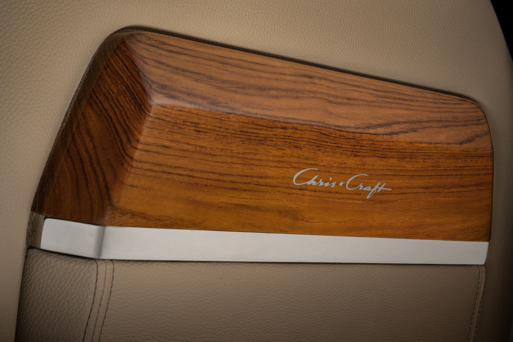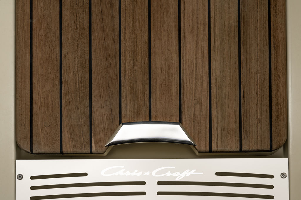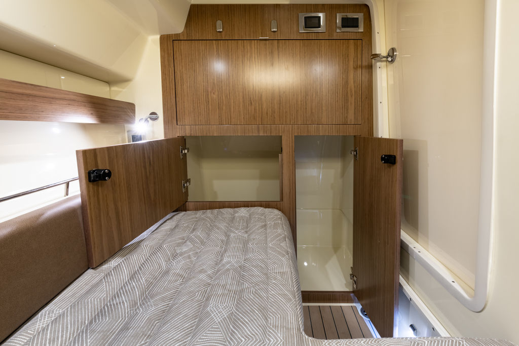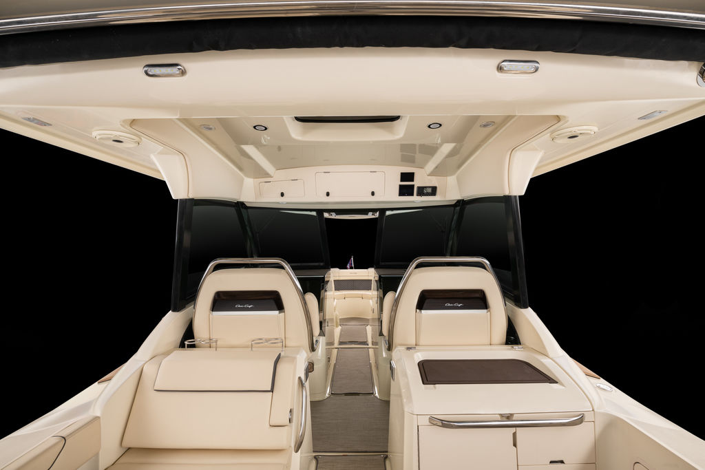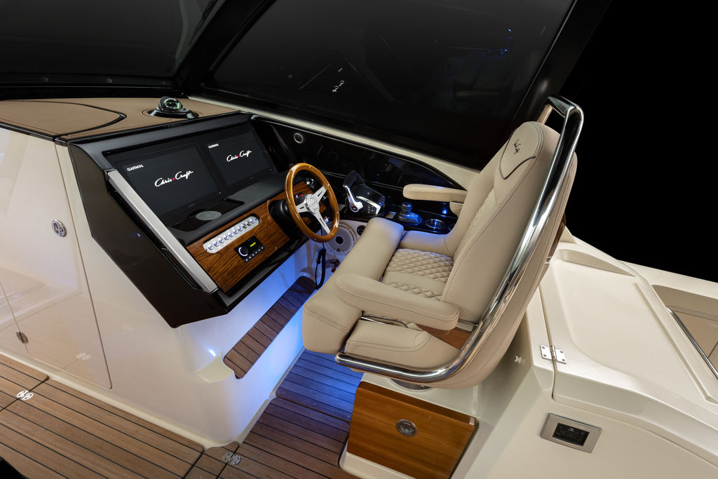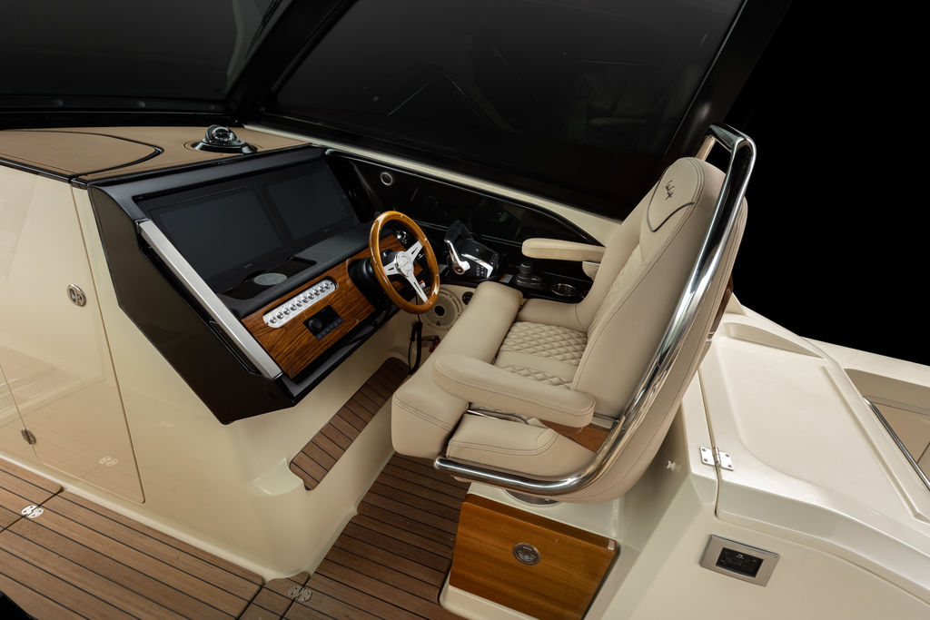 The helm is adorned with high-gloss teak accents and flush mounted dual 12” Garmin multifunction displays. Joystick piloting comes standard on the Calypso 35. Additional air conditioning vents at the helm to provide the ultimate comfort.