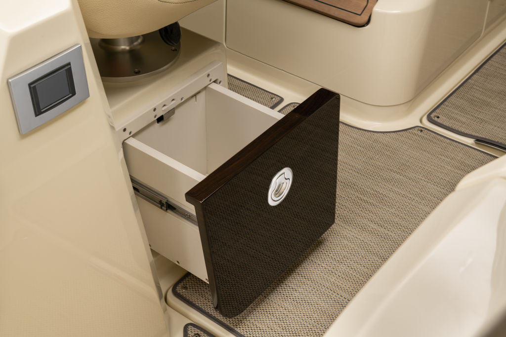 The aft cockpit has ample seating with a multi-position rear facing lounge and foldout aft seating. The cockpit galley is both stylish and convenient, with a concealed refrigerator, drawer storage, sink with hot and cold water, and an optional grill.
