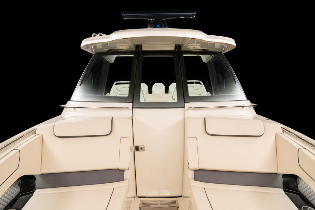 The fully enclosed windshield with a center walk-through and sliding wind door provides exceptional weather protection. With the push of a button, the windshield opens and encloses into the hard top, creating unobstructed views through both driver and passenger sides. An internally mounted SureShade covers the entire aft cockpit.