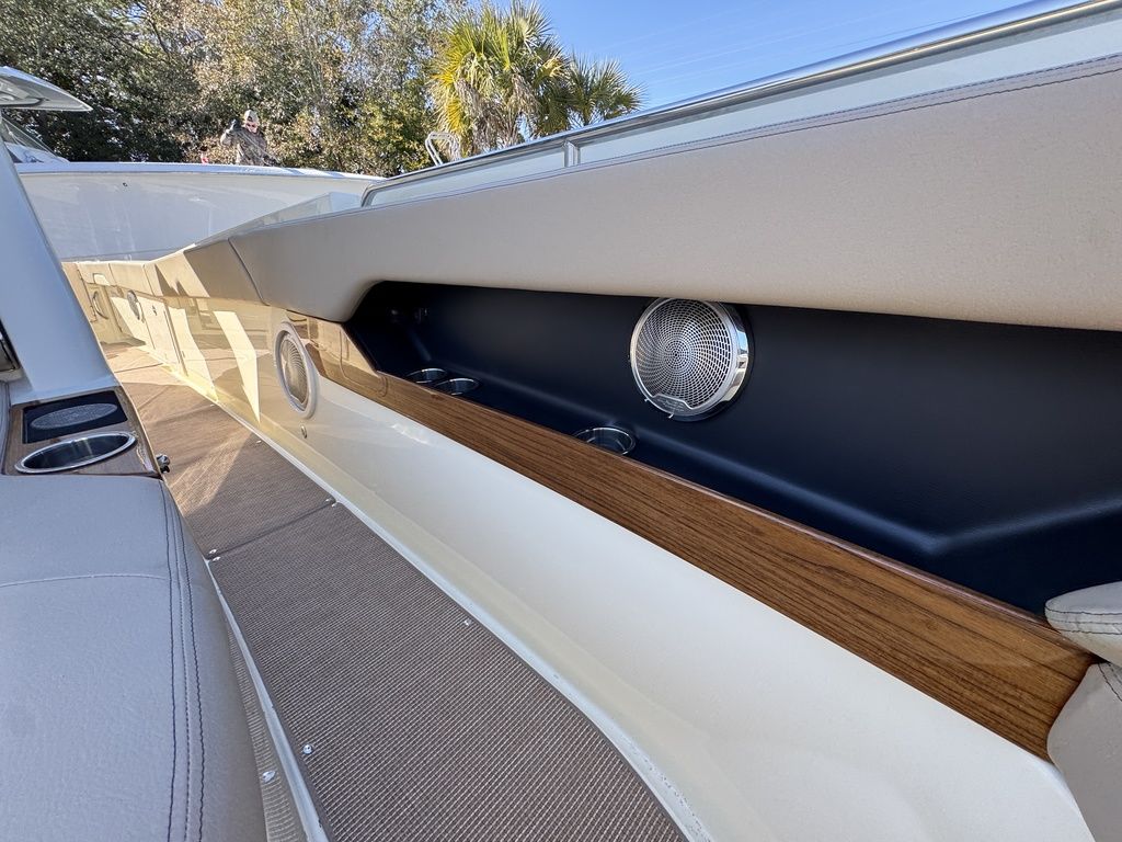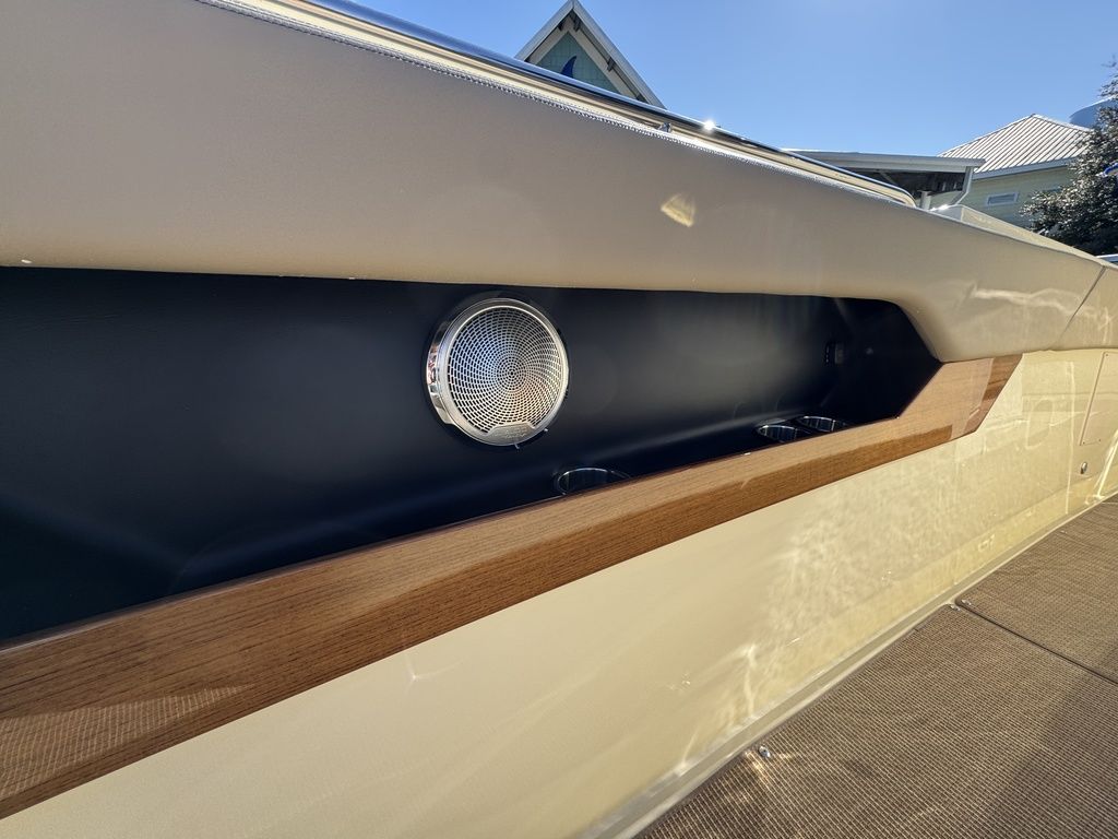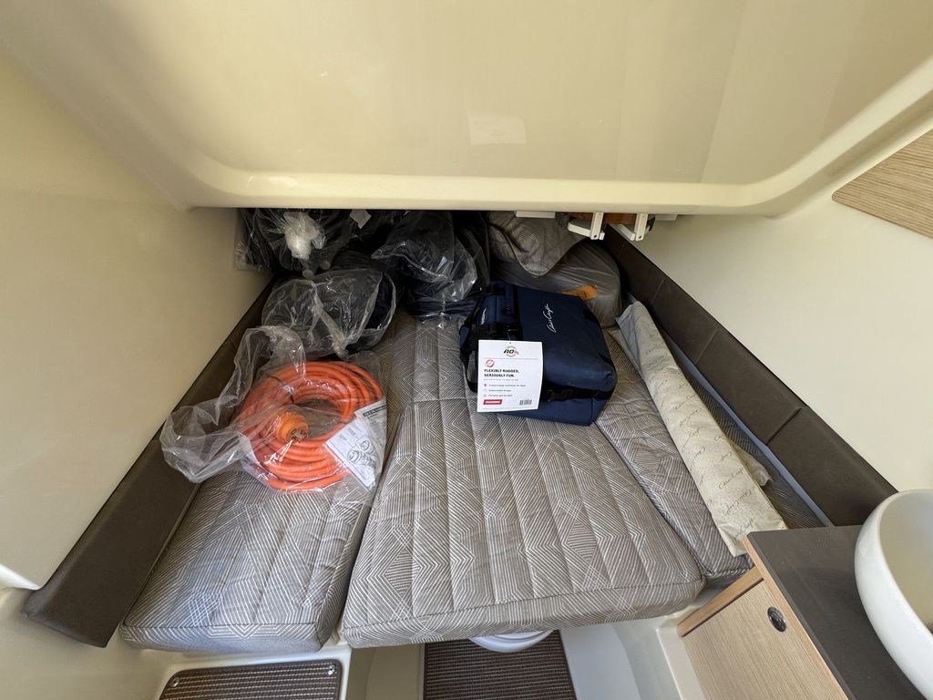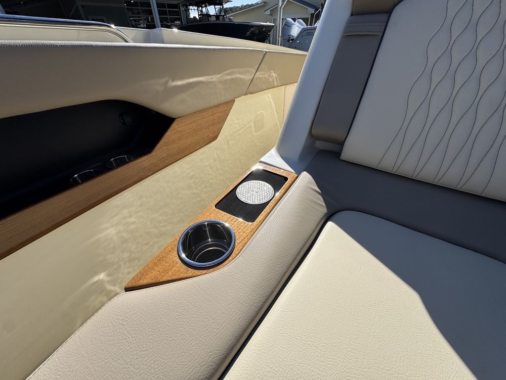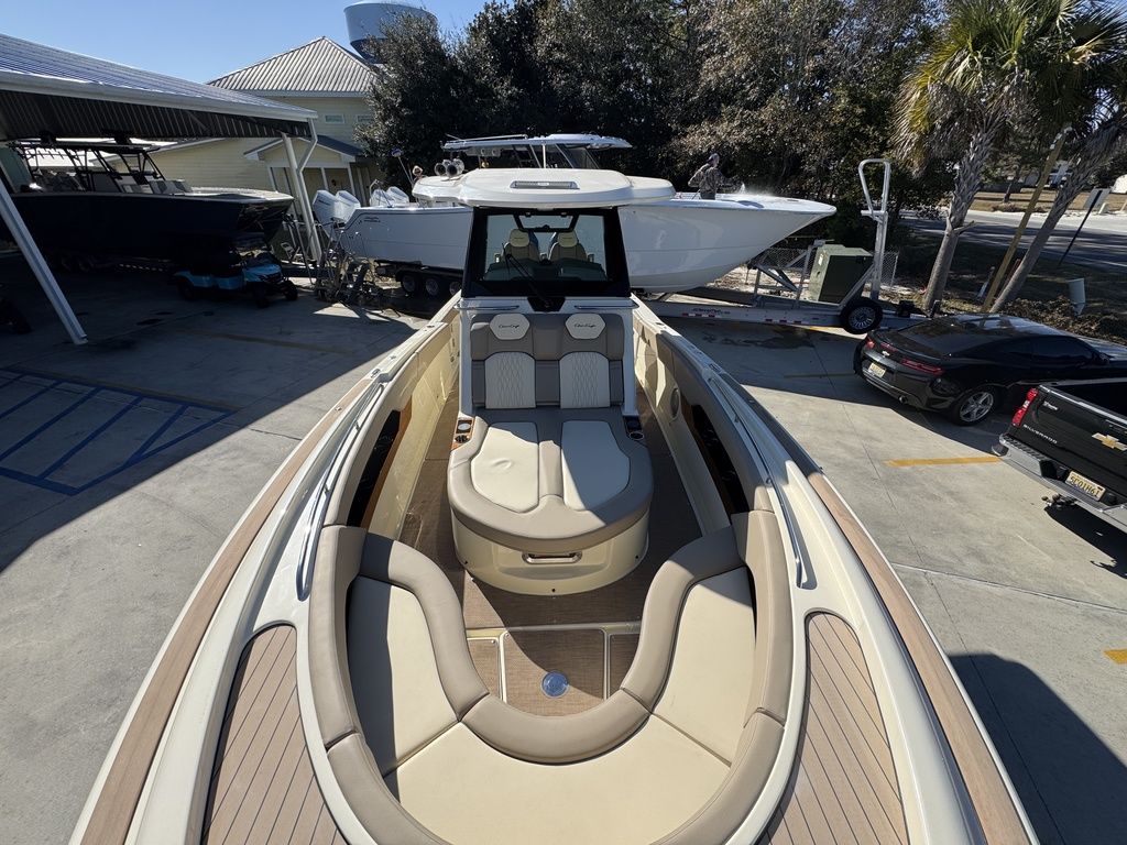 The center console layout provides easy, unobstructed movement around the deck, while the aft cockpit seats conveniently fold away to maximize space when not in use. Additional thoughtful features—like in-floor storage hatches and magnetic seat cushions in the bow—enhance onboard comfort and functionality.