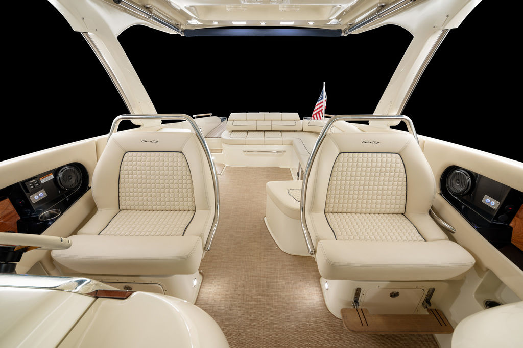 The Launch 35 GT boasts cutting-edge features while maintaining the classic design and styling that makes it uniquely Chris-Craft. Starting with our exclusive and innovative hull design - the reverse transom and signature flared bow provide a legendary ride. The windshield frame is solid stainless-steel and features beautifully contoured glass. Chris-Craft offers Mercury outboard engine options. The standard configuration is twin Mercury 350HP V-10 engines with the option to upgrade to twin 400HP V-10 engines. Joystick Piloting and Electric Steering come standard on the Outboard Edition of the Launch 35 GT. The starboard side boarding door offers easy entry from the dock, or use the in-floor ladder to board from the water. Once onboard, enjoy ample entertainment space with a standard galley sink with hot / cold water, a large refrigerator and a teak cockpit table. Upgrade the galley to include a grill for even more entertainment value. Seated comfortably at the helm puts the dual 12” Garmin multi-function display panel at your fingertips. The helm features a high-gloss varnished wood dash and vinyl wrapped steering wheel that are uniquely Chris-Craft. Below the starboard console is a spacious cabin, turning the Launch 35 GT into a comfortable overnighter. The port side head compartment is spacious and well-appointed. Conveniently located off the swim platform, the transom is equipped with a hot / cold water pull-out shower head. The convertible sunpad can adjust to a full-length aft facing lounge, or a combined aft and forward facing seat. The Launch 35 GT is perfect for any on-water adventure, whether you are enjoying it with family, friends, or on a romantic weekend get-away.