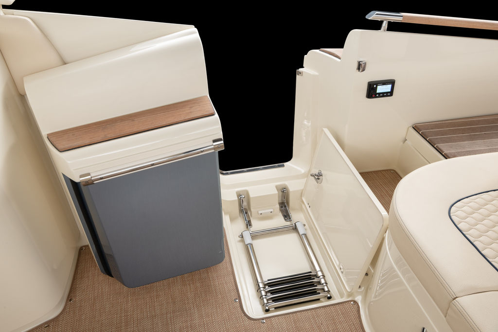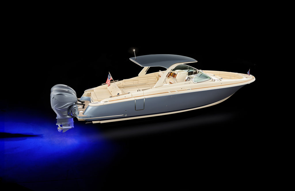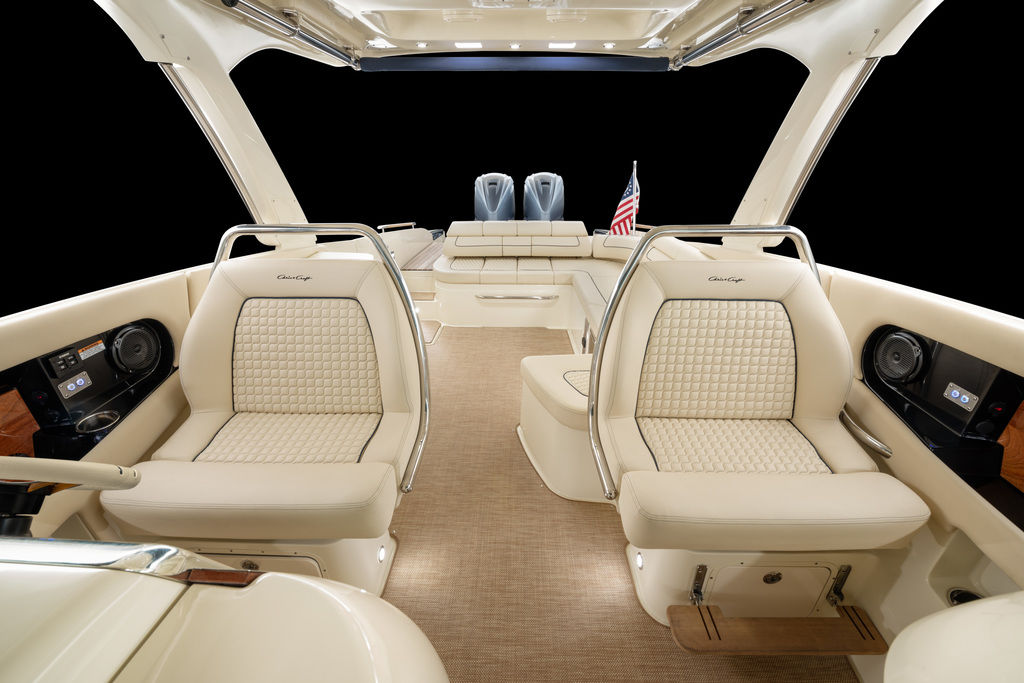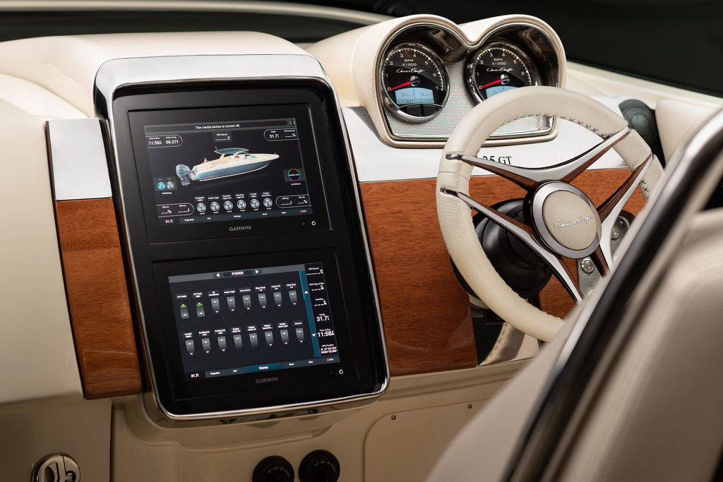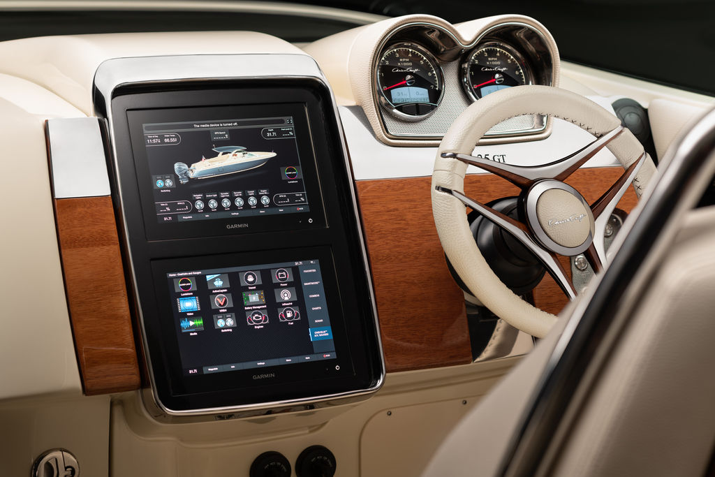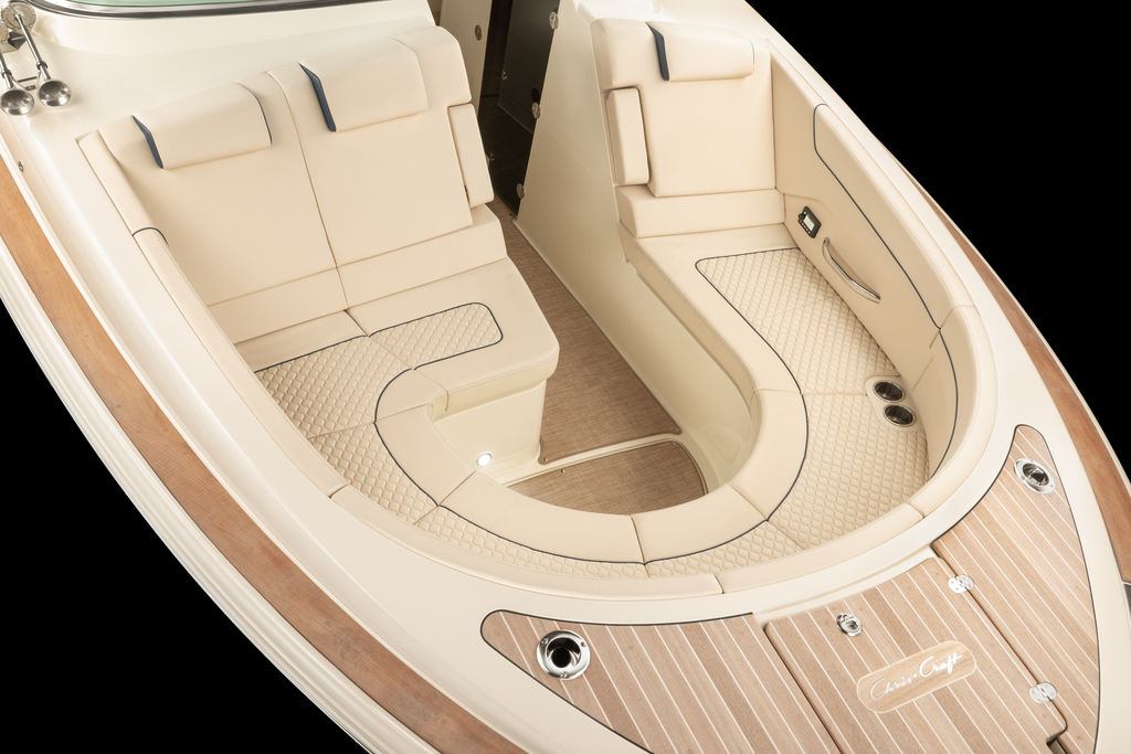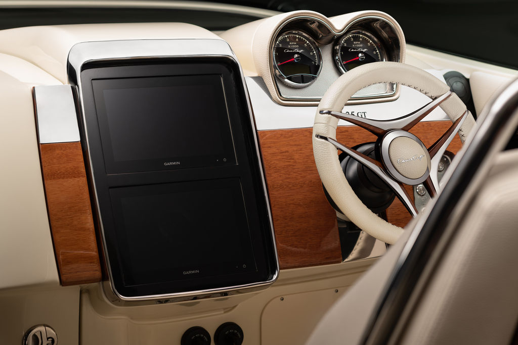 The Launch 35 GT boasts cutting-edge features while maintaining the classic design and styling that makes it uniquely Chris-Craft. Starting with our exclusive and innovative hull design - the reverse transom and signature flared bow provide a legendary ride. The windshield frame is solid stainless-steel and features beautifully contoured glass. Chris-Craft offers Mercury outboard engine options. The standard configuration is twin Mercury 350HP V-10 engines with the option to upgrade to twin 400HP V-10 engines. Joystick Piloting and Electric Steering come standard on the Outboard Edition of the Launch 35 GT. The starboard side boarding door offers easy entry from the dock, or use the in-floor ladder to board from the water. Once onboard, enjoy ample entertainment space with a standard galley sink with hot / cold water, a large refrigerator and a teak cockpit table. Upgrade the galley to include a grill for even more entertainment value. Seated comfortably at the helm puts the dual 12” Garmin multi-function display panel at your fingertips. The helm features a high-gloss varnished wood dash and vinyl wrapped steering wheel that are uniquely Chris-Craft. Below the starboard console is a spacious cabin, turning the Launch 35 GT into a comfortable overnighter. The port side head compartment is spacious and well-appointed. Conveniently located off the swim platform, the transom is equipped with a hot / cold water pull-out shower head. The convertible sunpad can adjust to a full-length aft facing lounge, or a combined aft and forward facing seat. The Launch 35 GT is perfect for any on-water adventure, whether you are enjoying it with family, friends, or on a romantic weekend get-away.