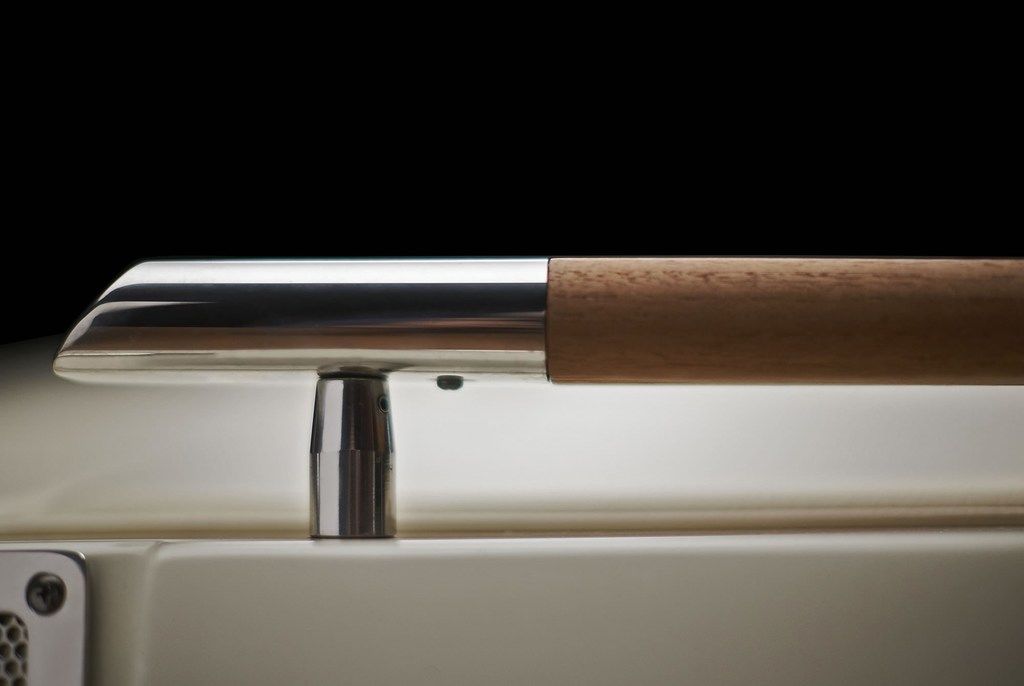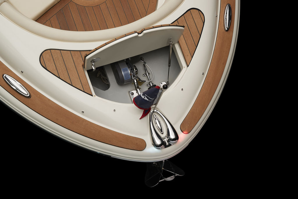 Clever surprises and practical functionality with thoughtfully designed elements run throughout the Launch 27, including teak grabrails, teak