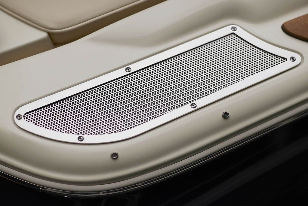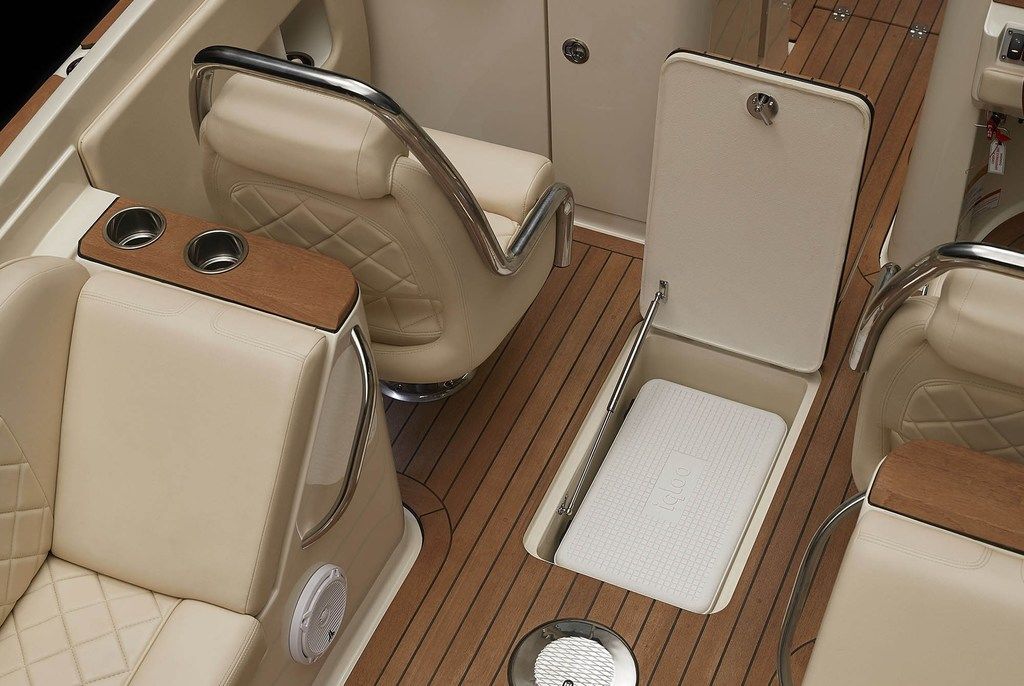 The helm chair with diamond pattern stitching and folding bolsters provide optimal visibility. The three-spoke mahogany steering wheel, sits on a custom silver perforated panel backplate surrounding a Garmin touchscreen. The Launch 27 includes generous aft seating upholstered in the highest UV grade resistant vinyl.
