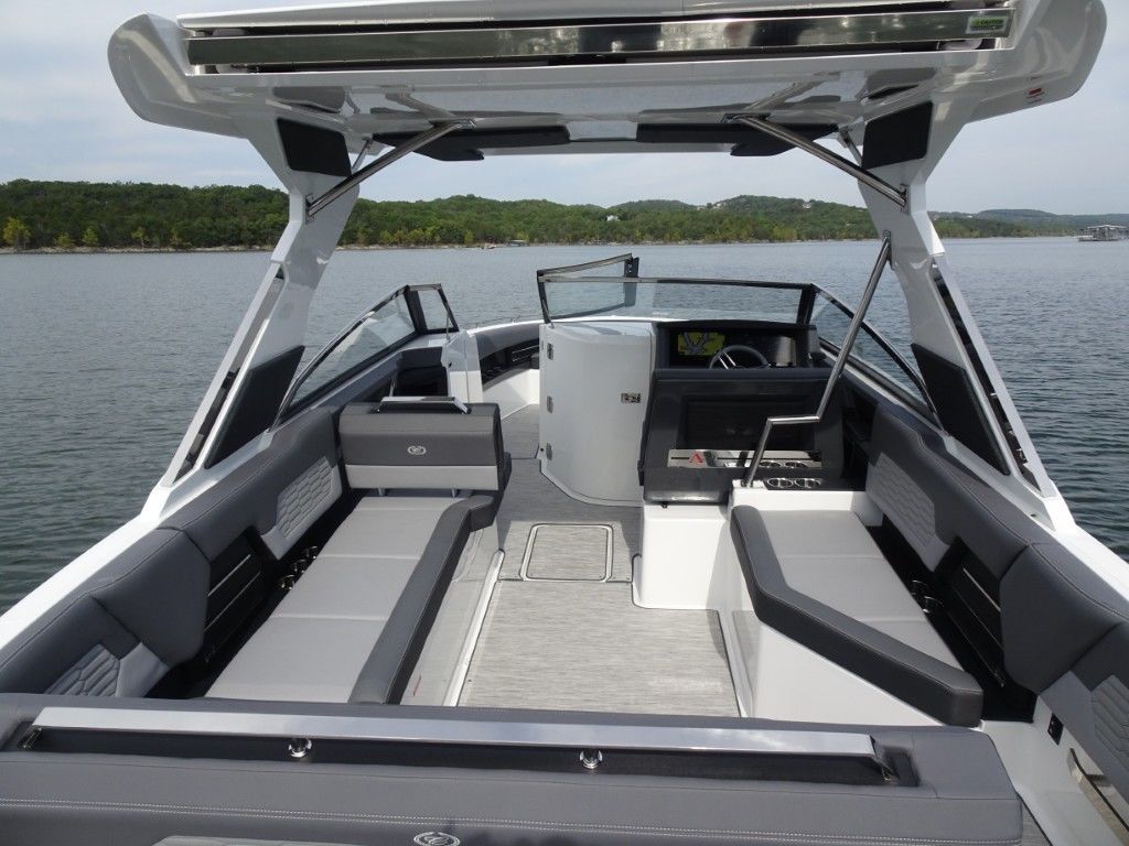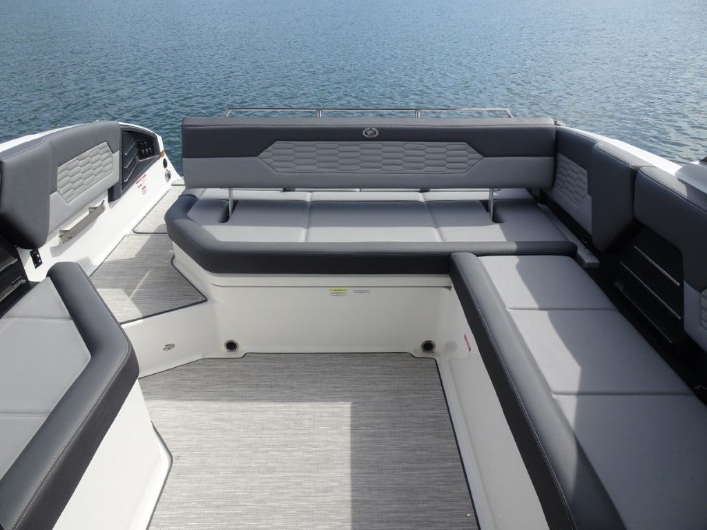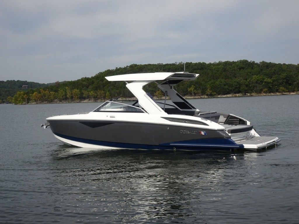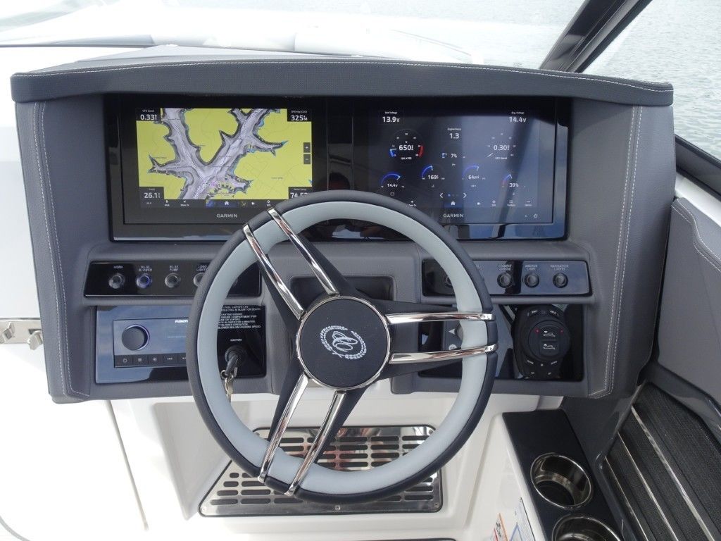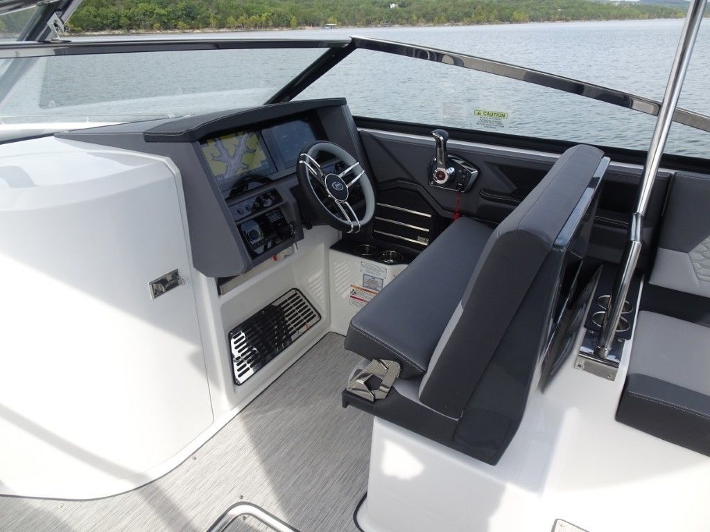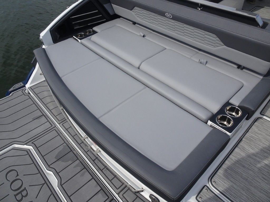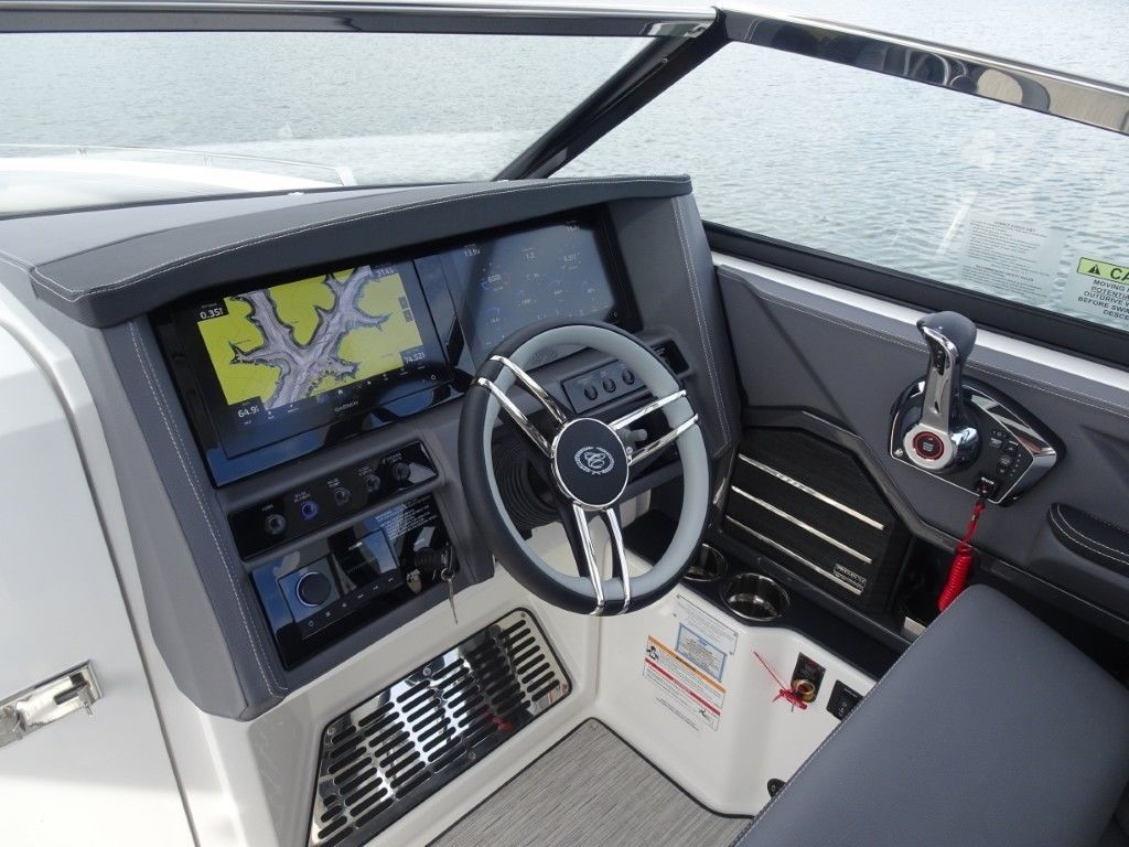 This is a New 2026 Cobalt A29 in a 3-color Custom Graphite Gray w/Navy Accent Stripe and Frost/Slate Interior. It is powered by a Mercruiser 8.2L MAG HO 430hp DTS Dual Prop and has the following options: