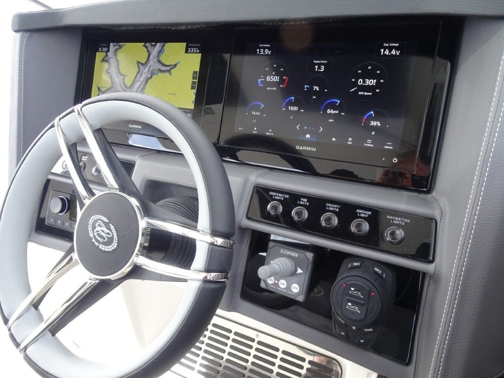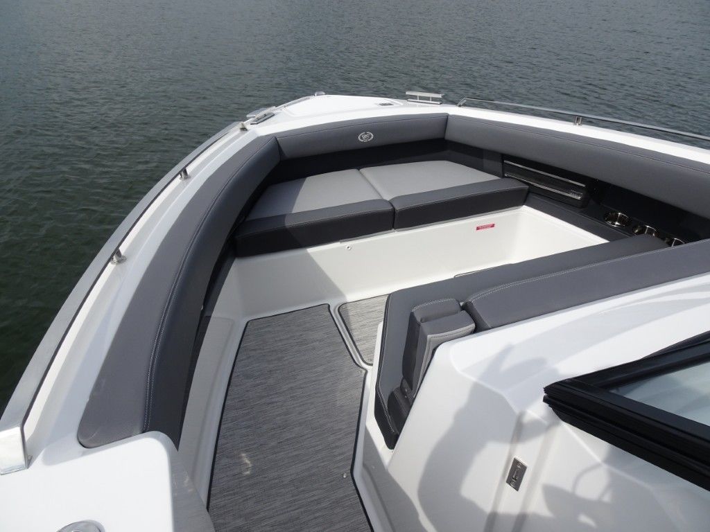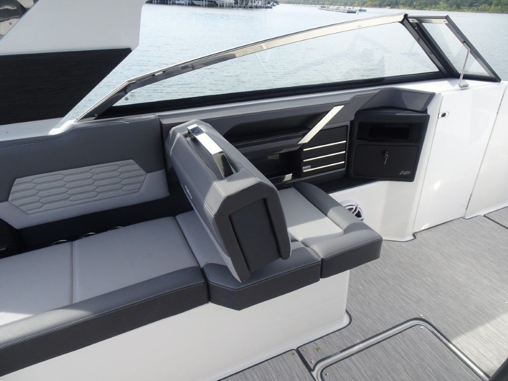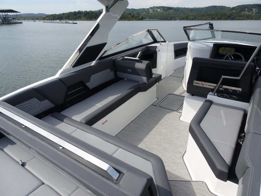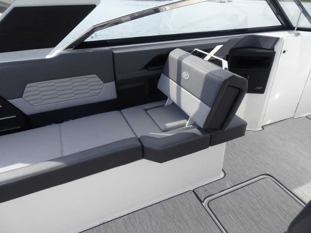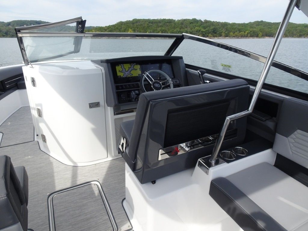 This is a New 2026 Cobalt A29 in a 3-color Custom Graphite Gray w/Navy Accent Stripe and Frost/Slate Interior. It is powered by a Mercruiser 8.2L MAG HO 430hp DTS Dual Prop and has the following options: