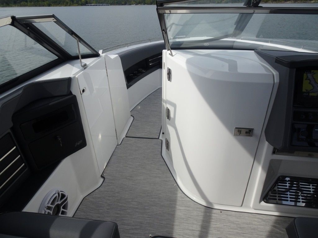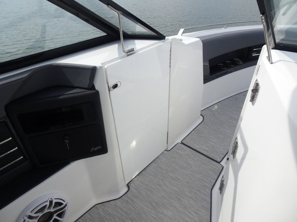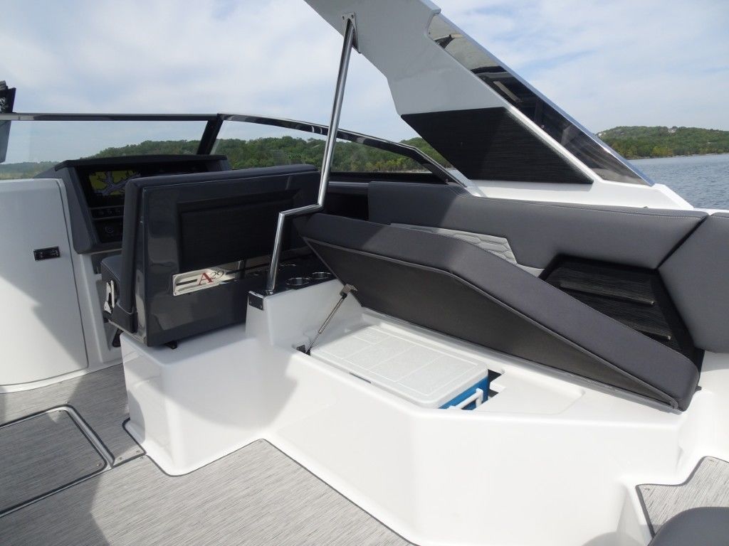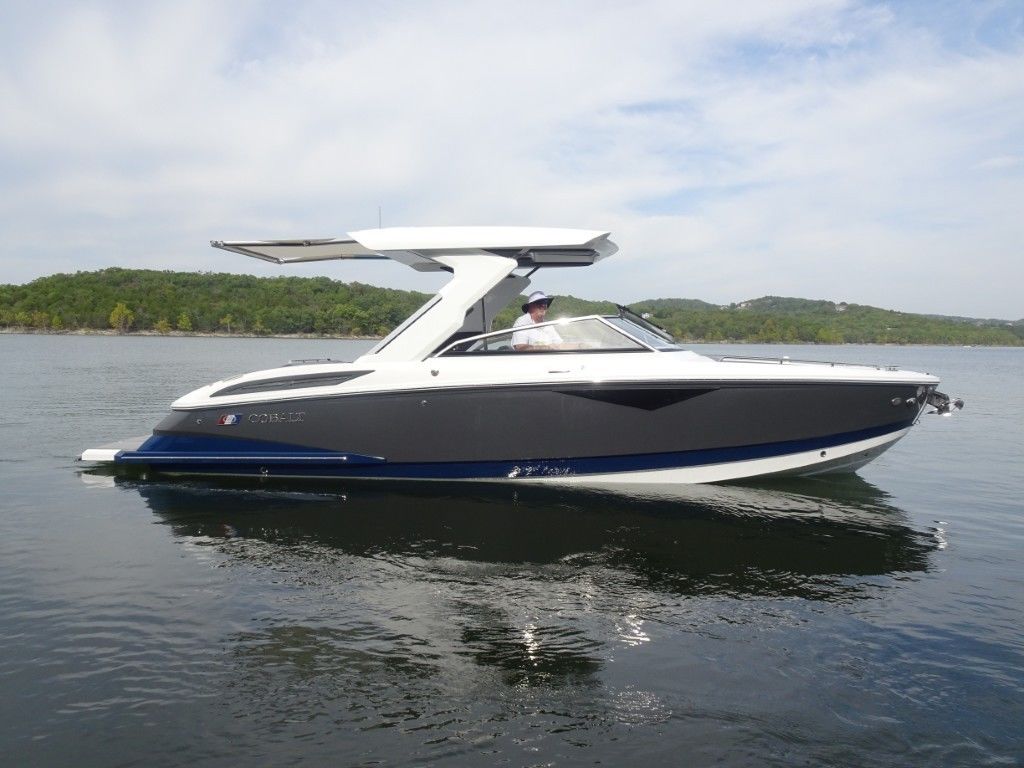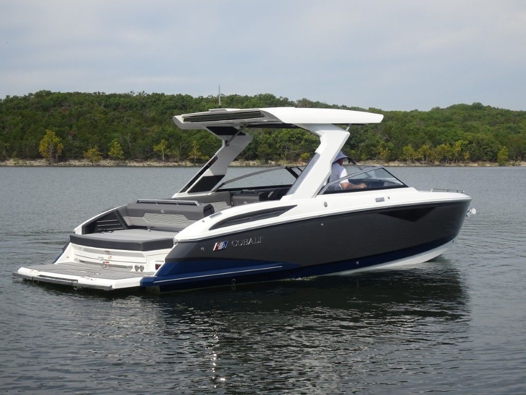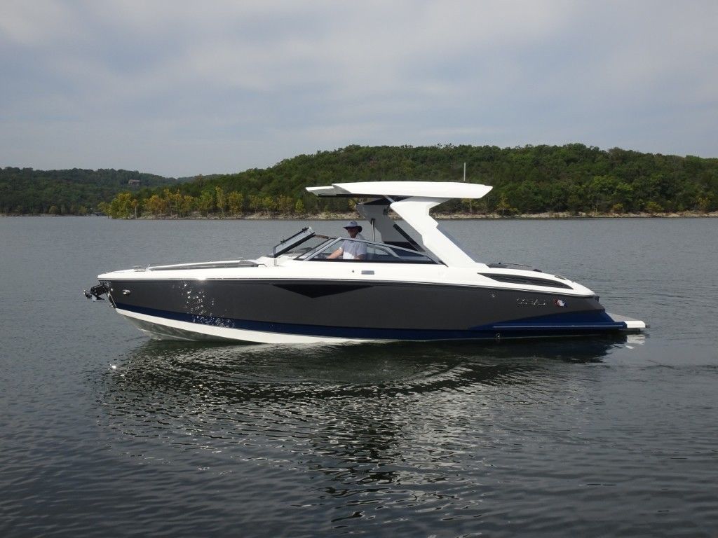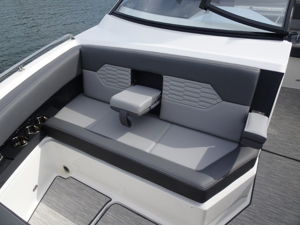 This is a New 2026 Cobalt A29 in a 3-color Custom Graphite Gray w/Navy Accent Stripe and Frost/Slate Interior. It is powered by a Mercruiser 8.2L MAG HO 430hp DTS Dual Prop and has the following options: