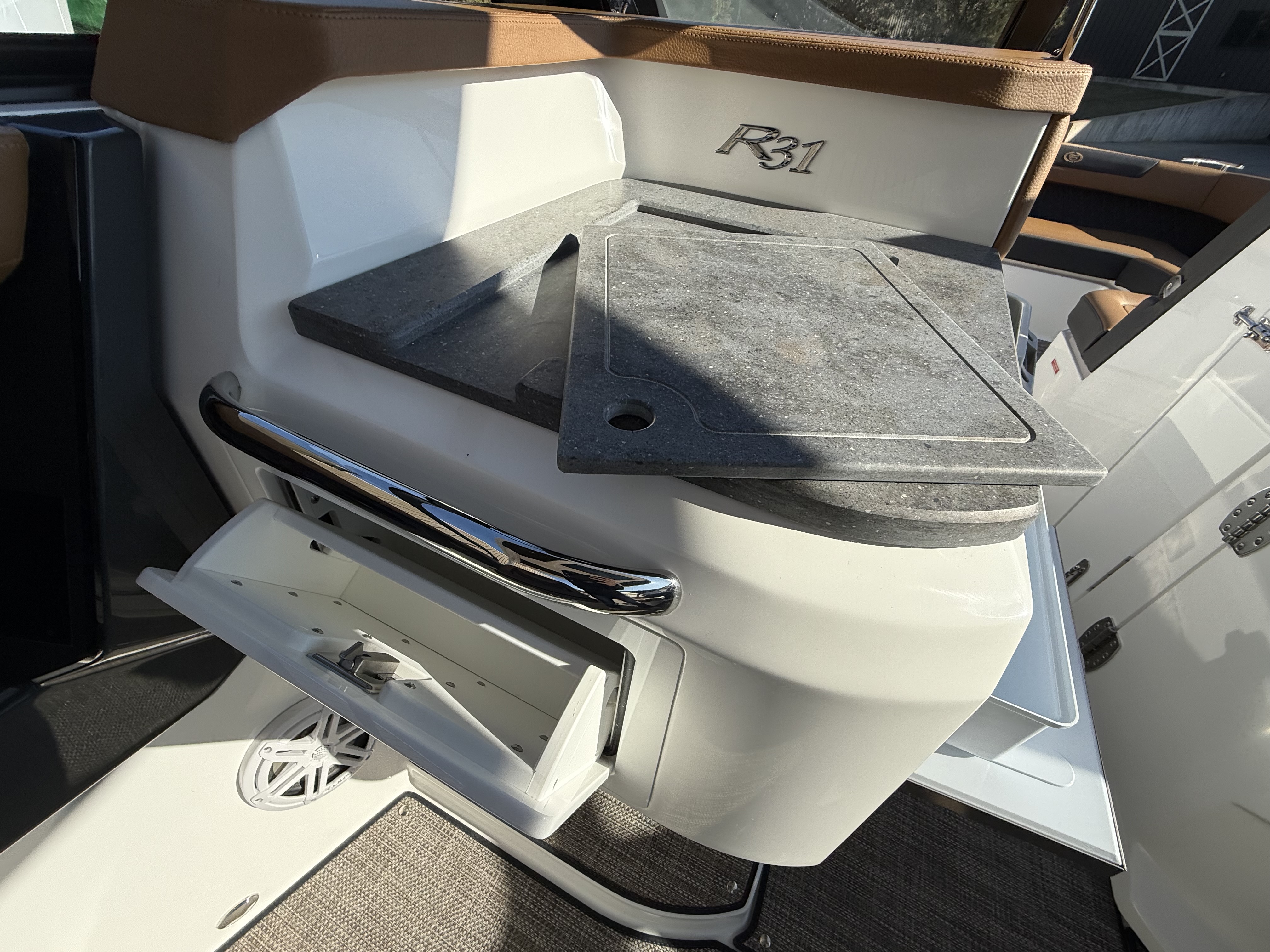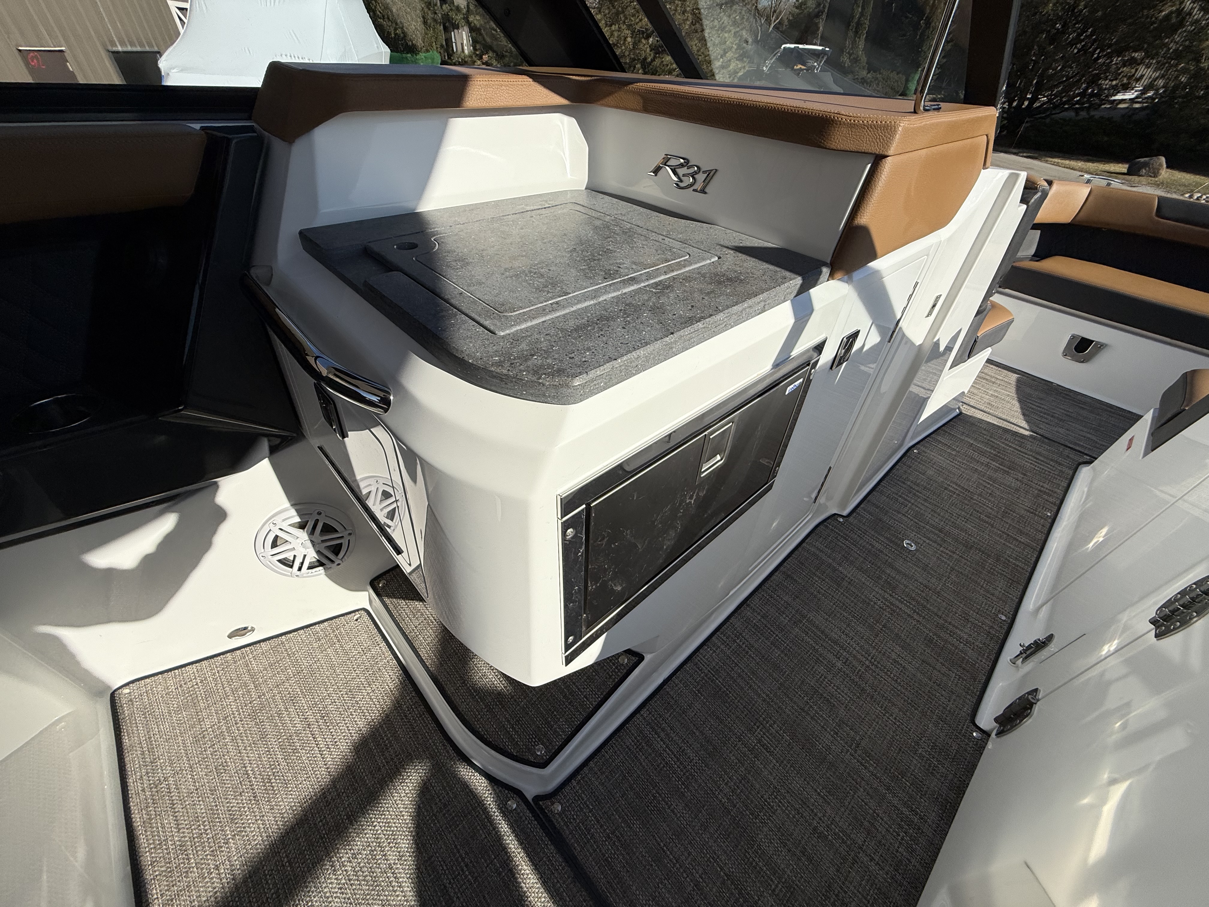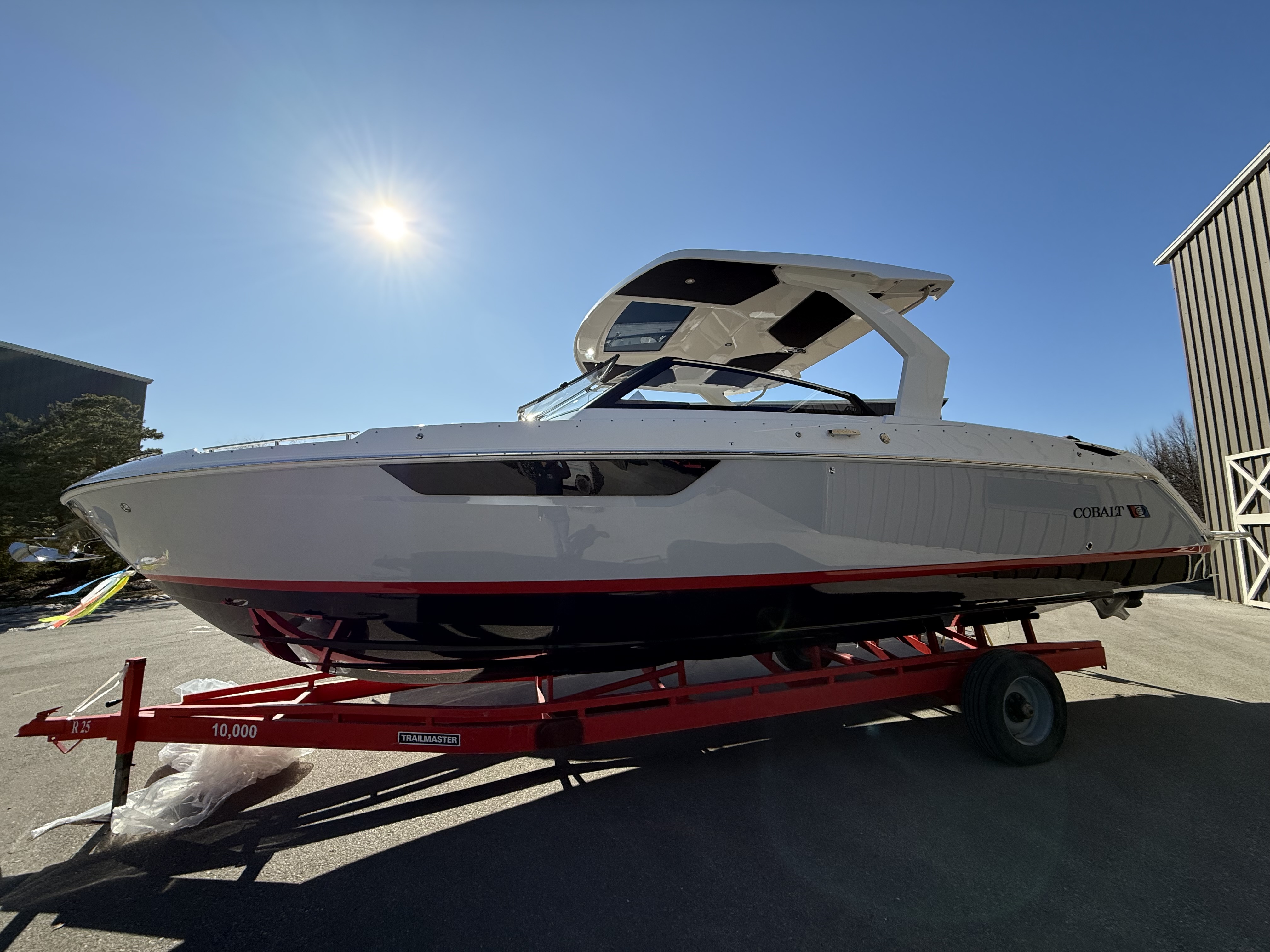 Frost Grey with a striking Knockout Red boot stripe & deep ebony hull, this R31 commands attention from every angle. Satin black COBALT lettering & sleek hull-side windows complete the refined, aggressive profile that stands out at the dock & on open water.