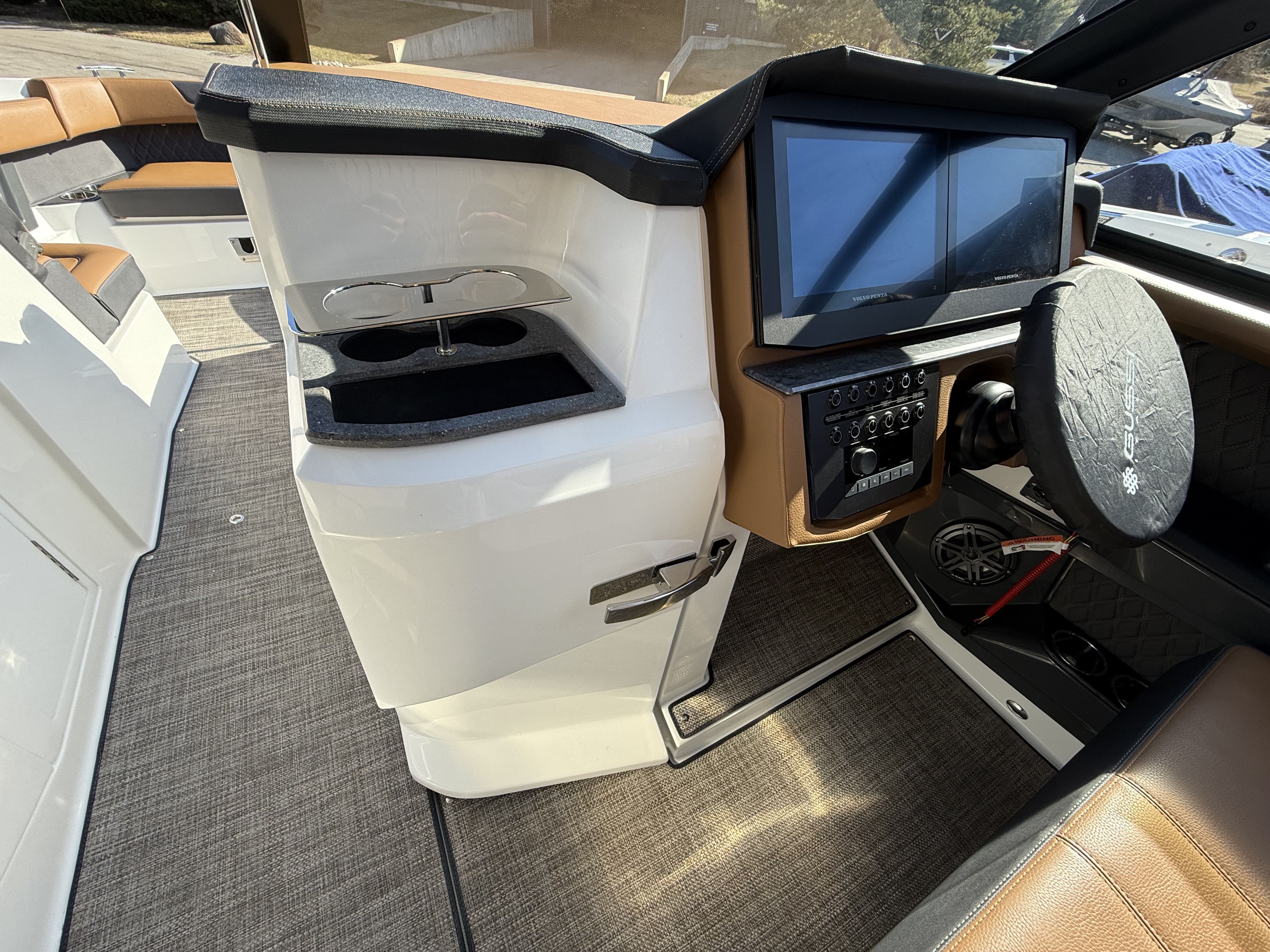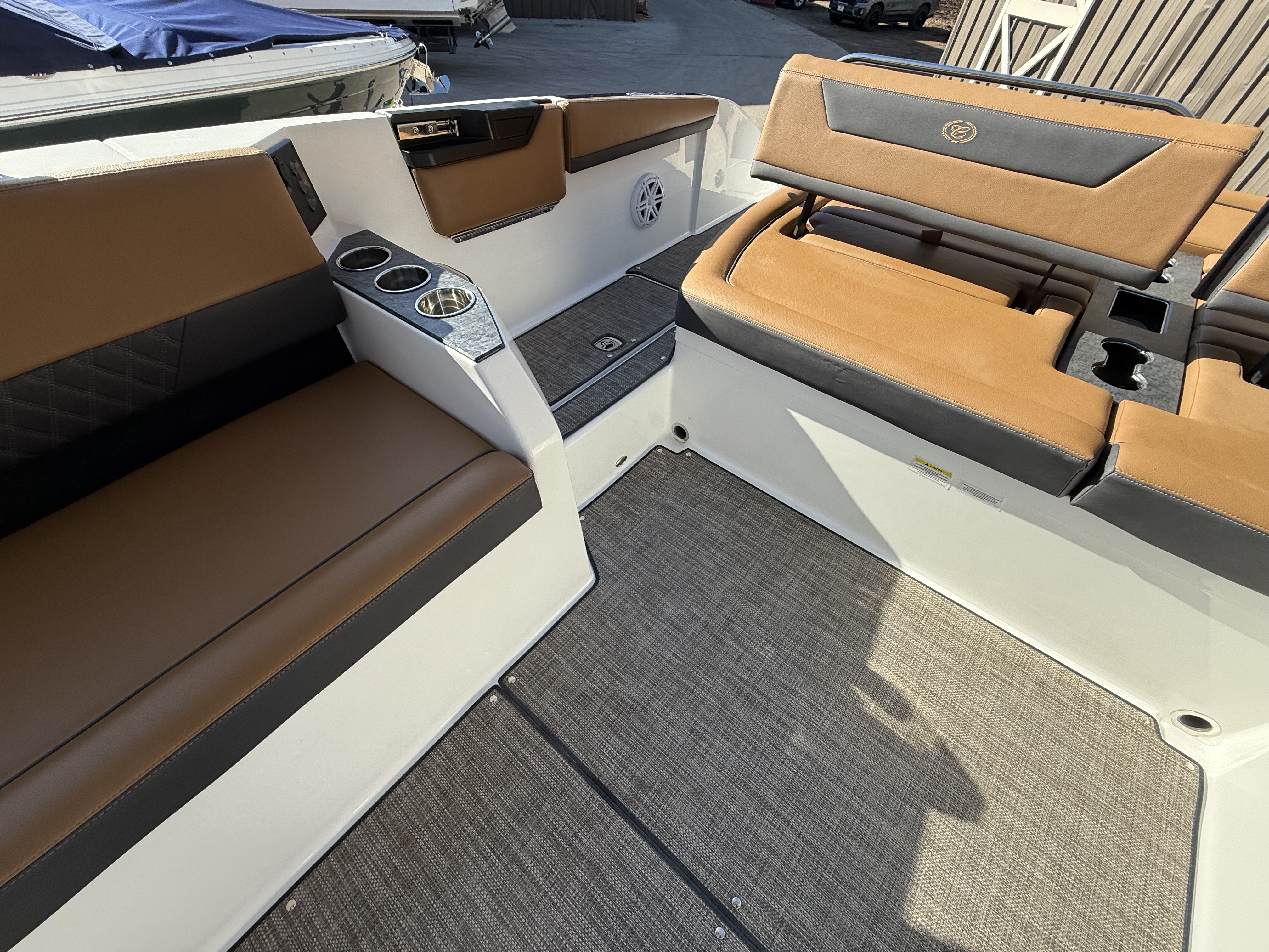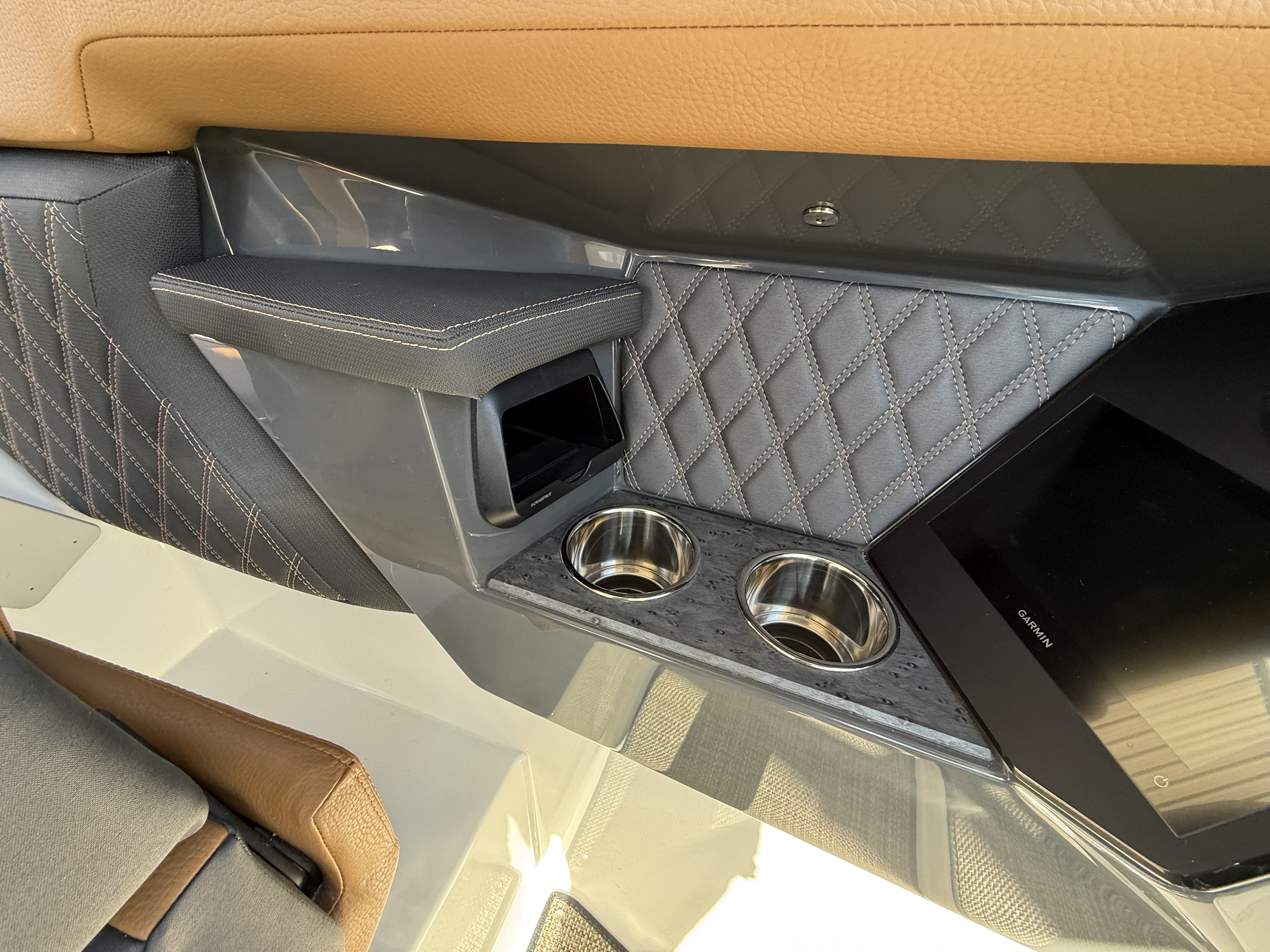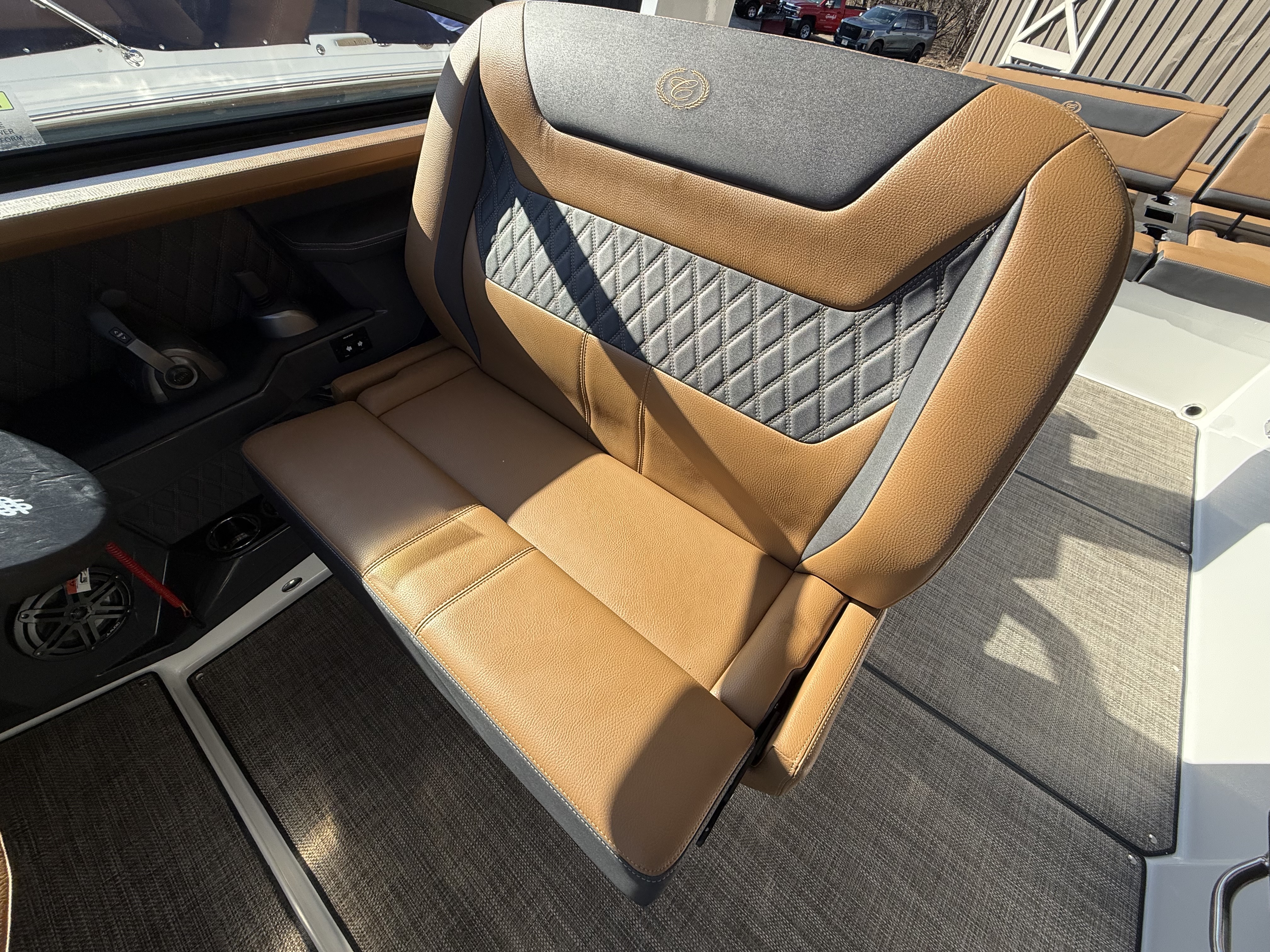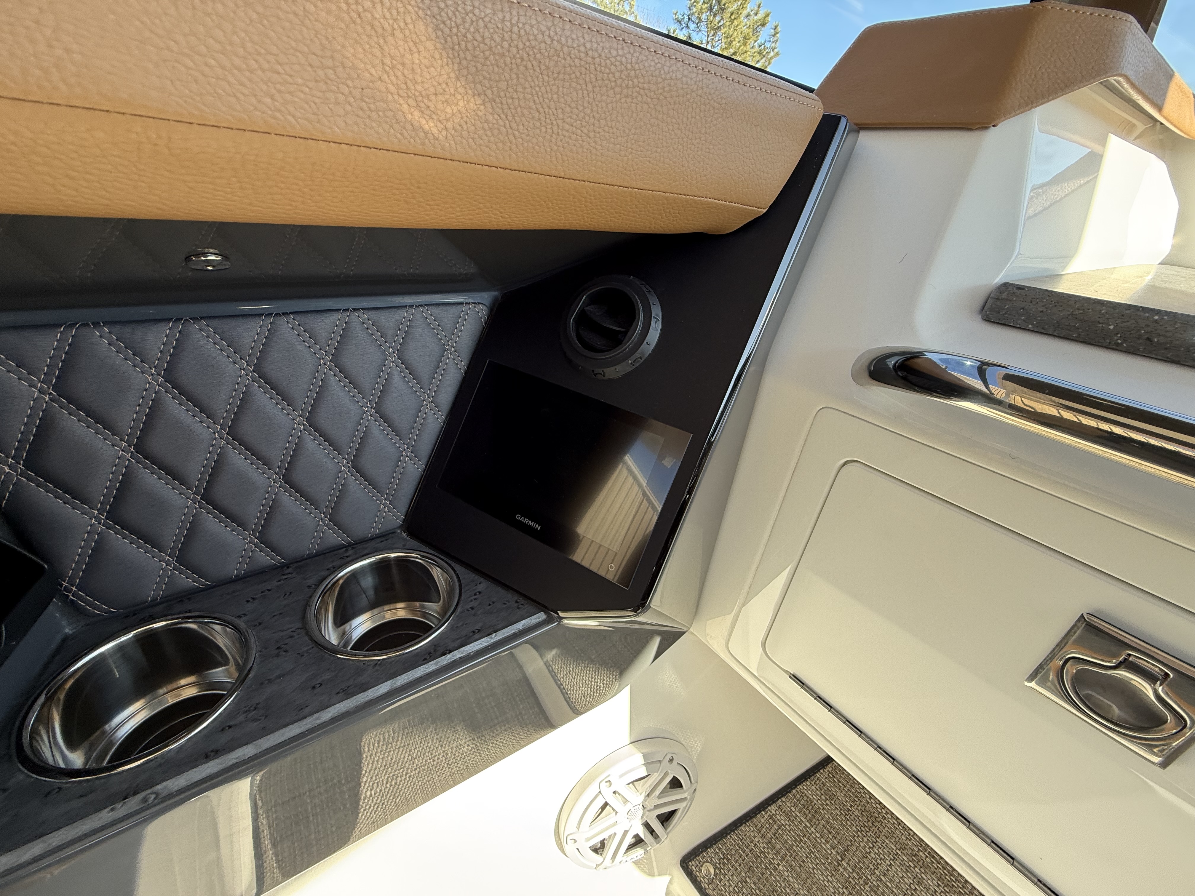 The helm features dual 12-inch Garmin glass cockpit displays for a clean, intuitive command center. A leather color-matched steering wheel, fold-down footrest, & passenger helm watch seat ensure captain & co-pilot ride in comfort. A rear-facing camera adds confidence when docking or monitoring activity at the swim platform.