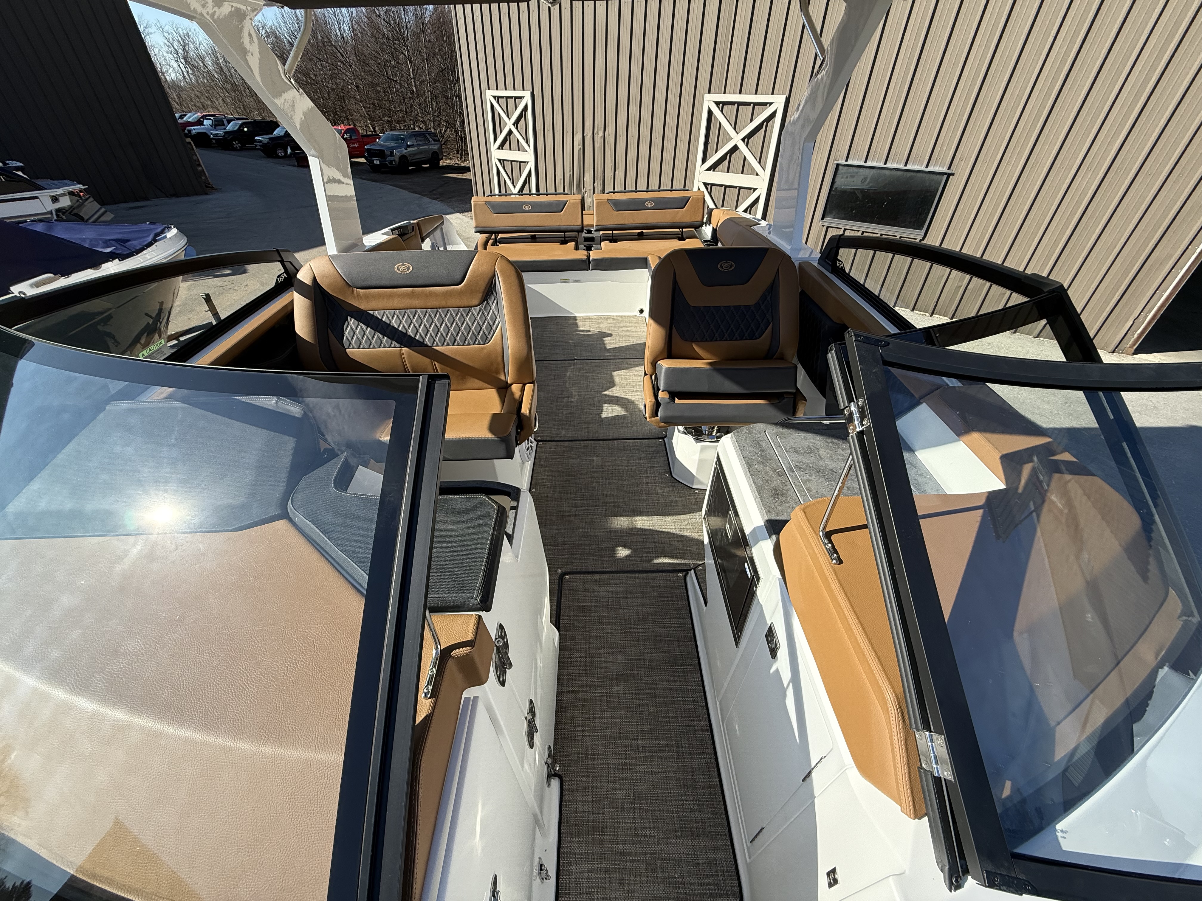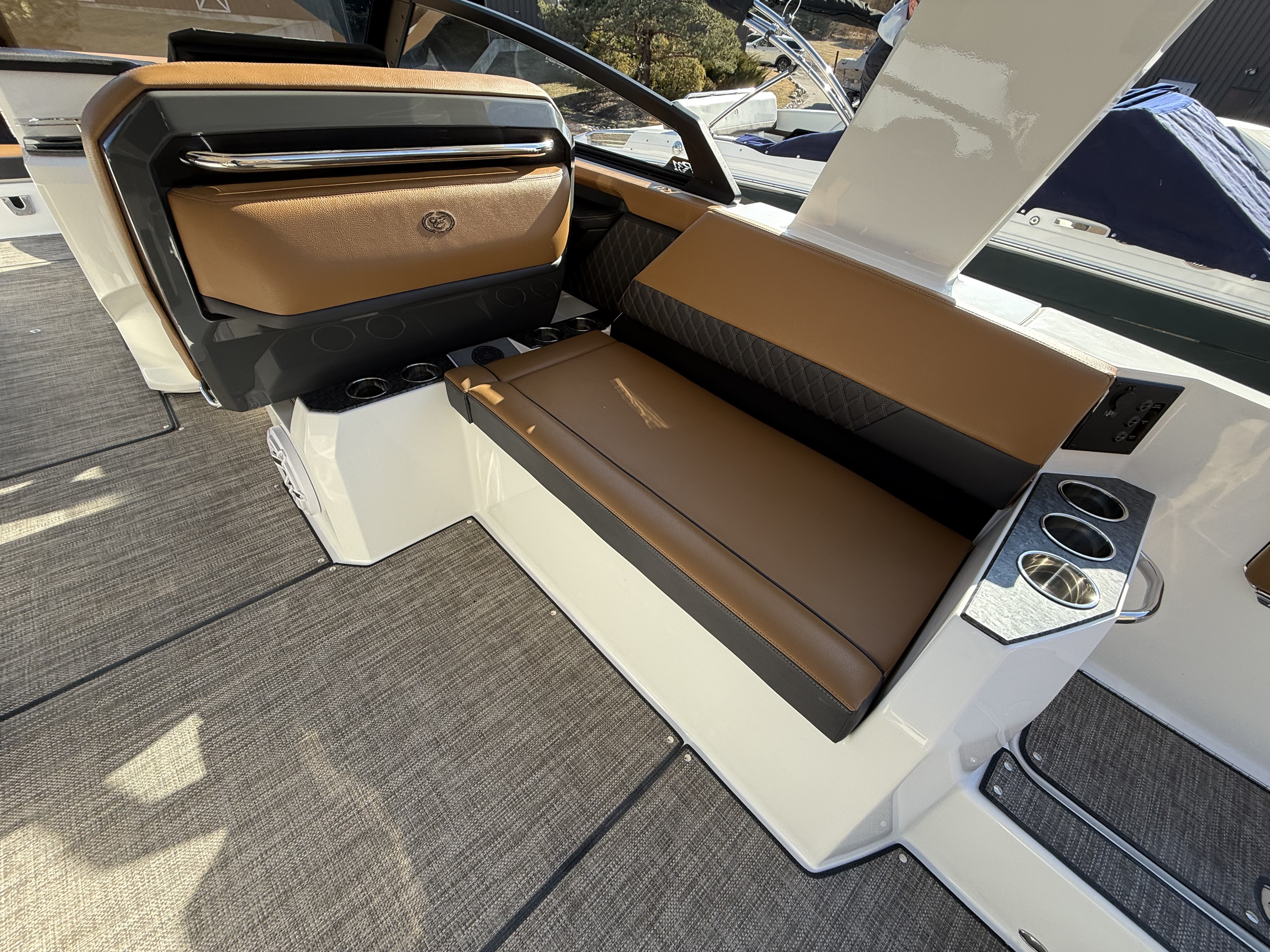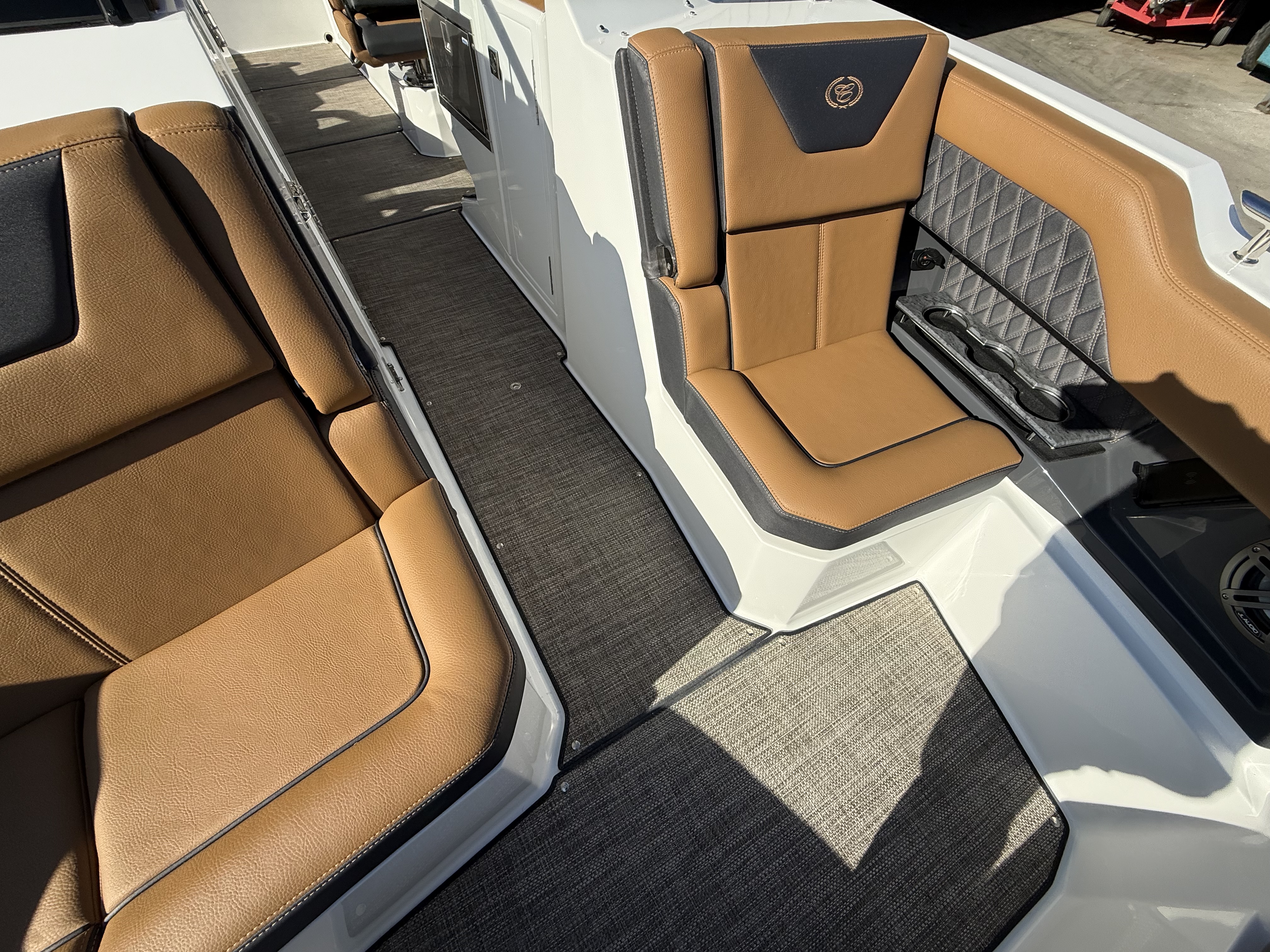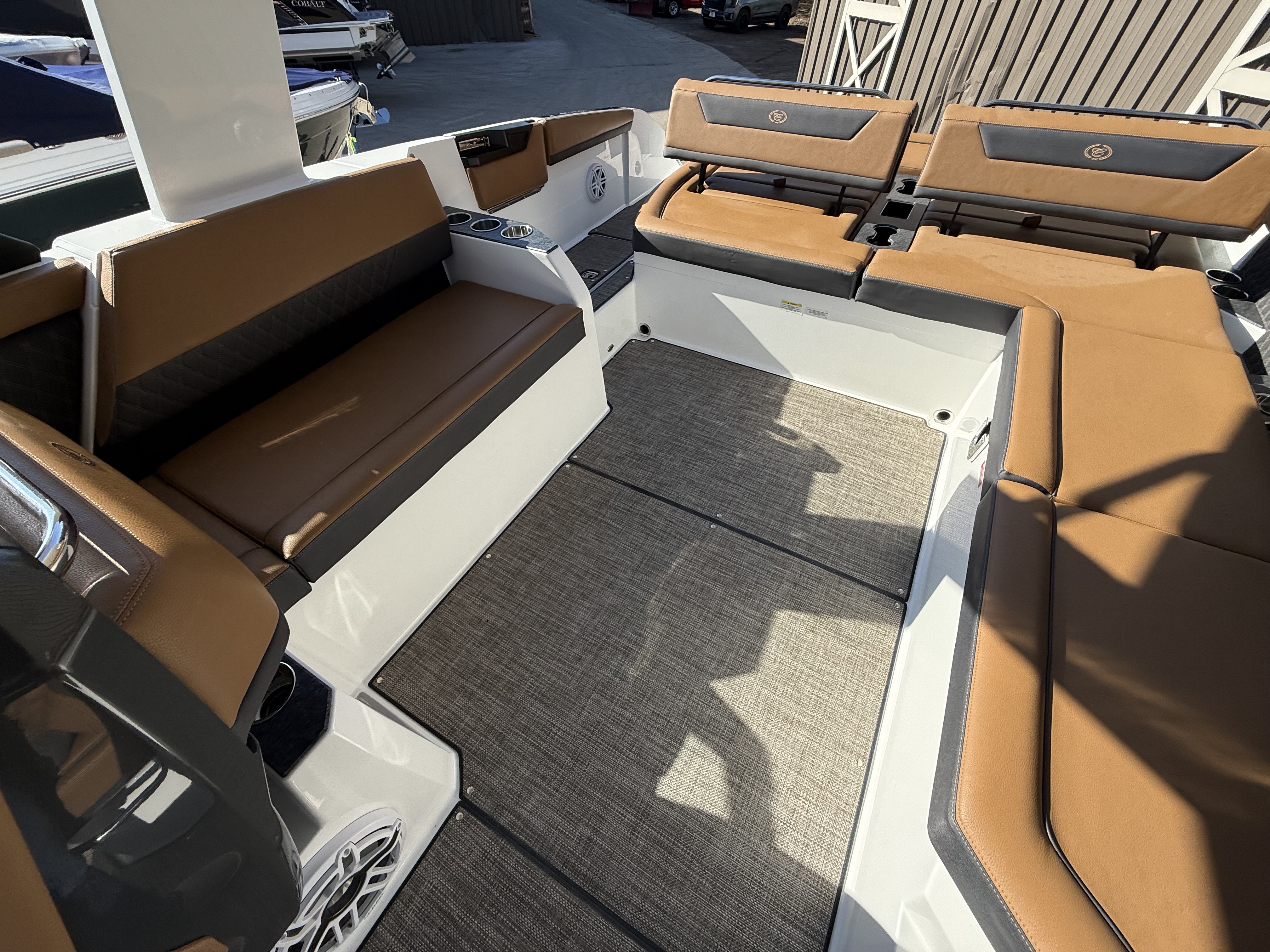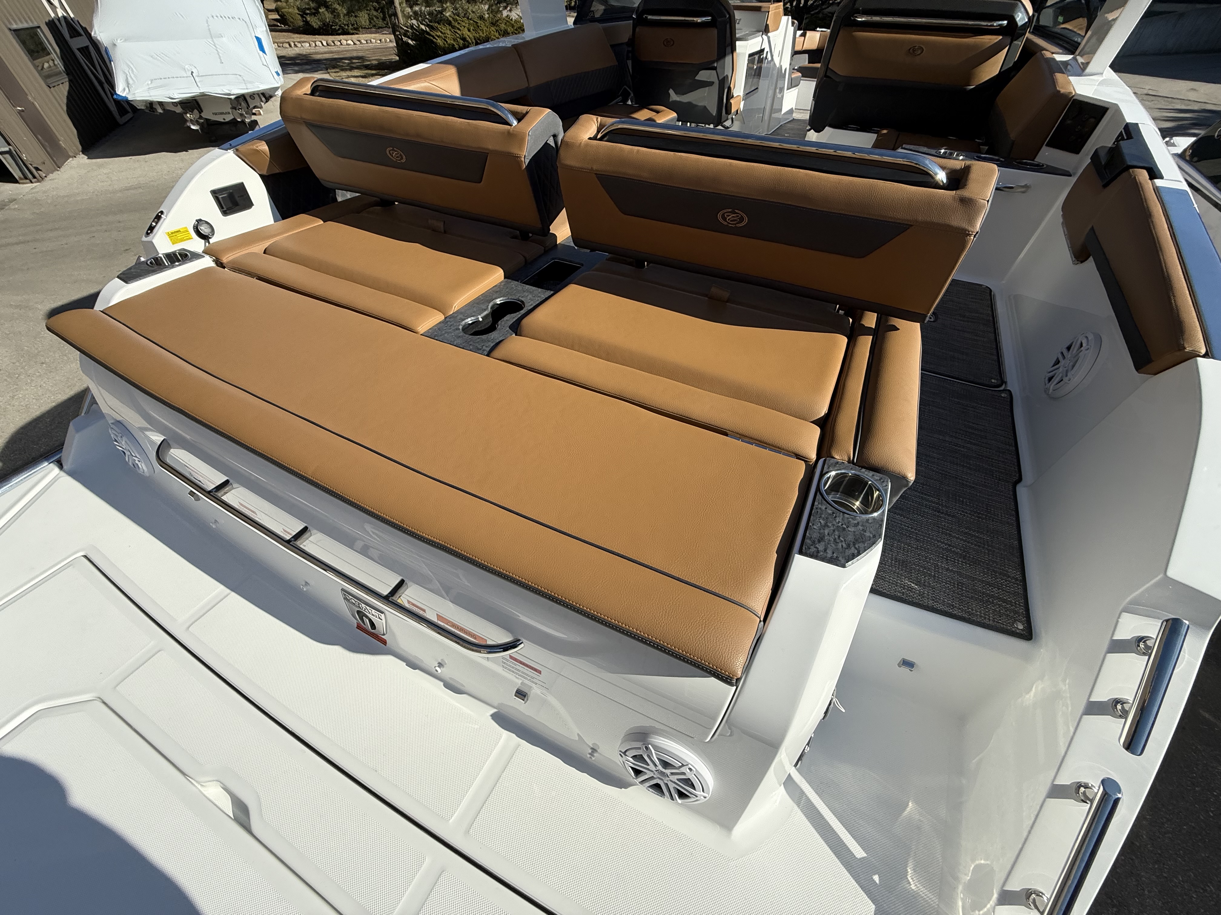 The helm features dual 12-inch Garmin glass cockpit displays for a clean, intuitive command center. A leather color-matched steering wheel, fold-down footrest, & passenger helm watch seat ensure captain & co-pilot ride in comfort. A rear-facing camera adds confidence when docking or monitoring activity at the swim platform.