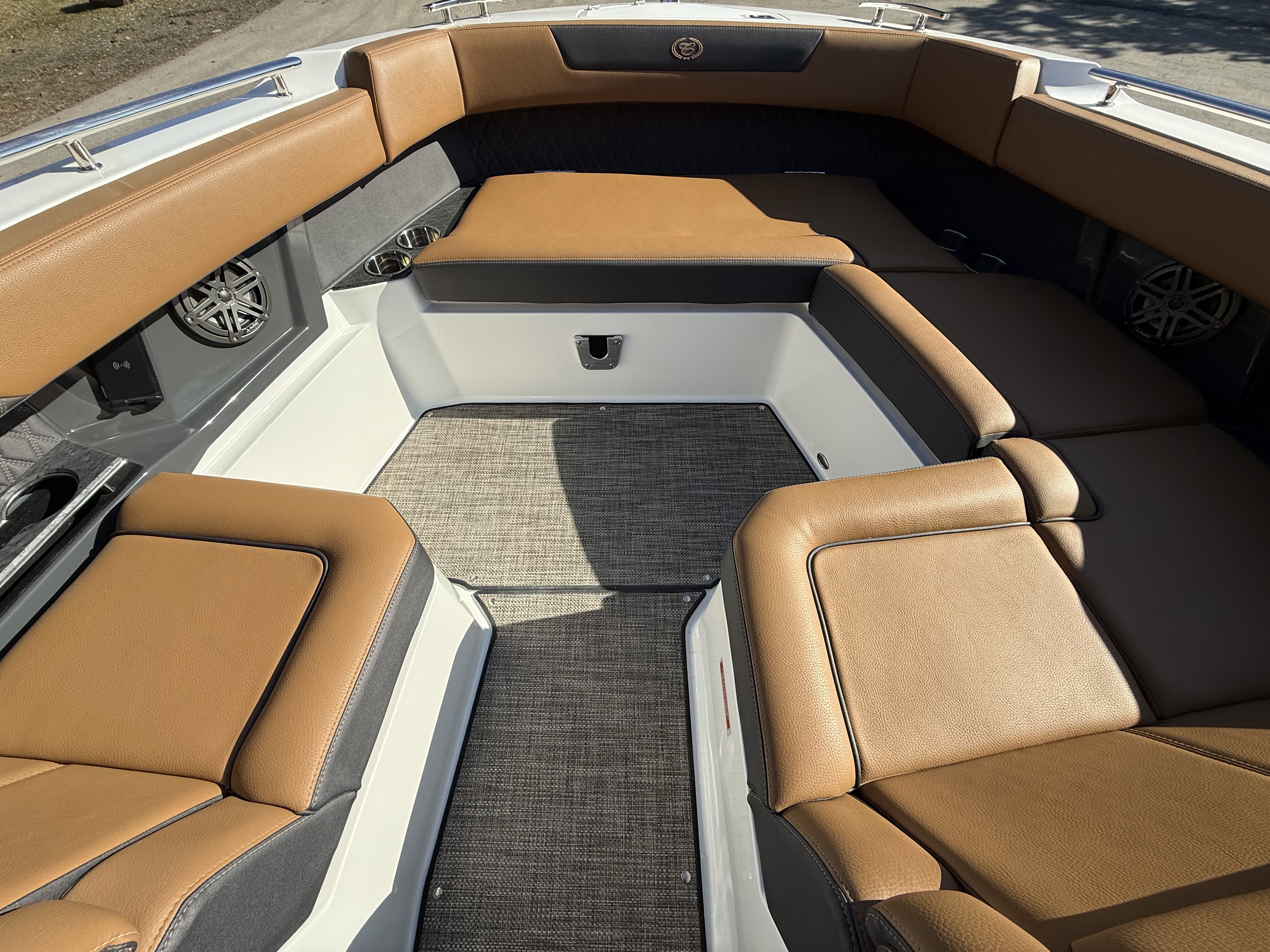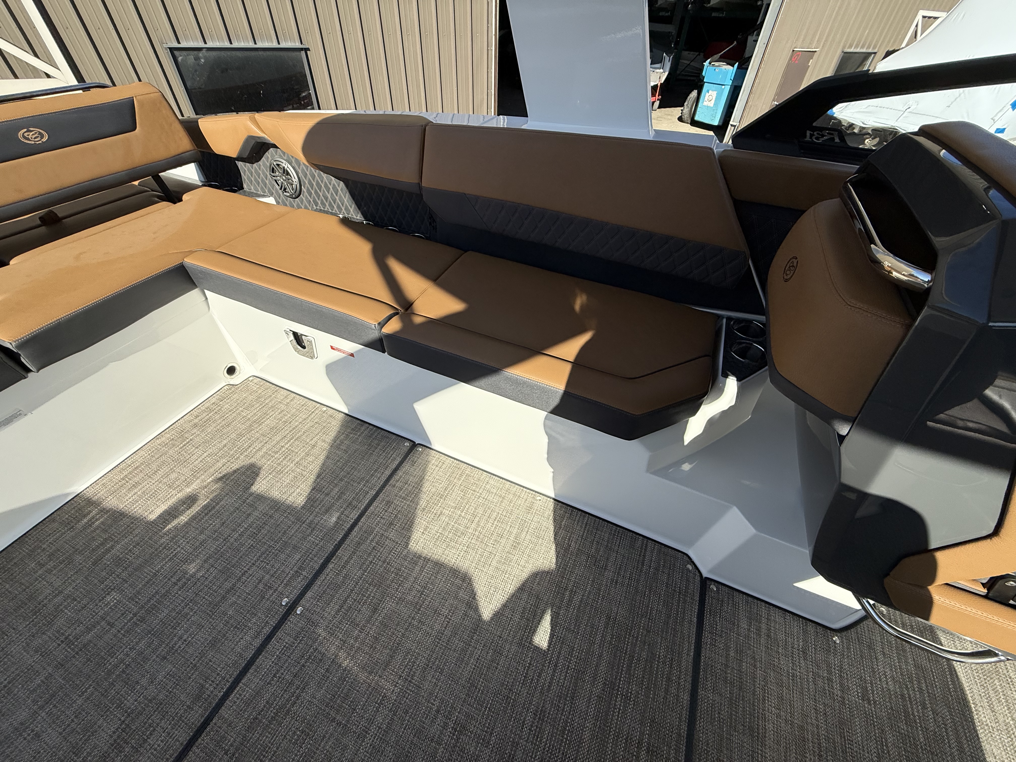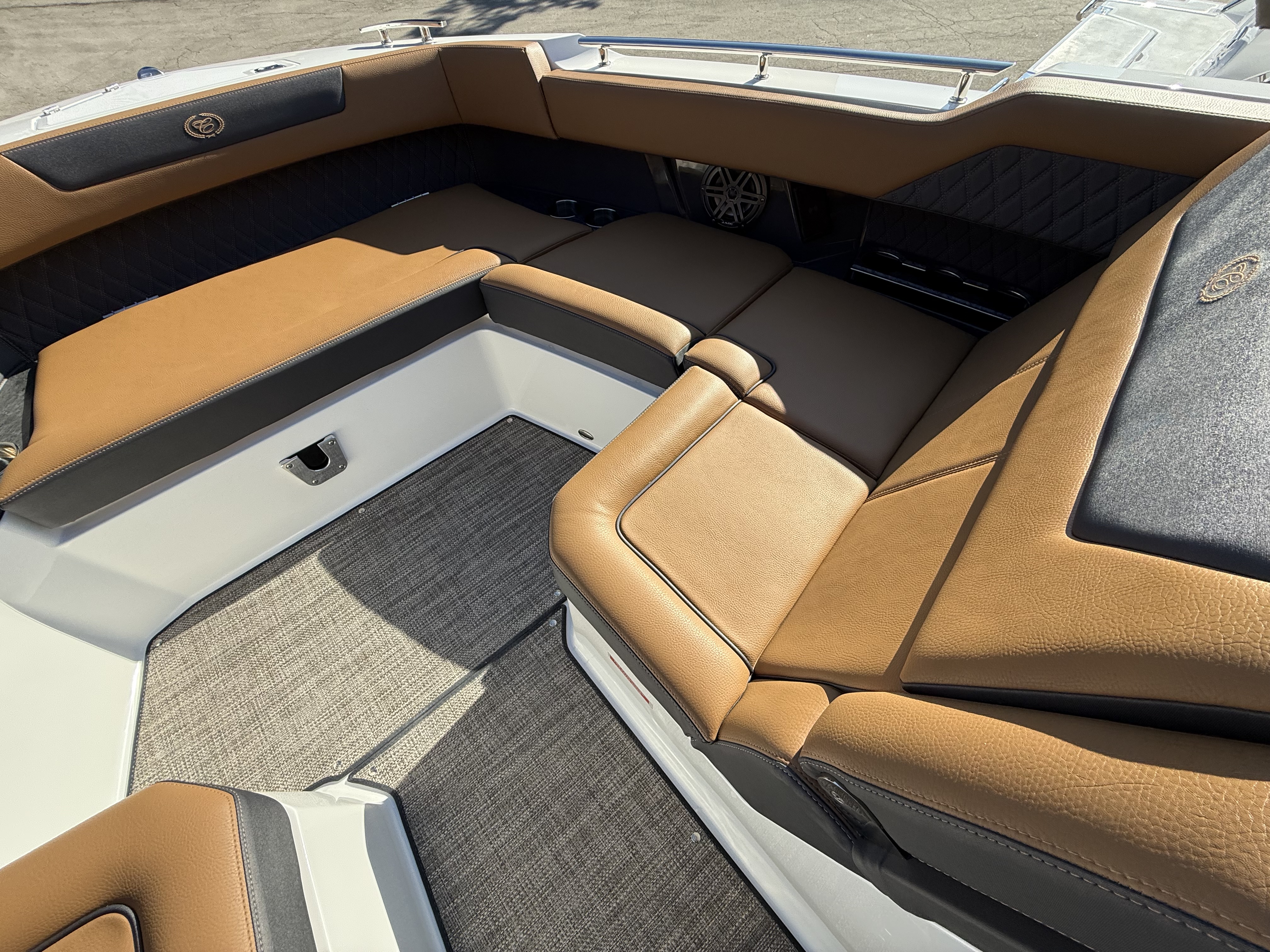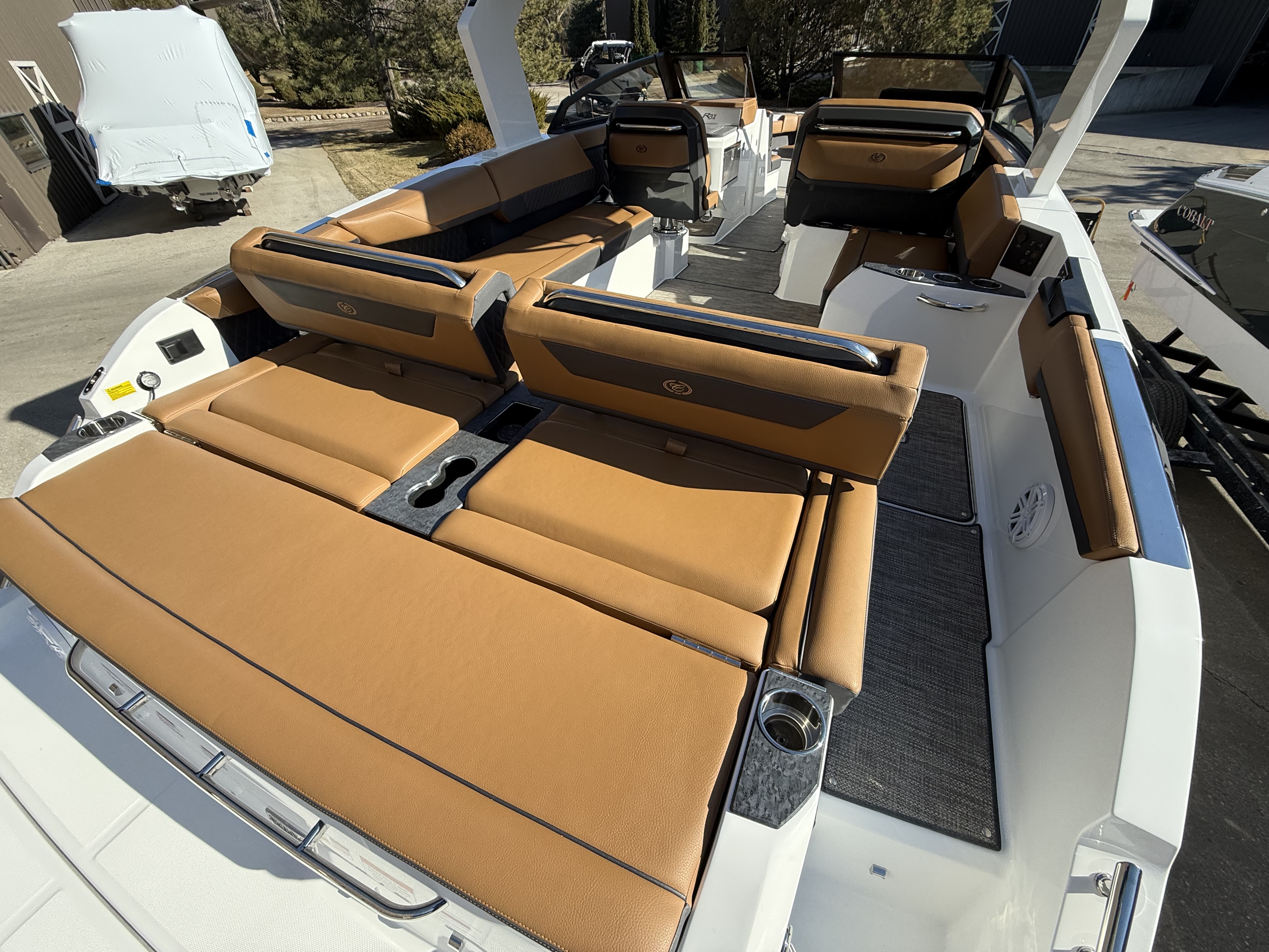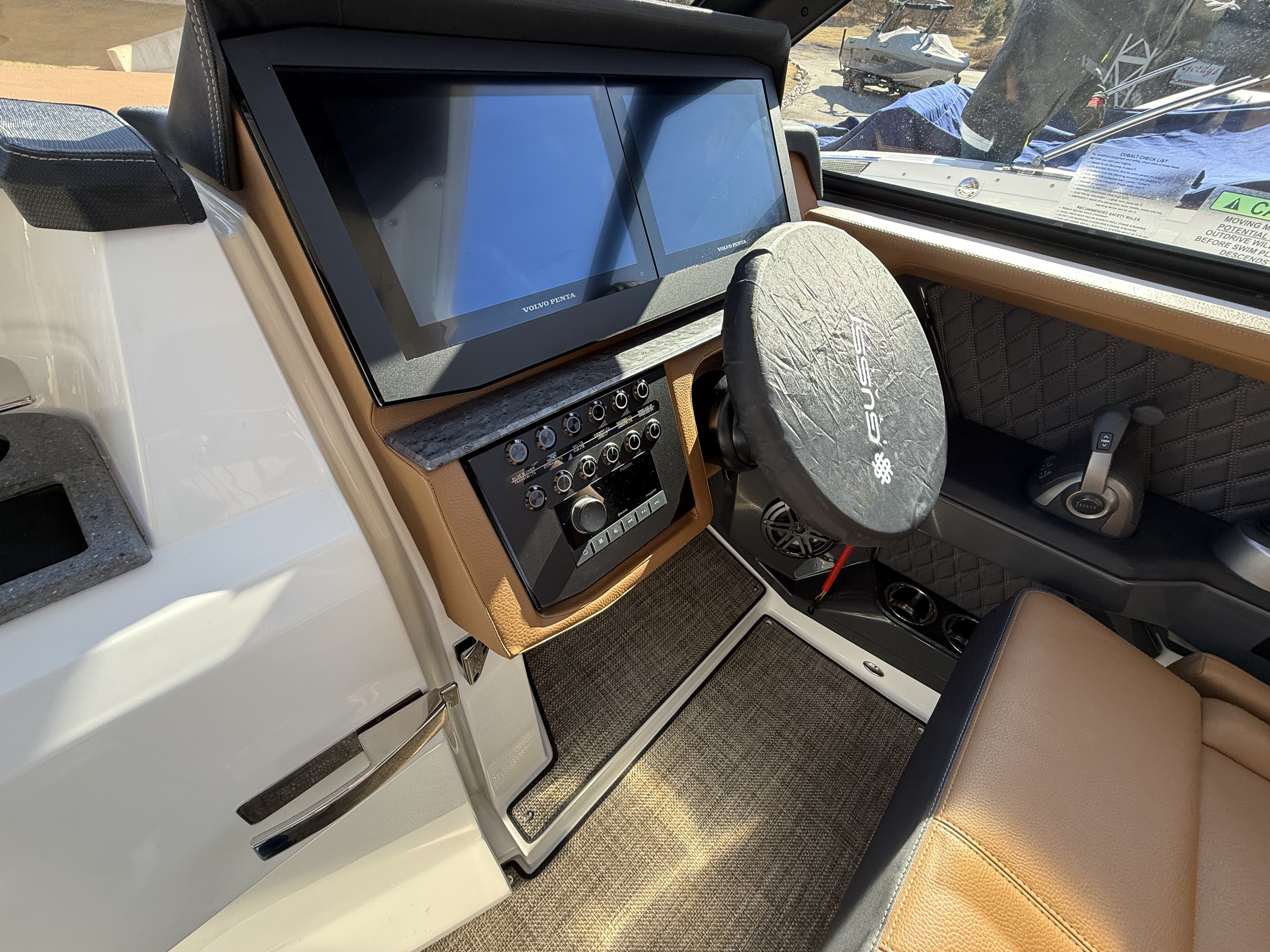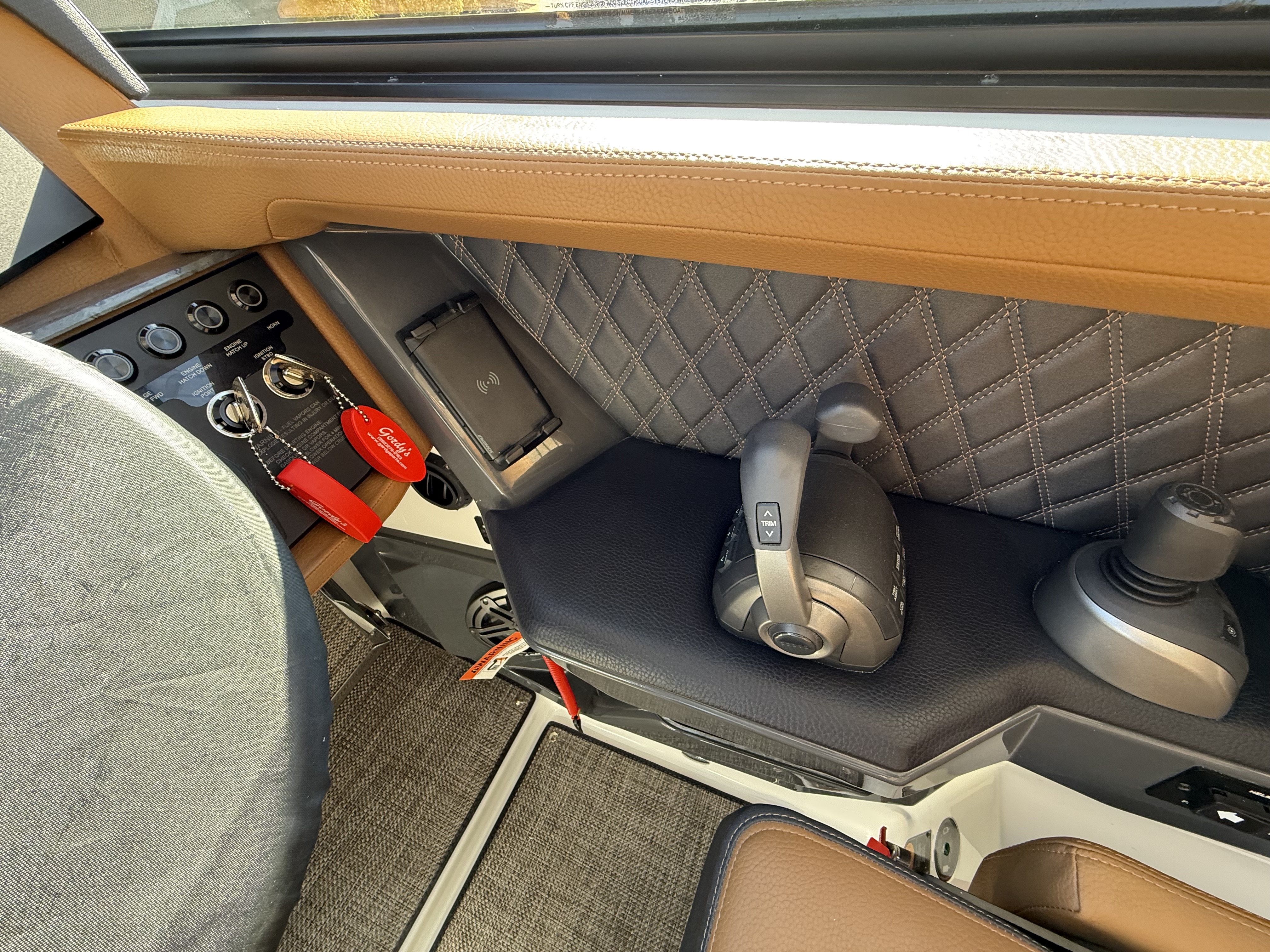 The helm features dual 12-inch Garmin glass cockpit displays for a clean, intuitive command center. A leather color-matched steering wheel, fold-down footrest, & passenger helm watch seat ensure captain & co-pilot ride in comfort. A rear-facing camera adds confidence when docking or monitoring activity at the swim platform.