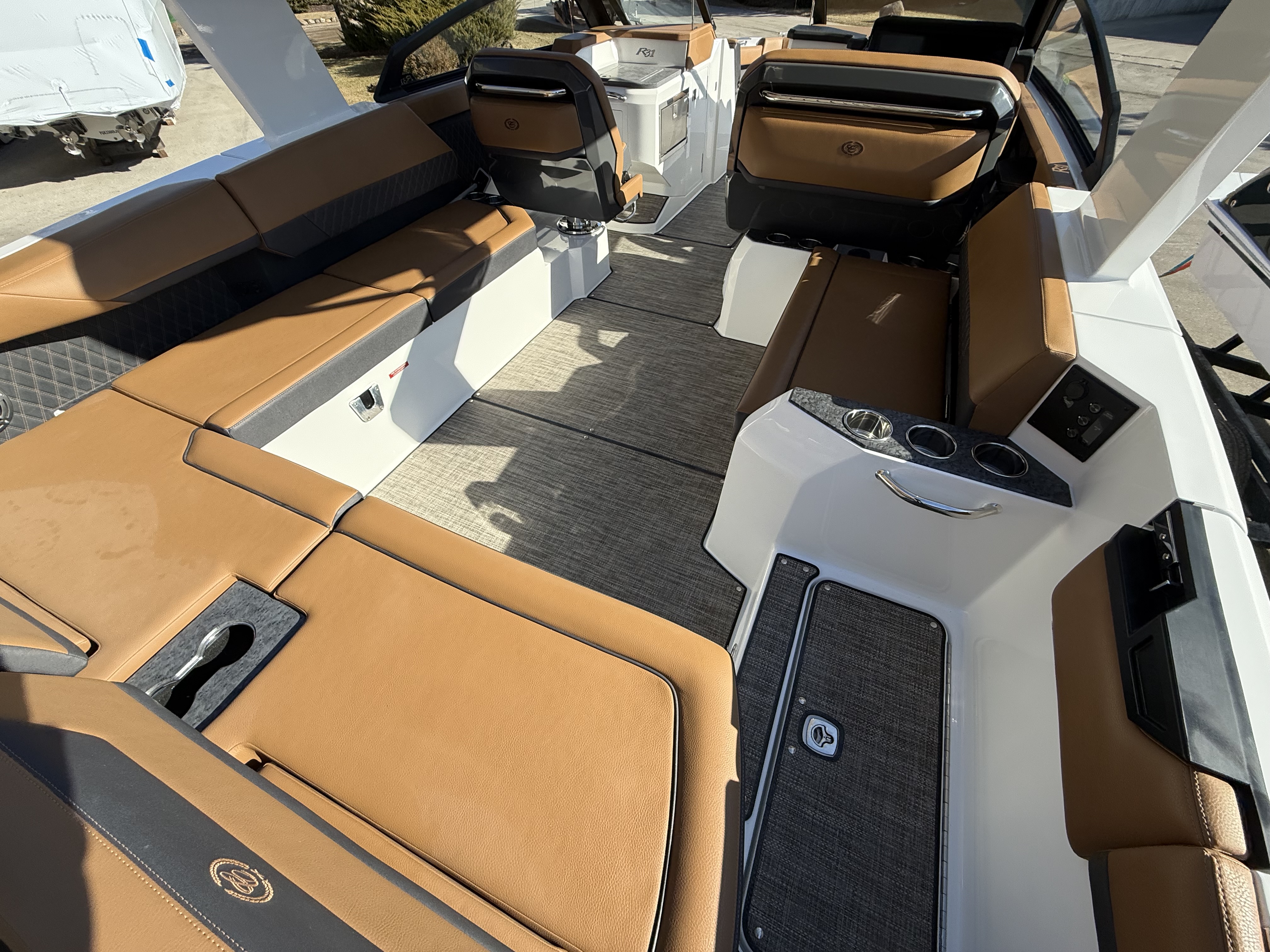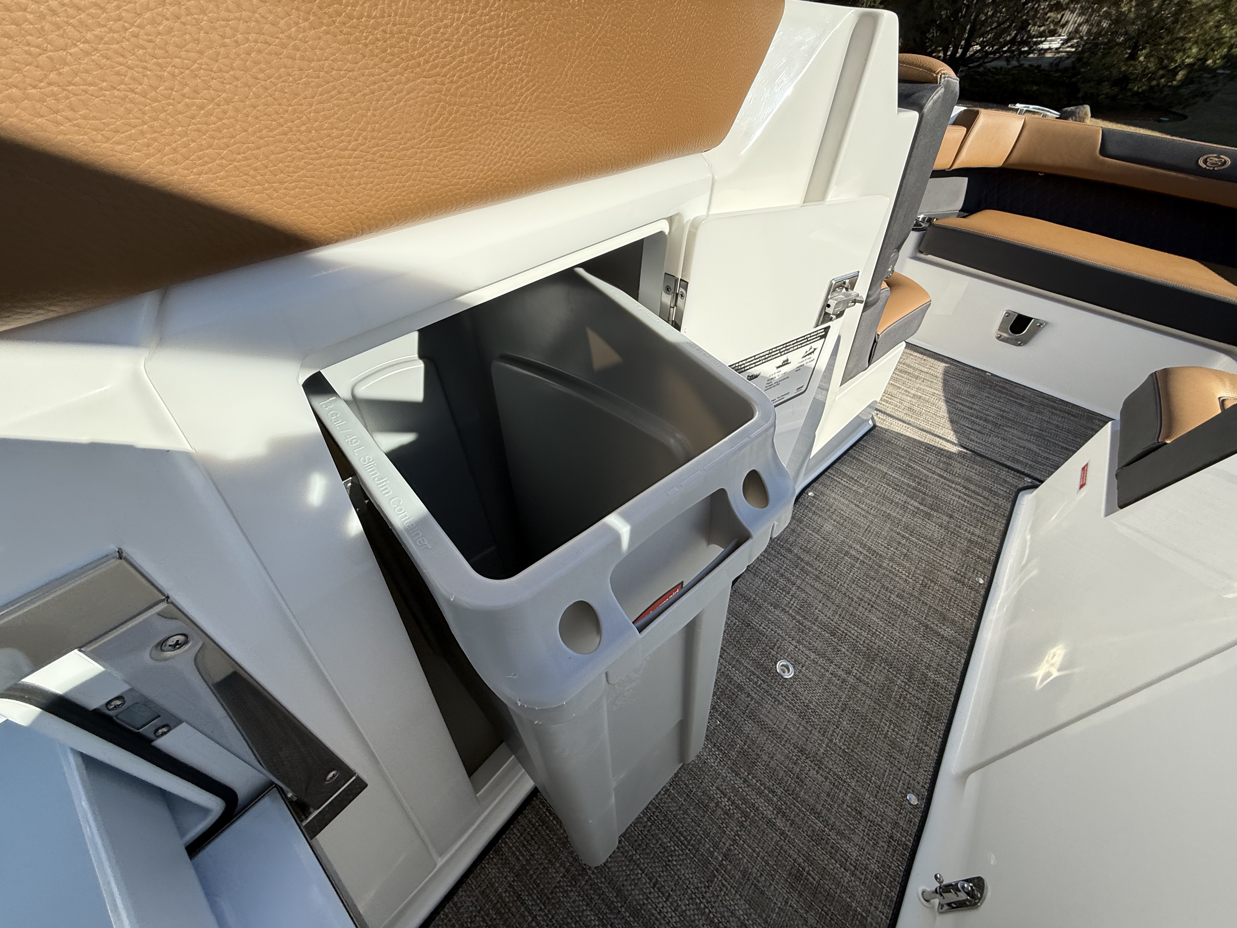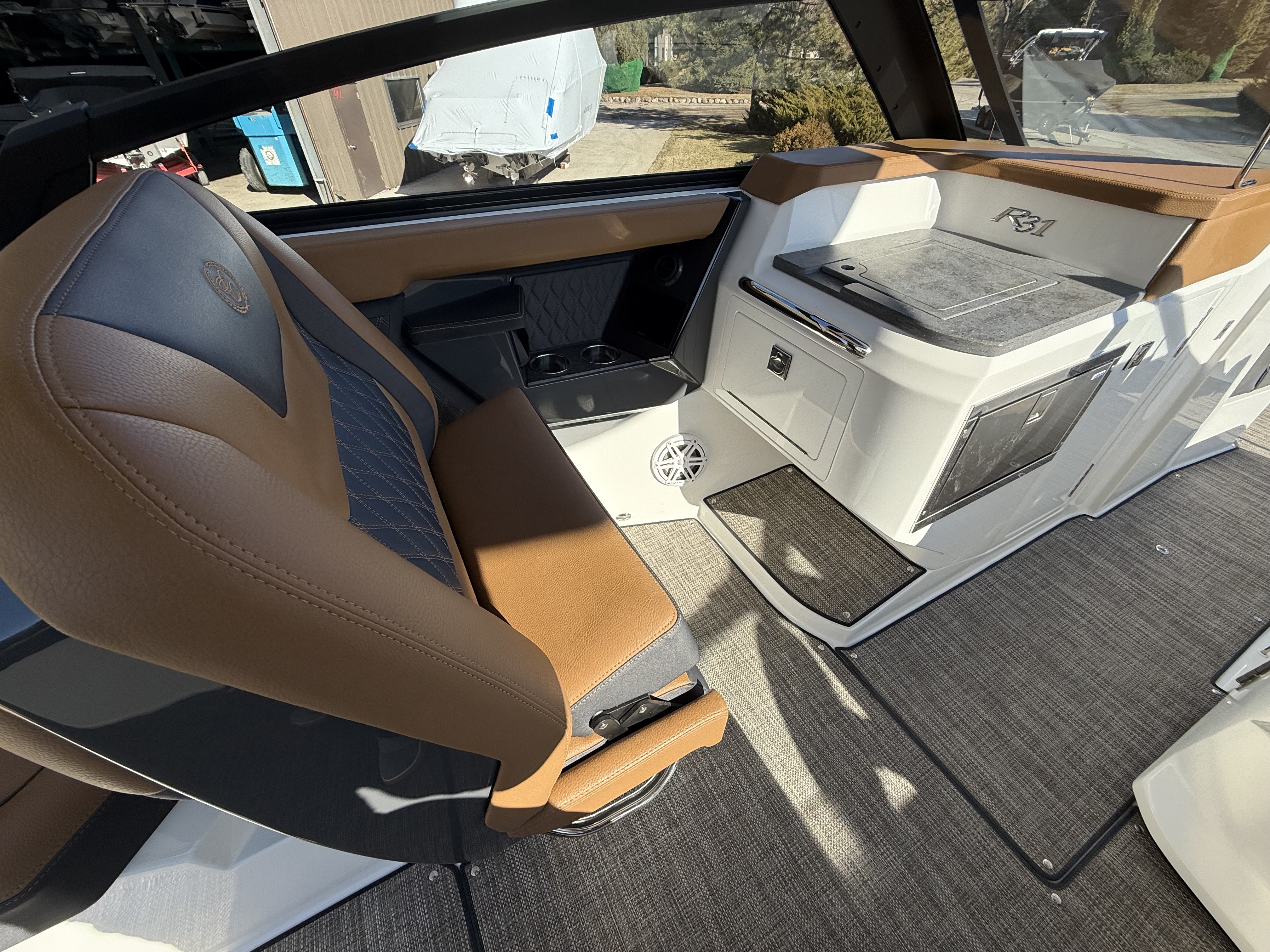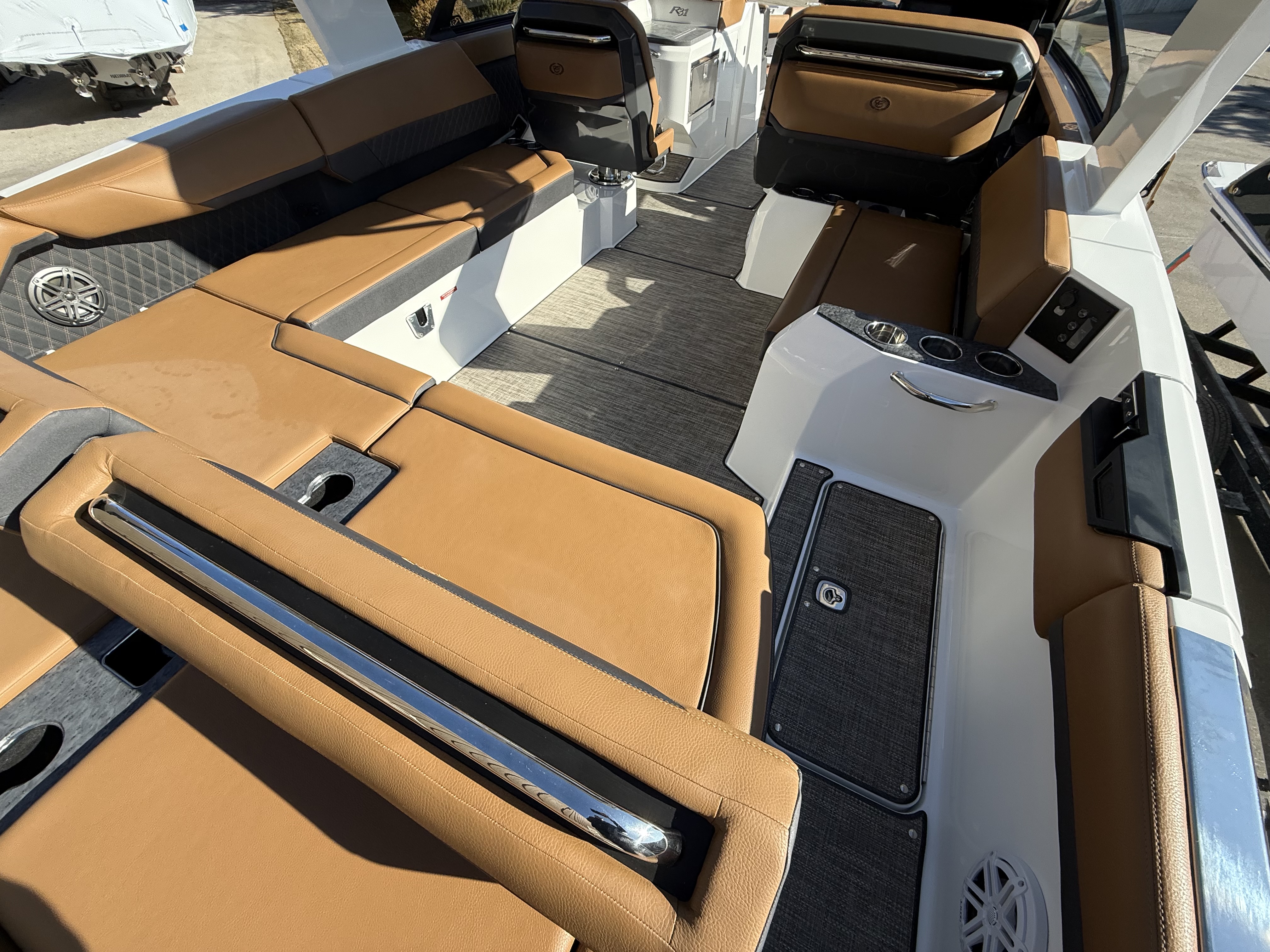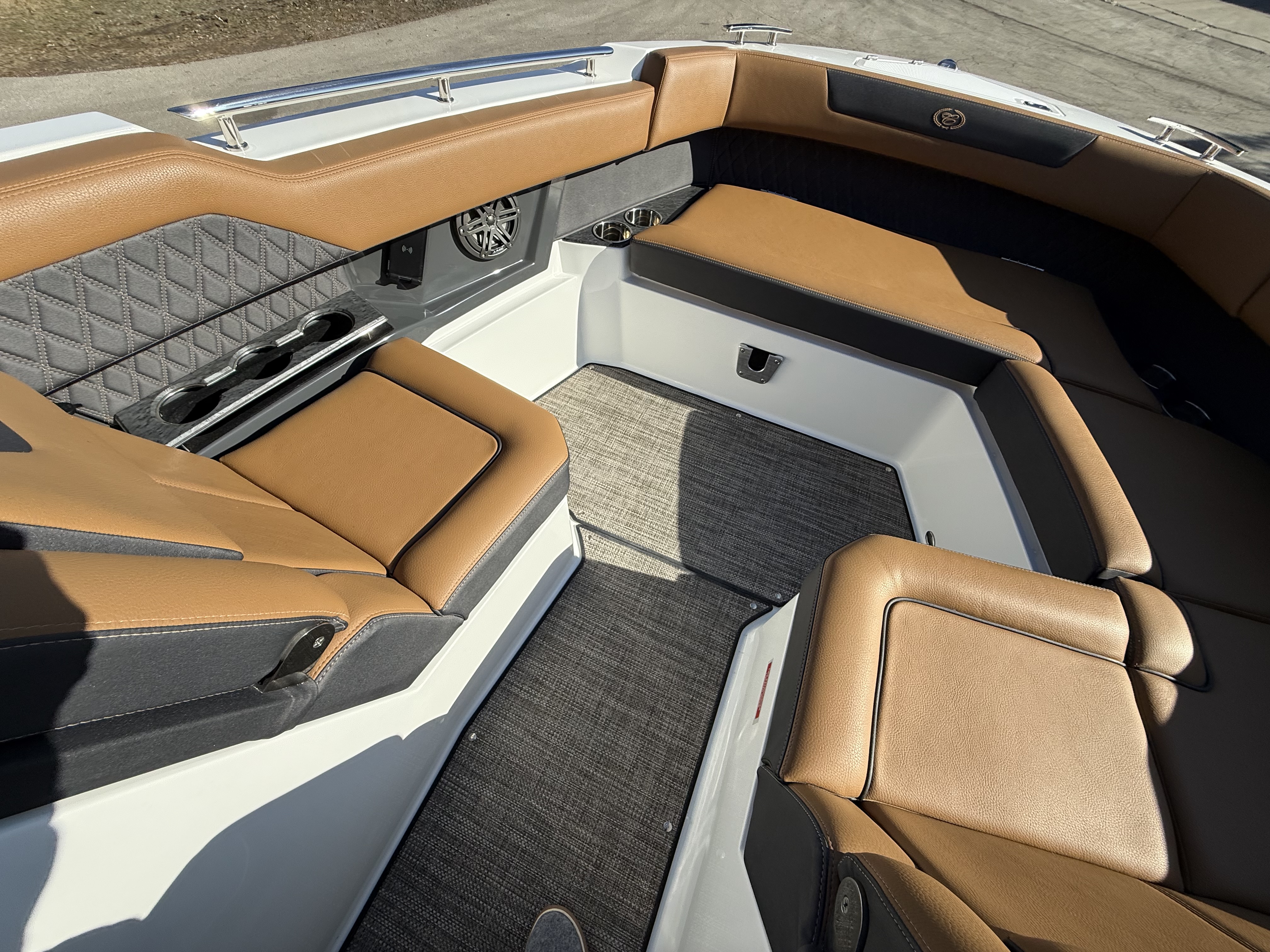 The helm features dual 12-inch Garmin glass cockpit displays for a clean, intuitive command center. A leather color-matched steering wheel, fold-down footrest, & passenger helm watch seat ensure captain & co-pilot ride in comfort. A rear-facing camera adds confidence when docking or monitoring activity at the swim platform.