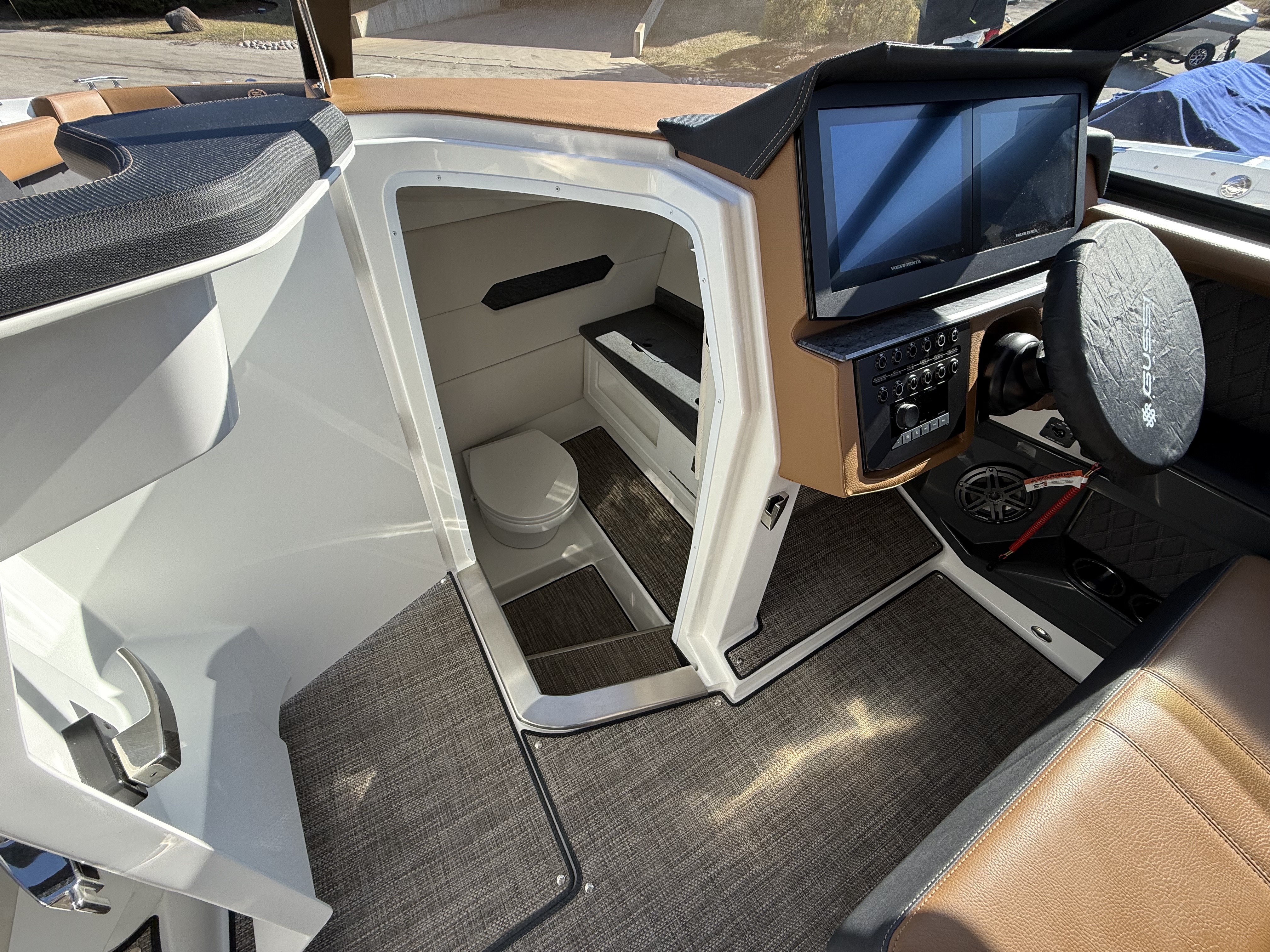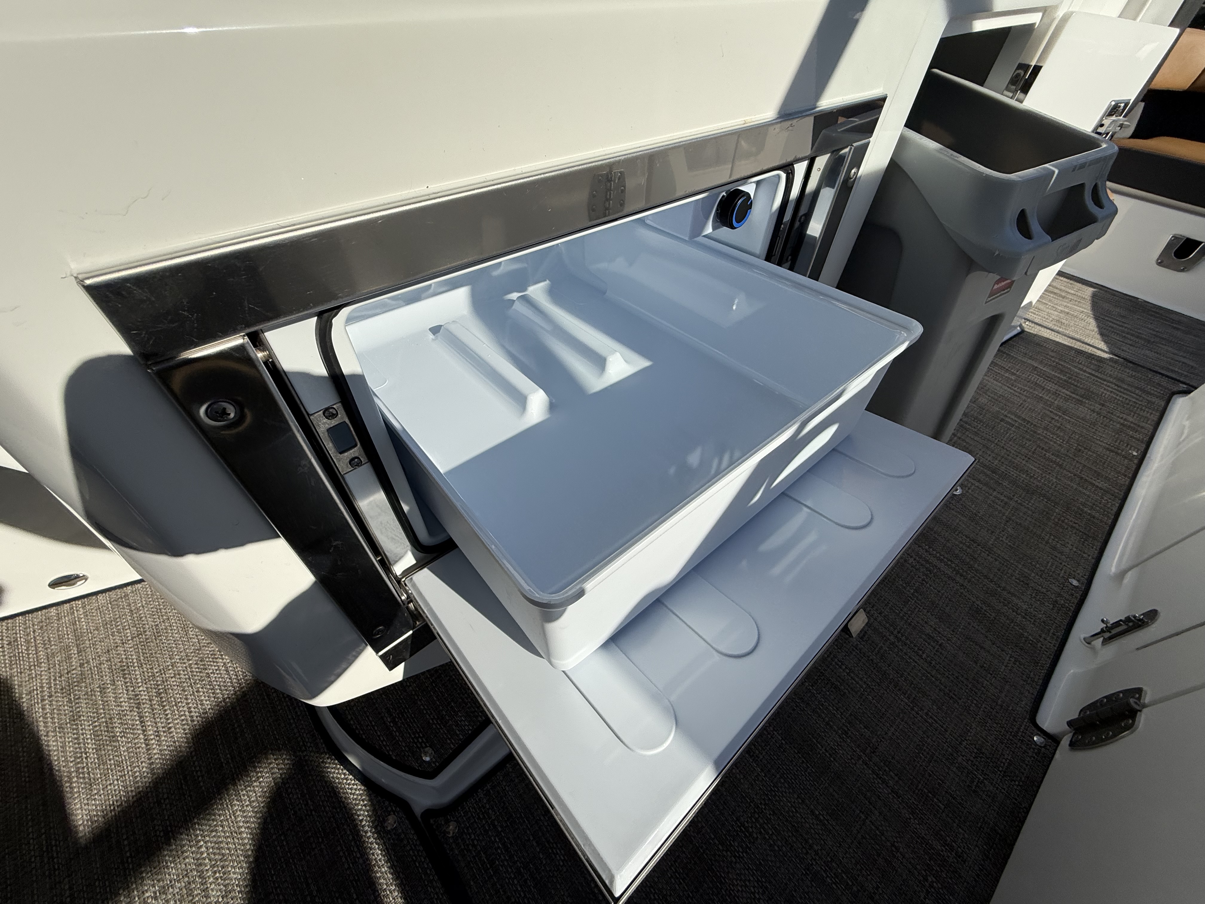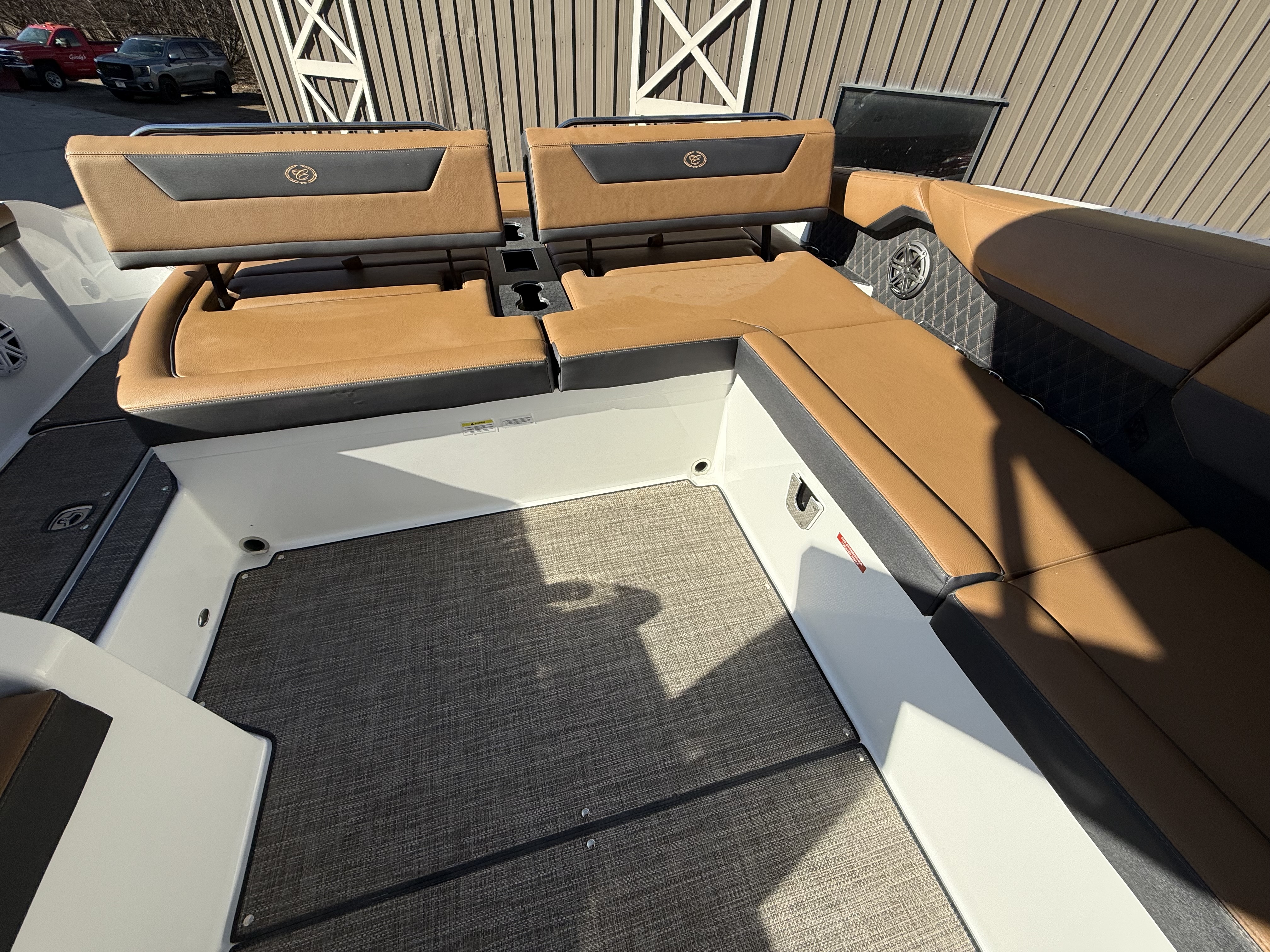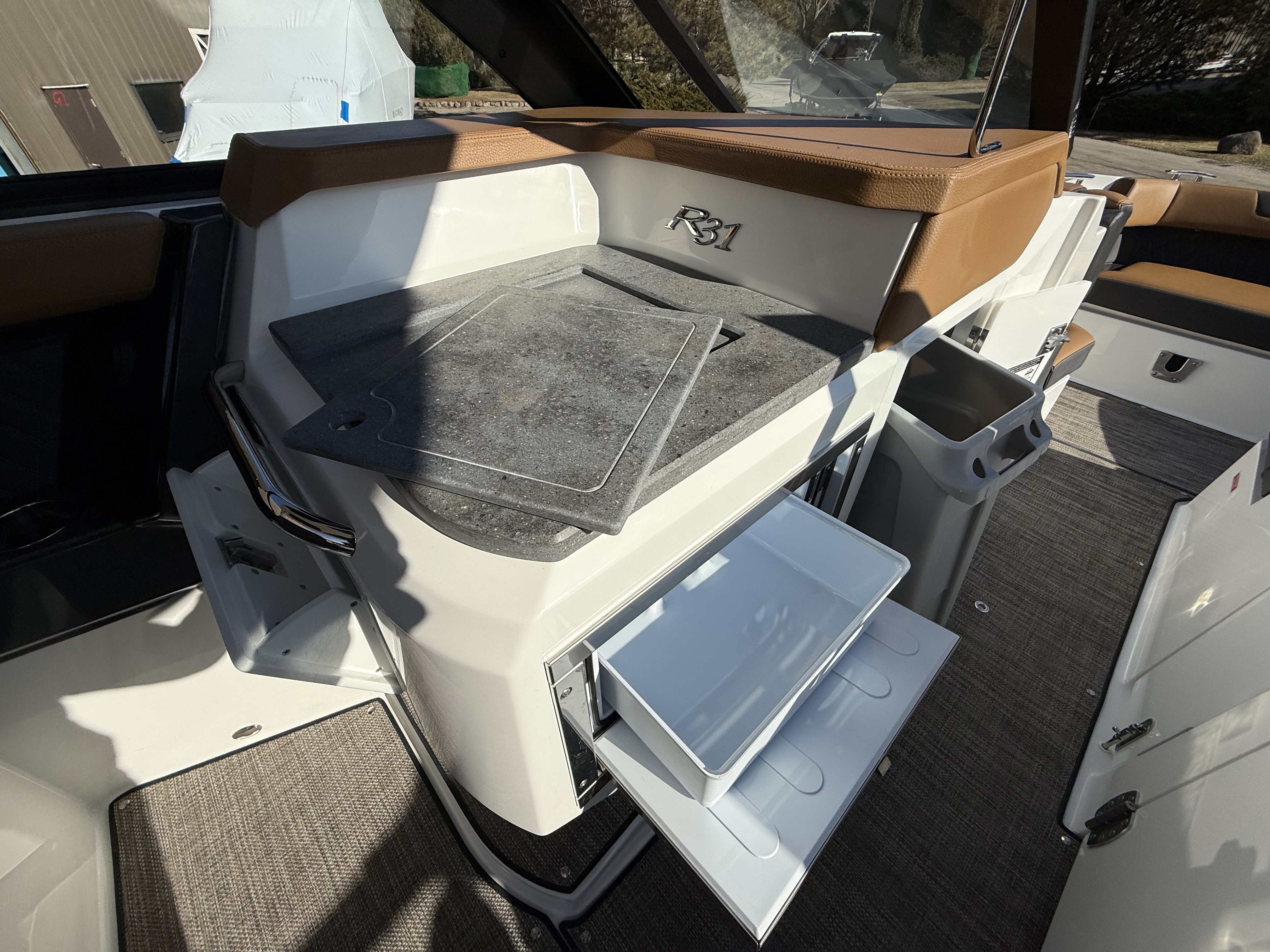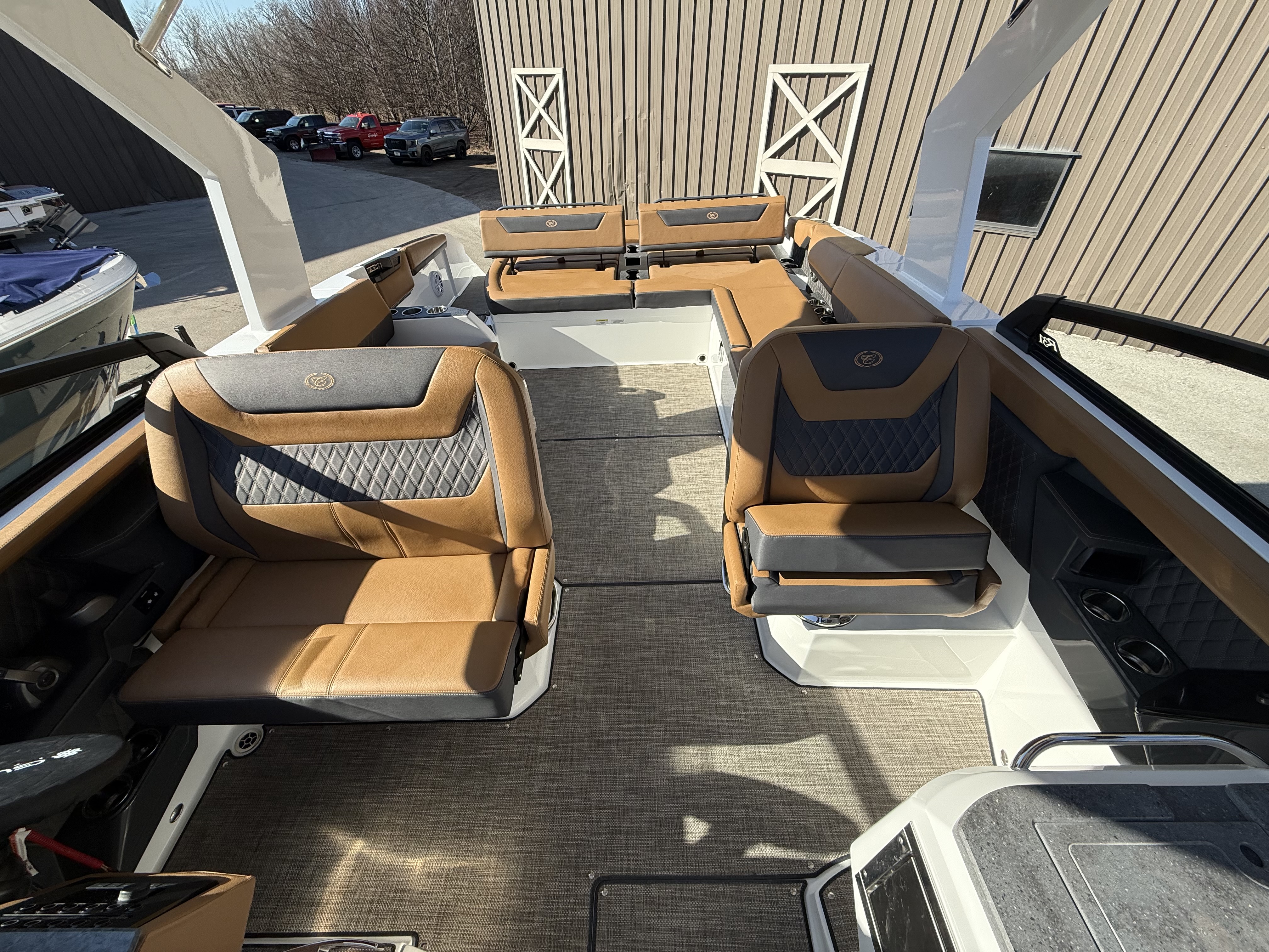 The helm features dual 12-inch Garmin glass cockpit displays for a clean, intuitive command center. A leather color-matched steering wheel, fold-down footrest, & passenger helm watch seat ensure captain & co-pilot ride in comfort. A rear-facing camera adds confidence when docking or monitoring activity at the swim platform.