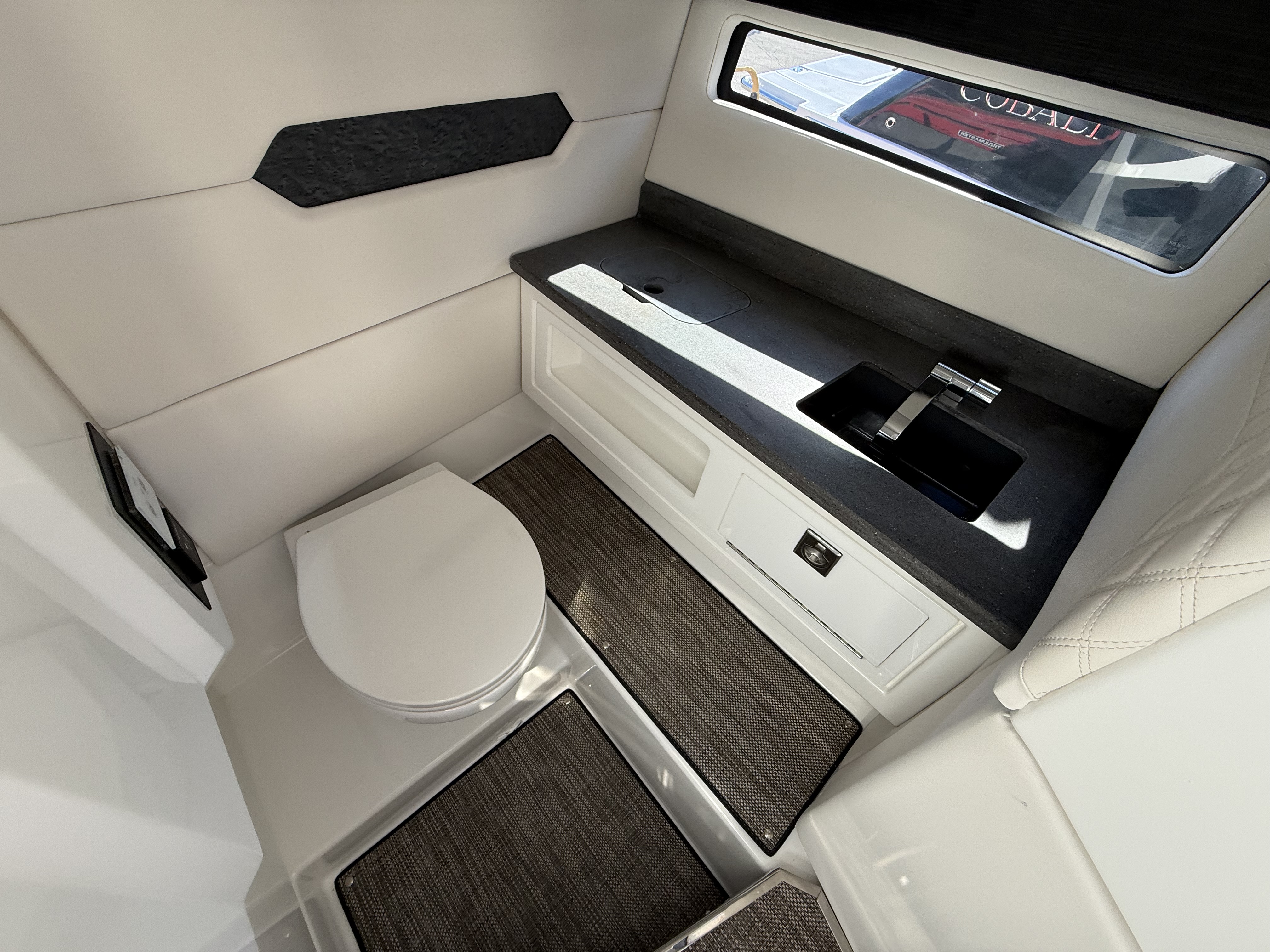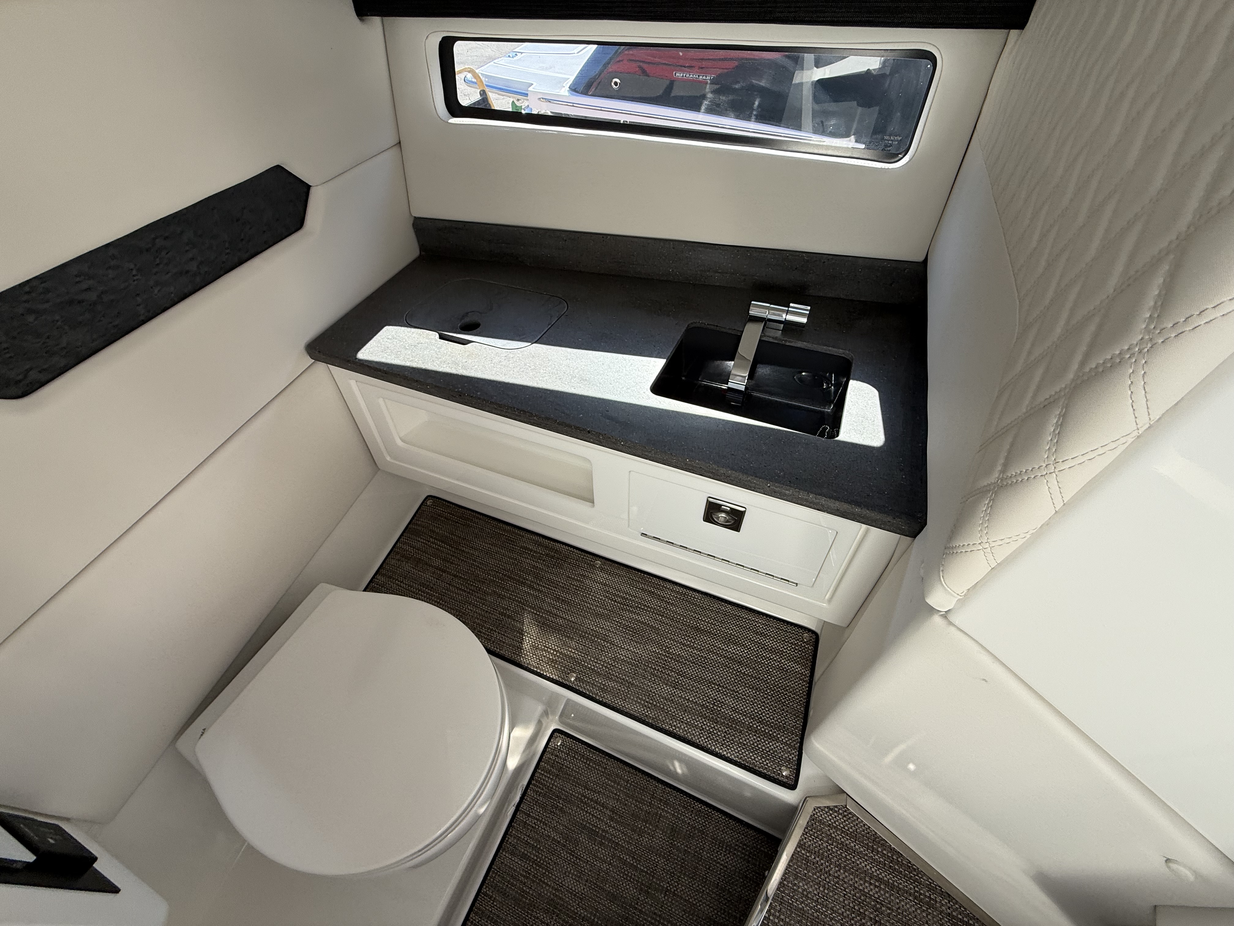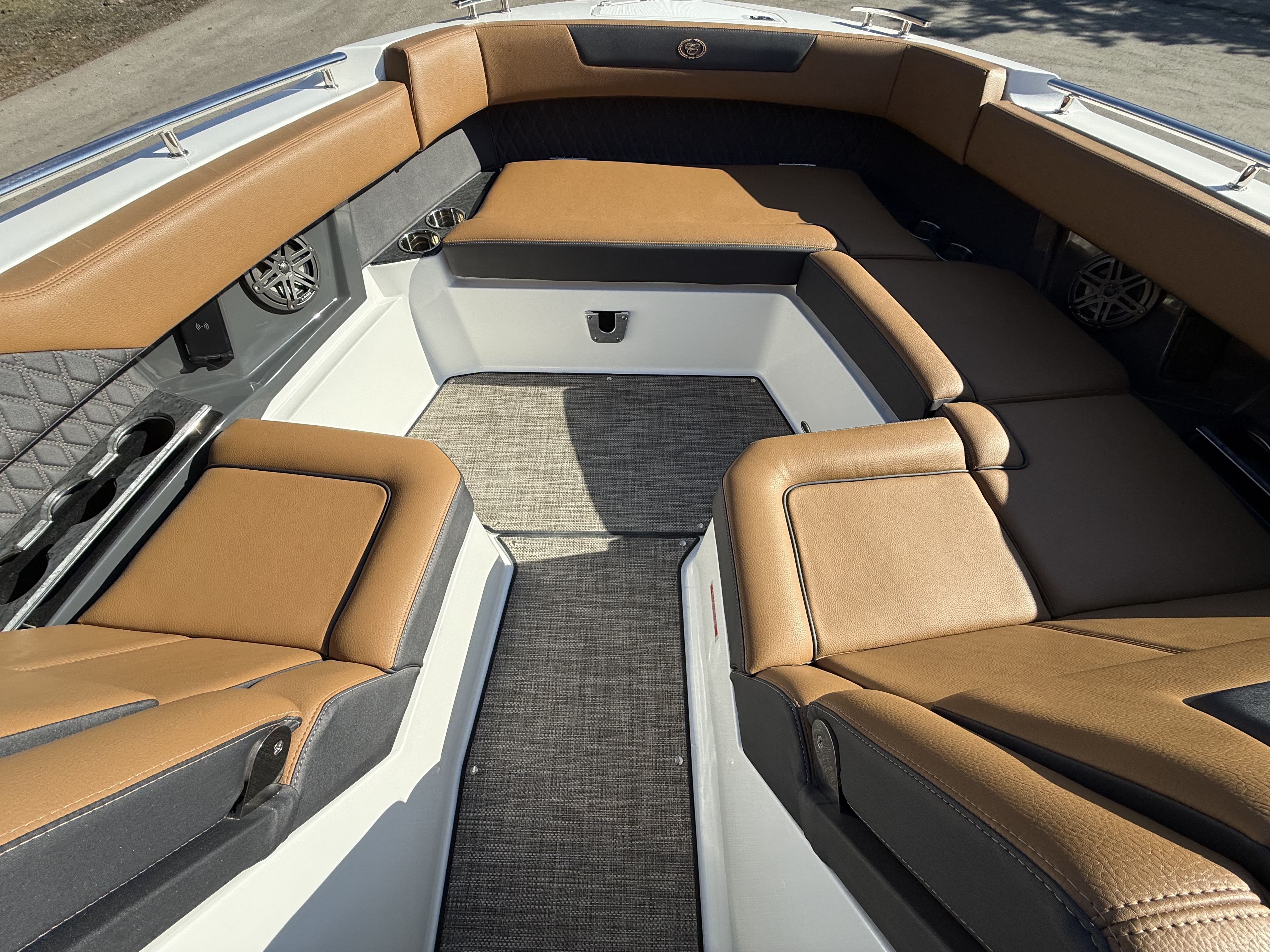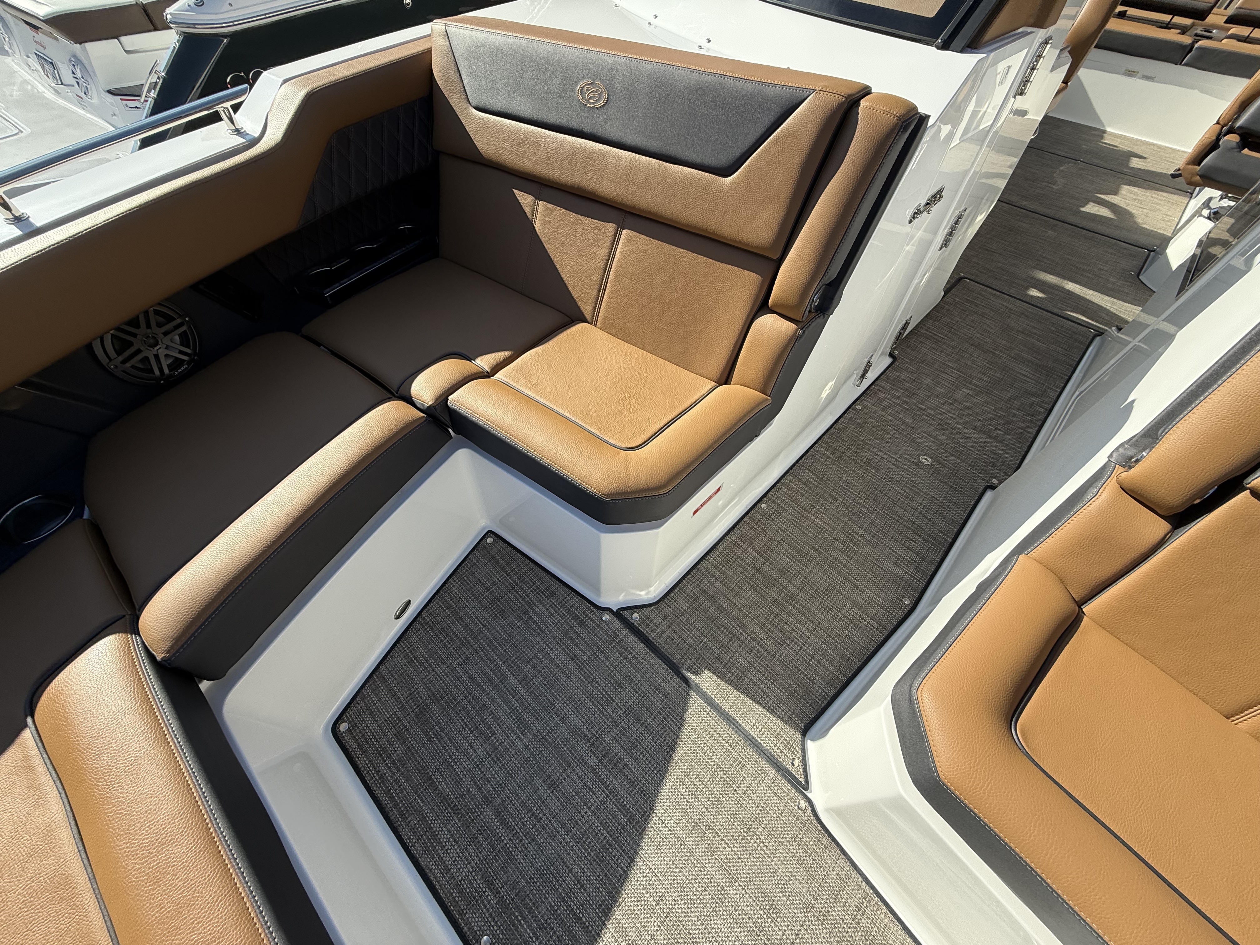 Step aboard to a rich Caramel/Carbon interior accented by a wood trim package & solid teak dinette table. Sea grass flooring flows throughout the bow, cockpit, helm, and head, delivering durability with upscale appeal. Weighted throw pillows & RGB LED accent lighting under the hardtop create the perfect atmosphere for both relaxed cruising & evening entertaining.