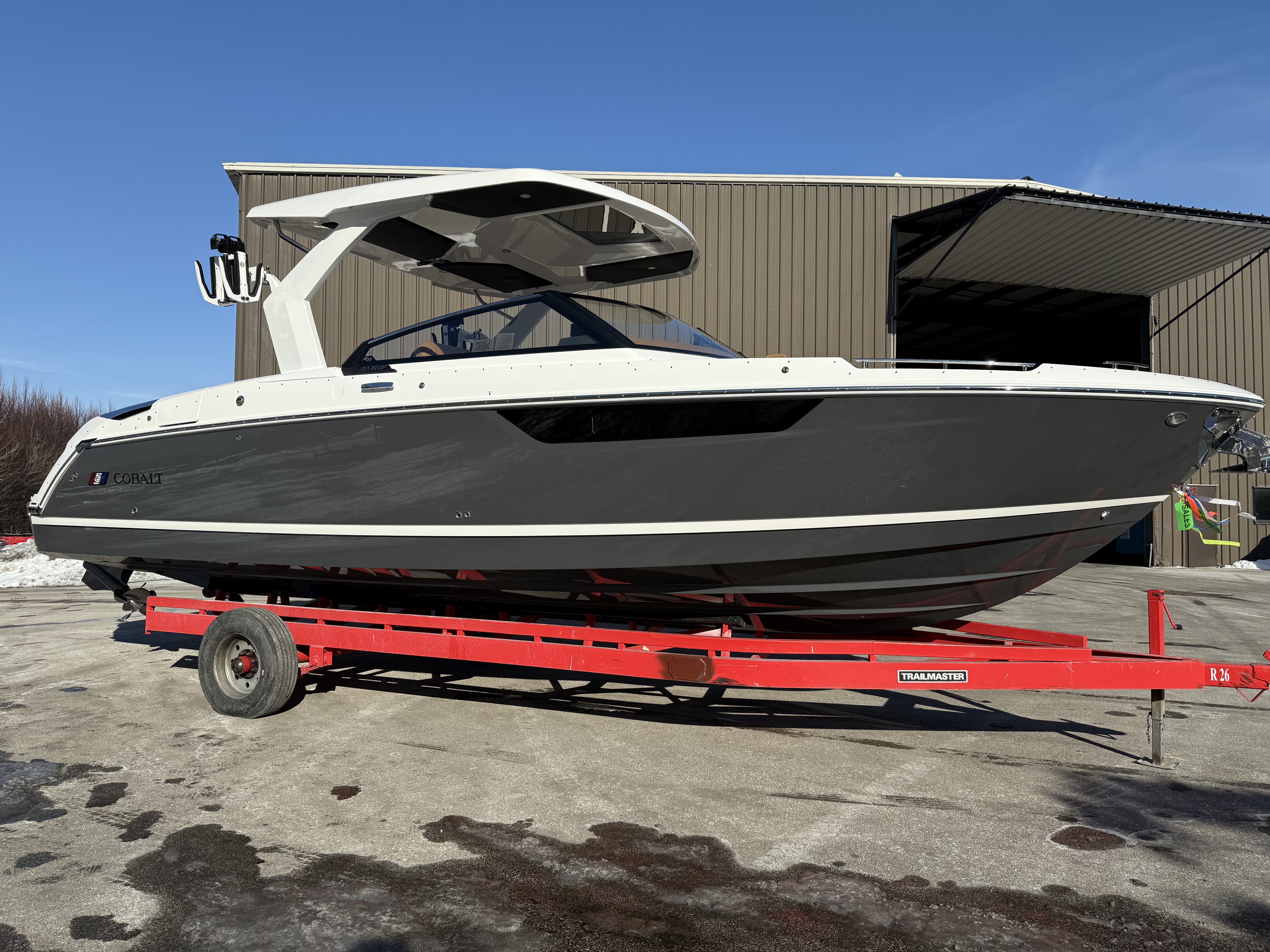 Its striking Caramel/Carbon, Graphite Gray, and White exterior is complemented by Satin Black Cobalt lettering, while the arch with hardtop and electric awning and dual Garmin 12" glass cockpit displays put control and comfort right where you need it. Step onto the hydraulic swim platform with flip-down step and feel the seamless integration of style and functionality.