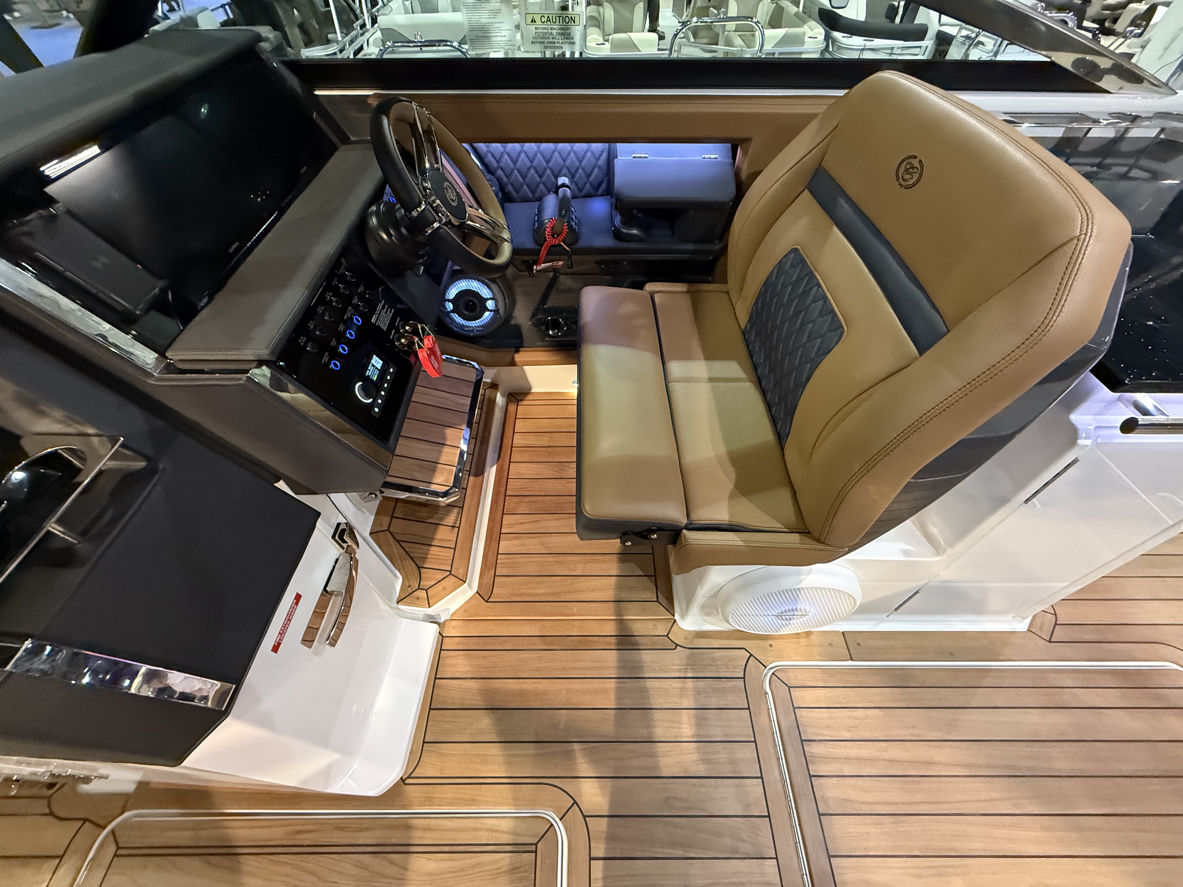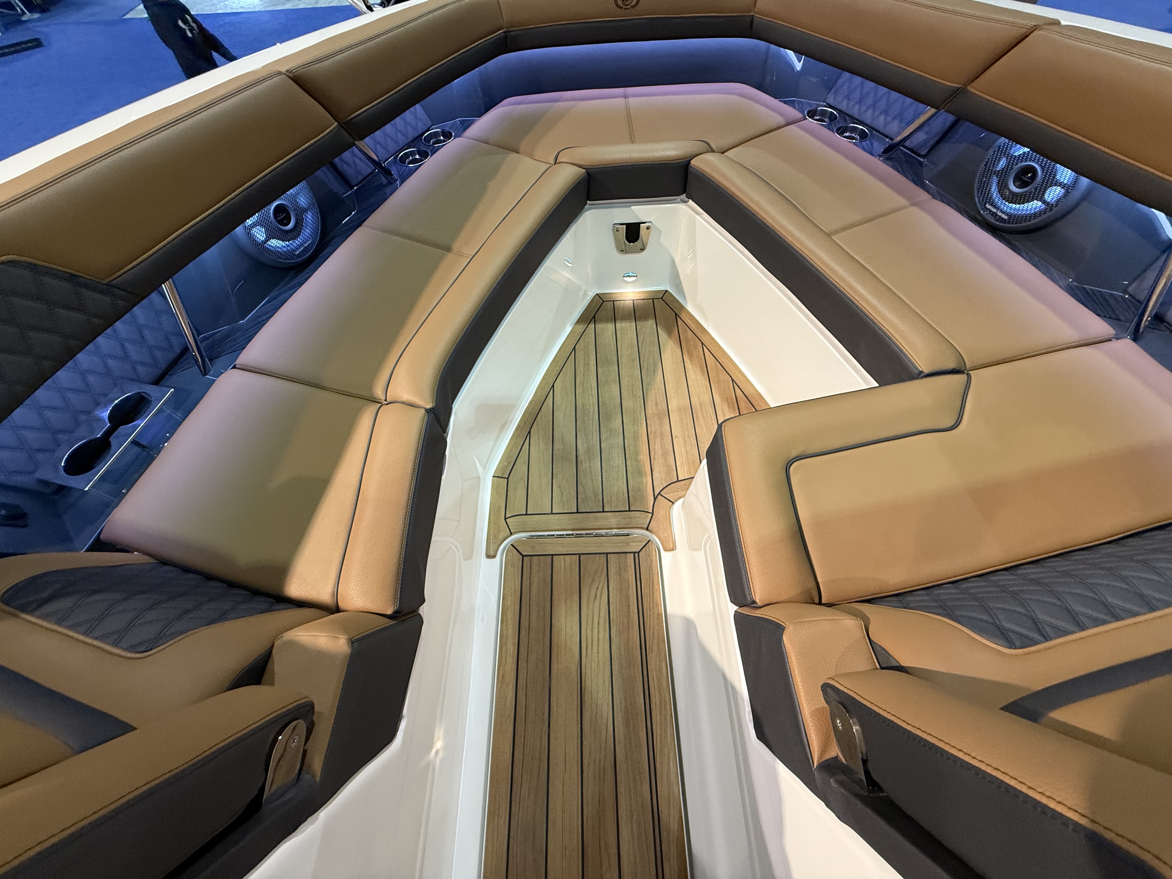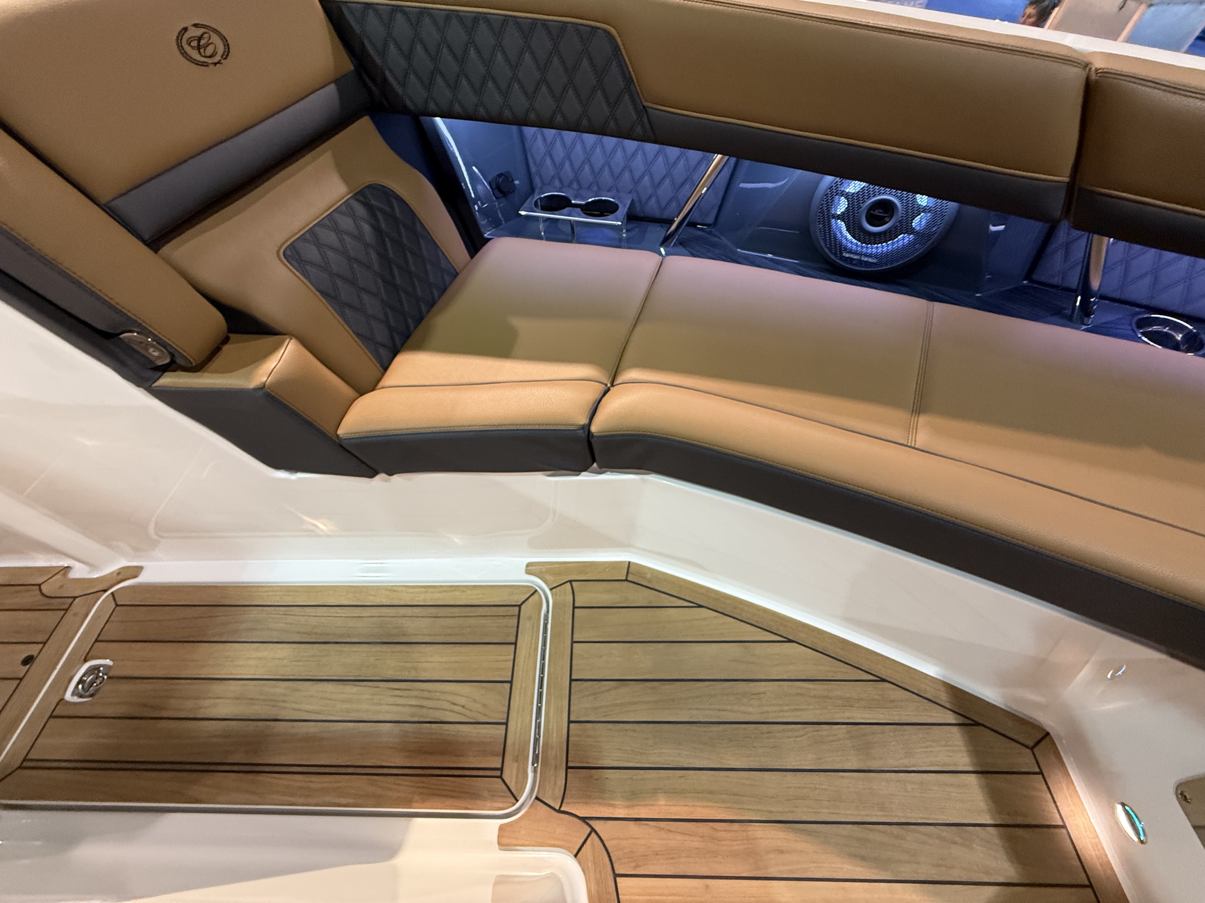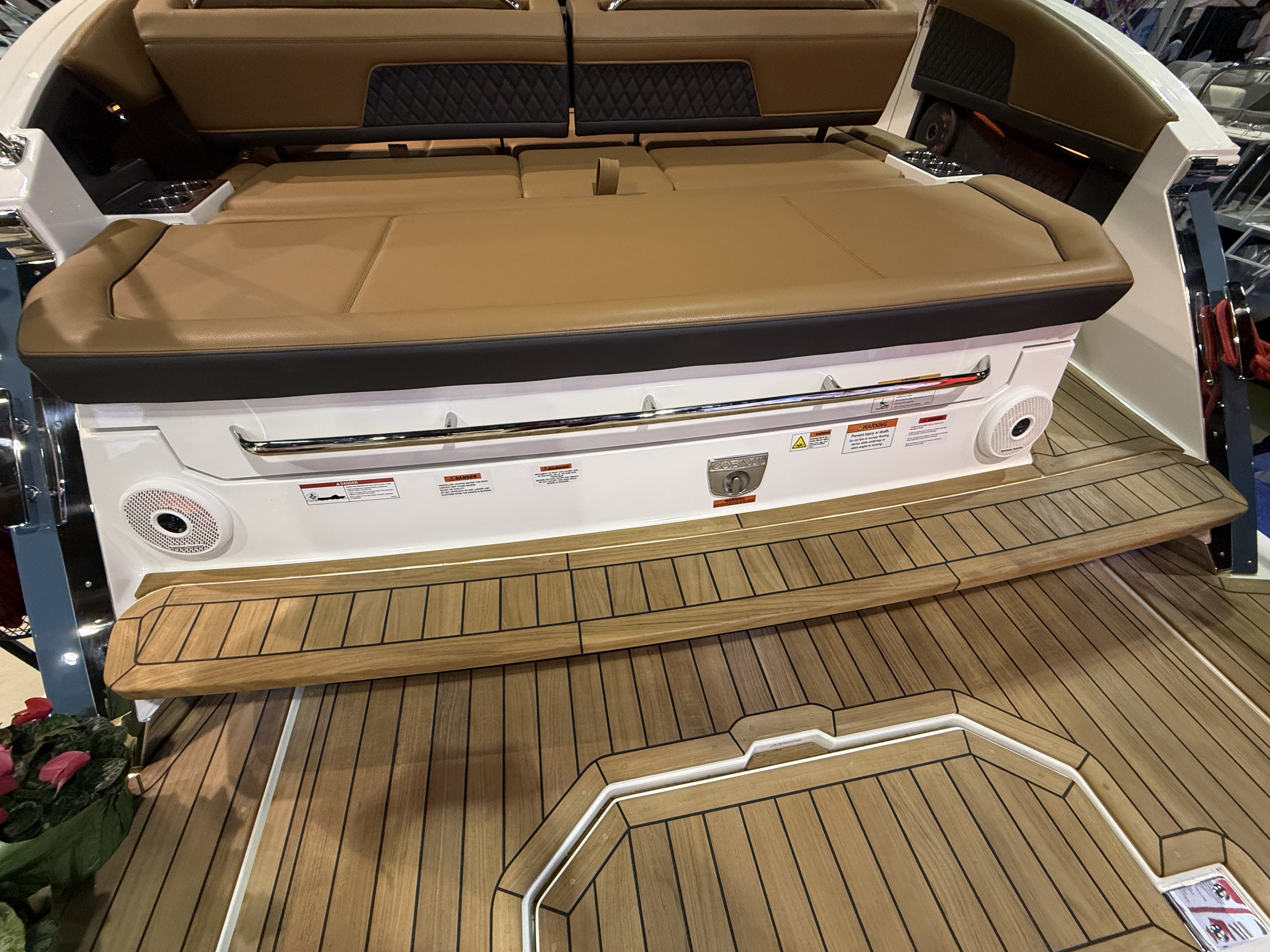 Entertainment is elevated with a Harman Kardon Platinum sound system with transom speakers, RGB LED interior accent lighting, underwater lighting, and swim platform transom lights—creating the perfect atmosphere from daytime cruising to evening gatherings. Wireless phone charging, weighted throw pillows, and thoughtful storage enhance comfort throughout the boat.