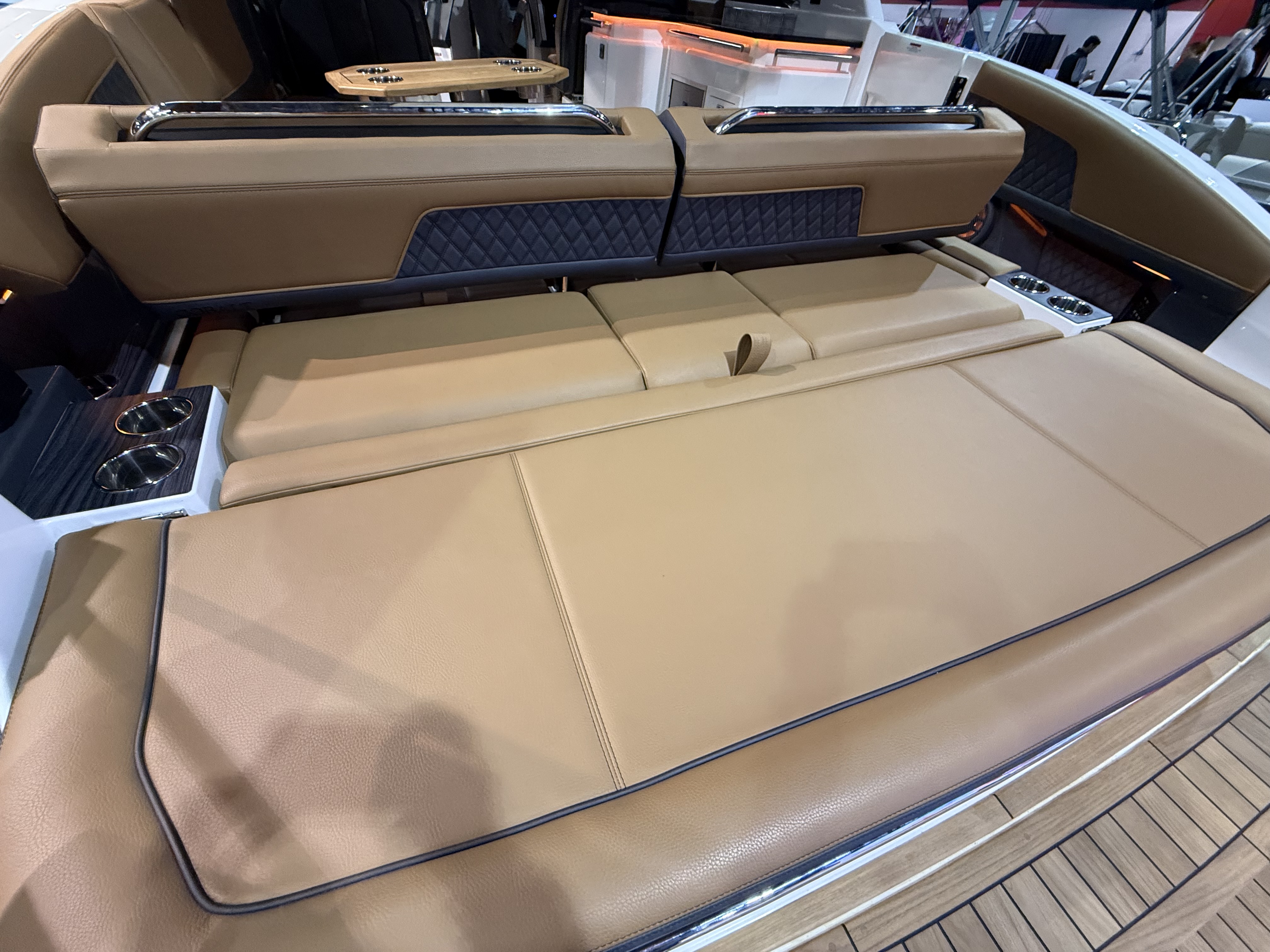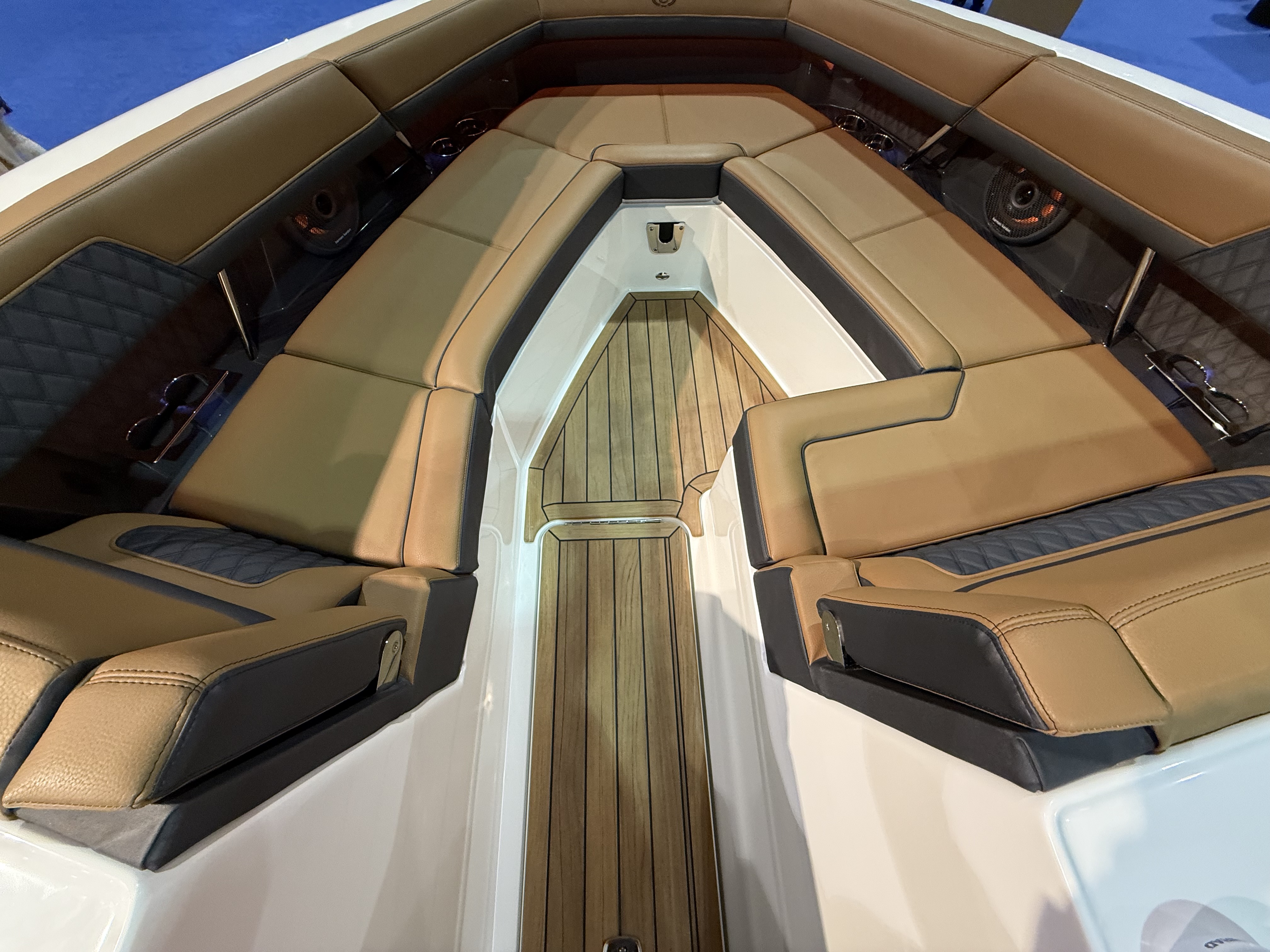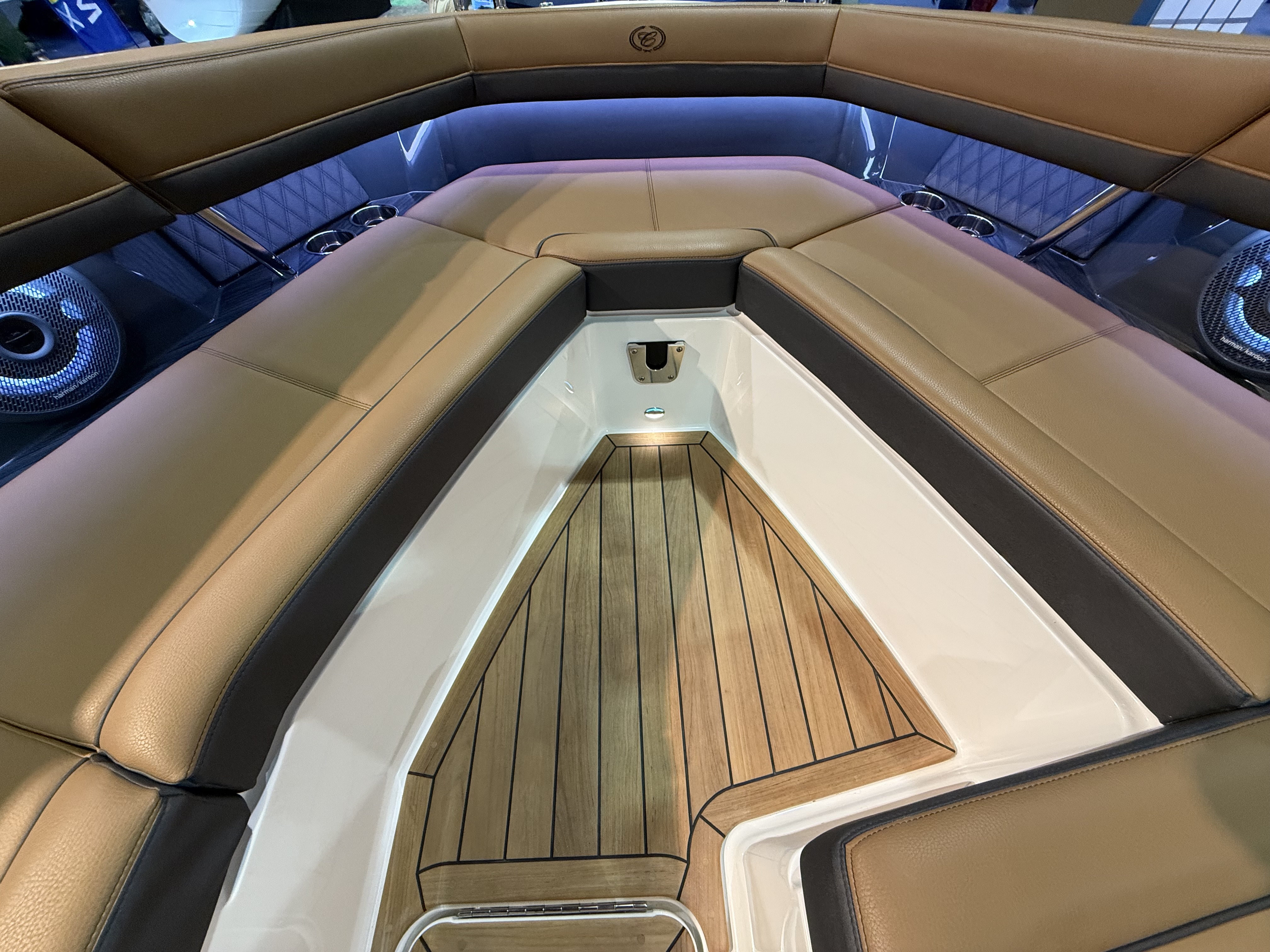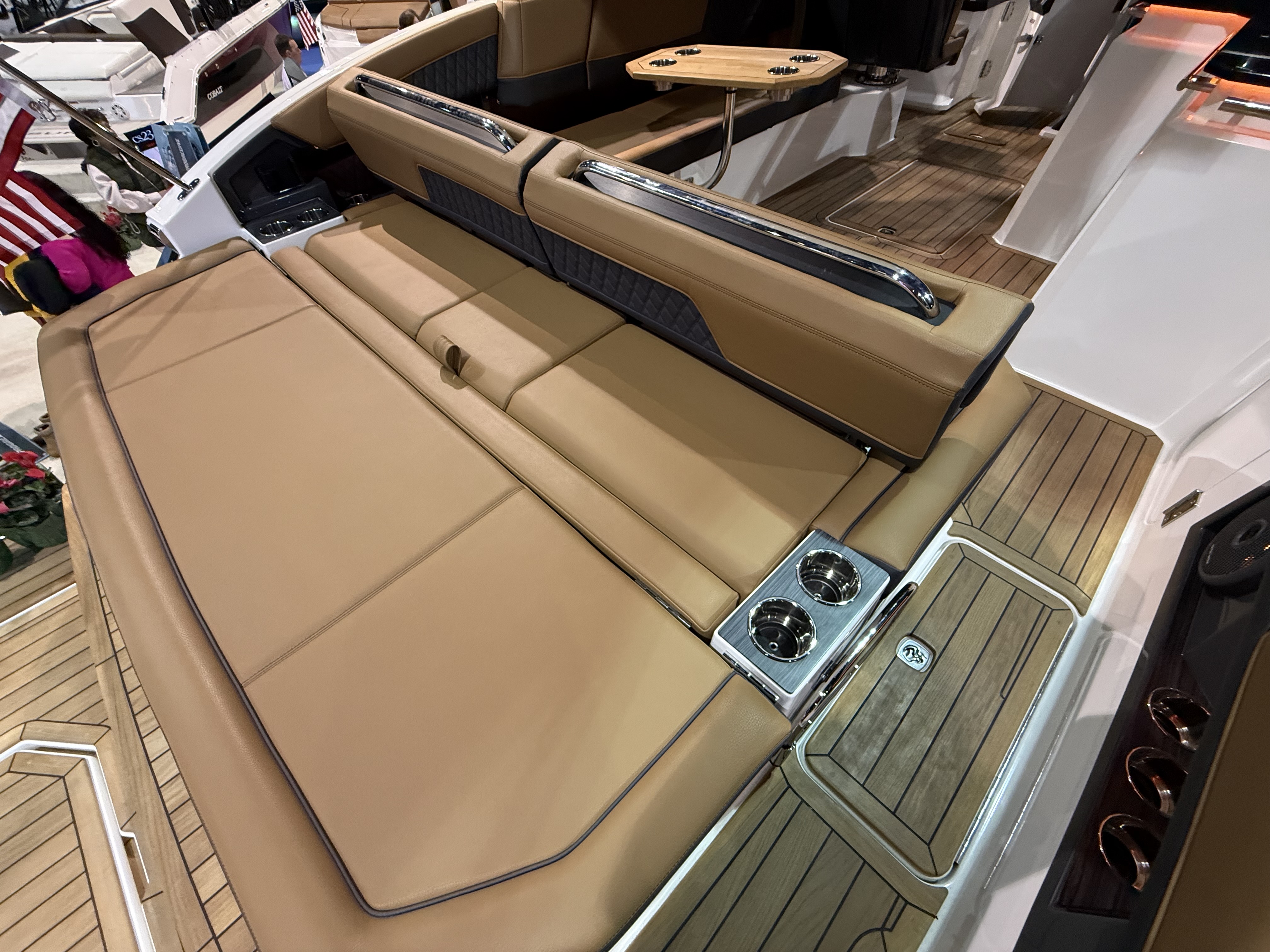 Entertainment is elevated with a Harman Kardon Platinum sound system with transom speakers, RGB LED interior accent lighting, underwater lighting, and swim platform transom lights—creating the perfect atmosphere from daytime cruising to evening gatherings. Wireless phone charging, weighted throw pillows, and thoughtful storage enhance comfort throughout the boat.