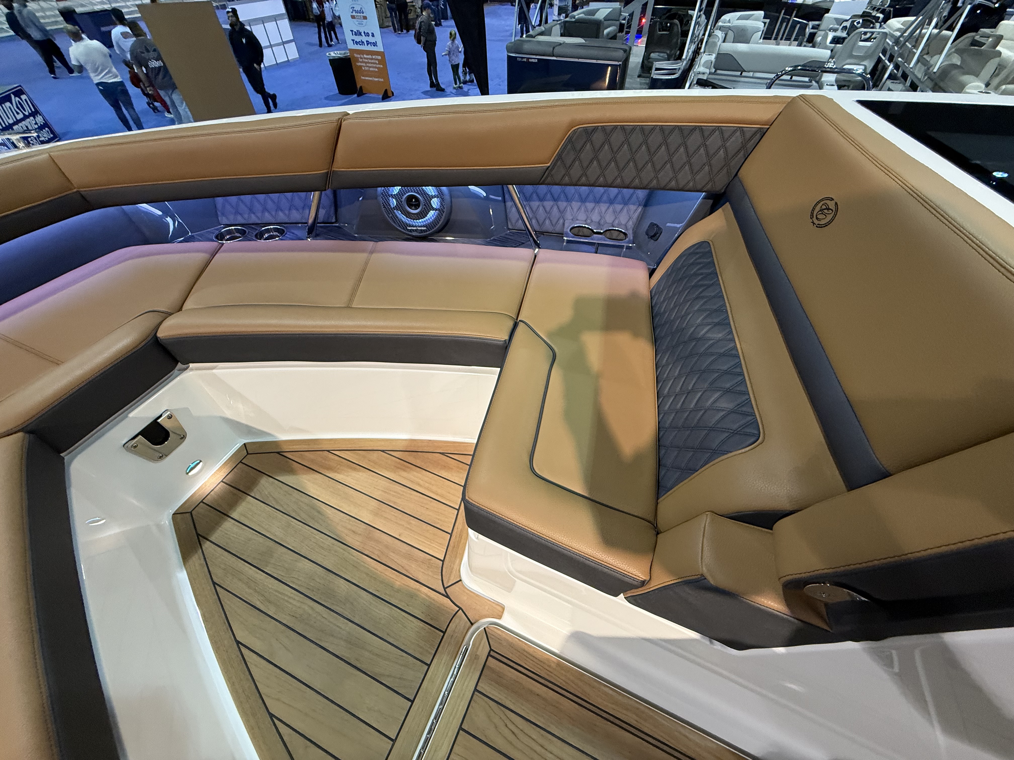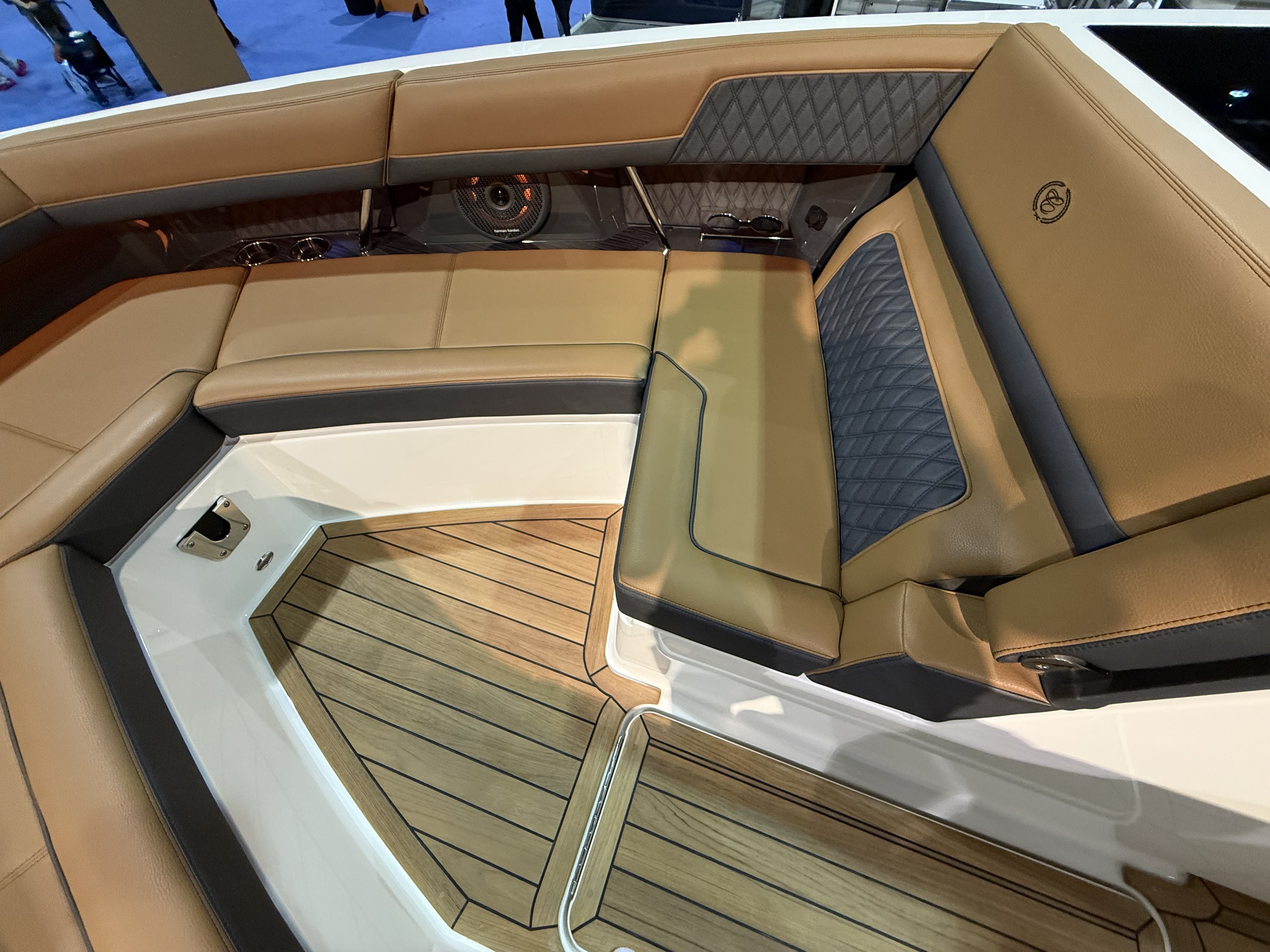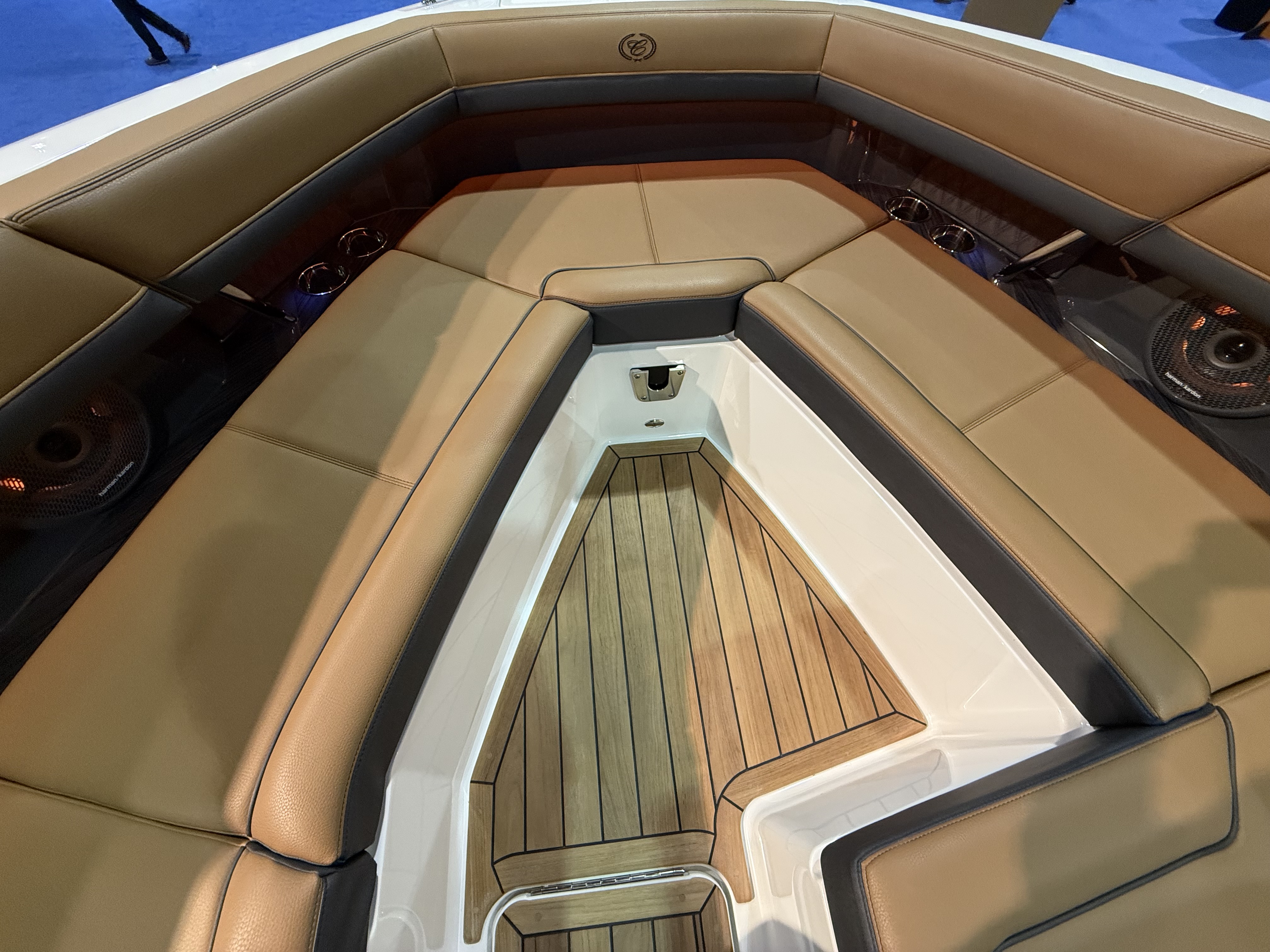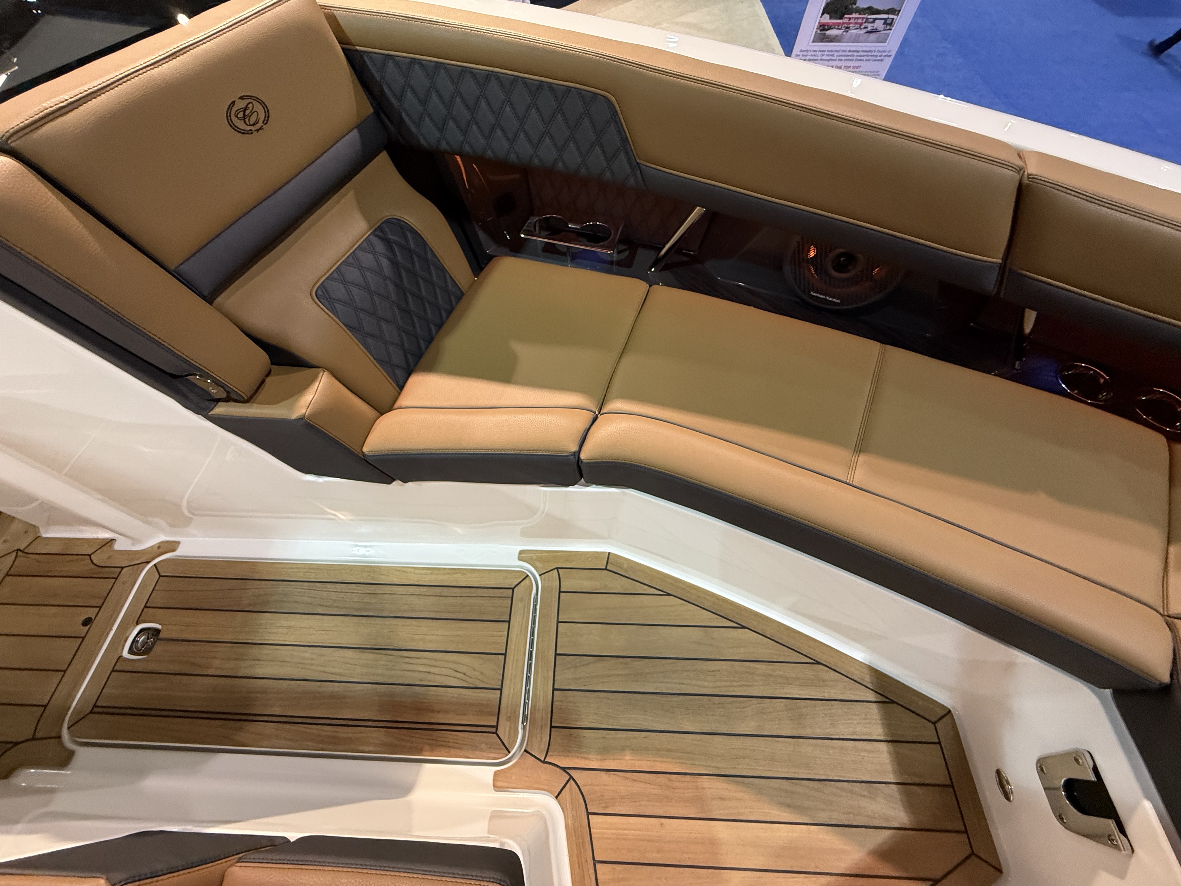 Entertainment is elevated with a Harman Kardon Platinum sound system with transom speakers, RGB LED interior accent lighting, underwater lighting, and swim platform transom lights—creating the perfect atmosphere from daytime cruising to evening gatherings. Wireless phone charging, weighted throw pillows, and thoughtful storage enhance comfort throughout the boat.