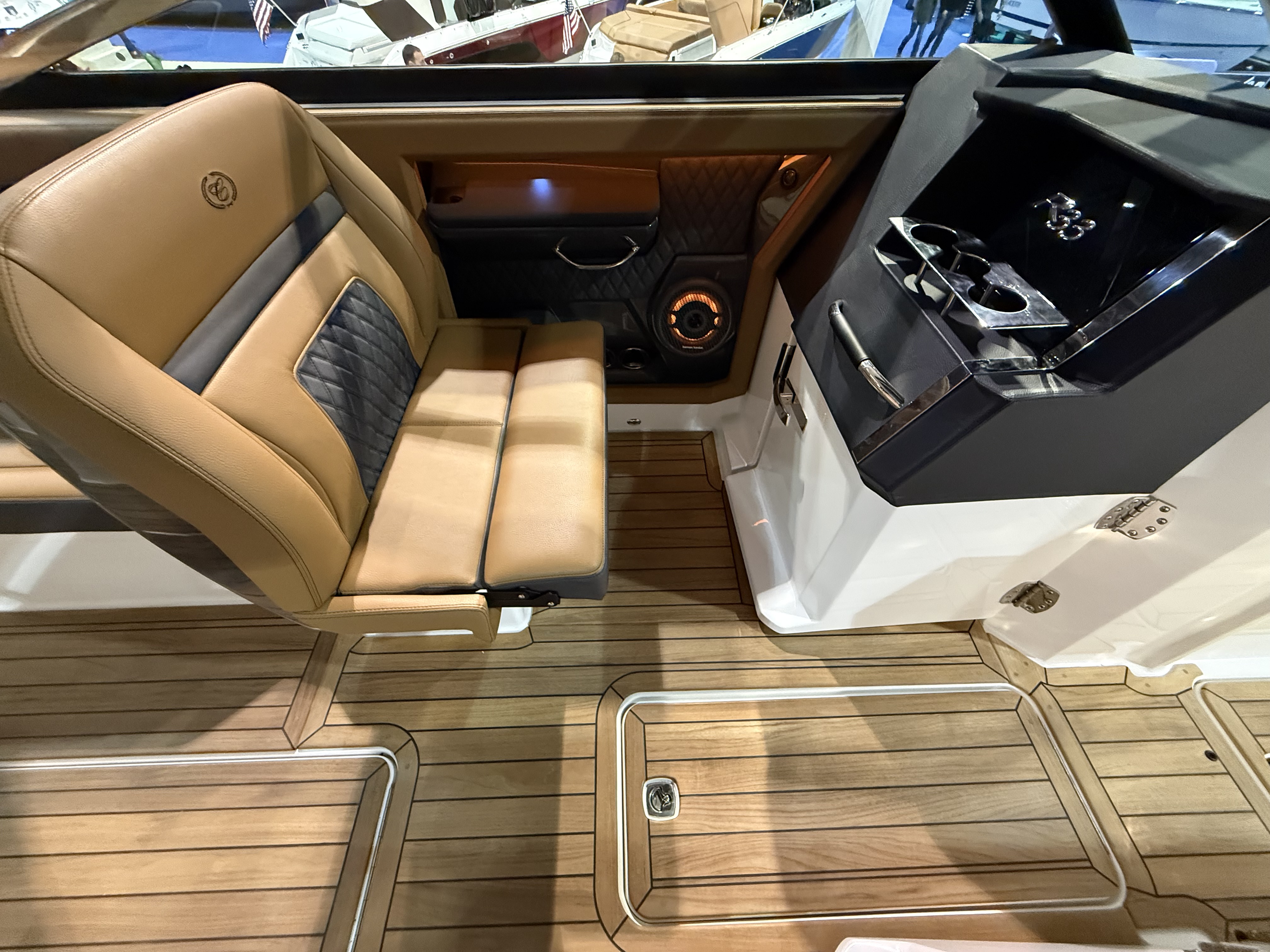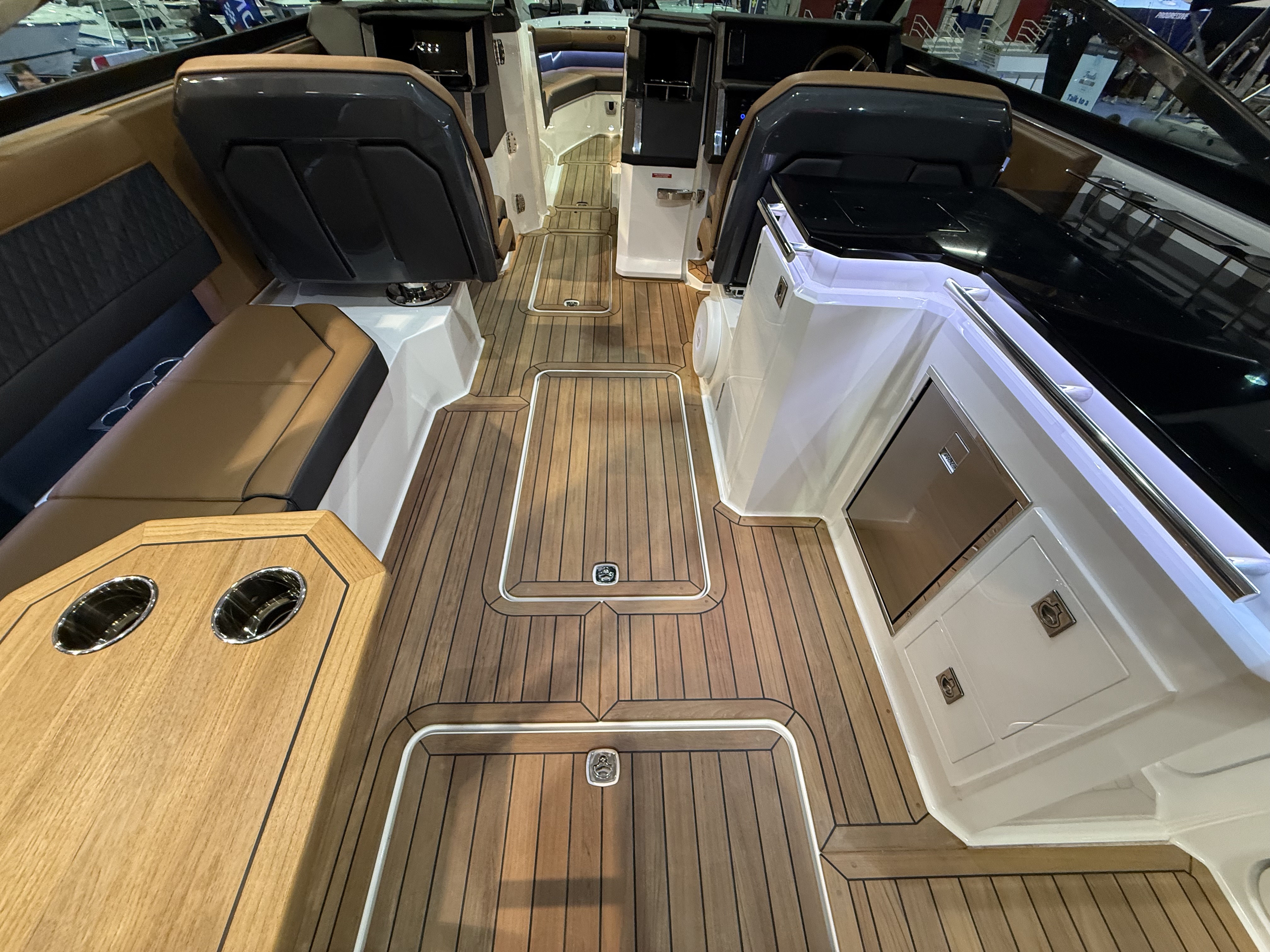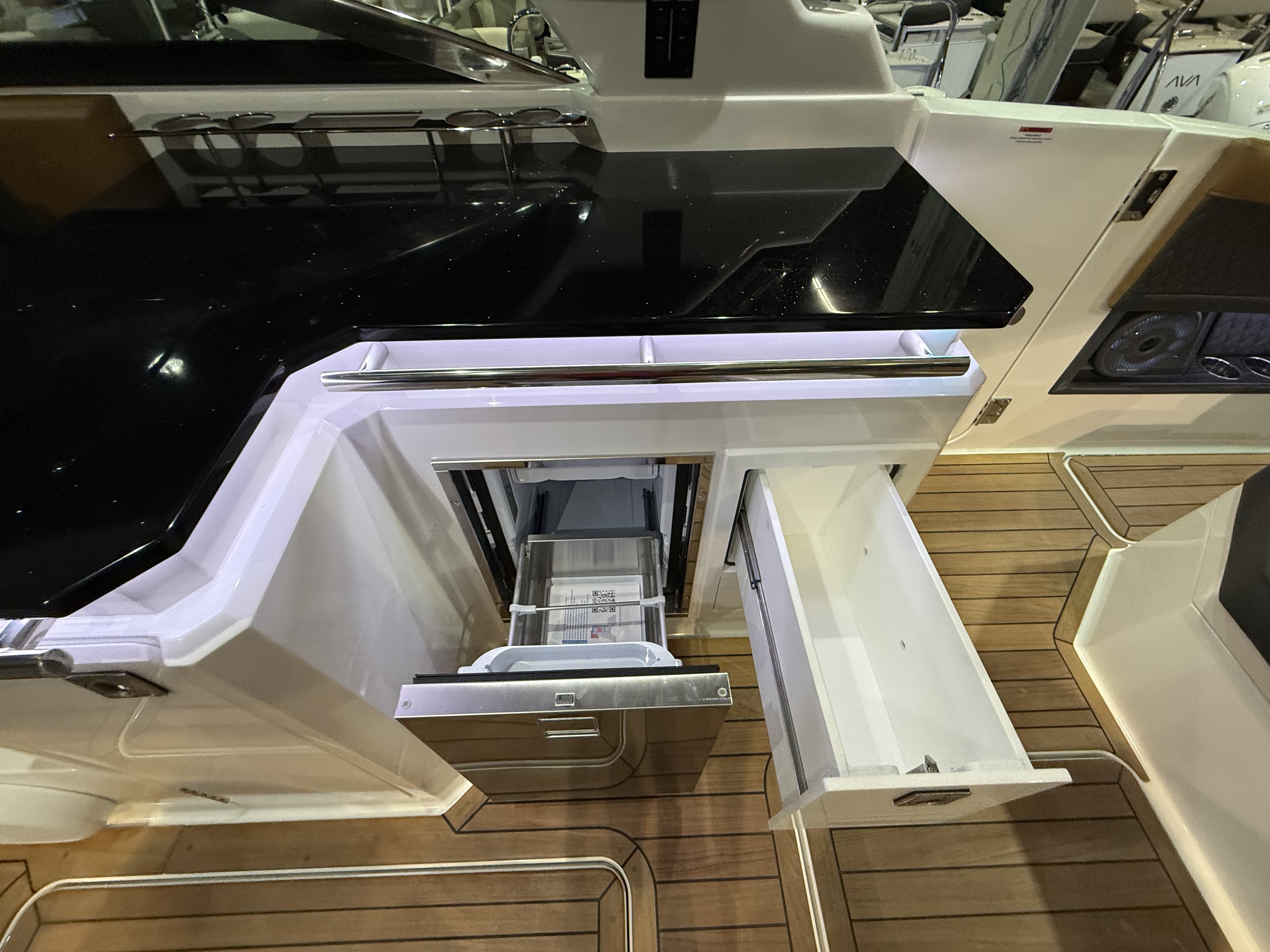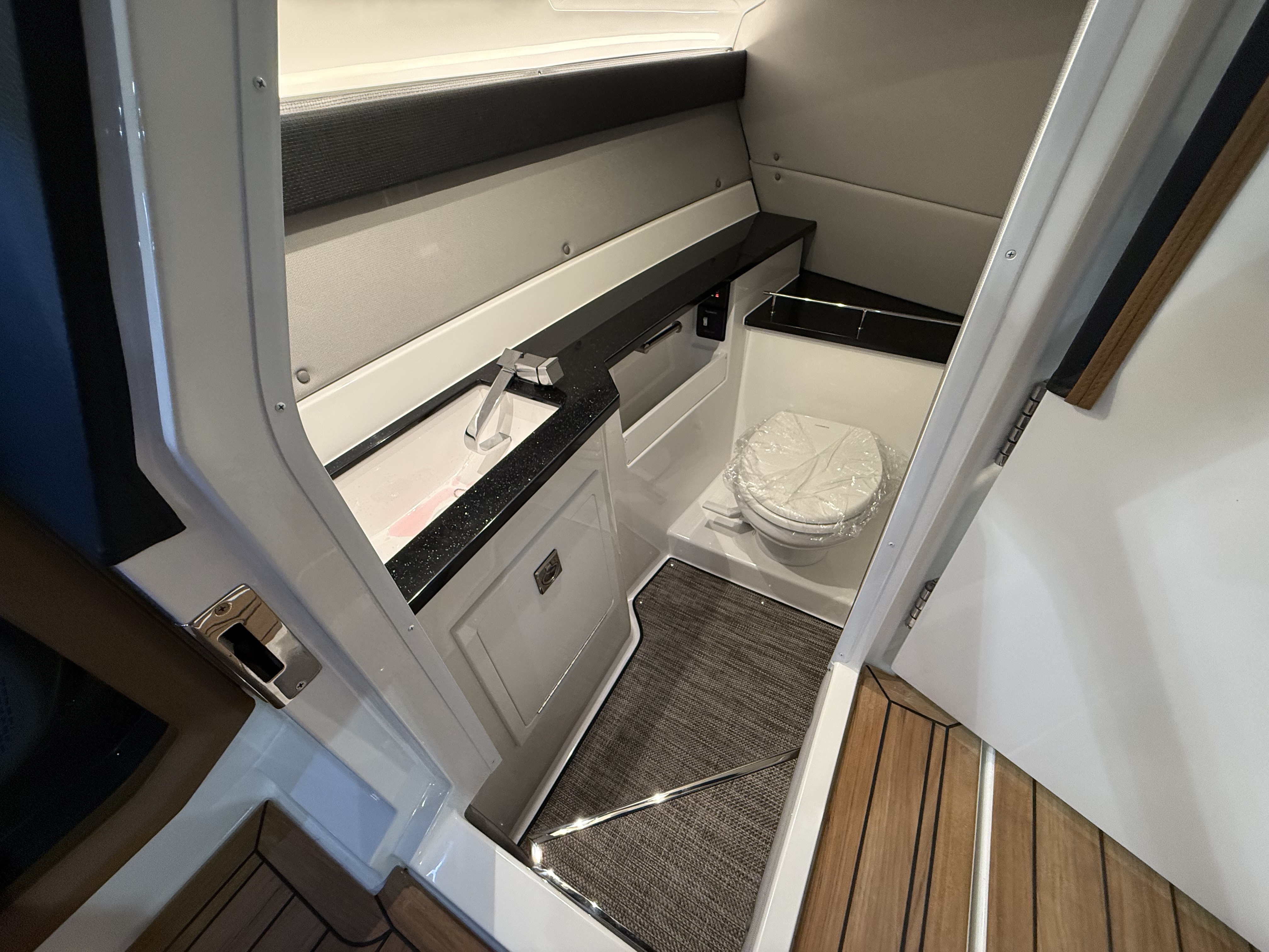 The cockpit is intelligently laid out for true day-boating, featuring a walk-through transom gate, cockpit boarding door, and a fully integrated cockpit galley. A VacuFlush head, sea grass flooring in the head and cabin, wood interior trim package, and a versatile dinette table ensure comfort and convenience for family and guests.