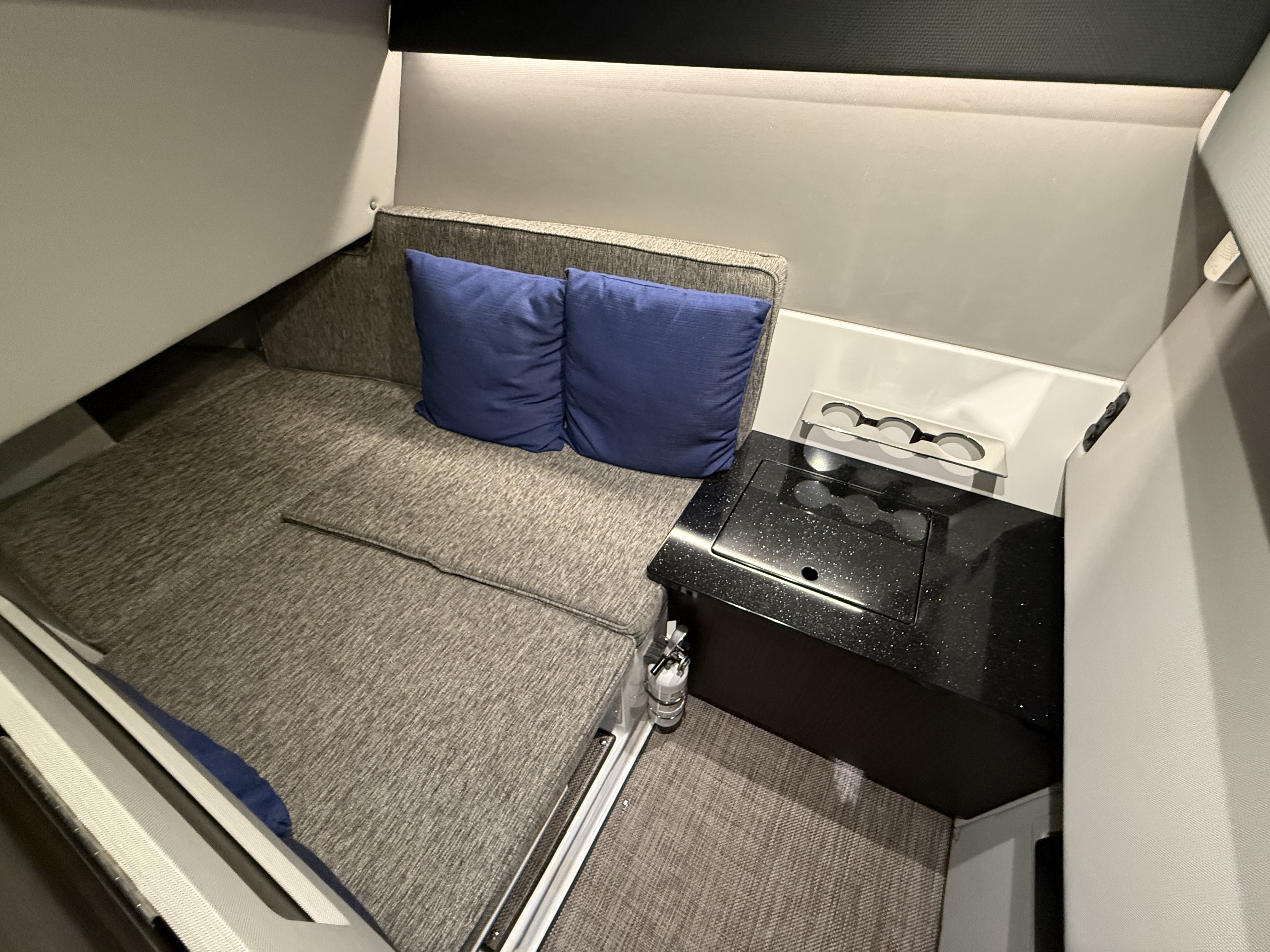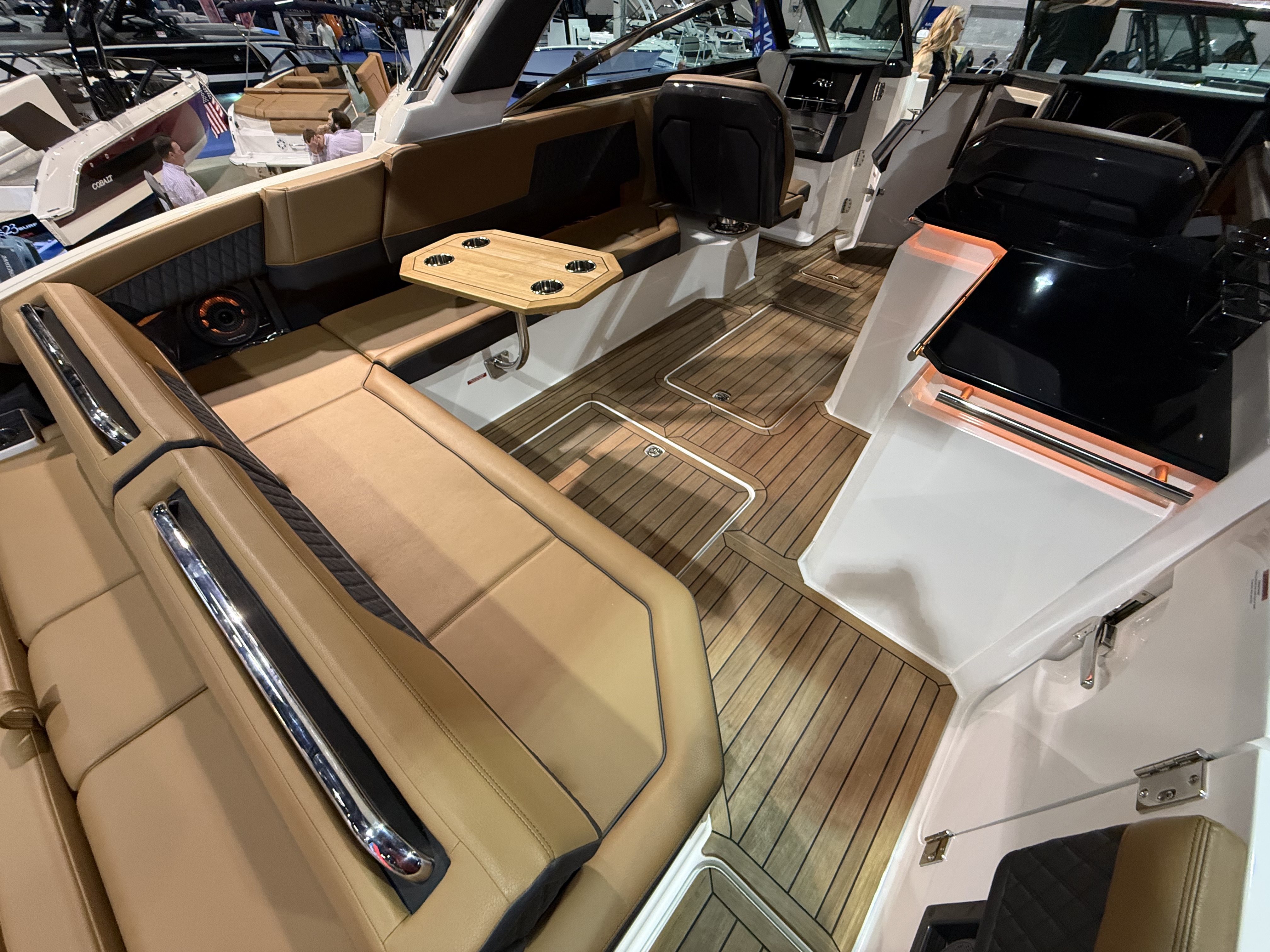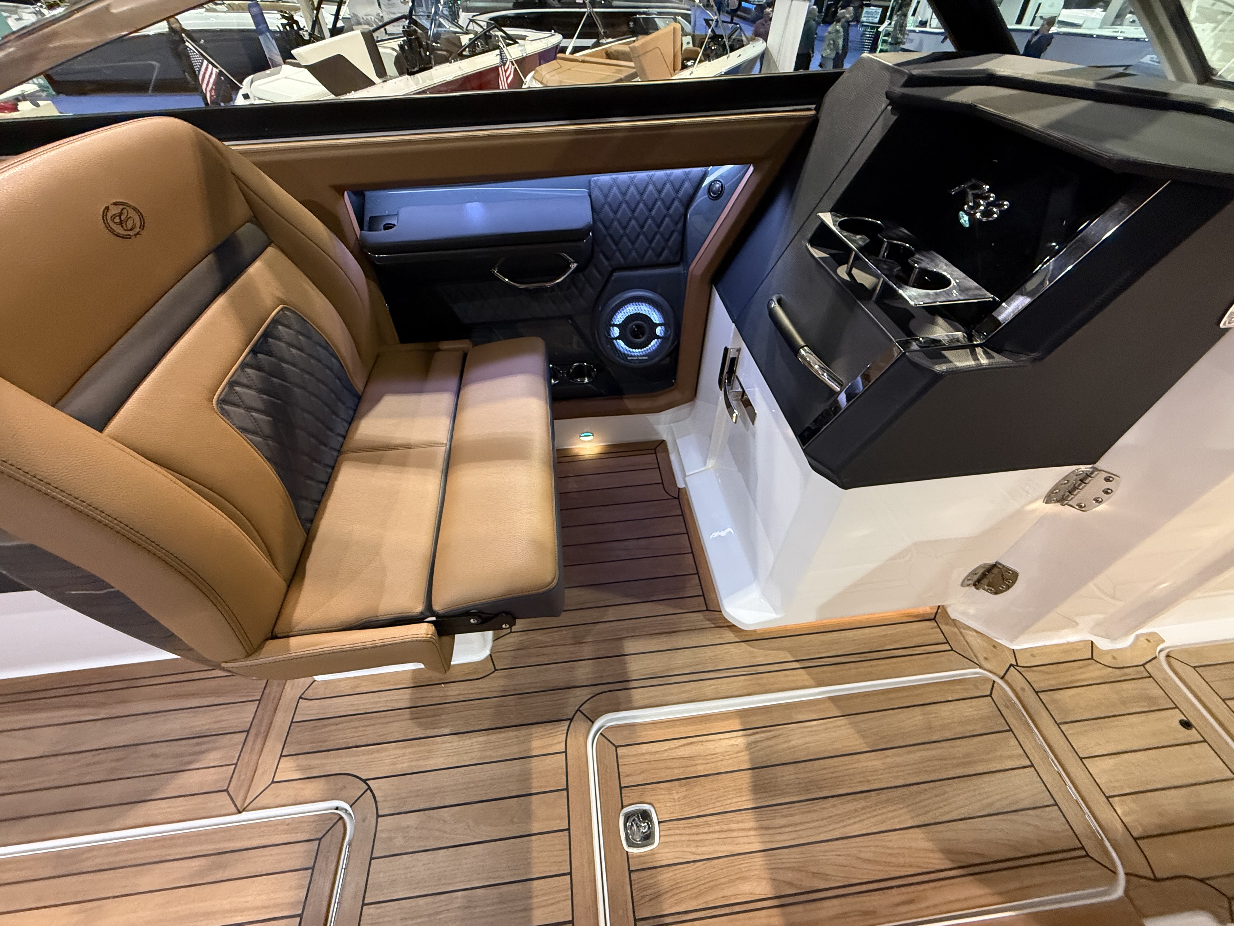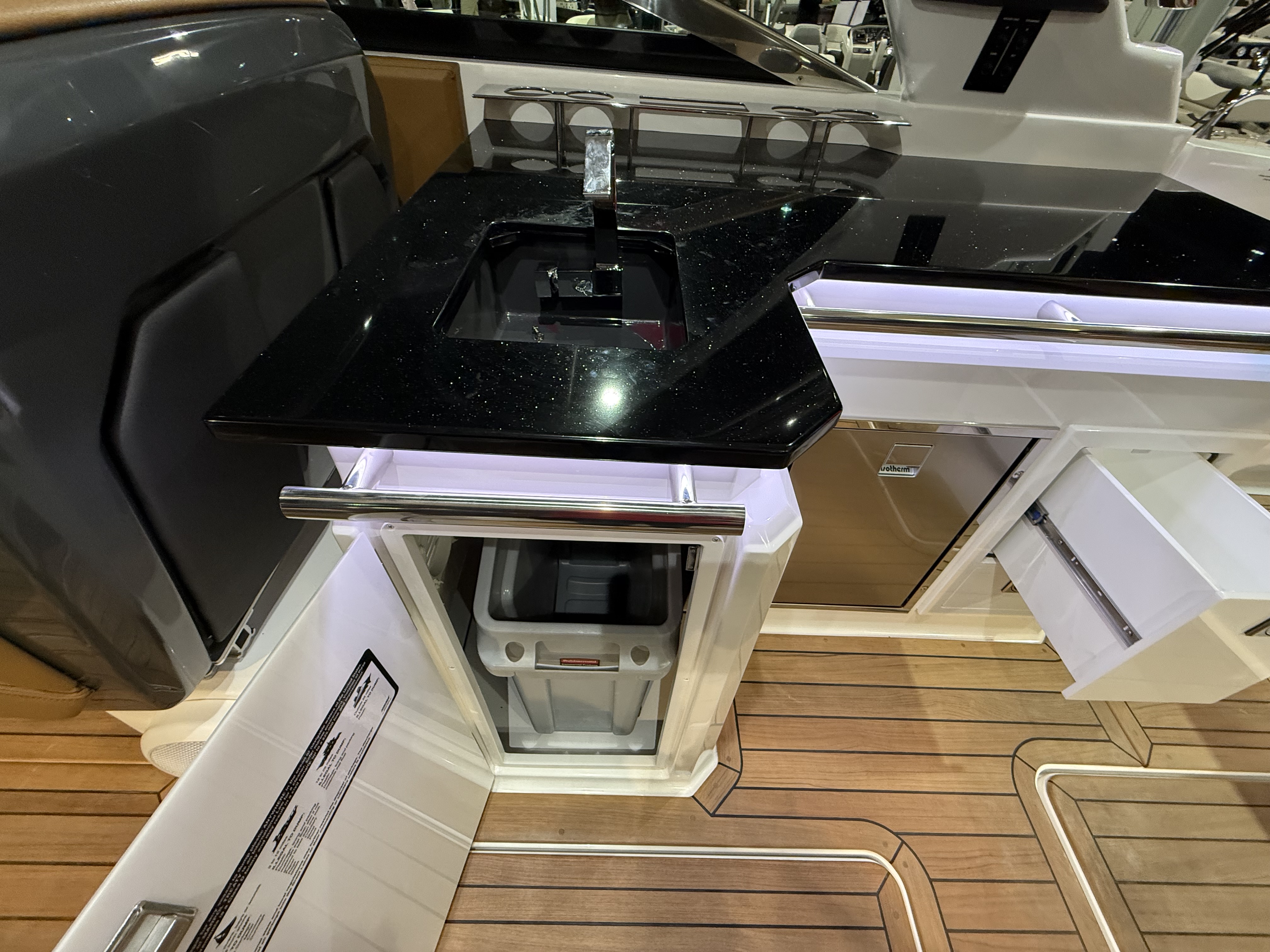 The cockpit is intelligently laid out for true day-boating, featuring a walk-through transom gate, cockpit boarding door, and a fully integrated cockpit galley. A VacuFlush head, sea grass flooring in the head and cabin, wood interior trim package, and a versatile dinette table ensure comfort and convenience for family and guests.