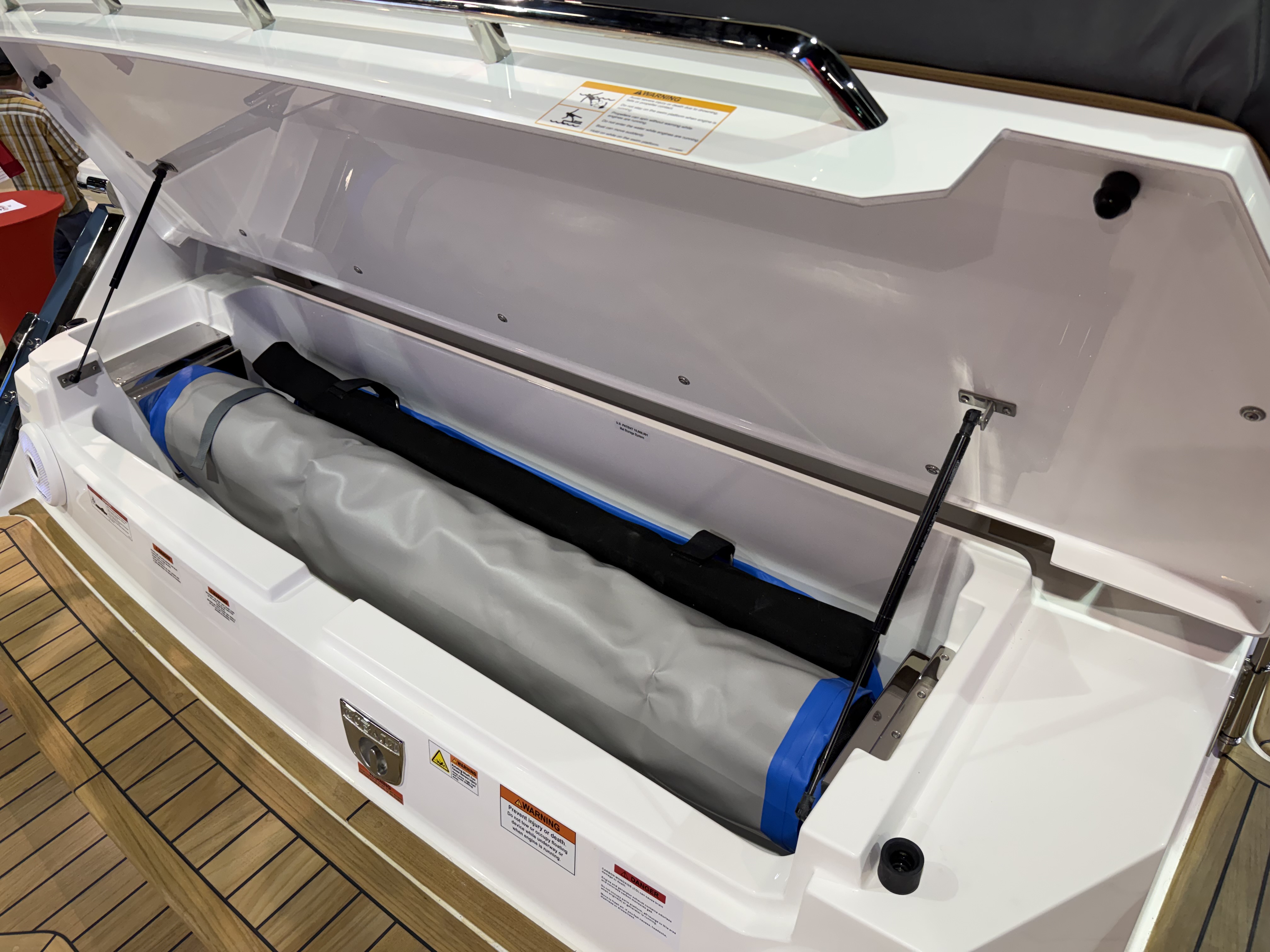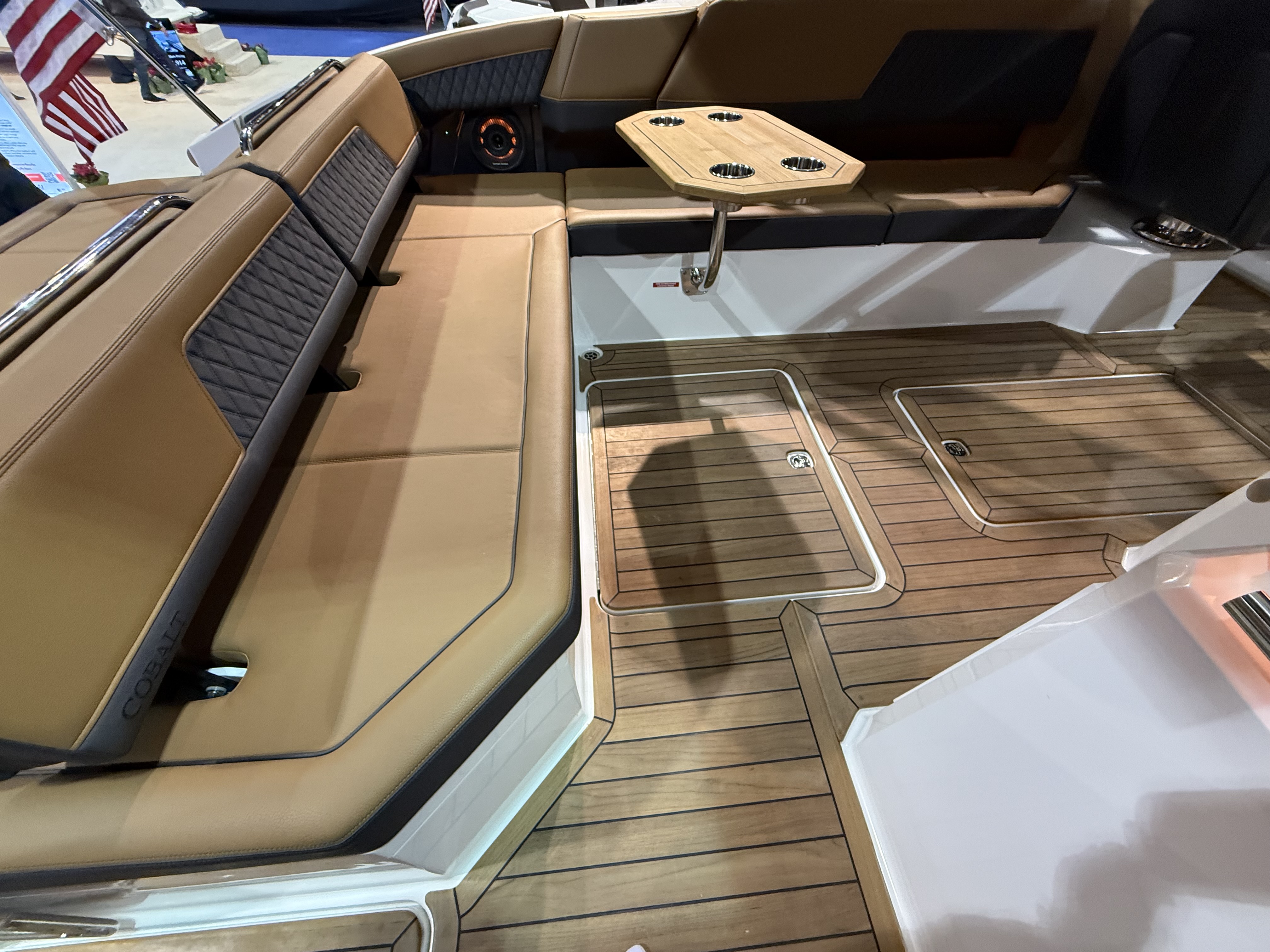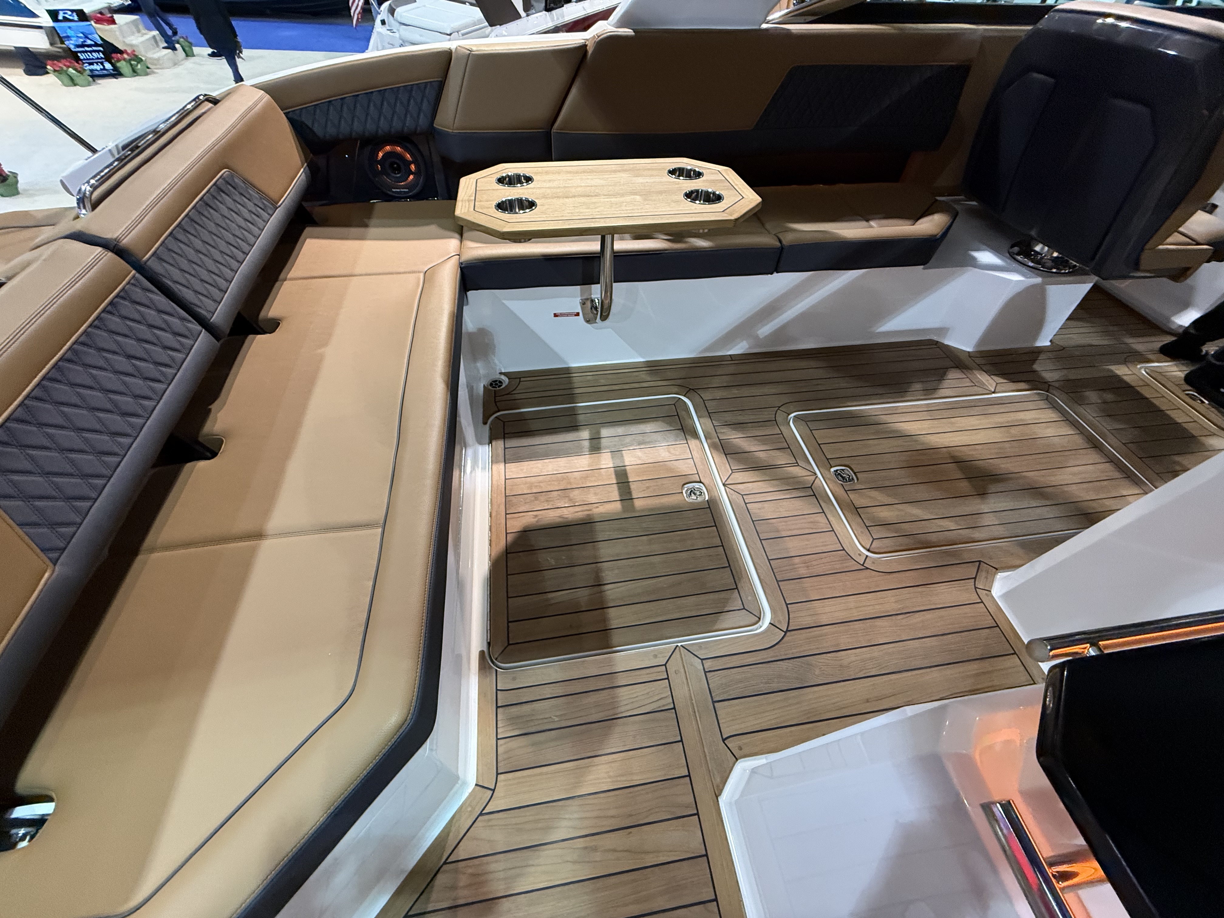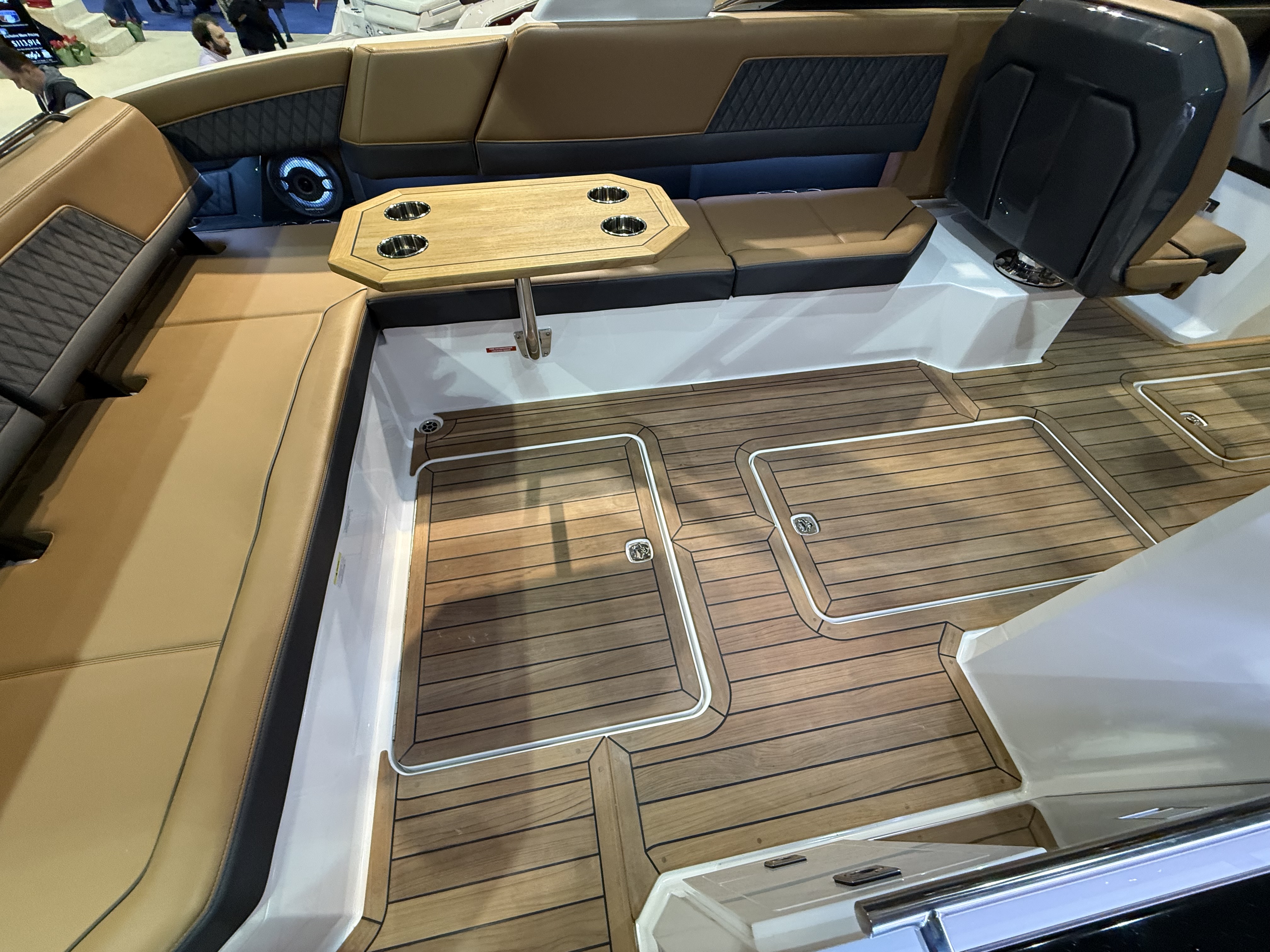 The cockpit is intelligently laid out for true day-boating, featuring a walk-through transom gate, cockpit boarding door, and a fully integrated cockpit galley. A VacuFlush head, sea grass flooring in the head and cabin, wood interior trim package, and a versatile dinette table ensure comfort and convenience for family and guests.