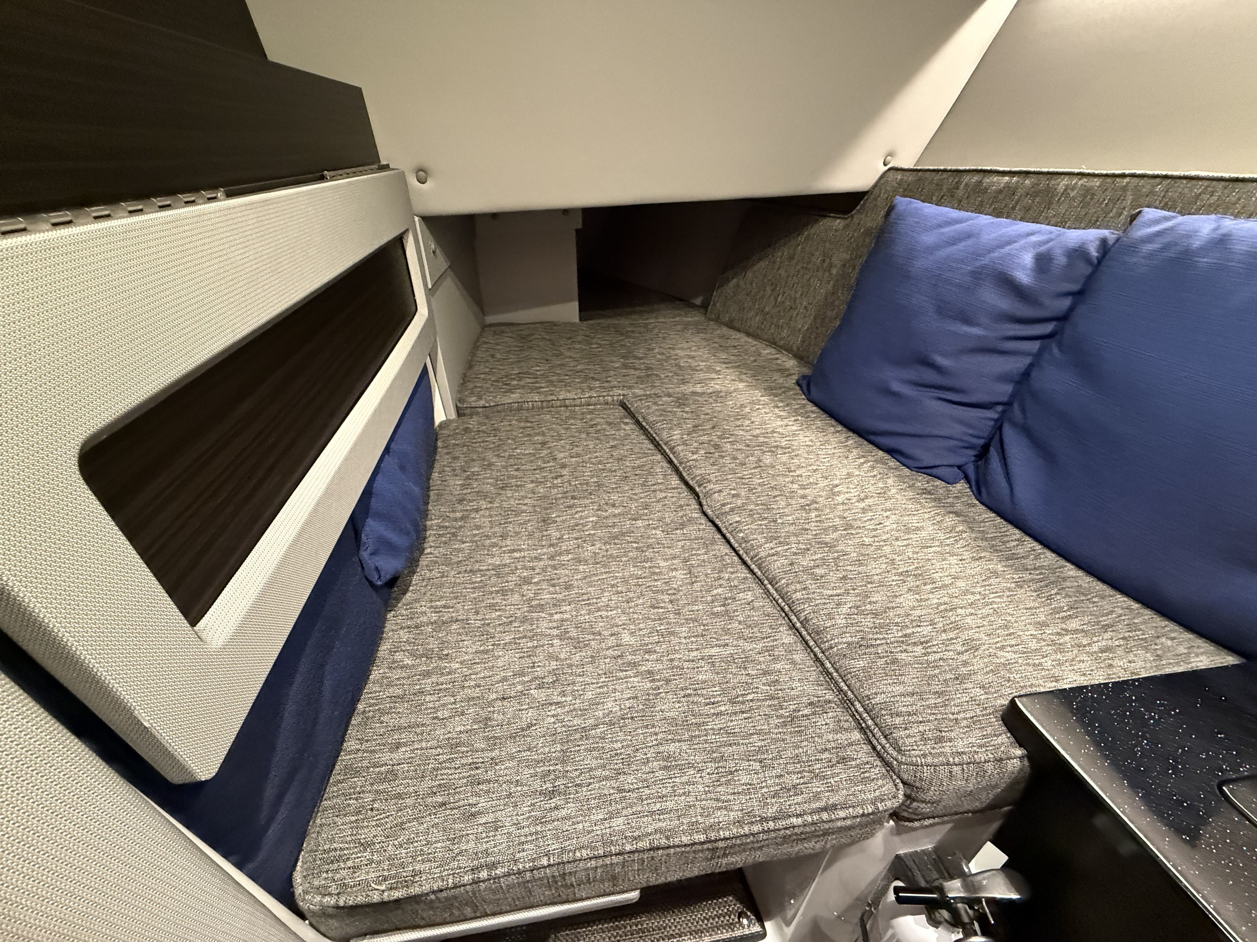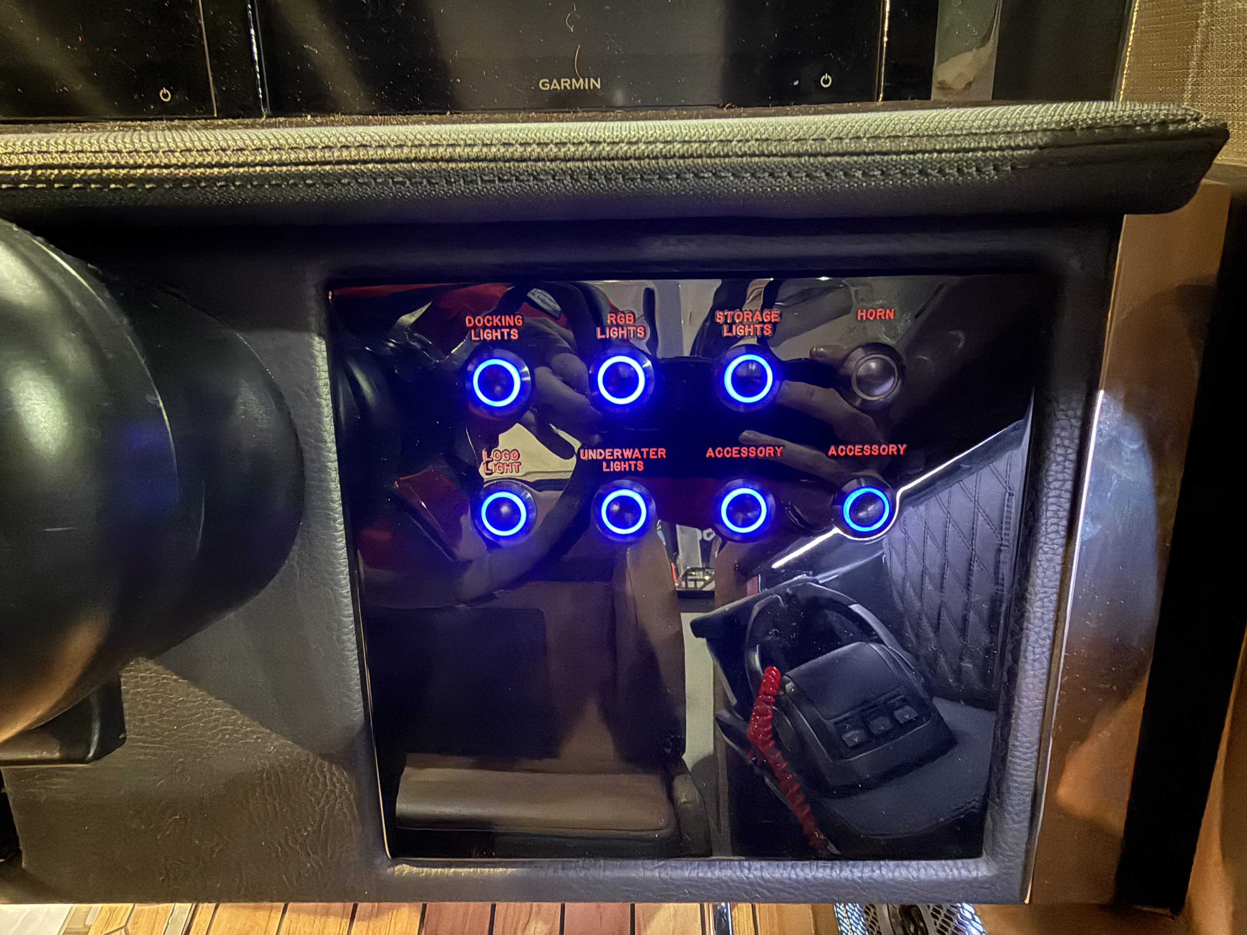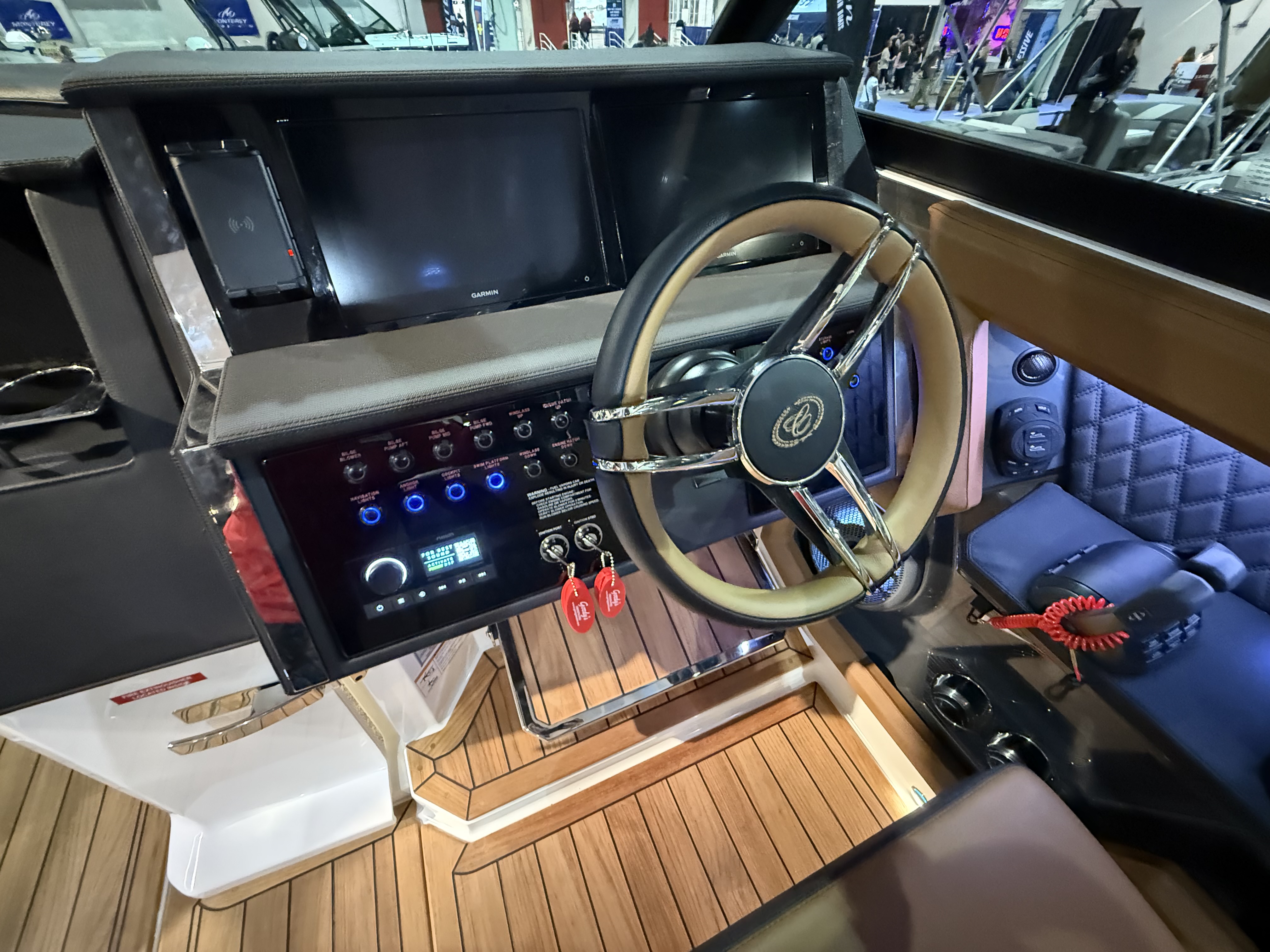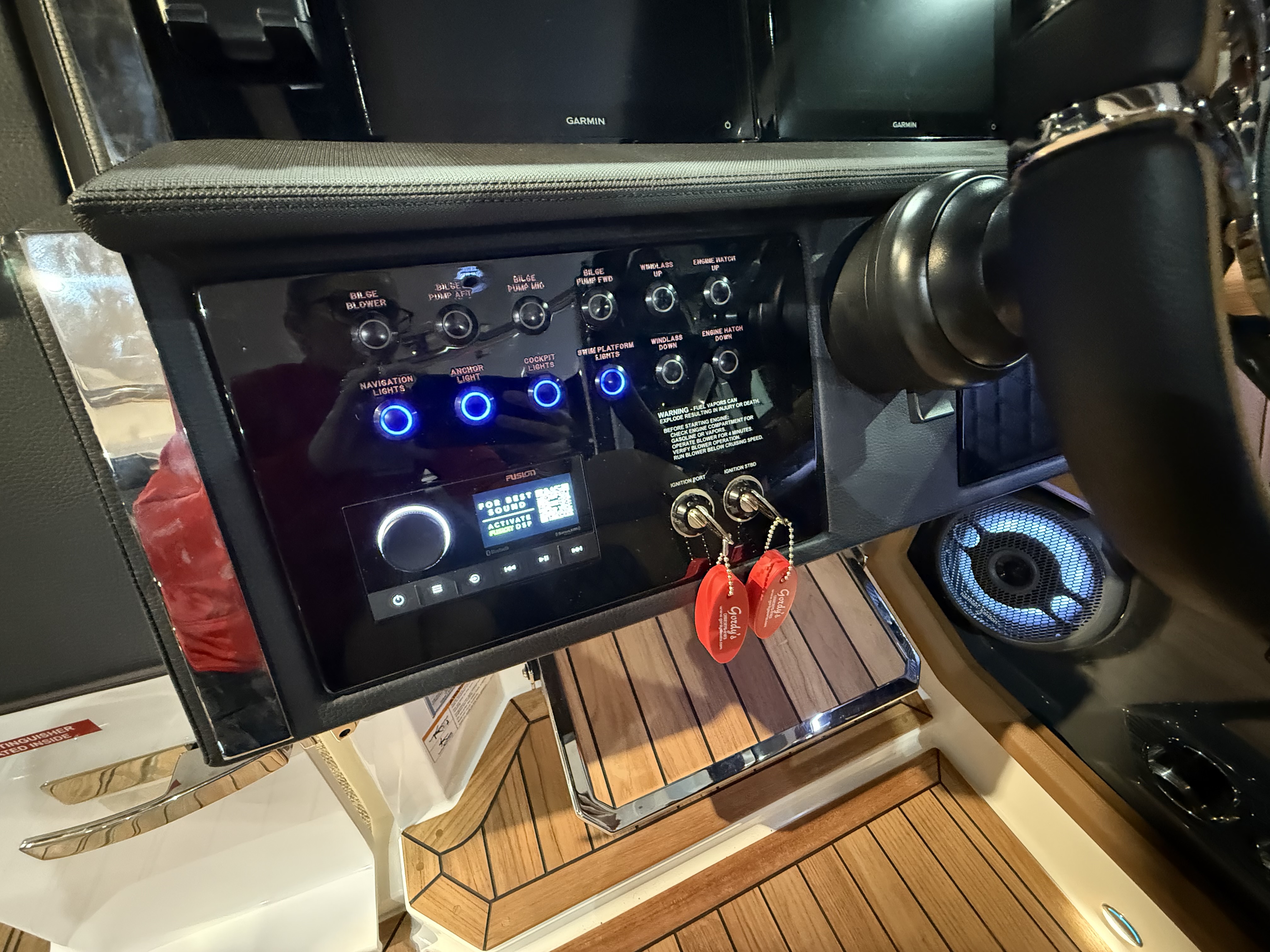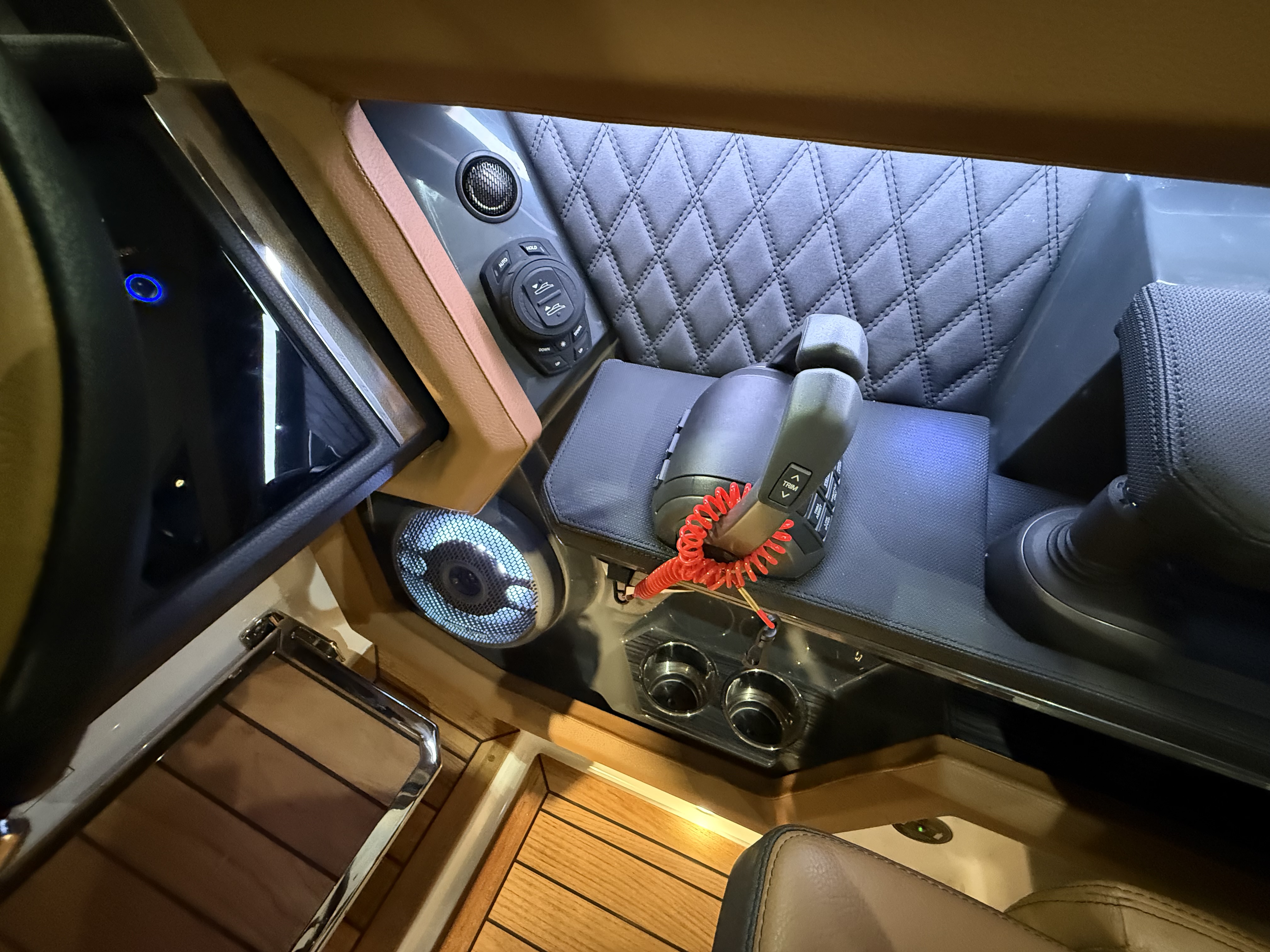 At the helm, dual Garmin 8612 glass cockpit displays integrate seamlessly with Volvo’s Total Control Package, including Autopilot and Dynamic Positioning System (DPS)—allowing hands-free station keeping and stress-free cruising. A leather-wrapped, color-matched steering wheel and fold-down helm footrest complete the captain’s command center.