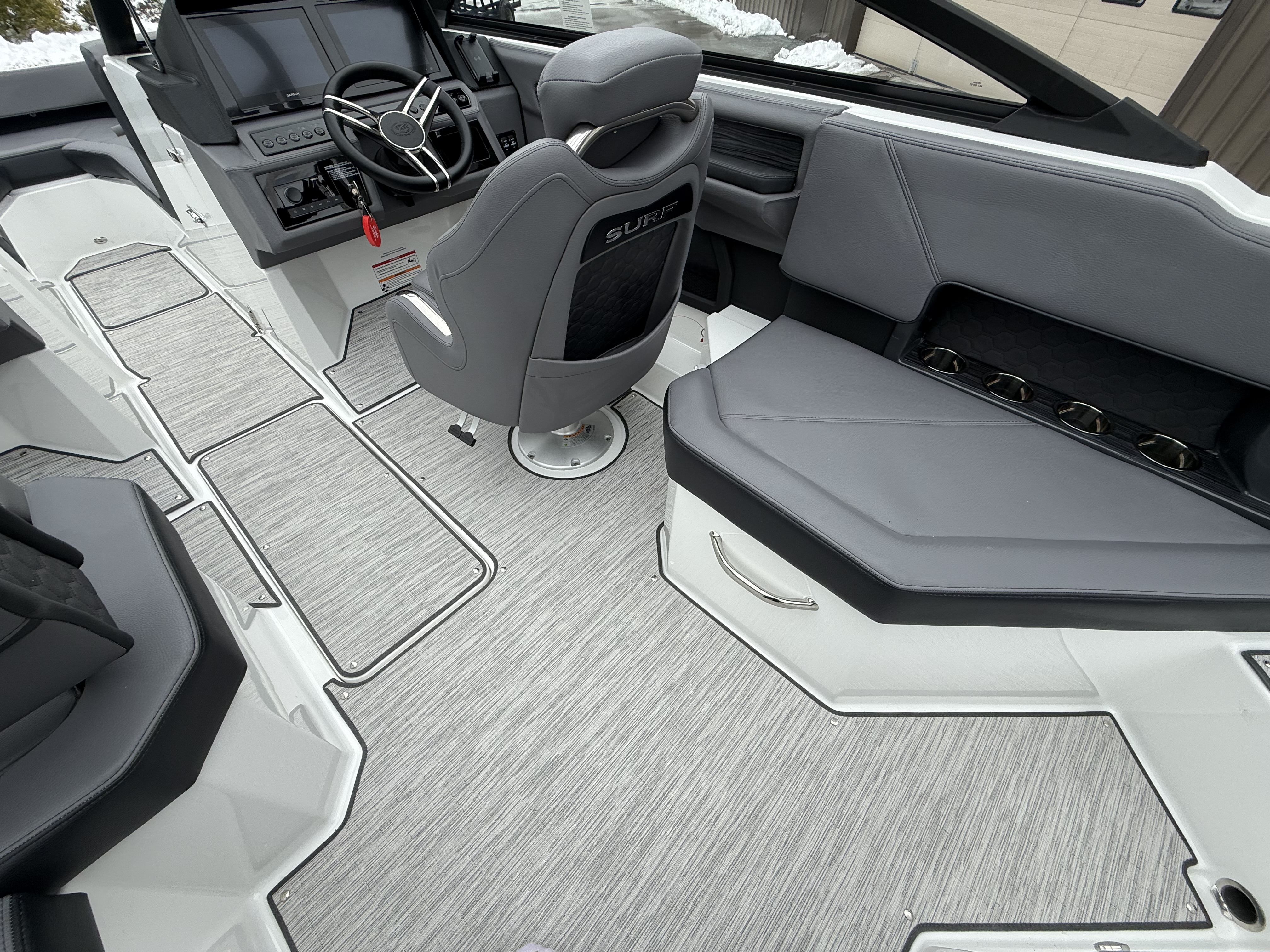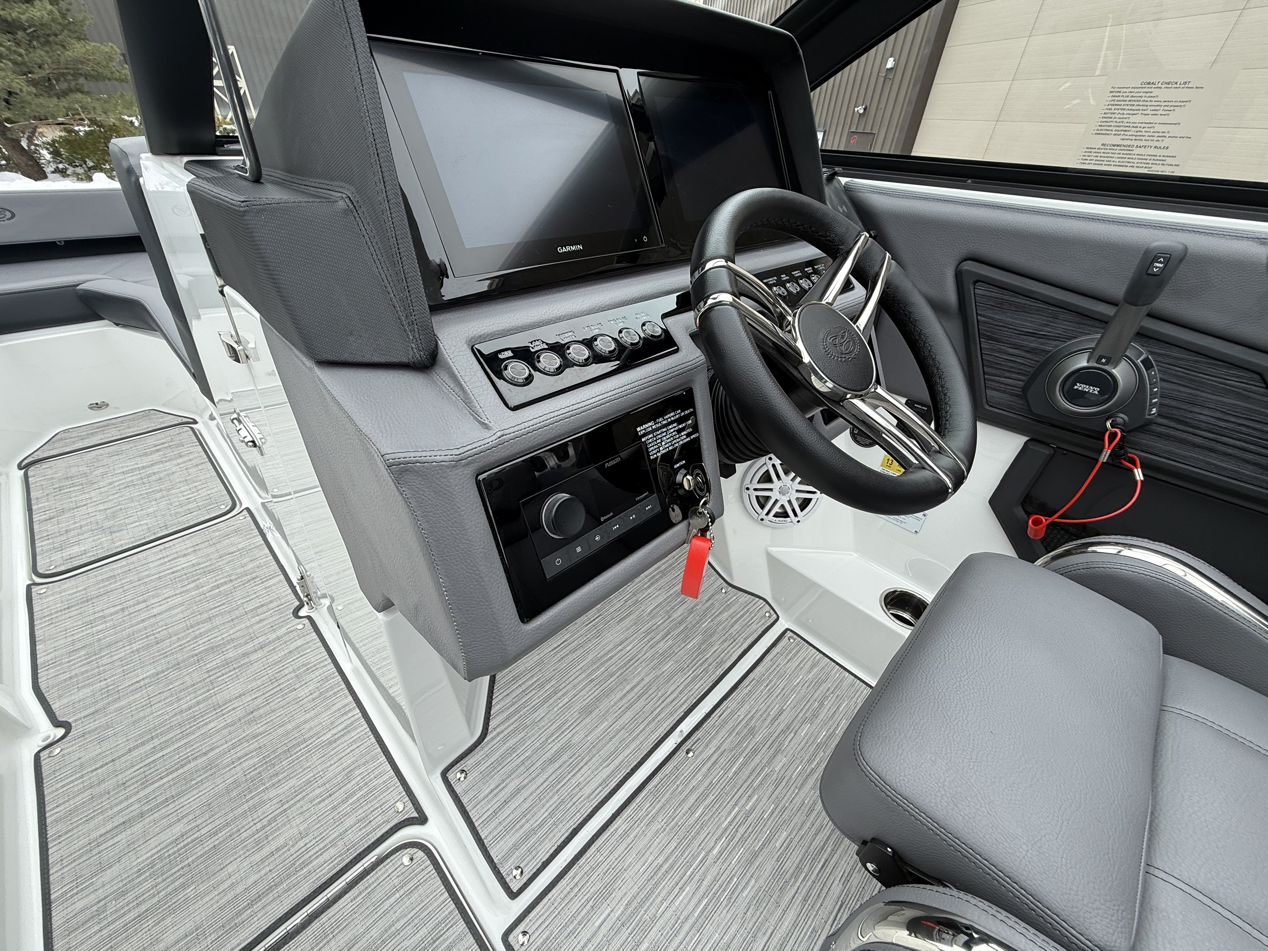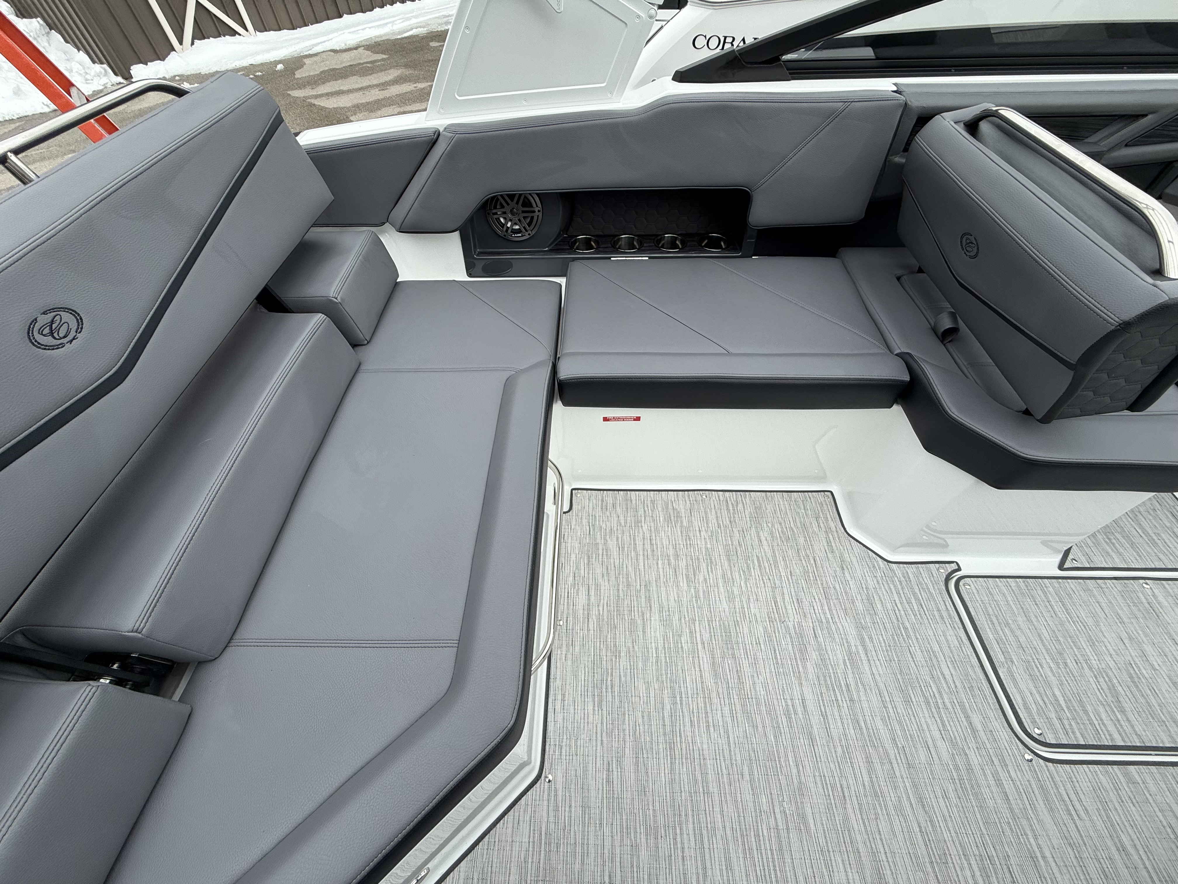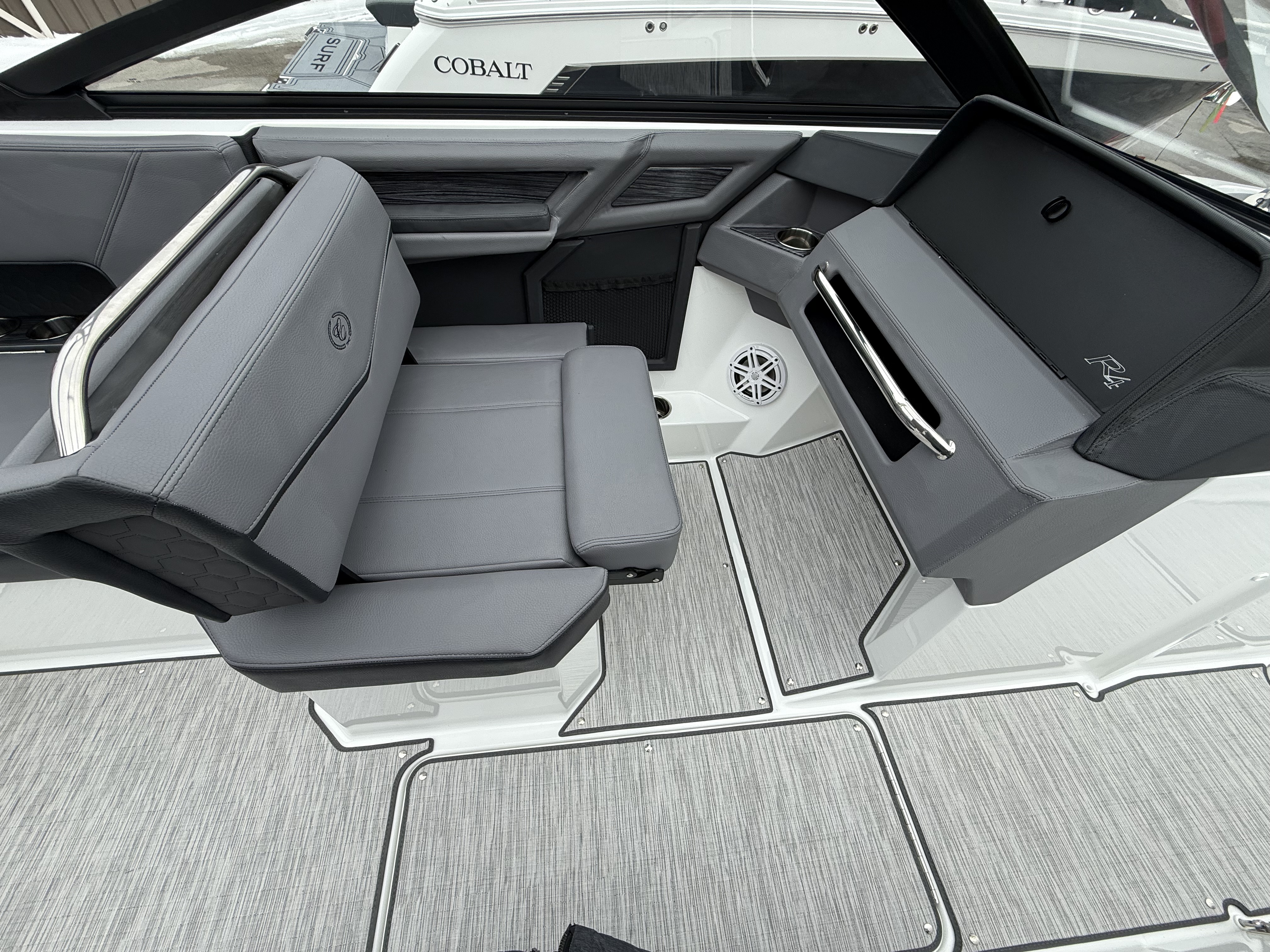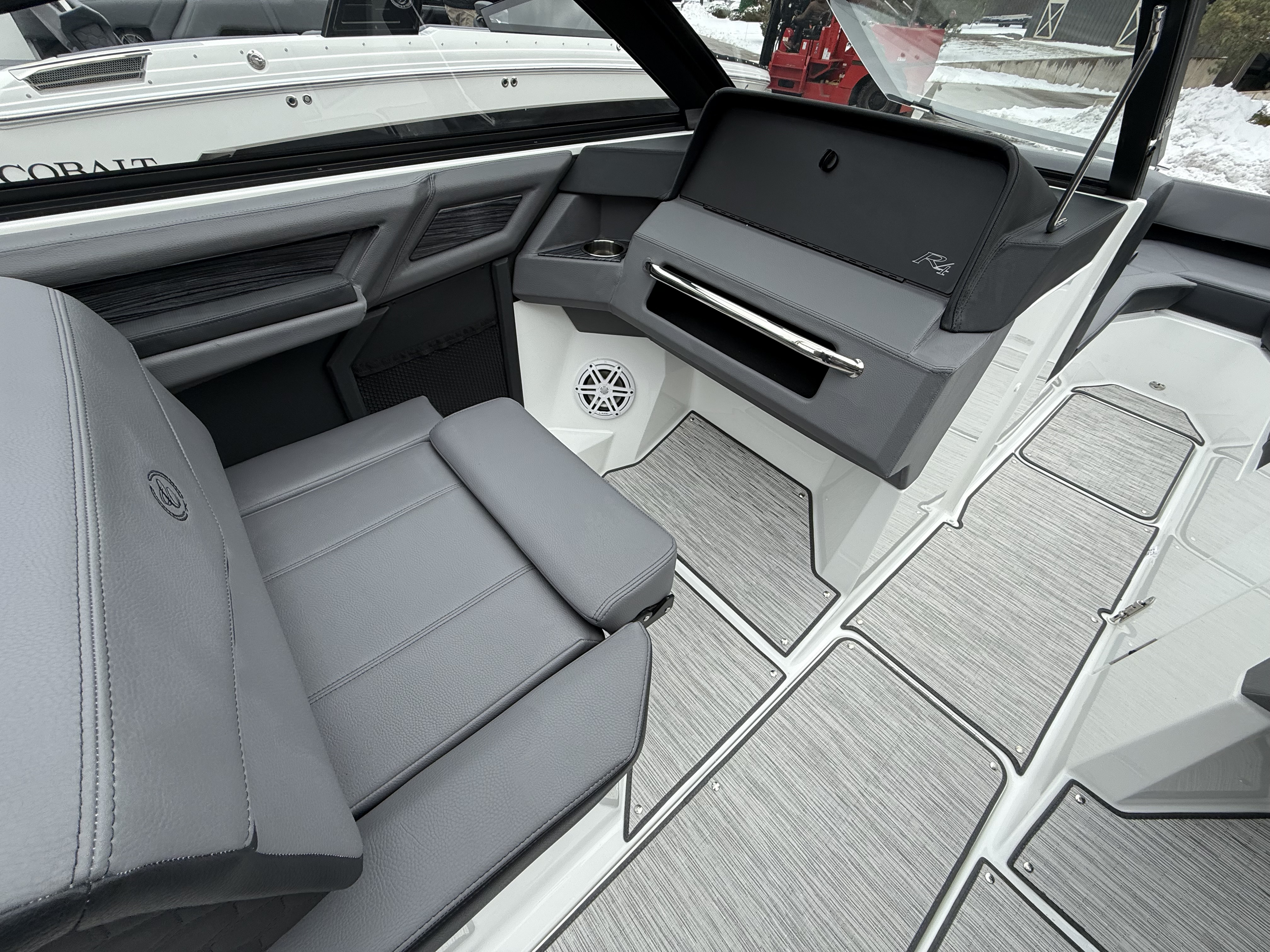 Finished in a striking Slate and Ebony surf exterior with refined navy surf accents, the R4 Surf delivers unmistakable presence at the dock and effortless confidence underway. Step aboard and you’re welcomed by Cobalt’s signature attention to detail, highlighted by the Dark Driftwood interior trim package — a warm, sophisticated finish that elevates the cockpit into a true luxury environment. Sea grass flooring adds both durability and upscale comfort, while customizable RGB interior lighting transforms evening cruises into an atmosphere all your own.