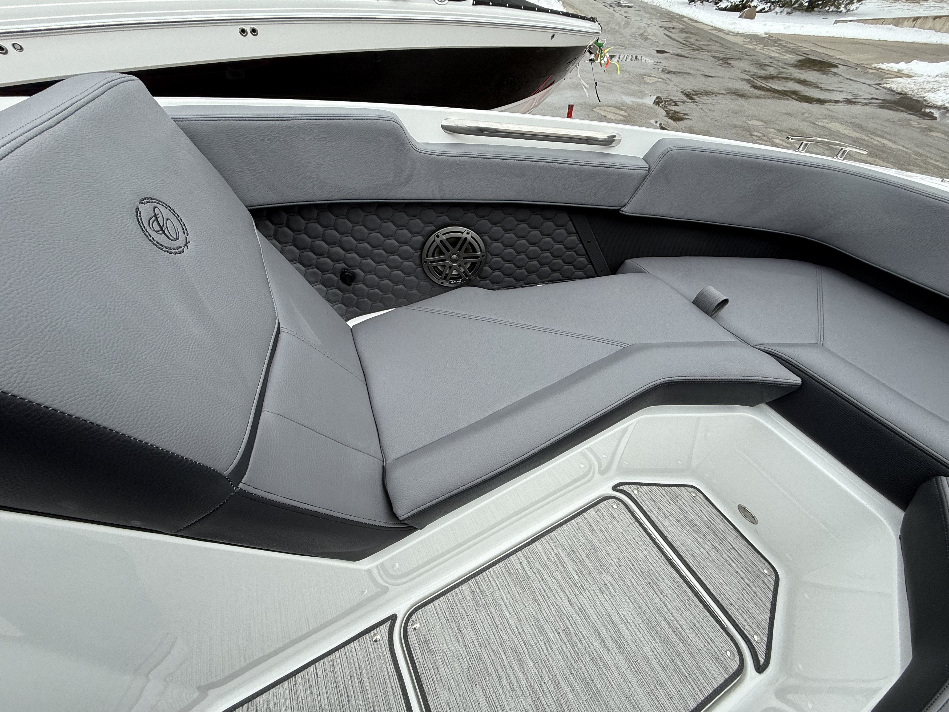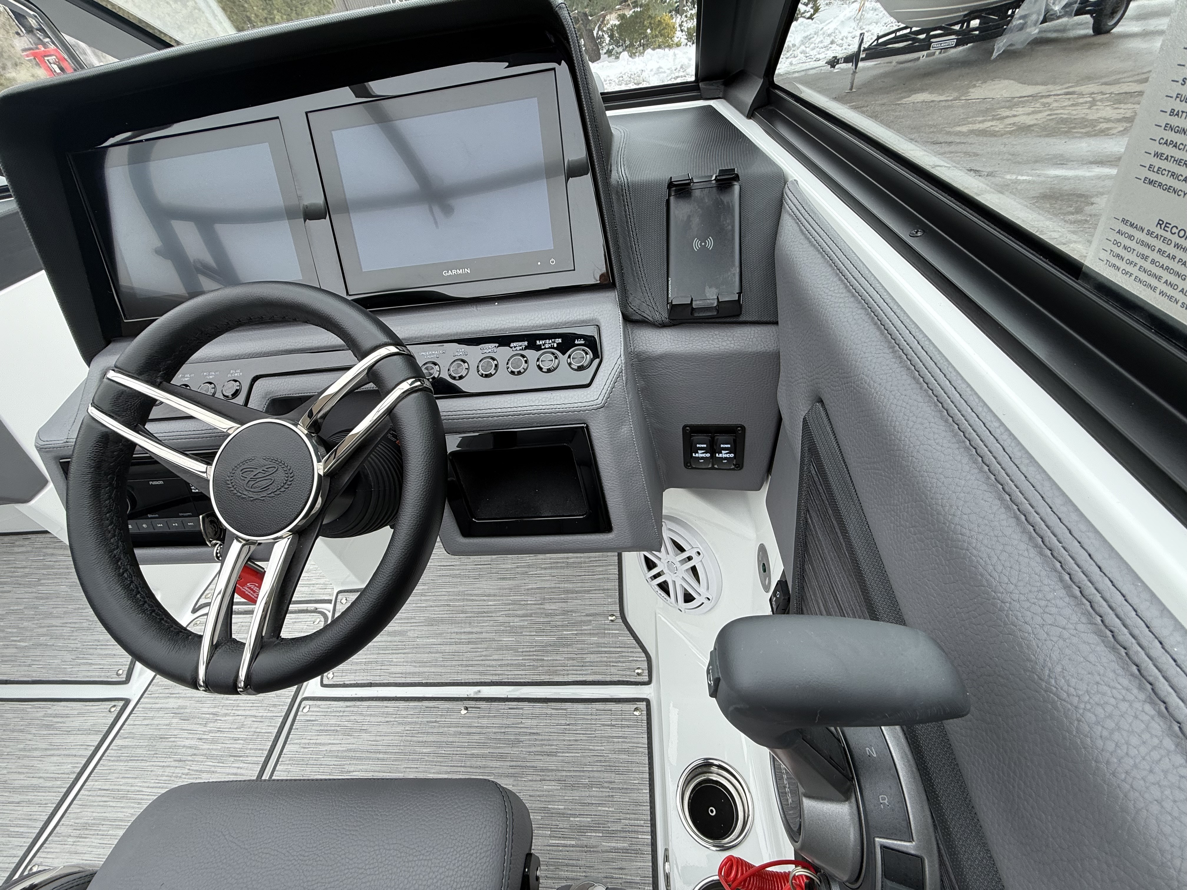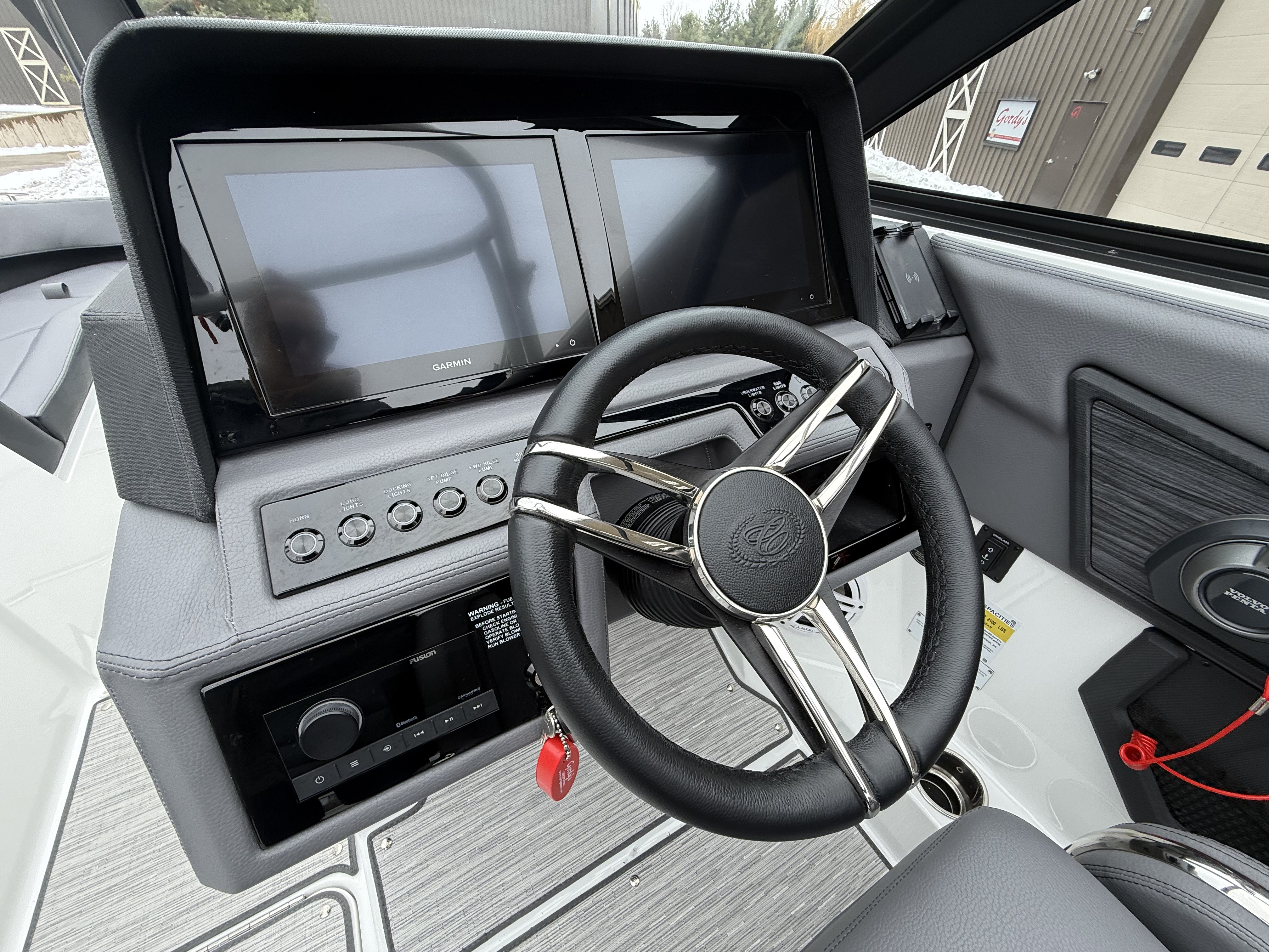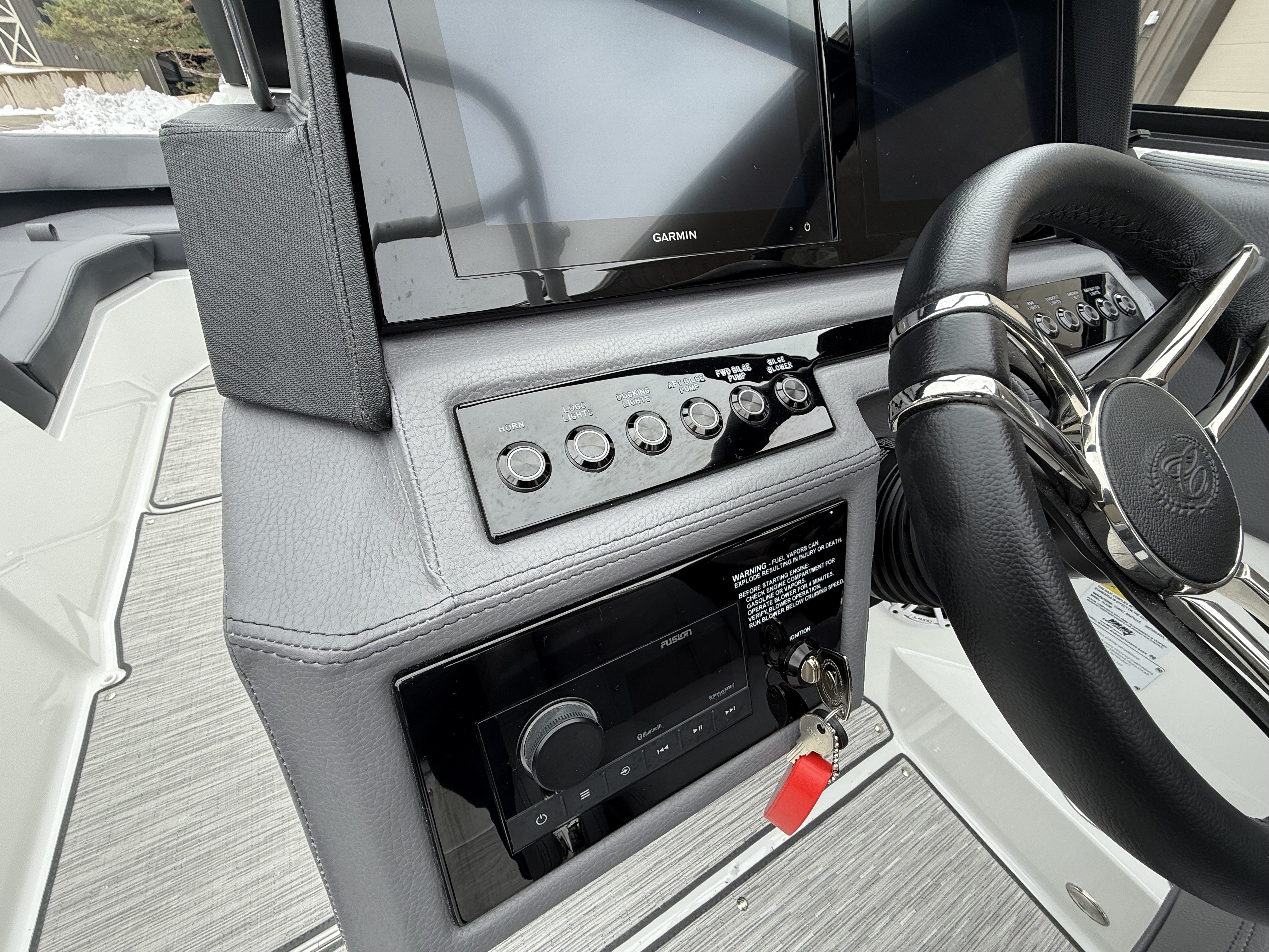 At the helm, dual Garmin glass cockpit displays provide intuitive control over navigation, surf settings, and onboard systems, delivering a modern driving experience that feels effortless and refined. Stainless steel docking lights enhance visibility after sunset, while the integrated windlass anchor system makes anchoring simple with the touch of a button.