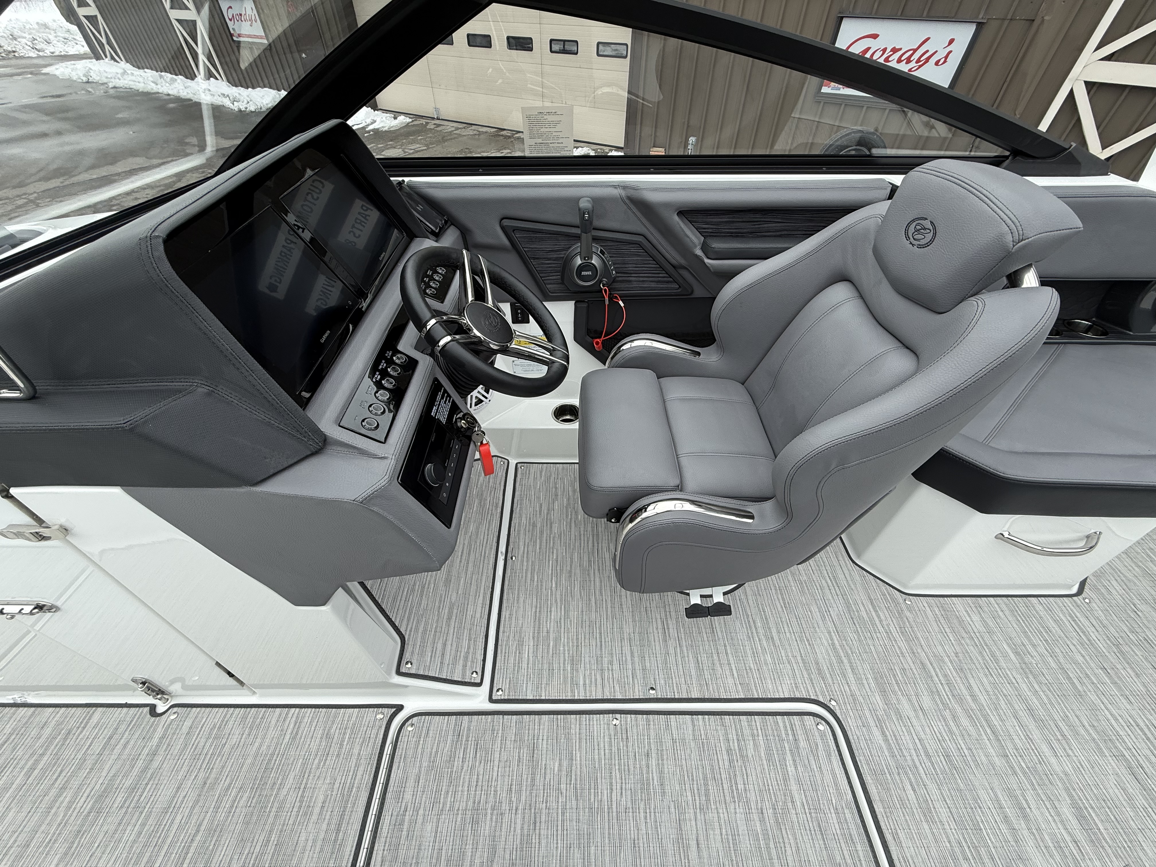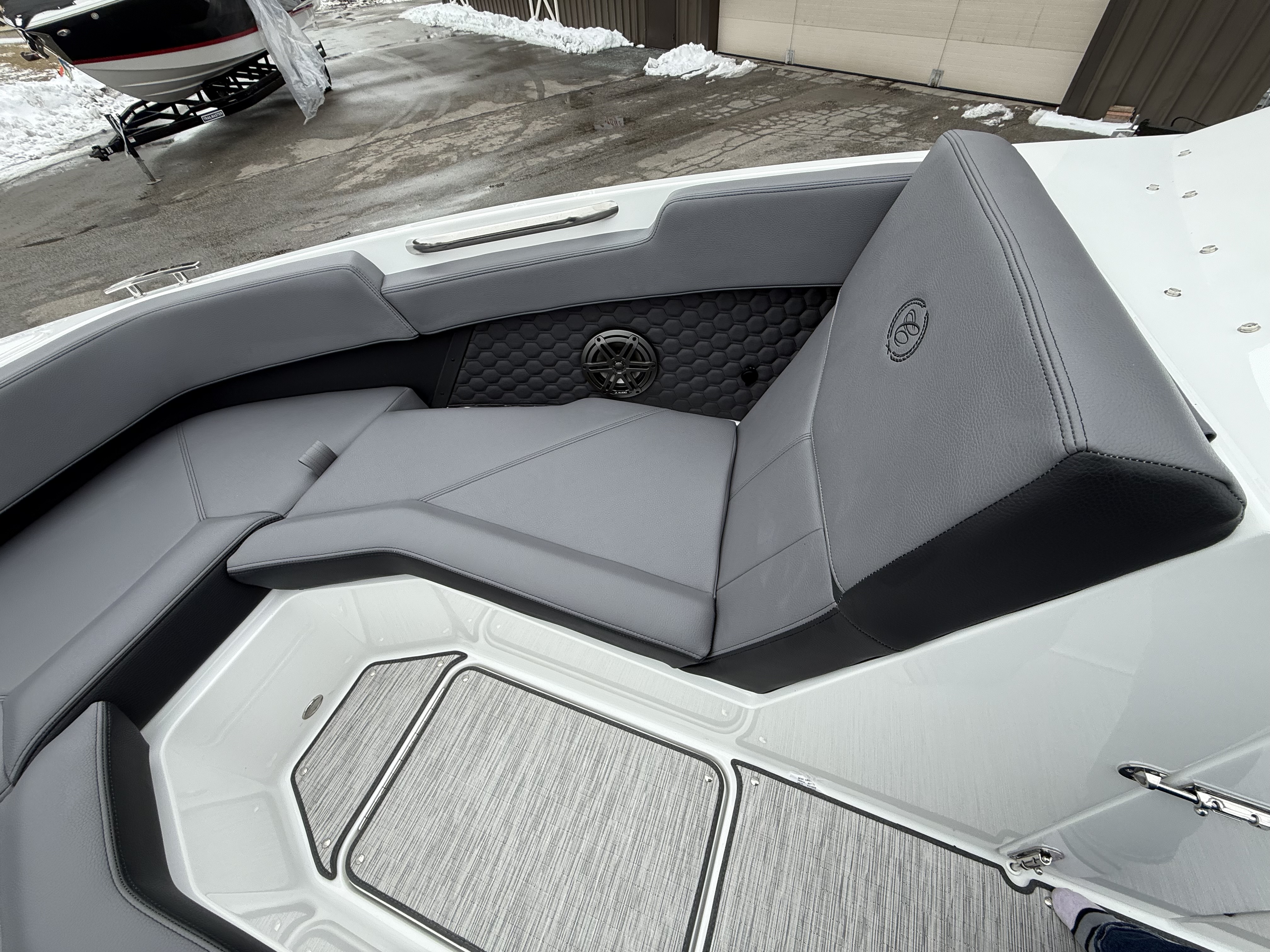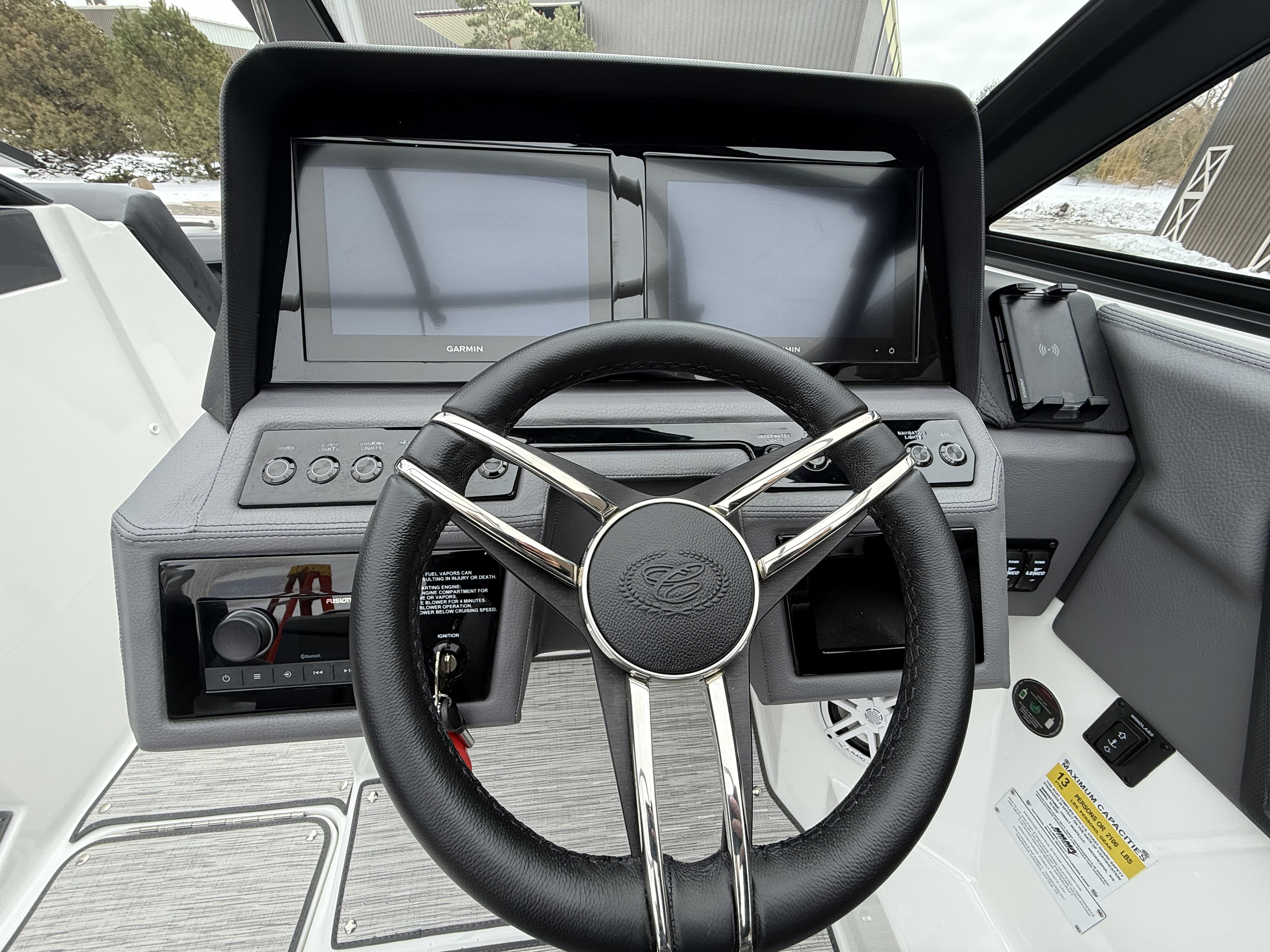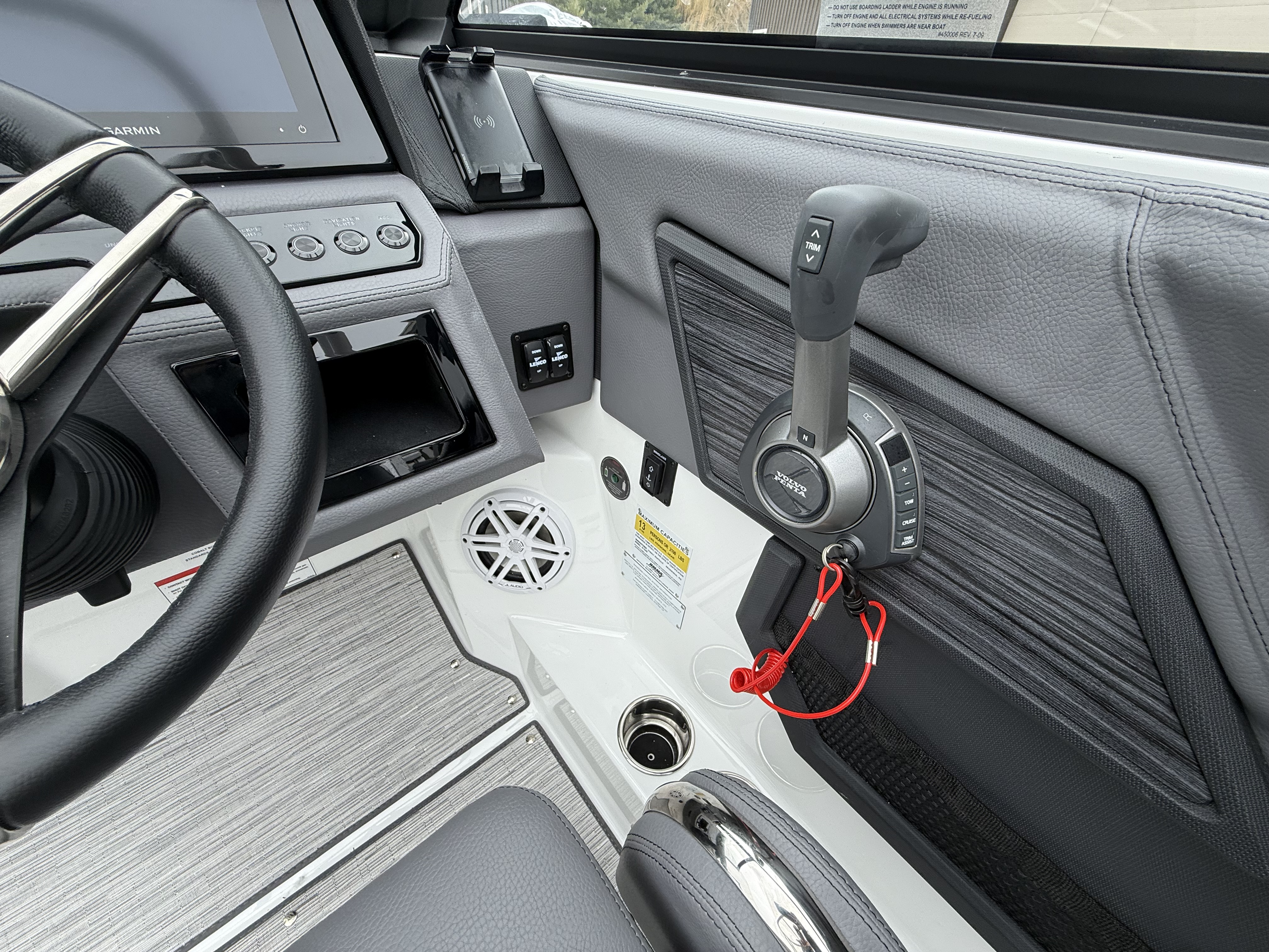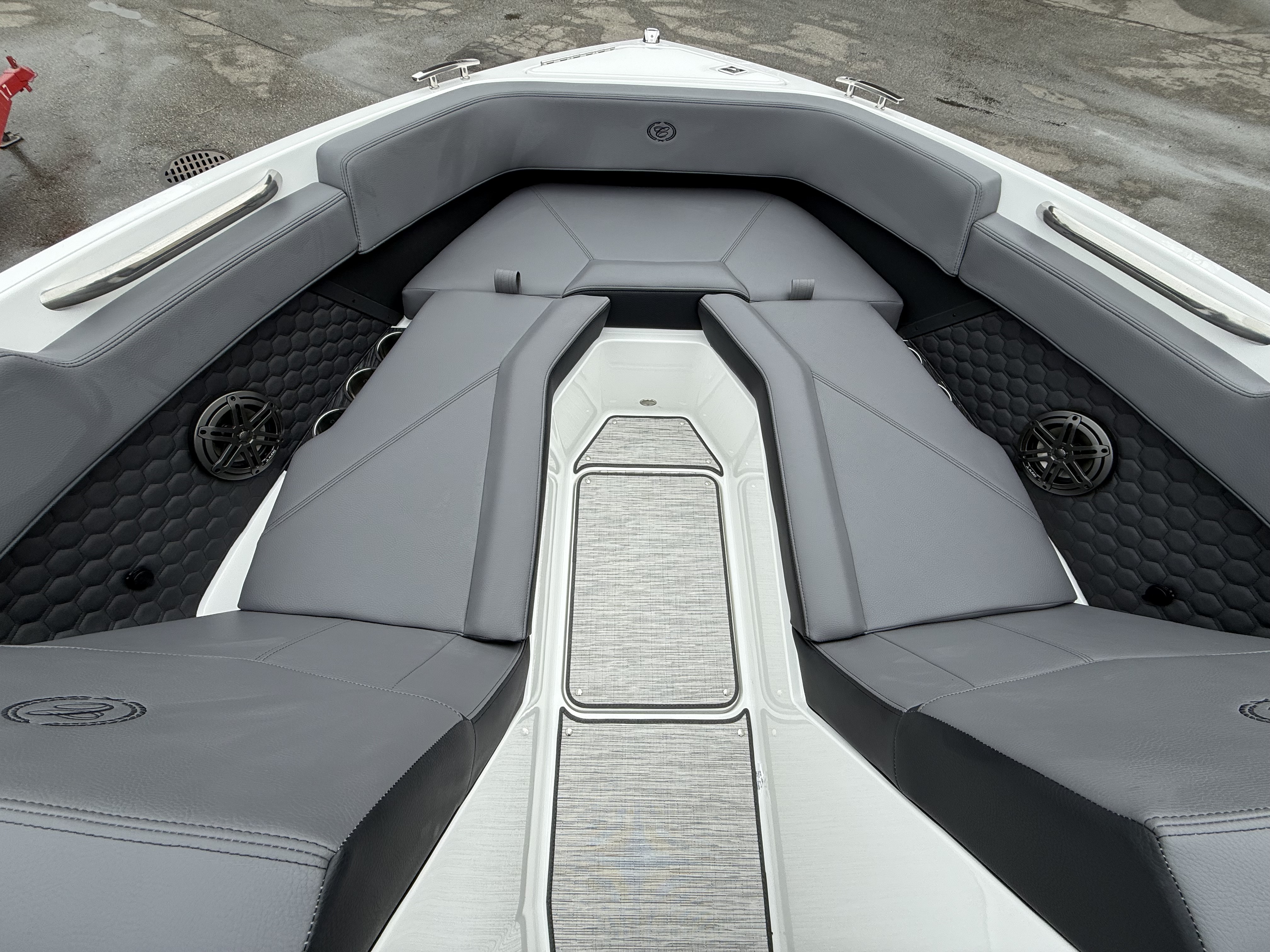 At the helm, dual Garmin glass cockpit displays provide intuitive control over navigation, surf settings, and onboard systems, delivering a modern driving experience that feels effortless and refined. Stainless steel docking lights enhance visibility after sunset, while the integrated windlass anchor system makes anchoring simple with the touch of a button.