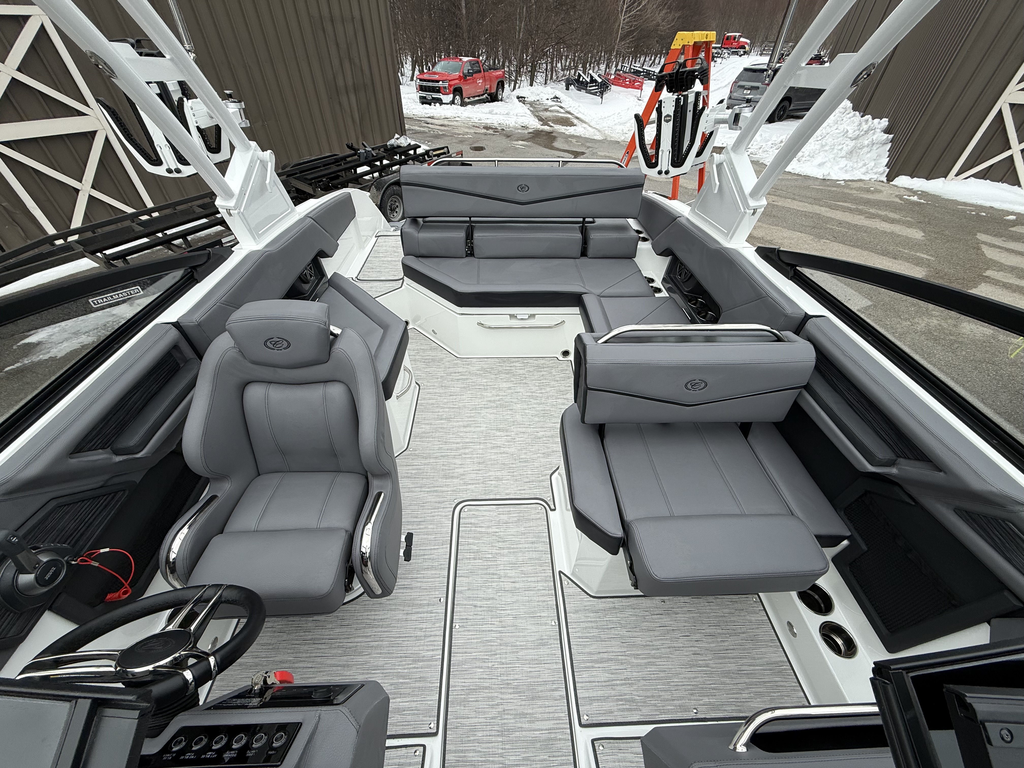 Designed as much for relaxation as performance, the cockpit features an aft-facing rumble seat ideal for watching riders or enjoying quiet moments at anchor. Premium sound with transom speakers fills the water with rich, immersive audio, and Triton wakeboard racks keep gear organized and ready for action. Thoughtful additions like wireless phone charging, full tonneau covers, and a flagpole with flag complete a package built for seamless ownership.